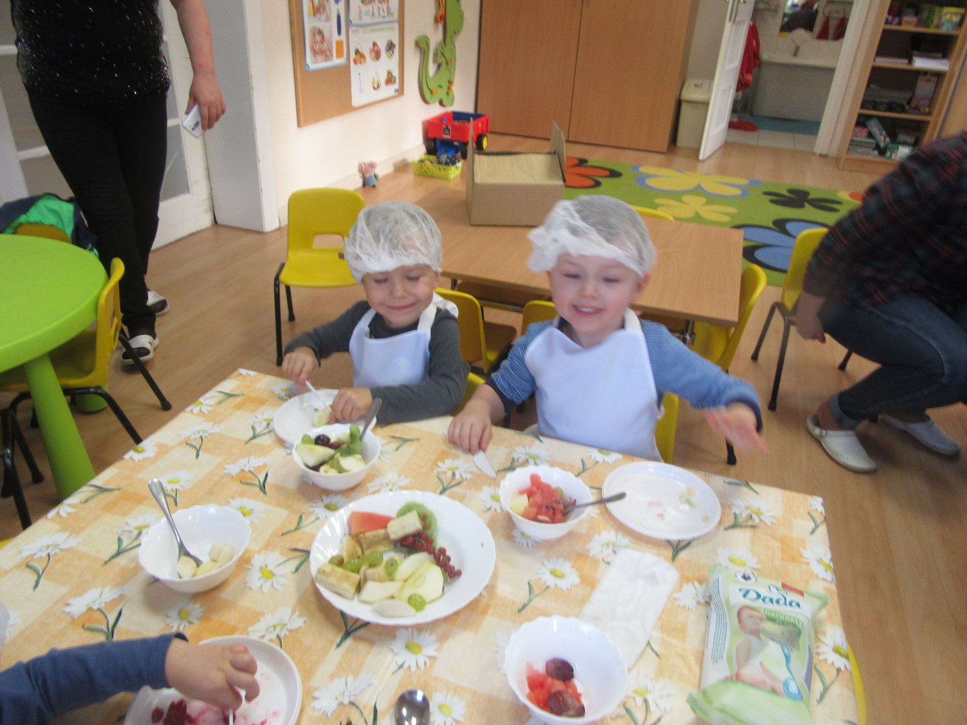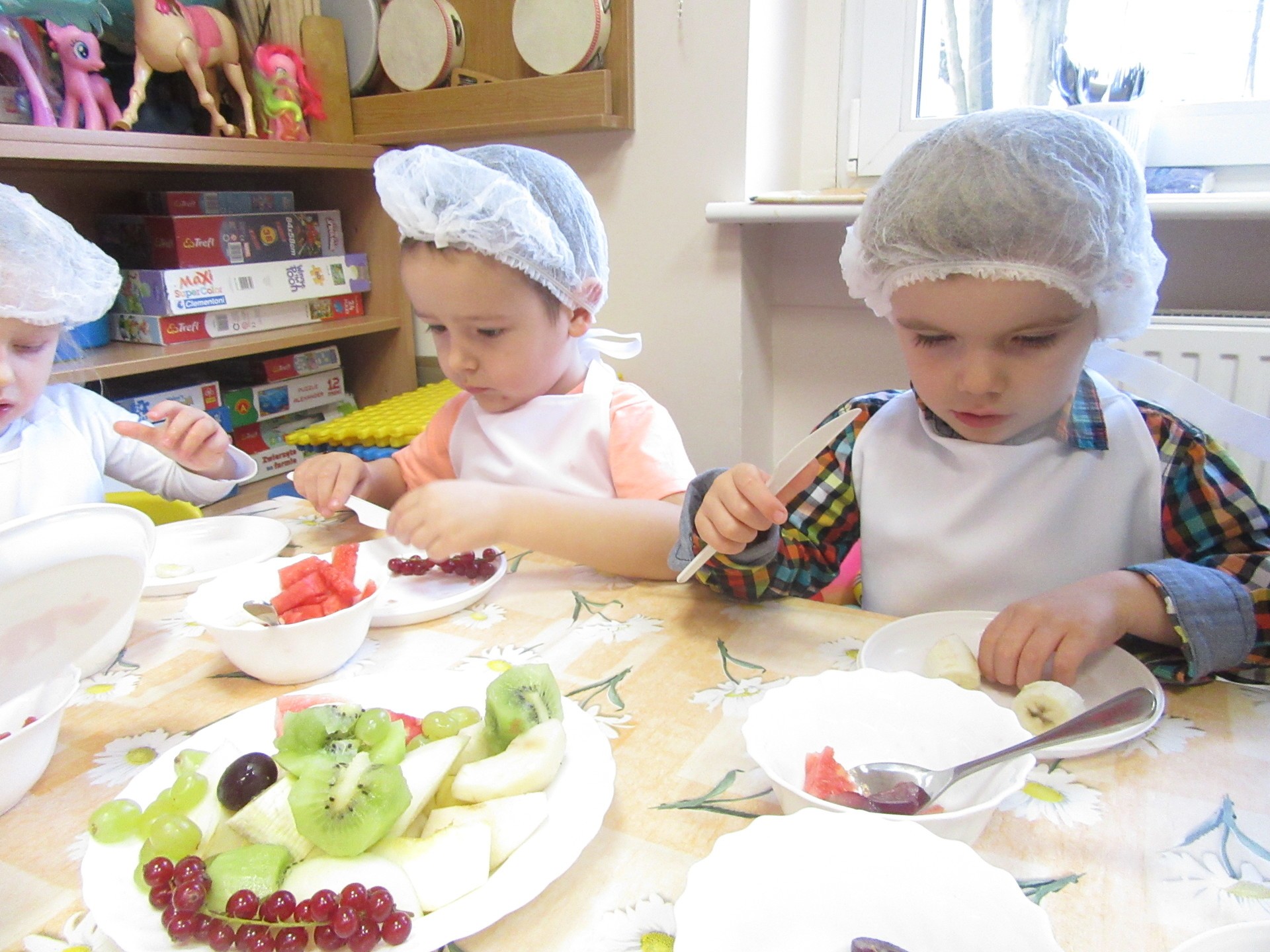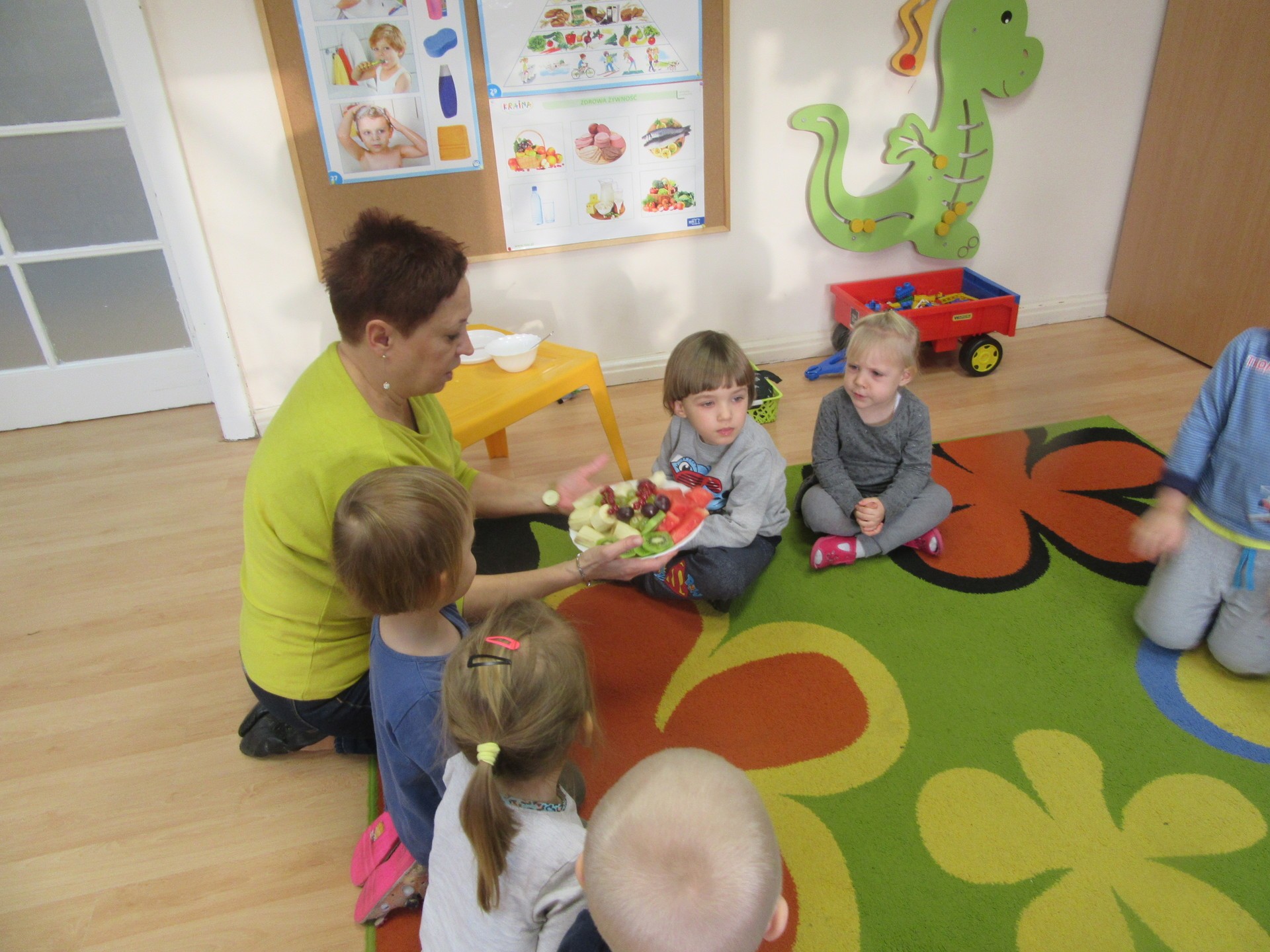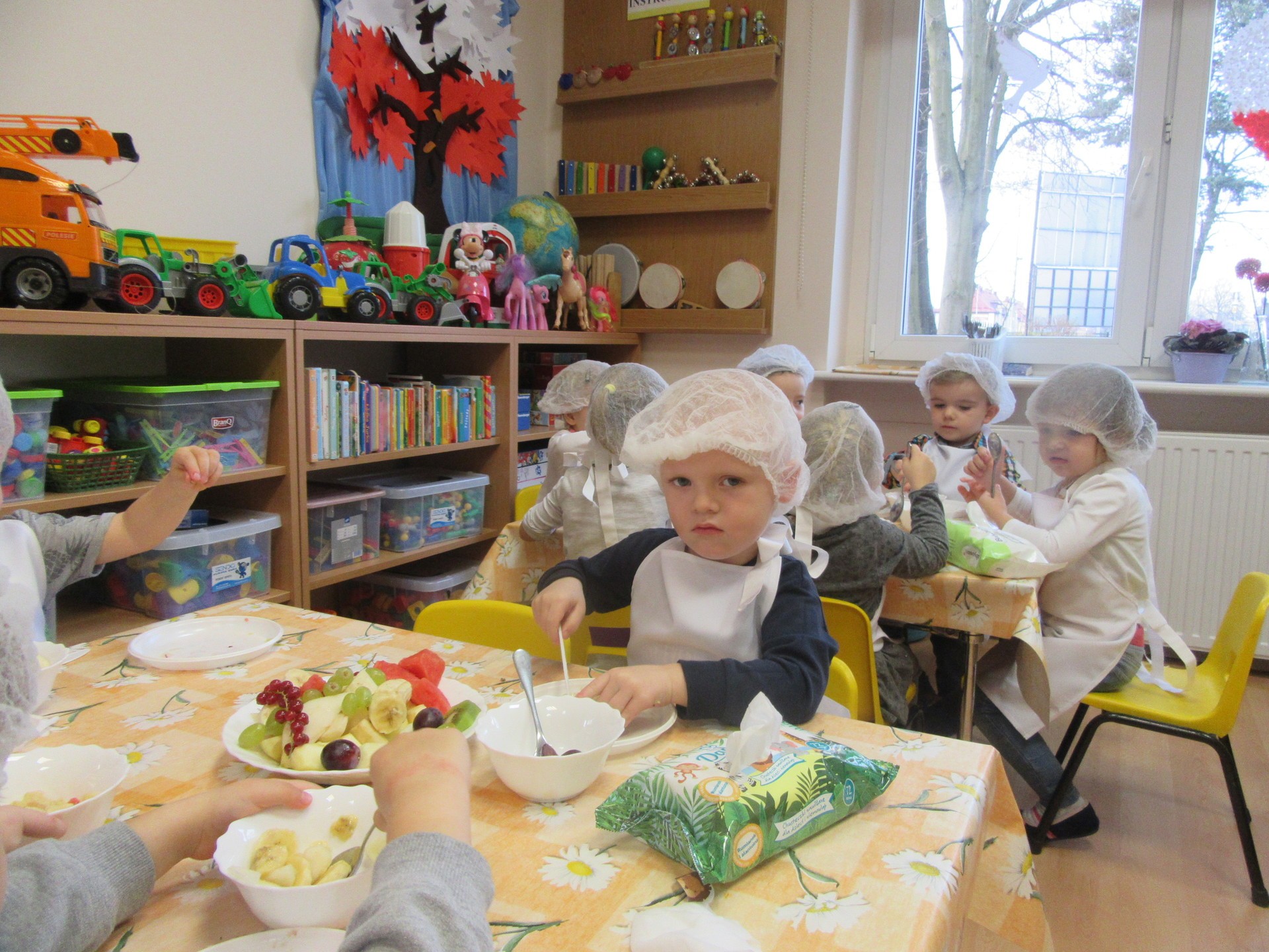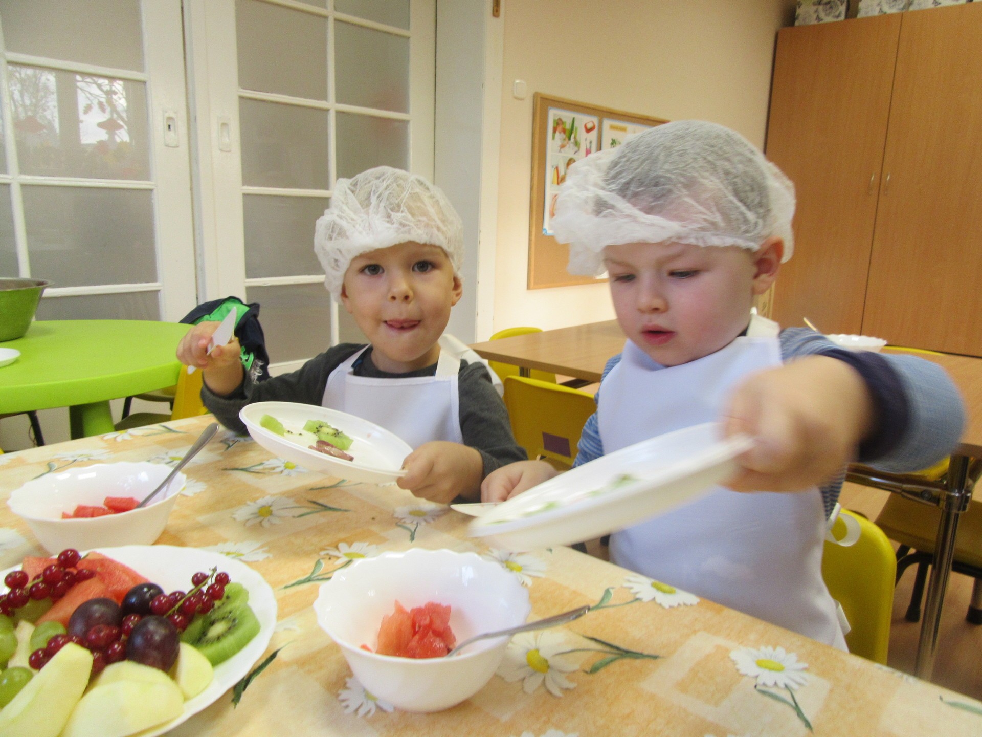 Smaczna, zdrowa, kolorowa – to sałatka owocowa. Kierując się tą myślą, a także tematyką kompleksową „Zdrowo się odżywiam” postanowiliśmy samodzielnie przygotować zdrową, witaminową przekąskę. Przedszkolaki odpowiednio przygotowane do pracy, z wielkim zaangażowaniem dzielnie kroiły przyniesione do przedszkola owoce: jabłka, gruszki, banany, winogrona, kiwi, mandarynki. Po ich pokrojeniu nastąpiło wymieszanie wszystkich witaminowych słodkości, z których powstała sałatka.