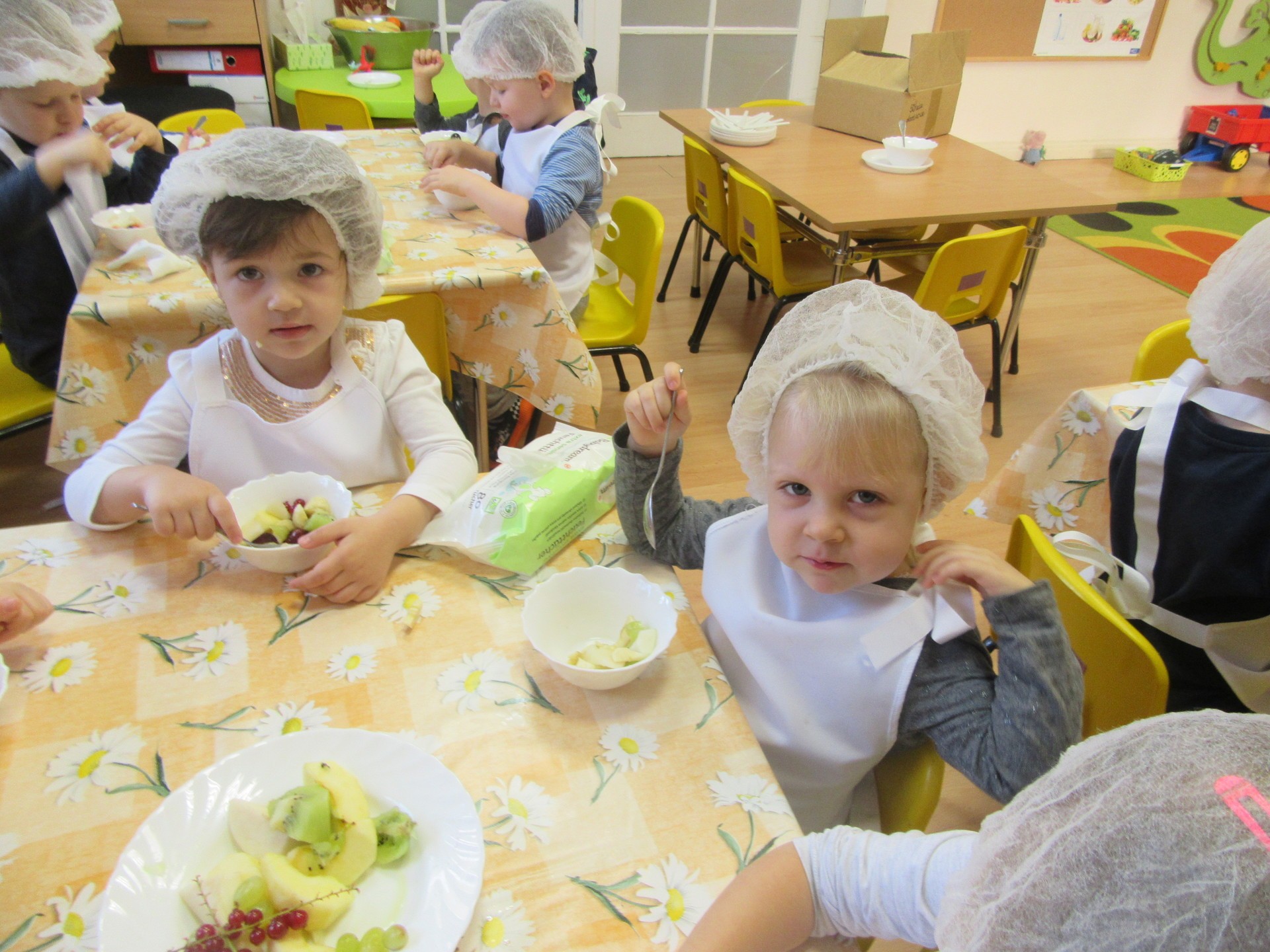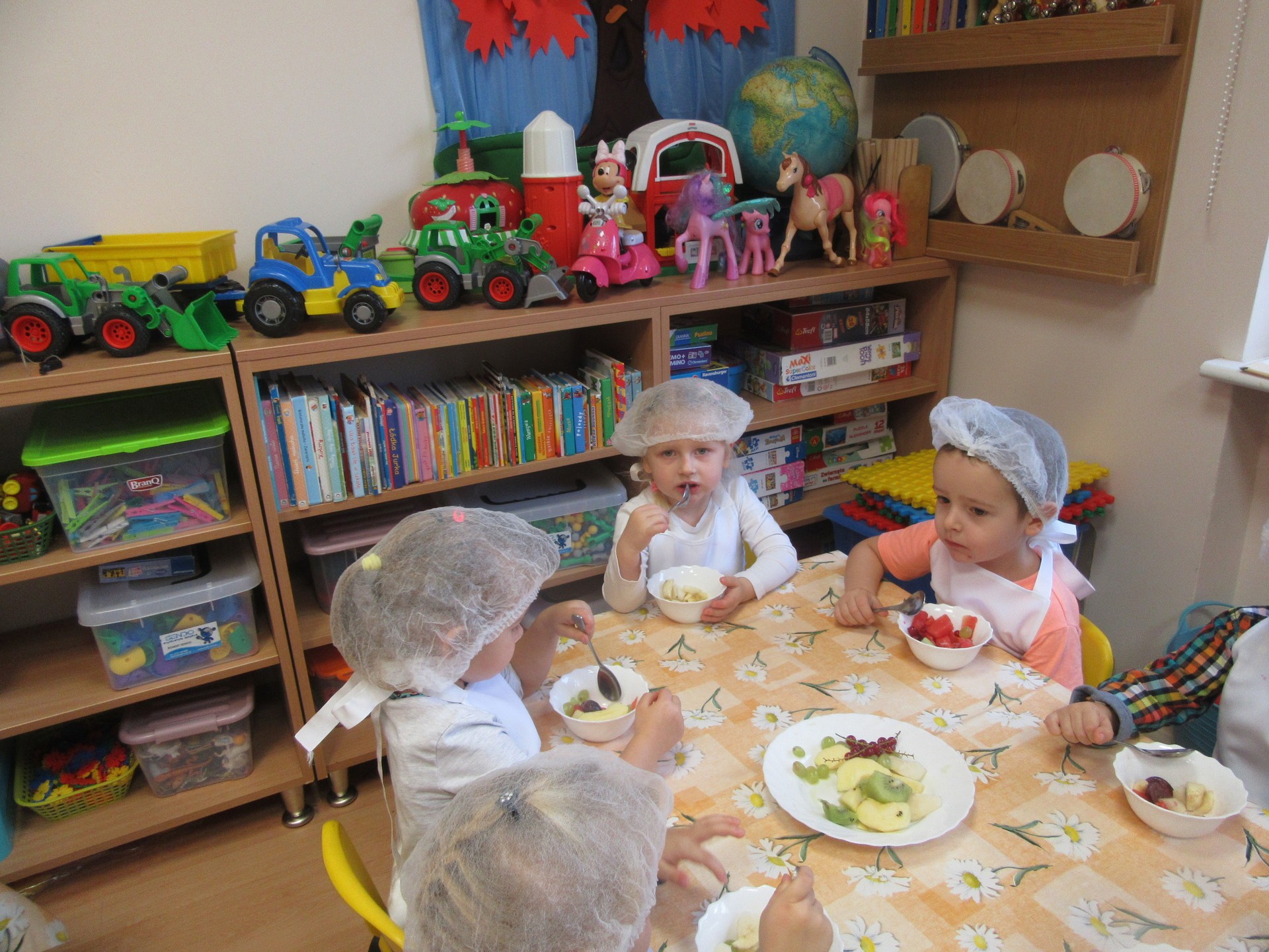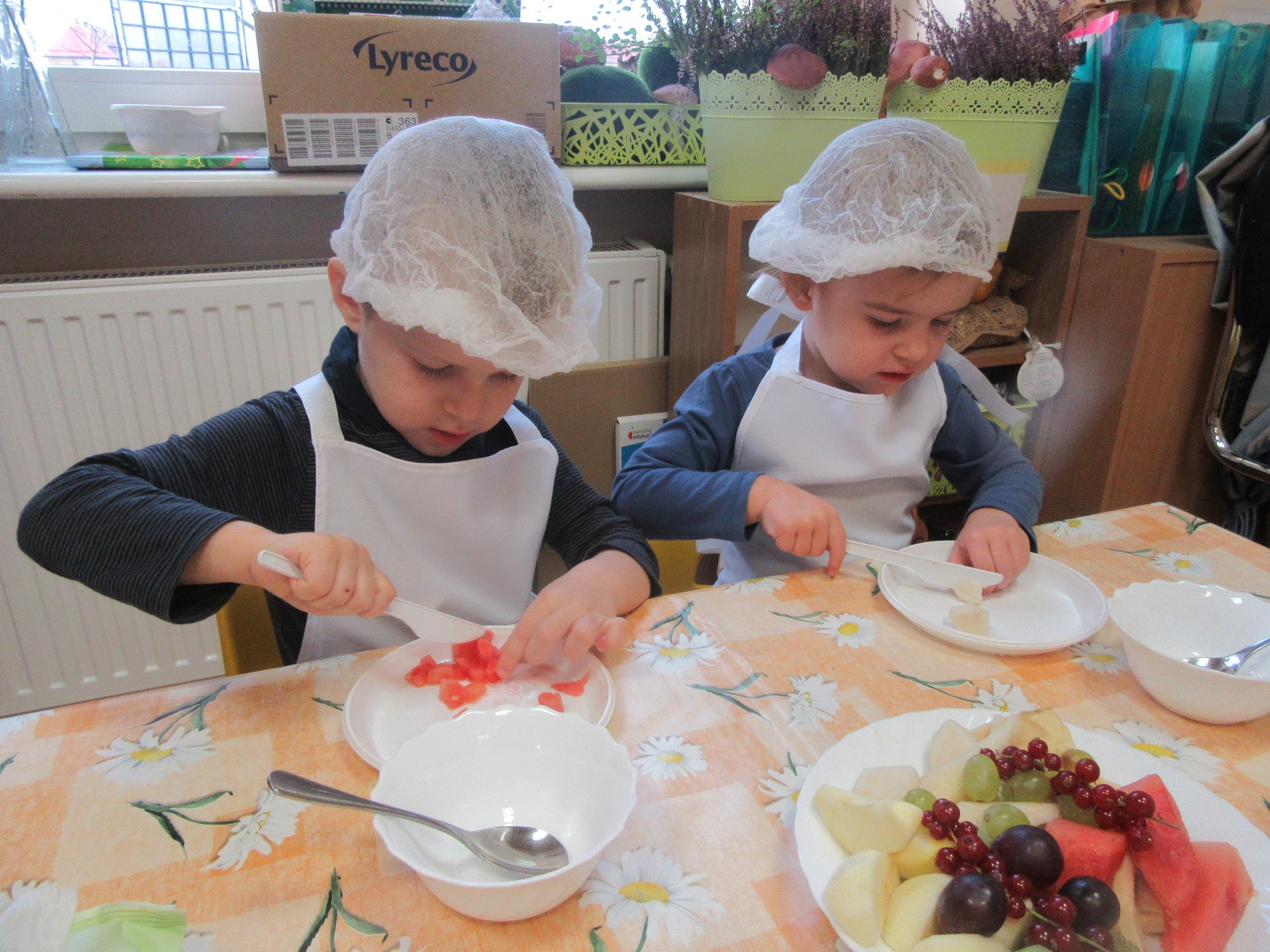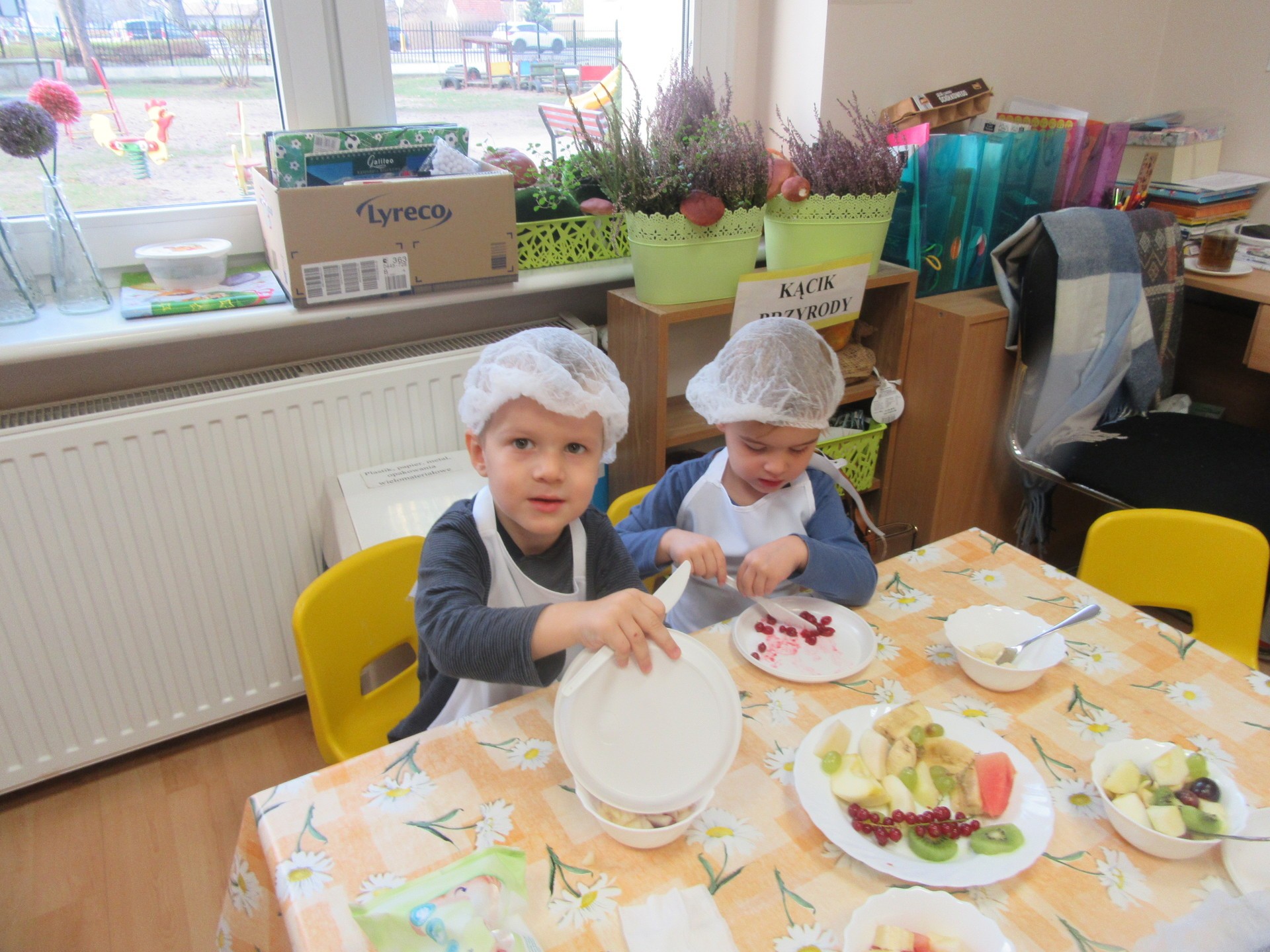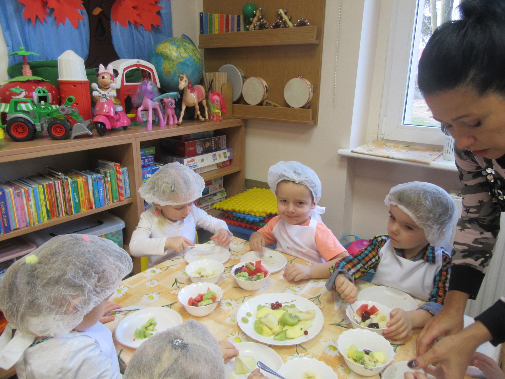 Smaczna, zdrowa, kolorowa – to sałatka owocowa. Kierując się tą myślą, a także tematyką kompleksową „Zdrowo się odżywiam” postanowiliśmy samodzielnie przygotować zdrową, witaminową przekąskę. Przedszkolaki odpowiednio przygotowane do pracy, z wielkim zaangażowaniem dzielnie kroiły przyniesione do przedszkola owoce: jabłka, gruszki, banany, winogrona, kiwi, mandarynki. Po ich pokrojeniu nastąpiło wymieszanie wszystkich witaminowych słodkości, z których powstała sałatka.