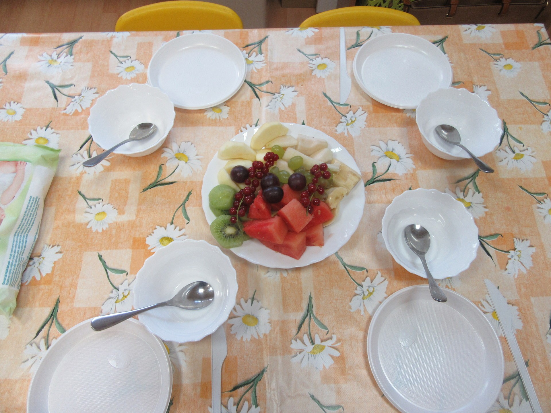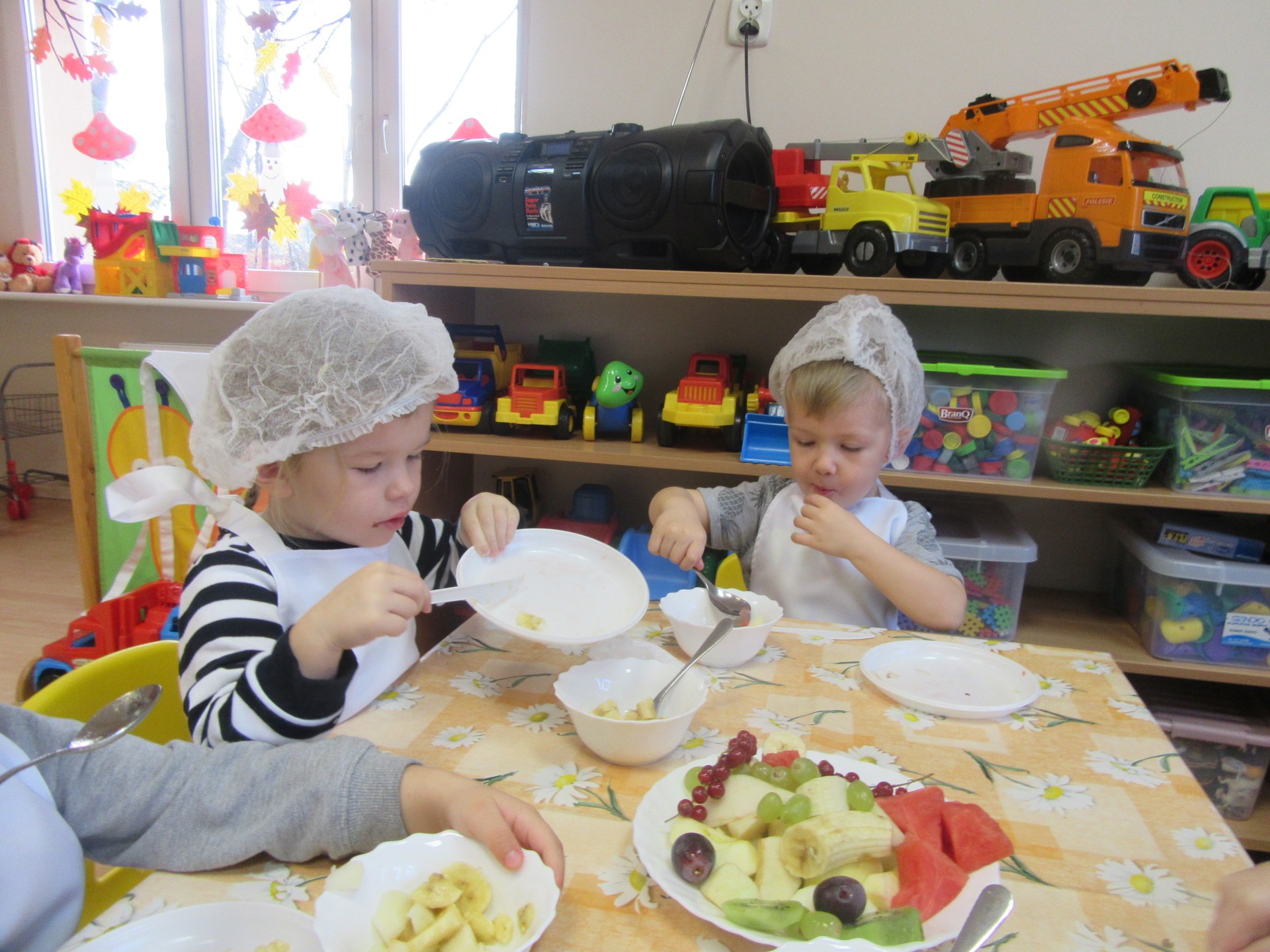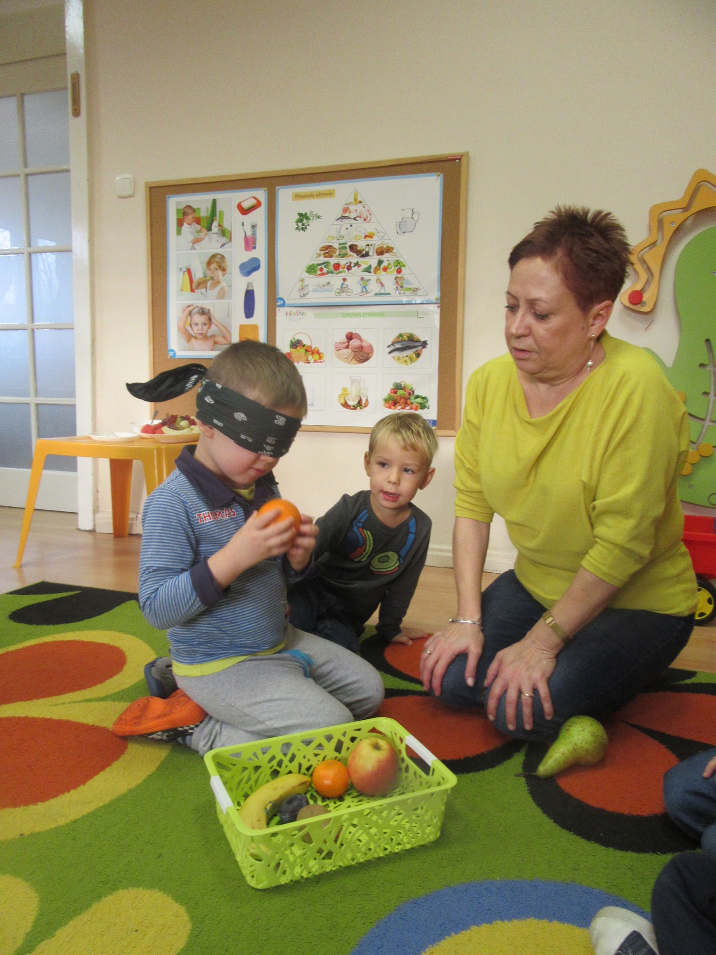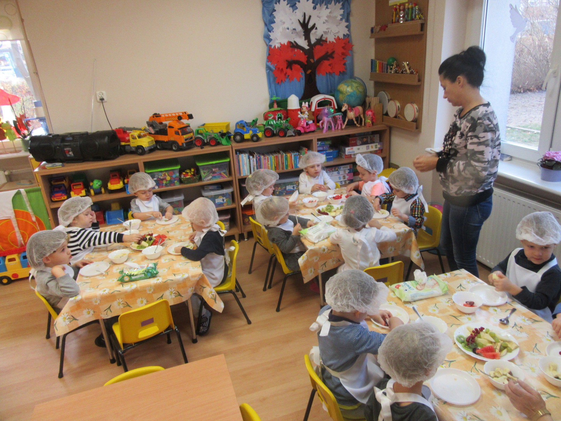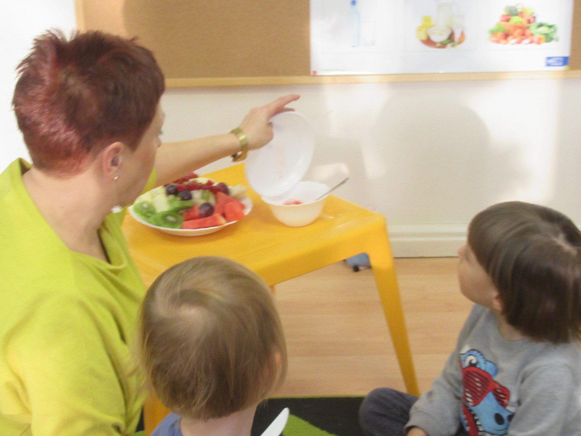 Smaczna, zdrowa, kolorowa – to sałatka owocowa. Kierując się tą myślą, a także tematyką kompleksową „Zdrowo się odżywiam” postanowiliśmy samodzielnie przygotować zdrową, witaminową przekąskę. Przedszkolaki odpowiednio przygotowane do pracy, z wielkim zaangażowaniem dzielnie kroiły przyniesione do przedszkola owoce: jabłka, gruszki, banany, winogrona, kiwi, mandarynki. Po ich pokrojeniu nastąpiło wymieszanie wszystkich witaminowych słodkości, z których powstała sałatka.