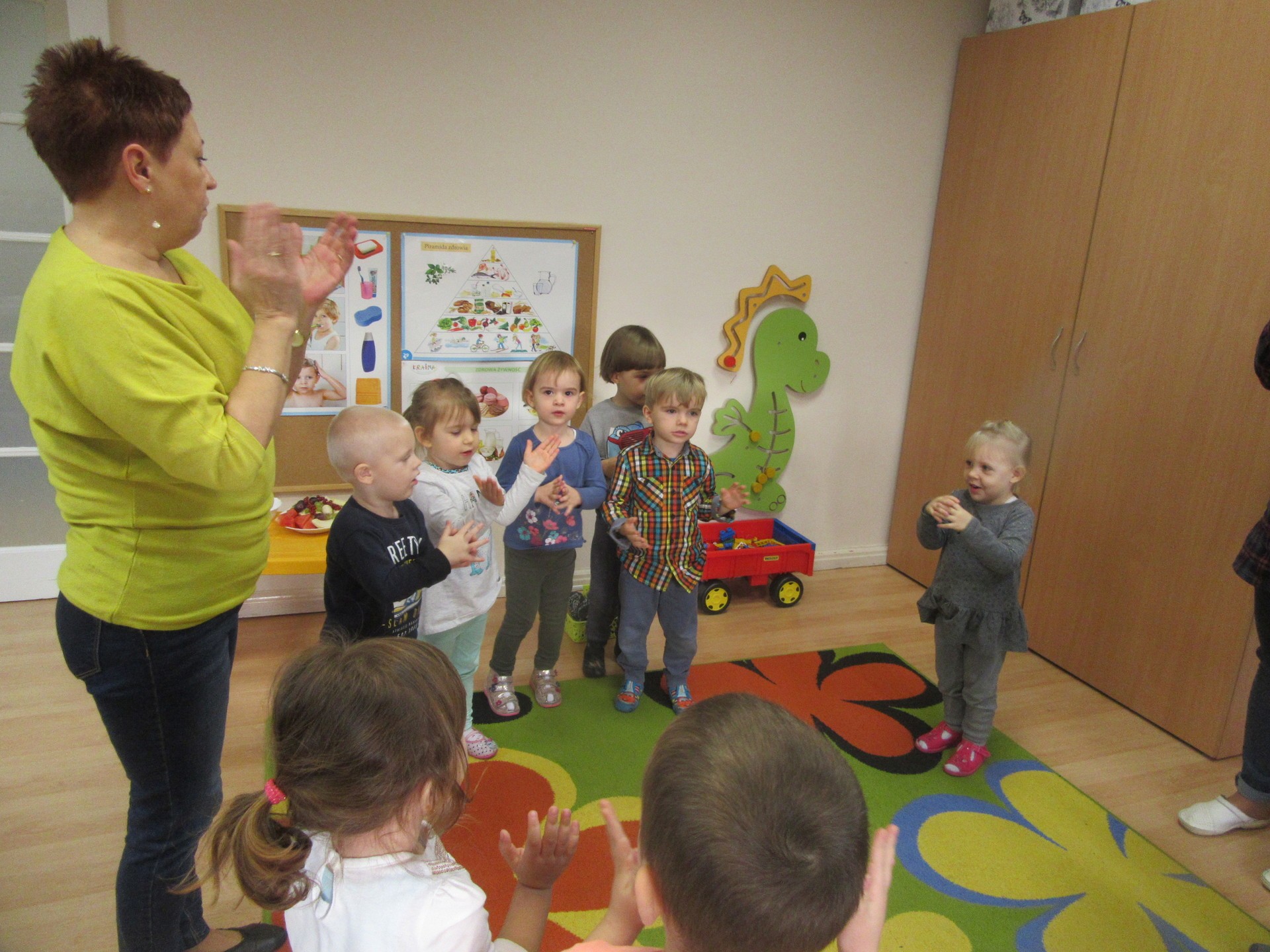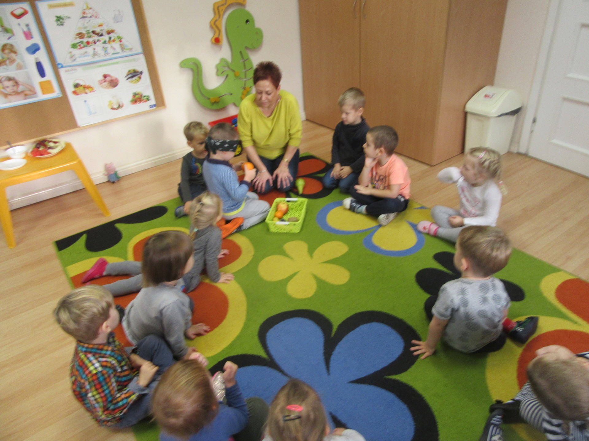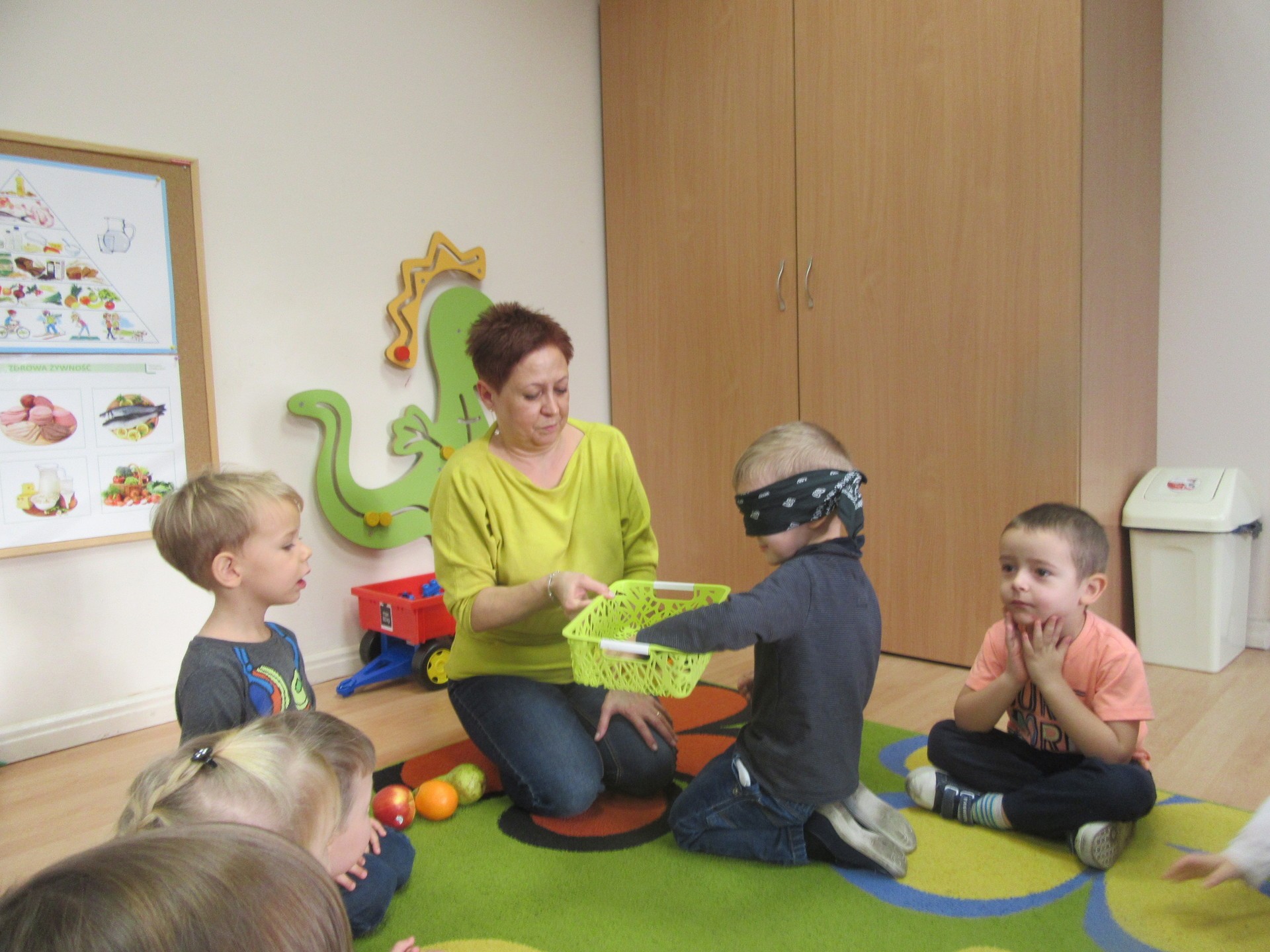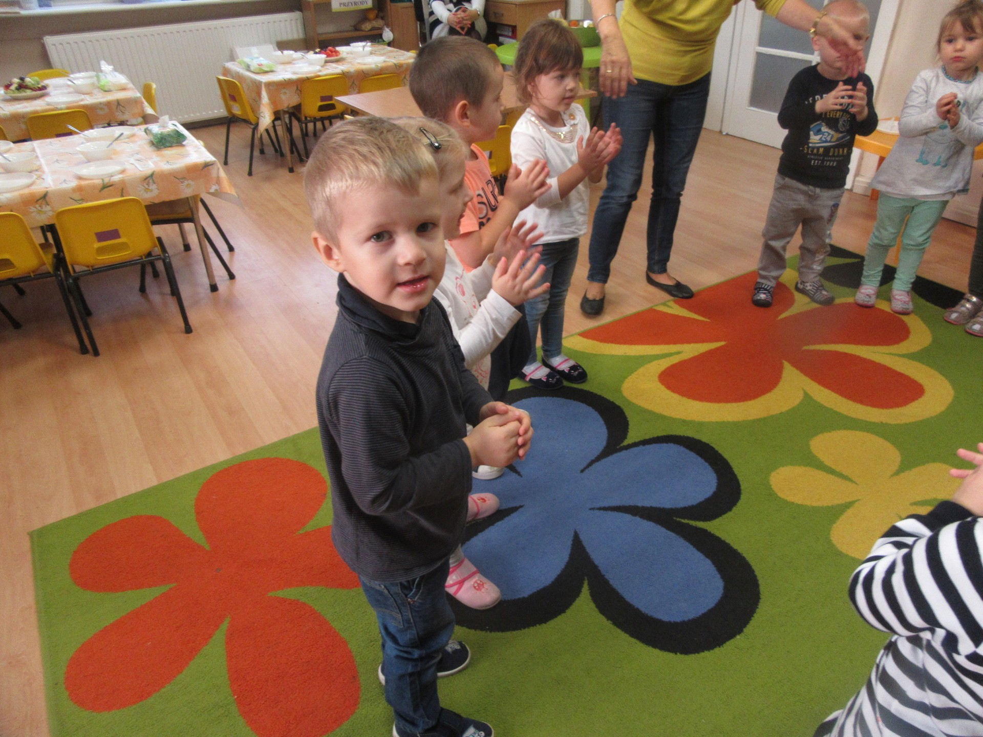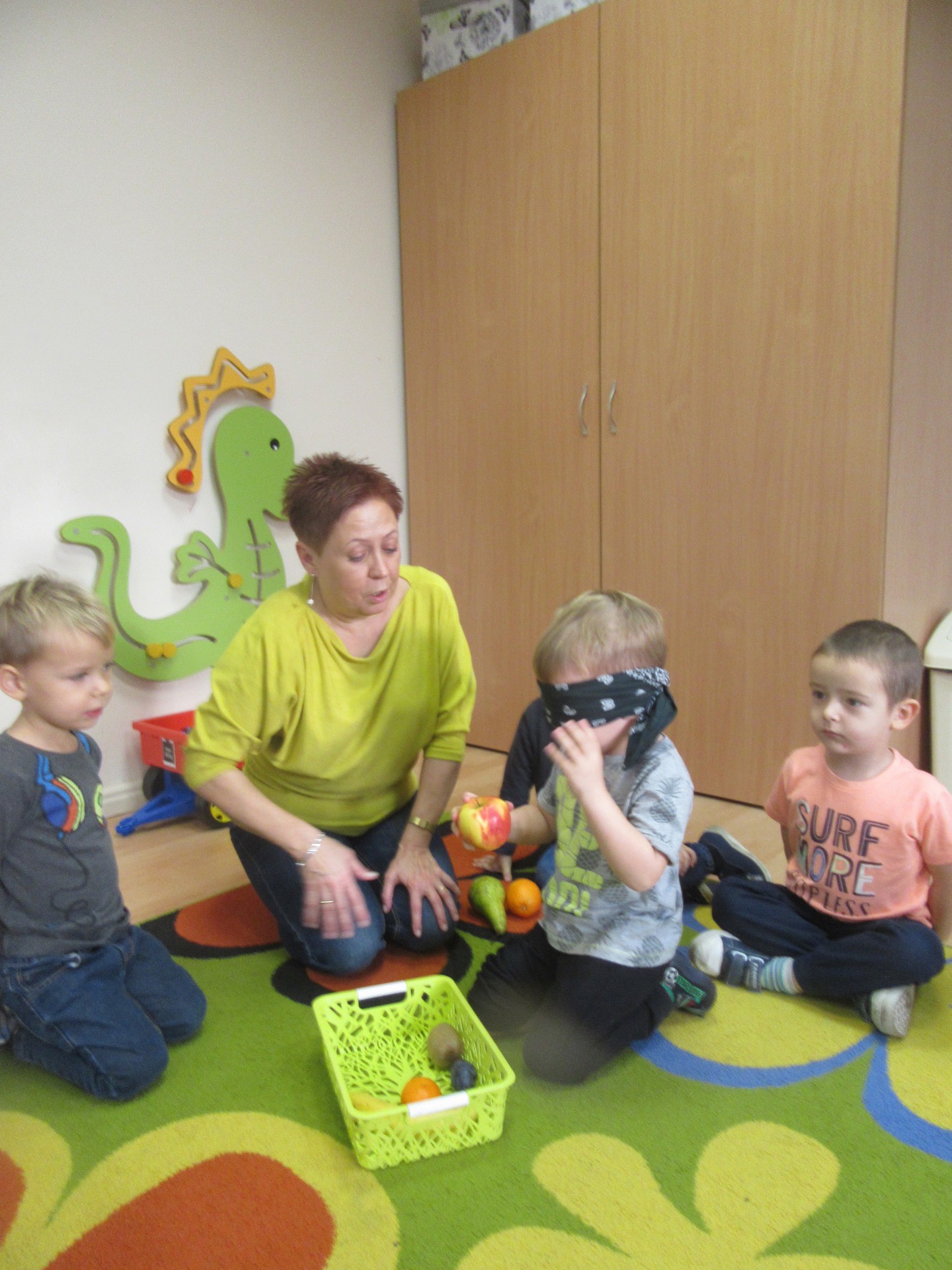 Smaczna, zdrowa, kolorowa – to sałatka owocowa. Kierując się tą myślą, a także tematyką kompleksową „Zdrowo się odżywiam” postanowiliśmy samodzielnie przygotować zdrową, witaminową przekąskę. Przedszkolaki odpowiednio przygotowane do pracy, z wielkim zaangażowaniem dzielnie kroiły przyniesione do przedszkola owoce: jabłka, gruszki, banany, winogrona, kiwi, mandarynki. Po ich pokrojeniu nastąpiło wymieszanie wszystkich witaminowych słodkości, z których powstała sałatka.