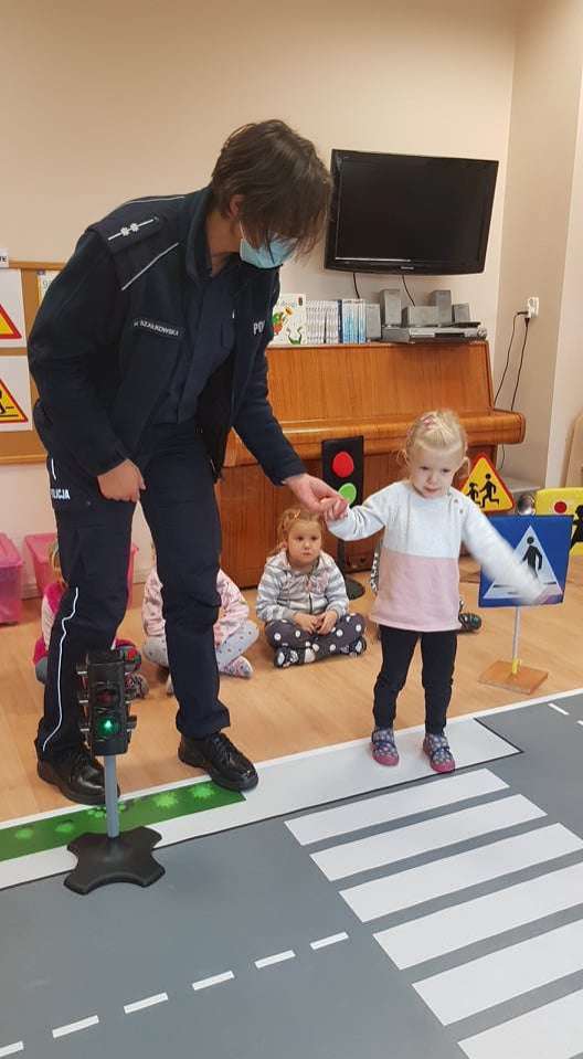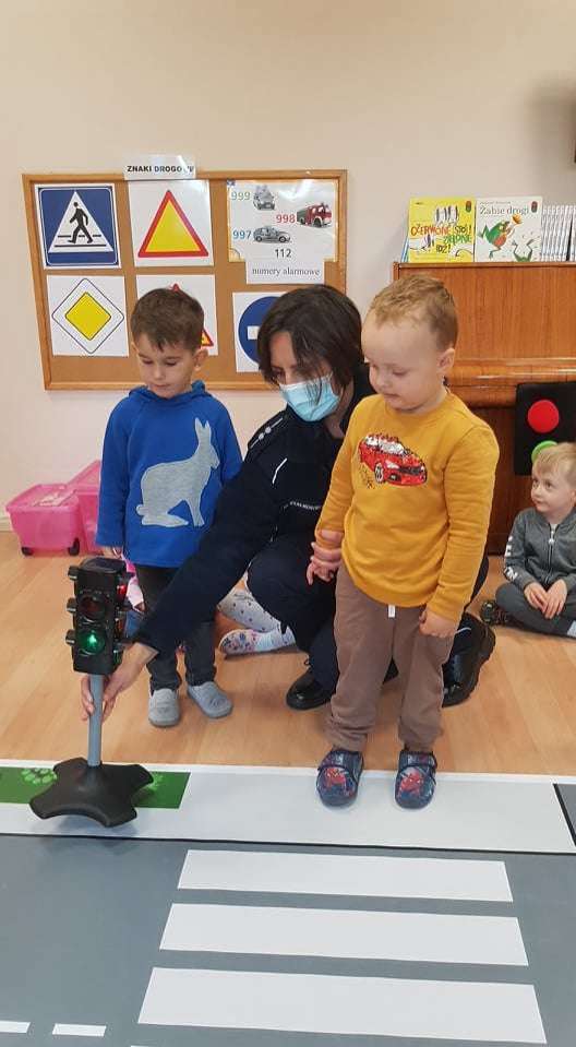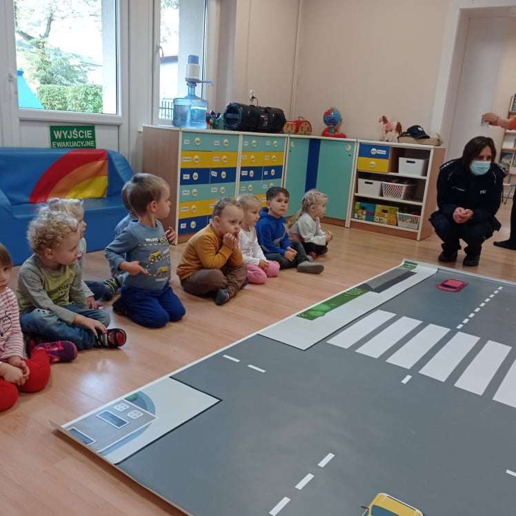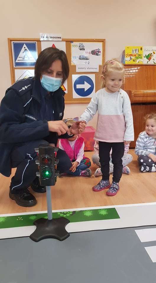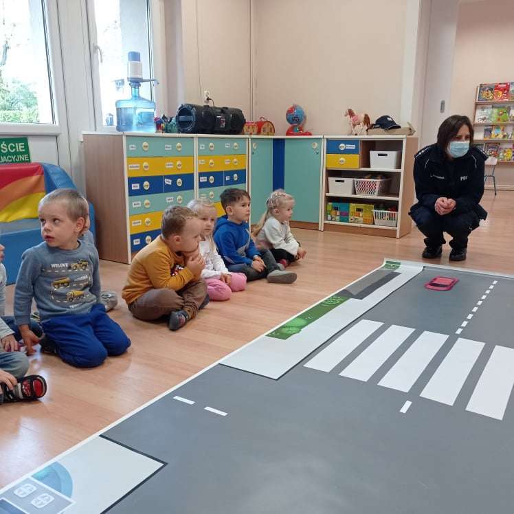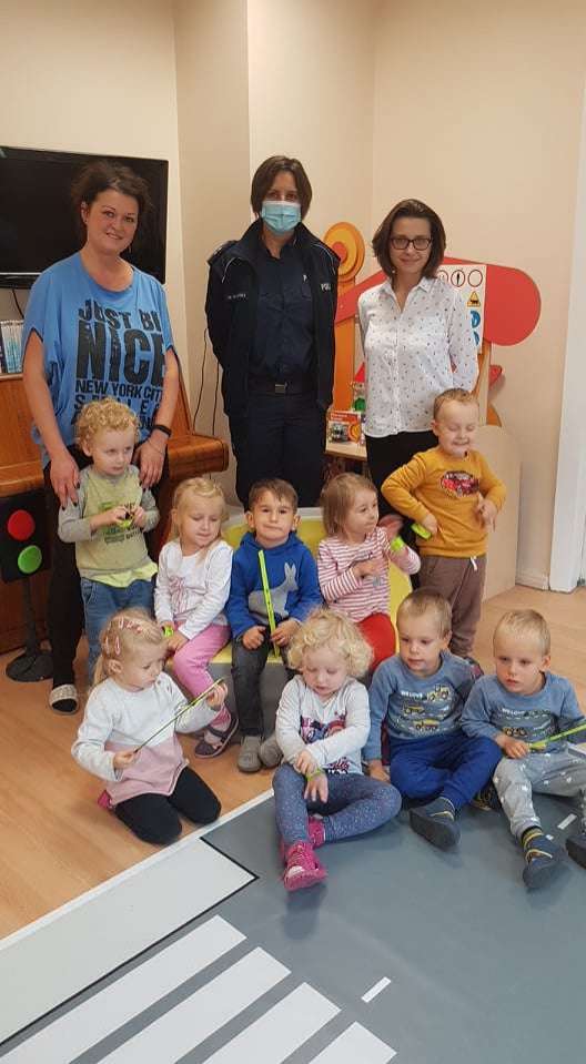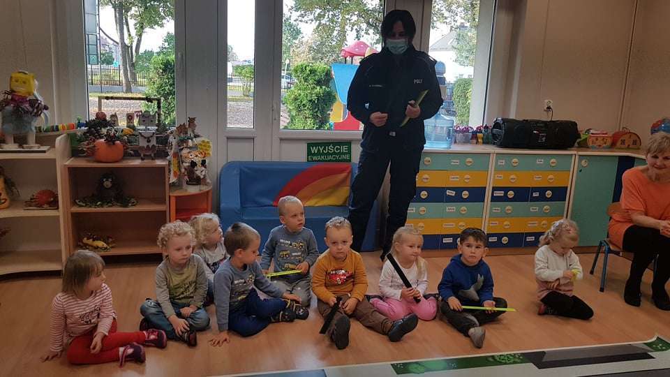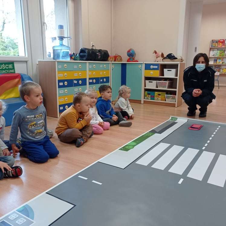 15.10.2021 r. gościliśmy w przedszkolu p. policjantkę, która przybliżyła dzieciom zasady bezpieczeństwa ruchu drogowego. Spotkania odbyły się oddzielnie w każdej grupie wiekowej.