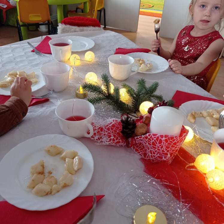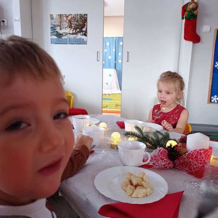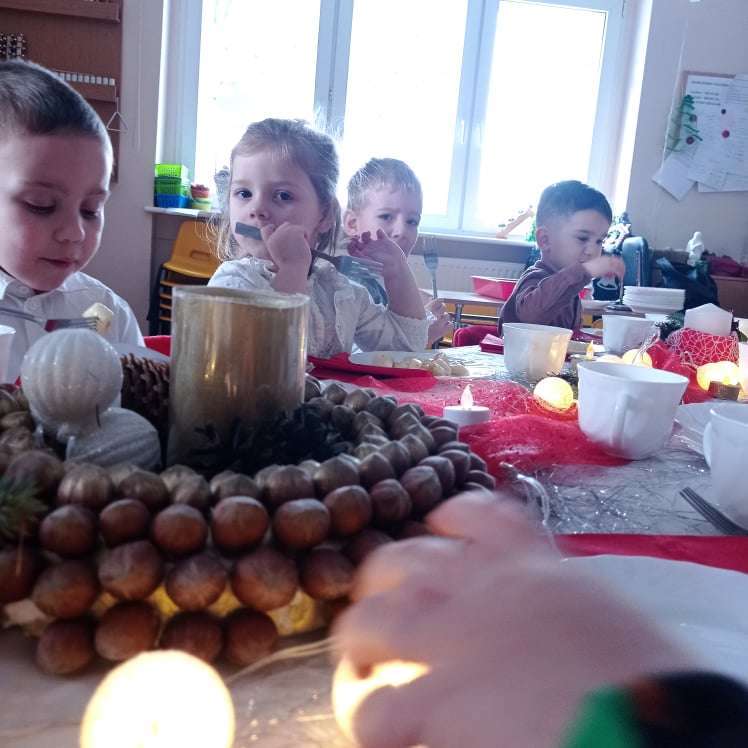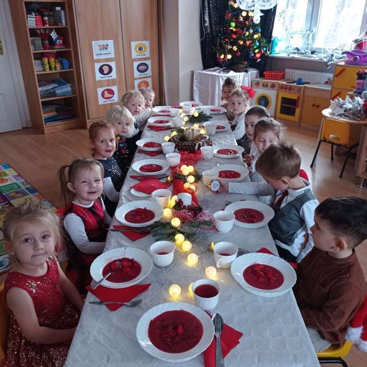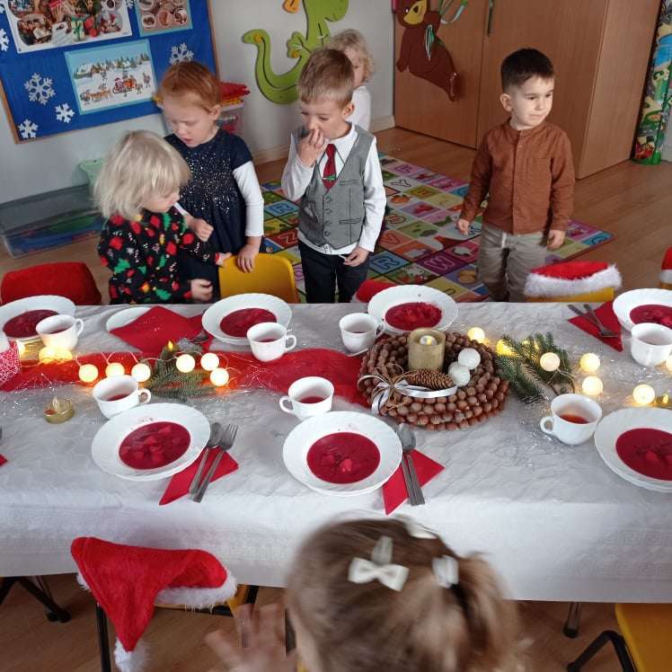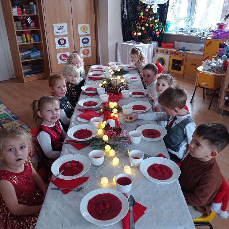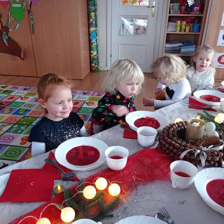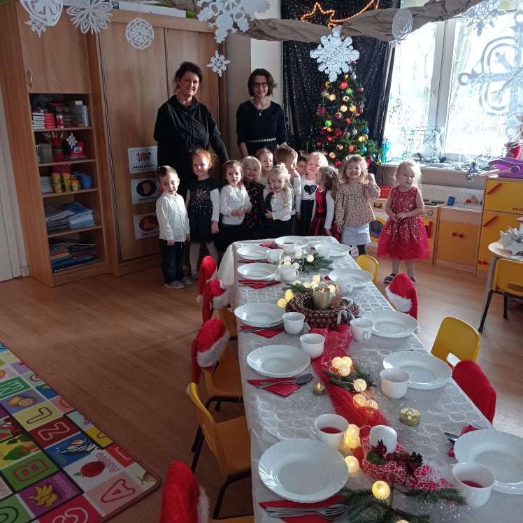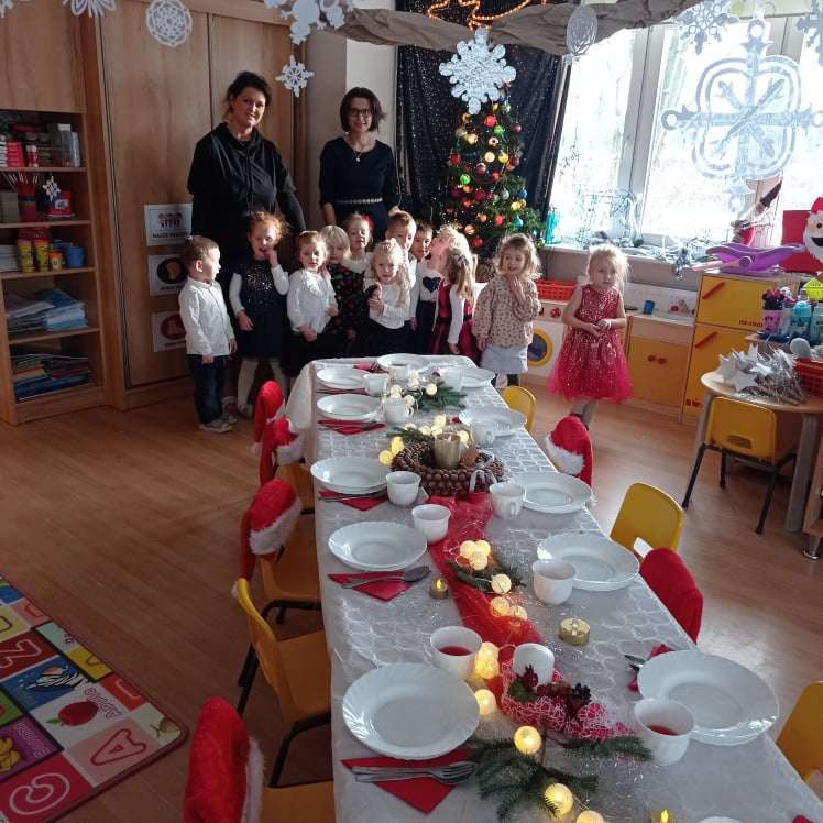 22 grudnia w naszym przedszkolu odbyła się uroczysta Wigilia. Zgodnie z tradycją połamaliśmy się opłatkiem i złożyliśmy sobie życzenia po czym zasiedliśmy do wspólnej wigilijnej wieczerzy.