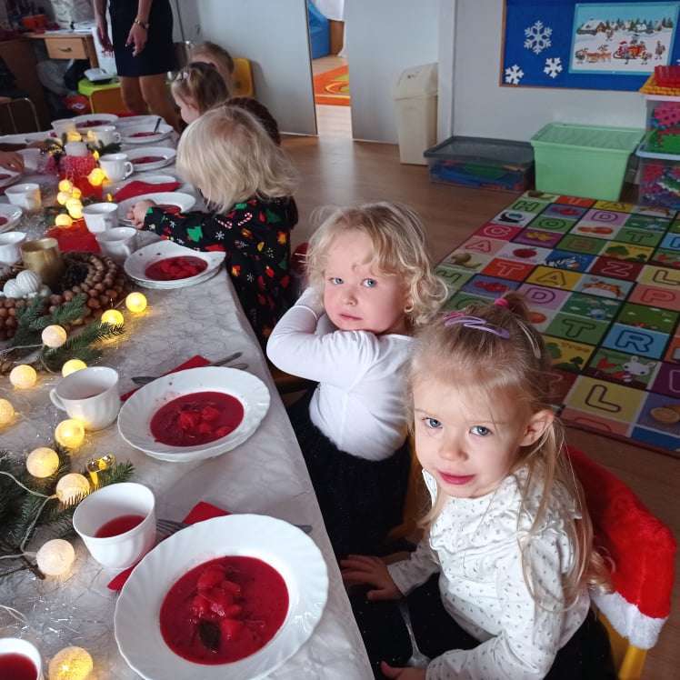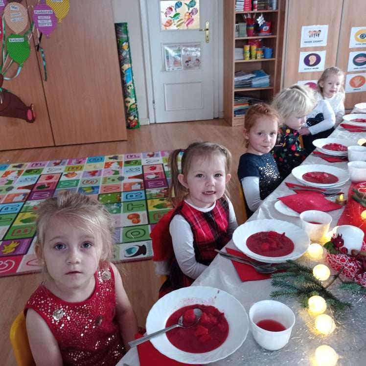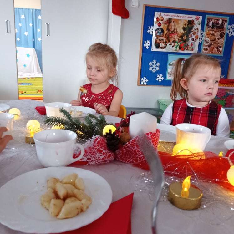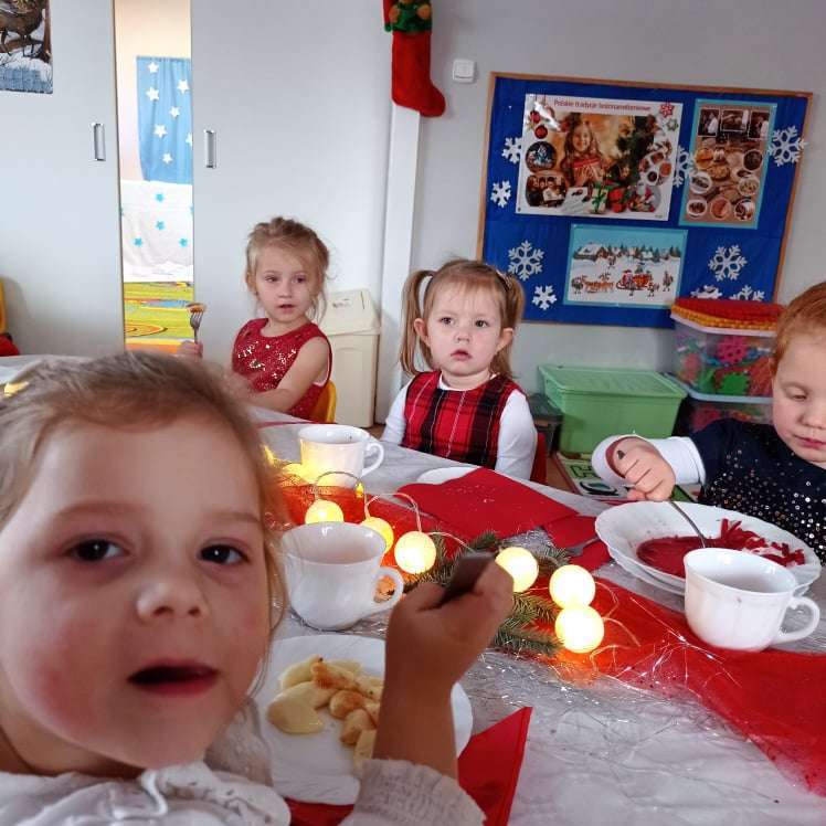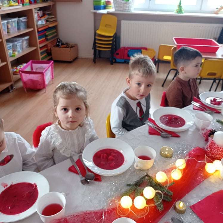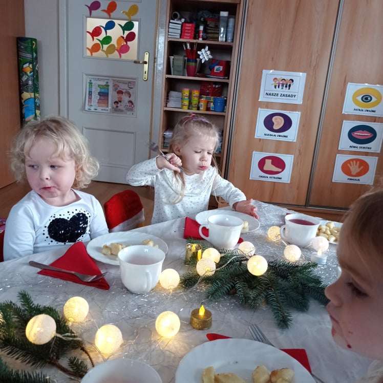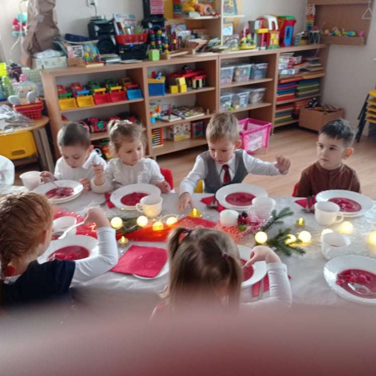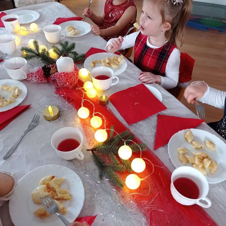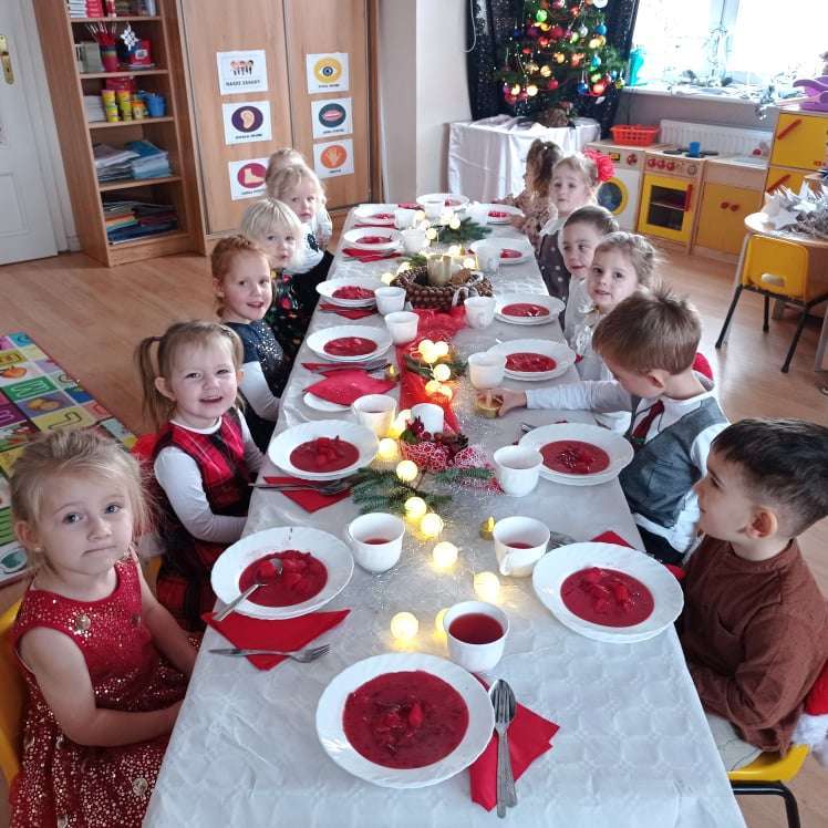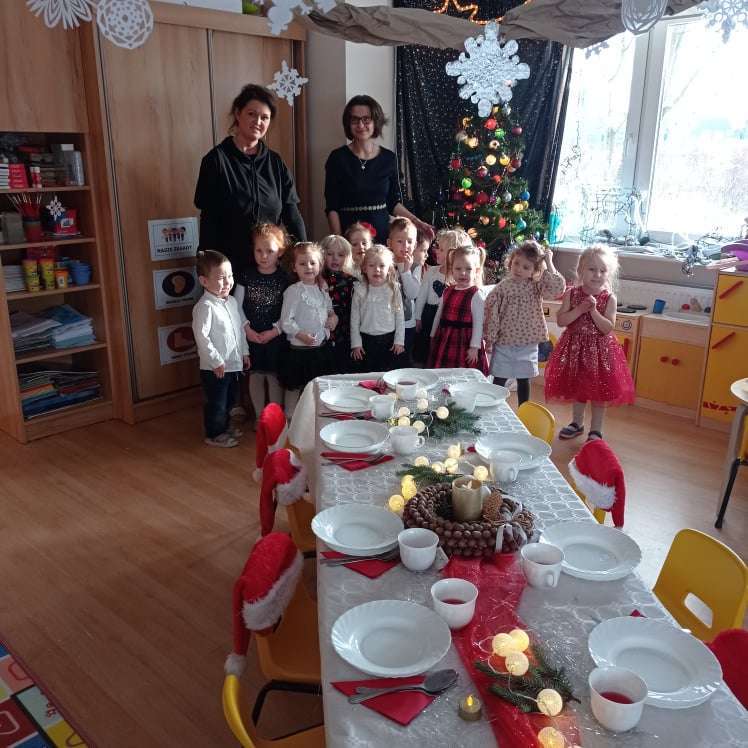 22 grudnia w naszym przedszkolu odbyła się uroczysta Wigilia. Zgodnie z tradycją połamaliśmy się opłatkiem i złożyliśmy sobie życzenia po czym zasiedliśmy do wspólnej wigilijnej wieczerzy.