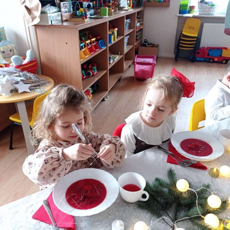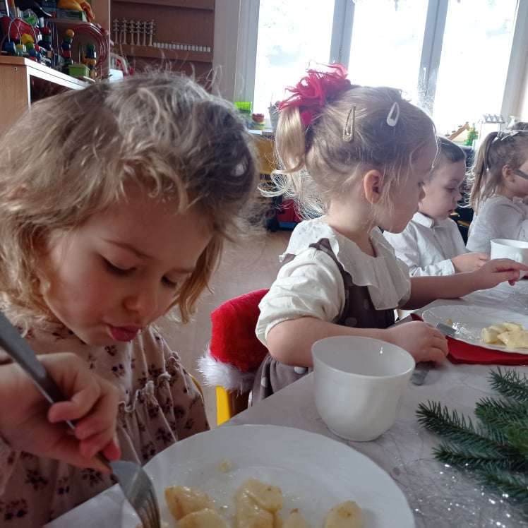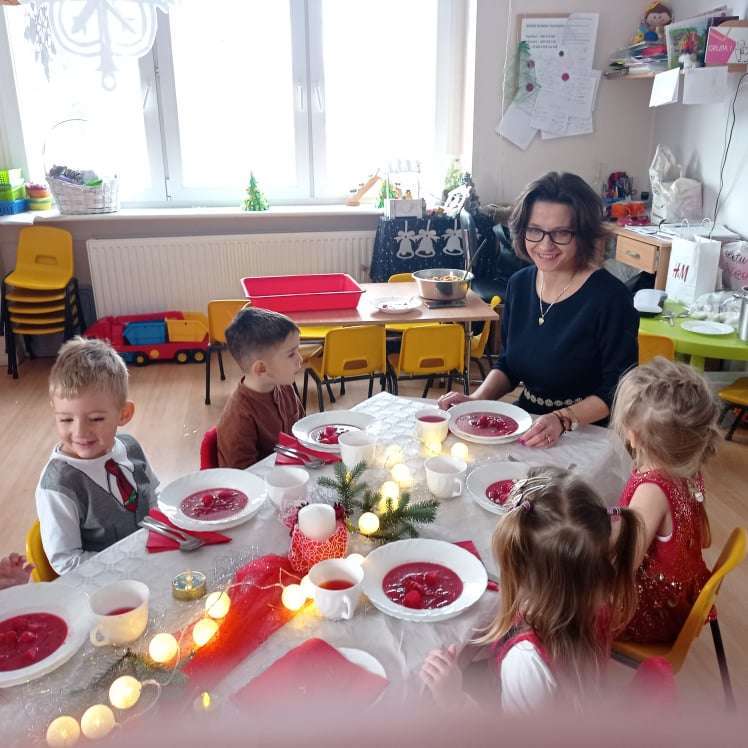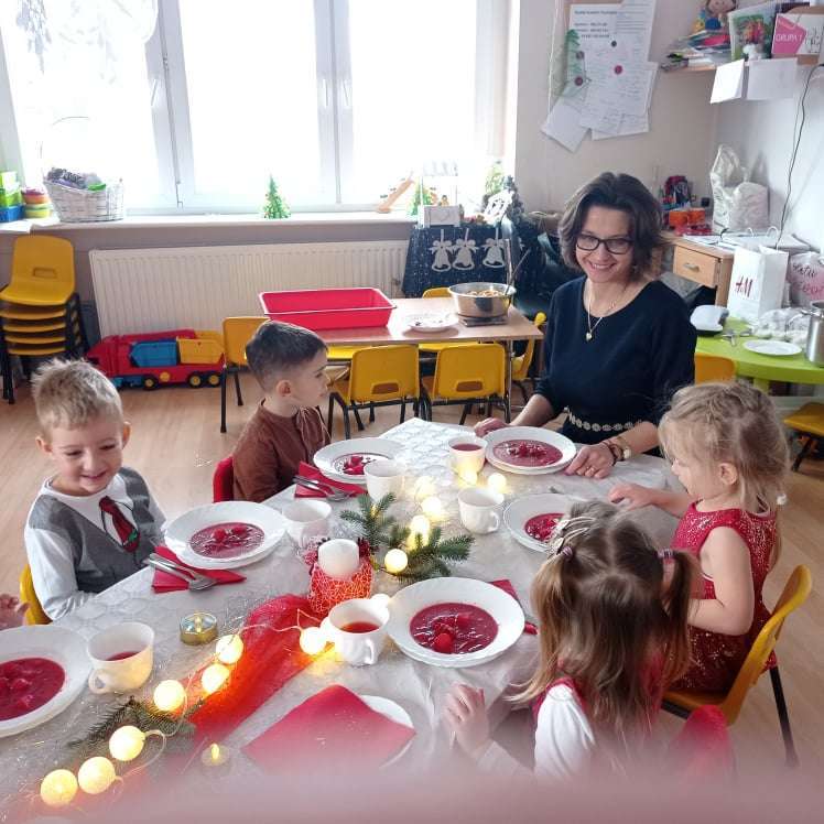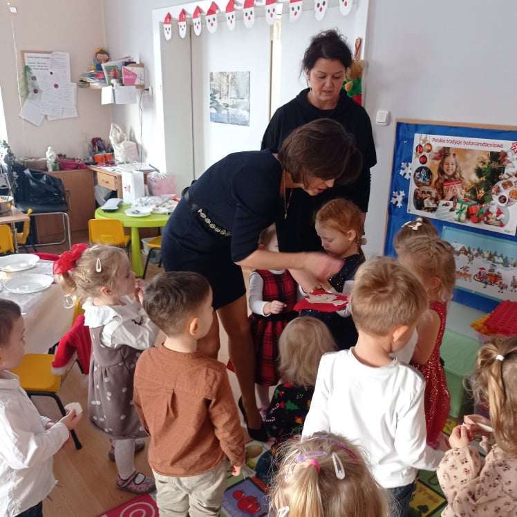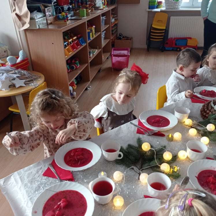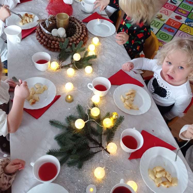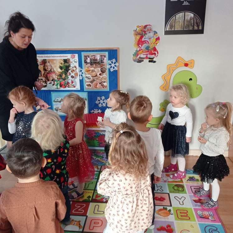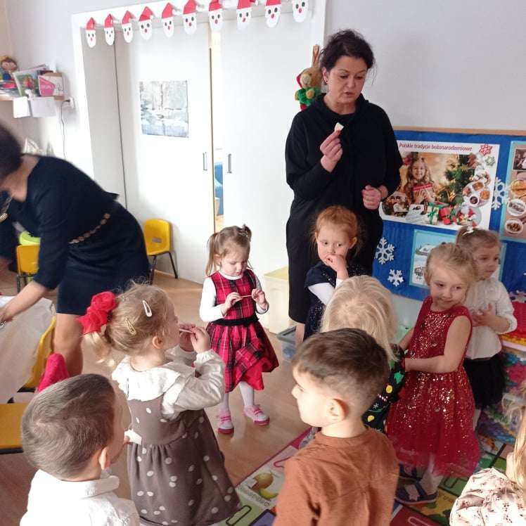 22 grudnia w naszym przedszkolu odbyła się uroczysta Wigilia. Zgodnie z tradycją połamaliśmy się opłatkiem i złożyliśmy sobie życzenia po czym zasiedliśmy do wspólnej wigilijnej wieczerzy.