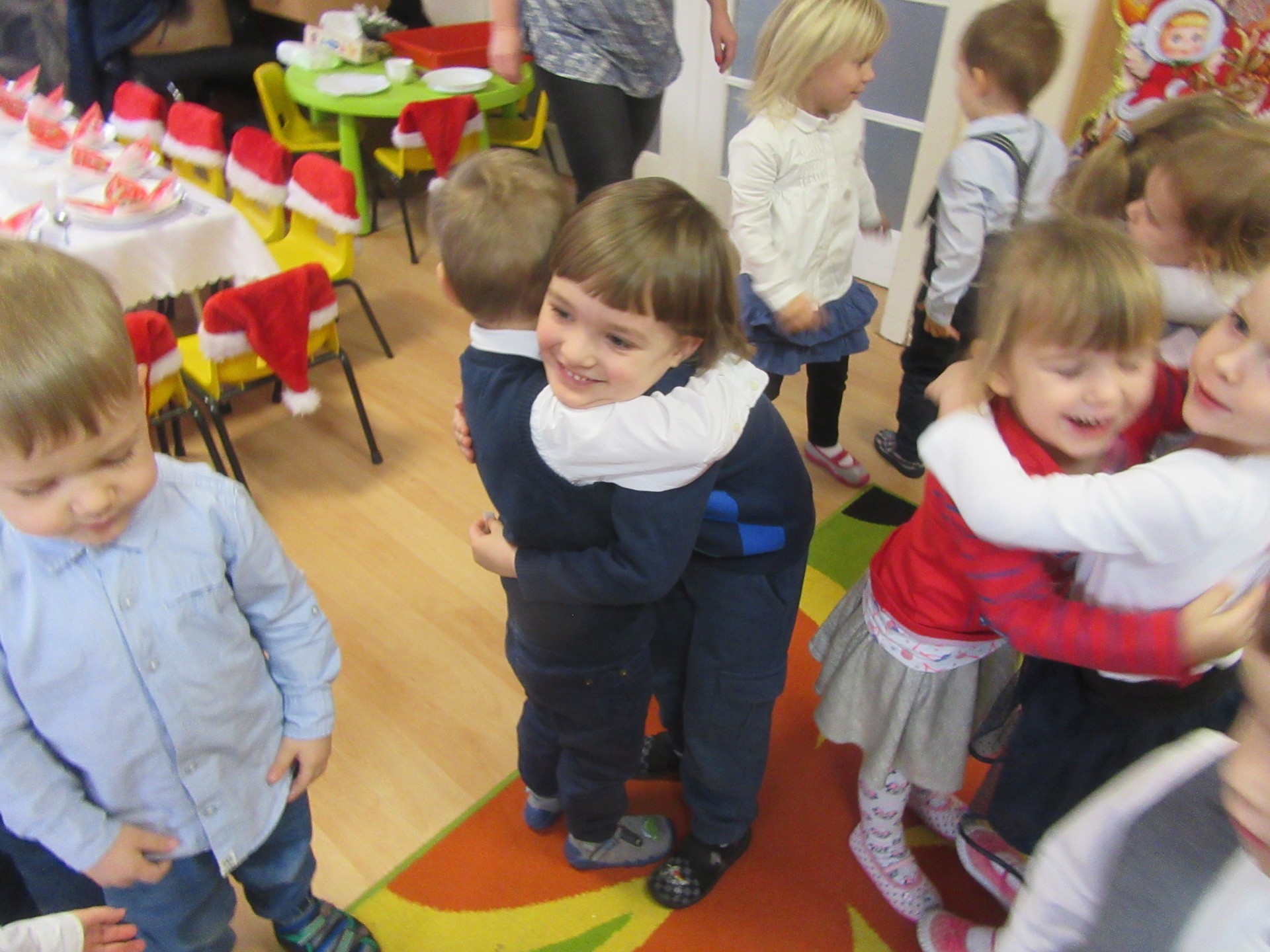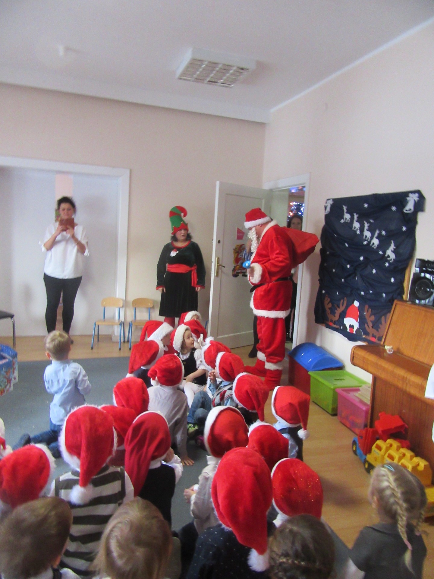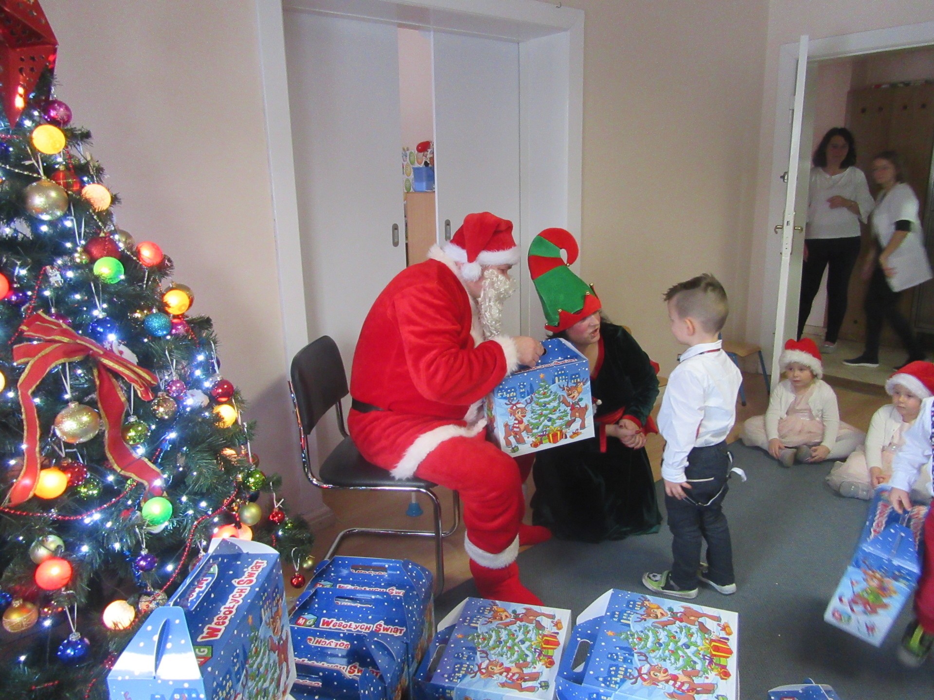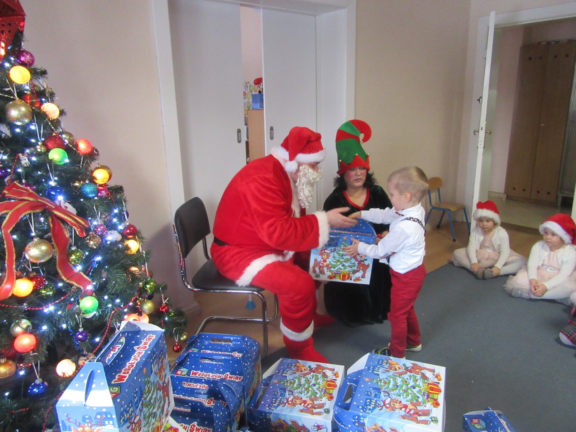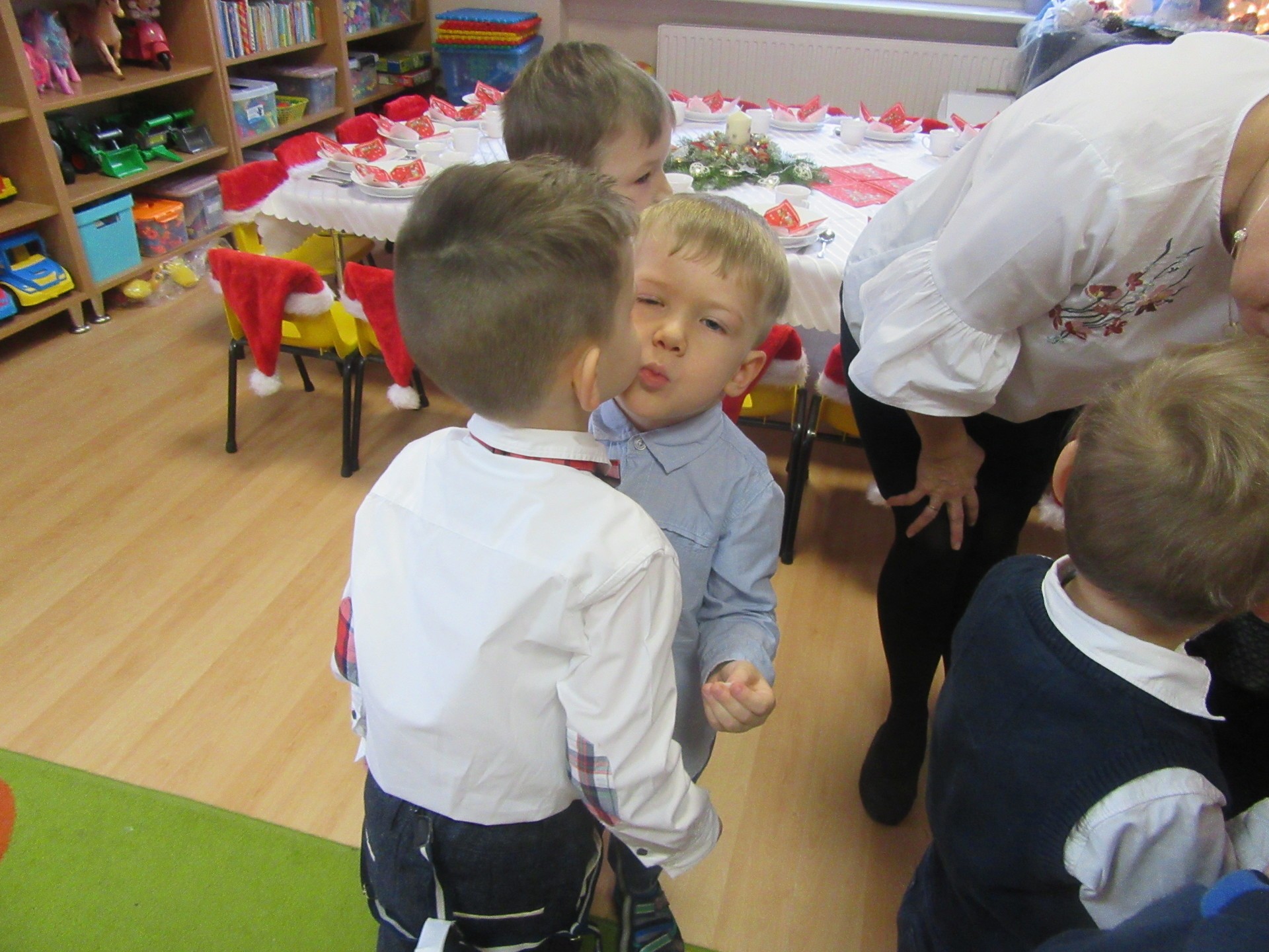 Wigilia Bożego Narodzenia to jeden z najpiękniejszych dni w roku, dlatego w naszej przedszkolnej rodzinie przeżywamy go bardzo uroczyście. Nasza przedszkolna wigilia odbyła się w piątek. Na początku dzieci zjadły wspólny posiłek. W dalszej części uroczystości dzieci odwiedził Mikołaj wraz z Elfem.Dzieliliśmy się również opłatkiem życząc sobie nawzajem wszelkiej pomyślności i Wesołych Świąt. Nasze spotkanie zakończyło się wspólnym kolędowaniem przy wigilijnym stole.
