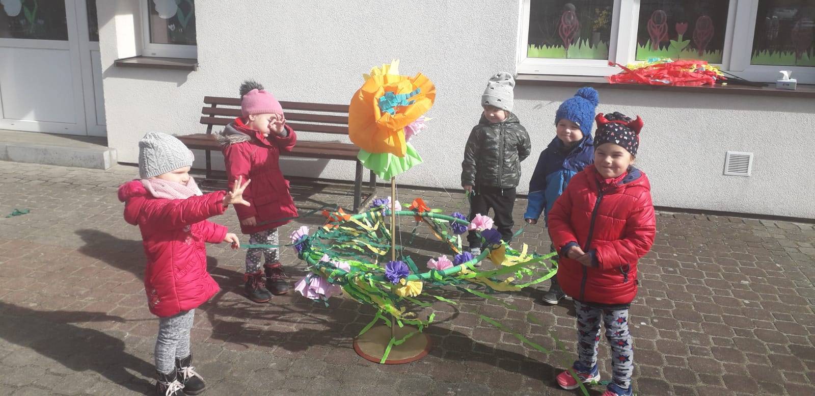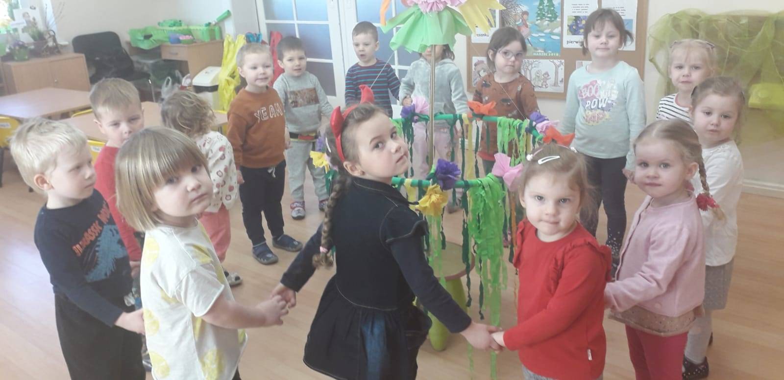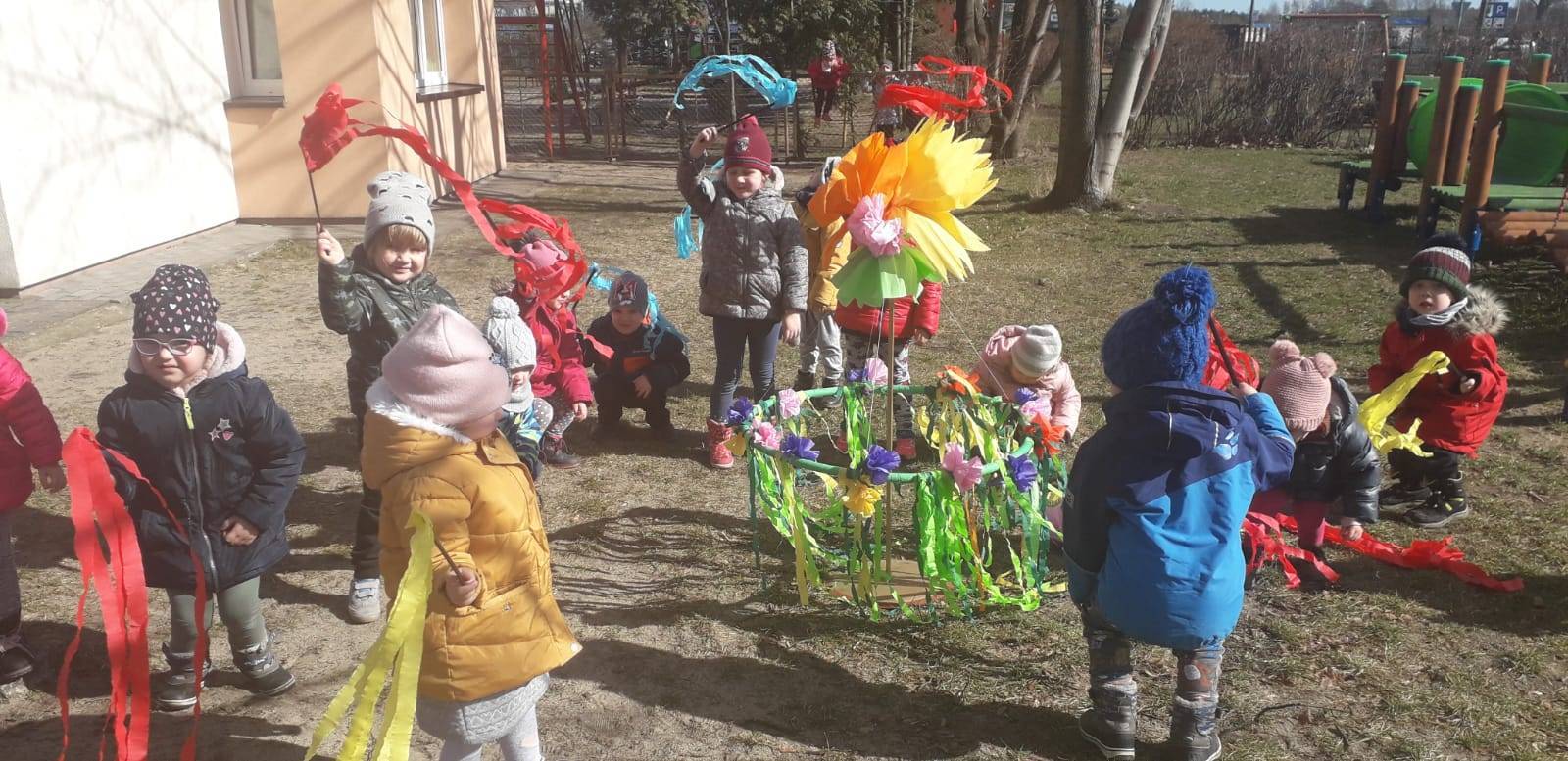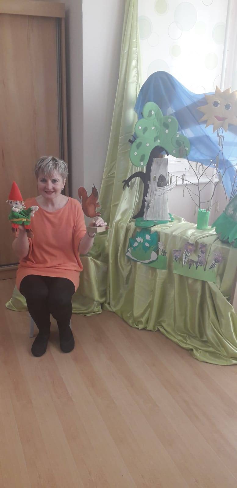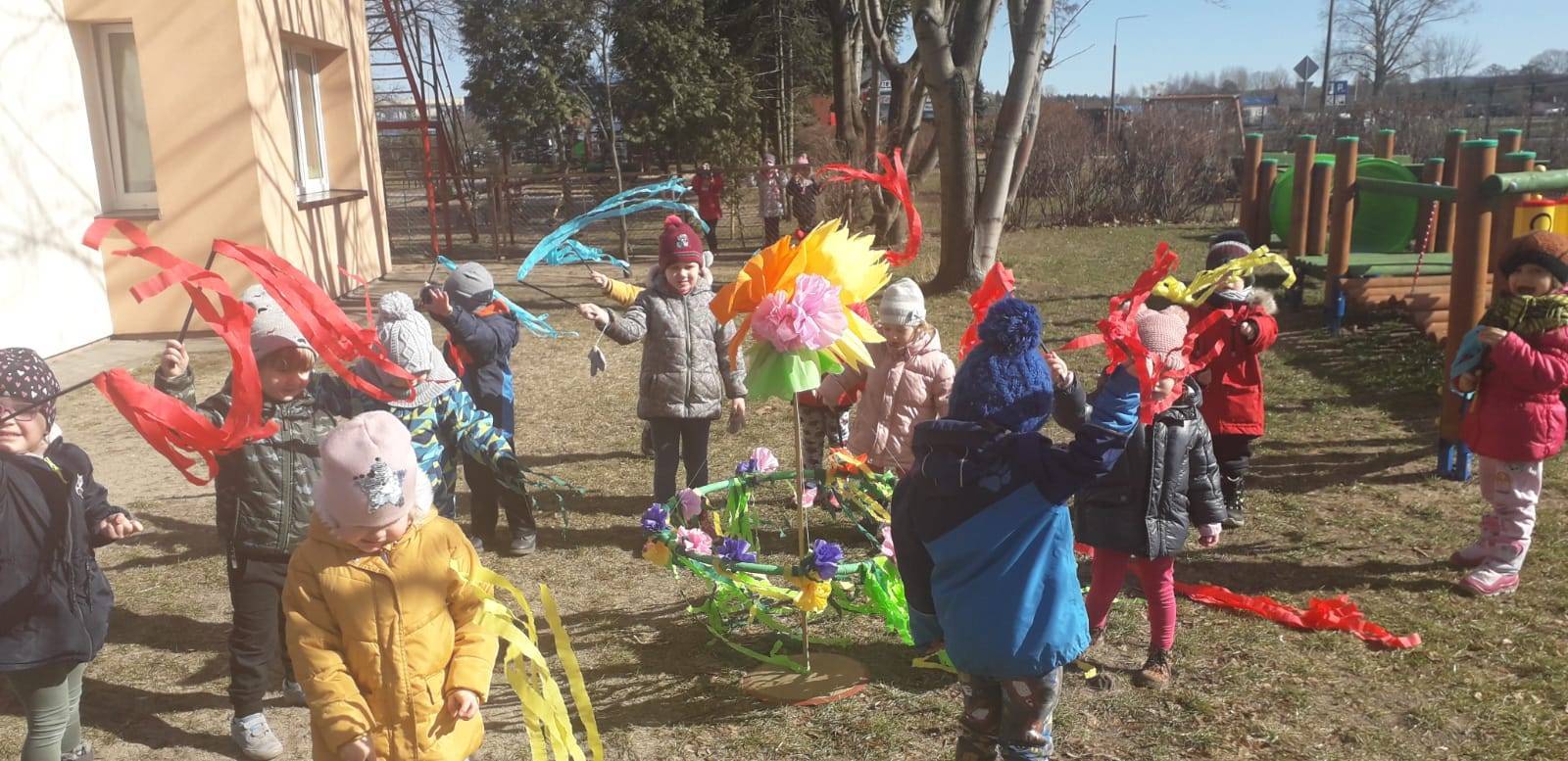 "Maluchy" powitały wiosnę Gaikiem - Maikiem .Oprócz zabaw ruchowych ,muzycznych ,manualnych przedszkolaki w tym dniu obejrzały teatrzyk kukiełkowy "O wiośnie w lesie i wiewiórki ważnym interesie".