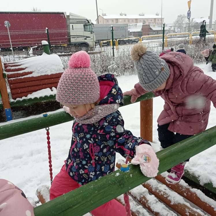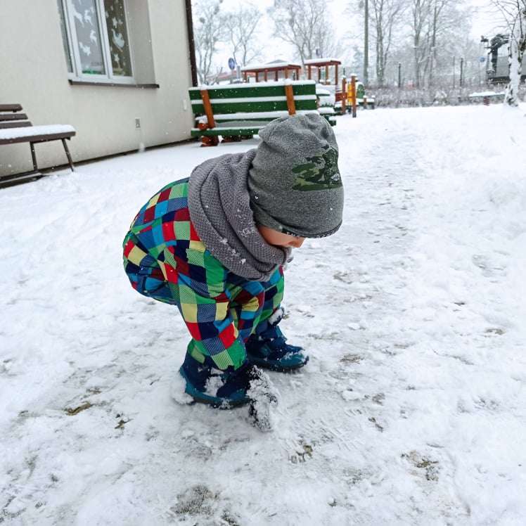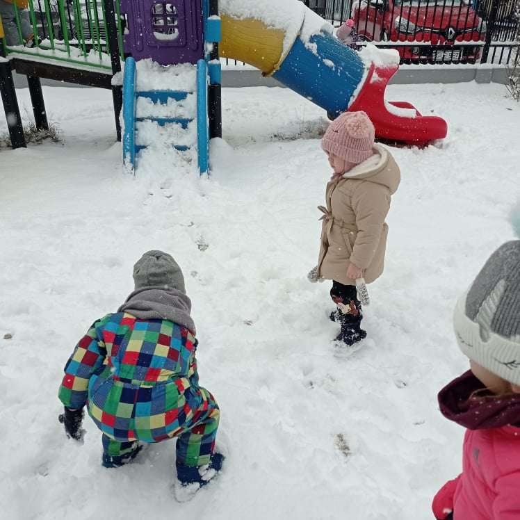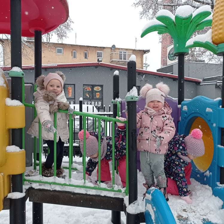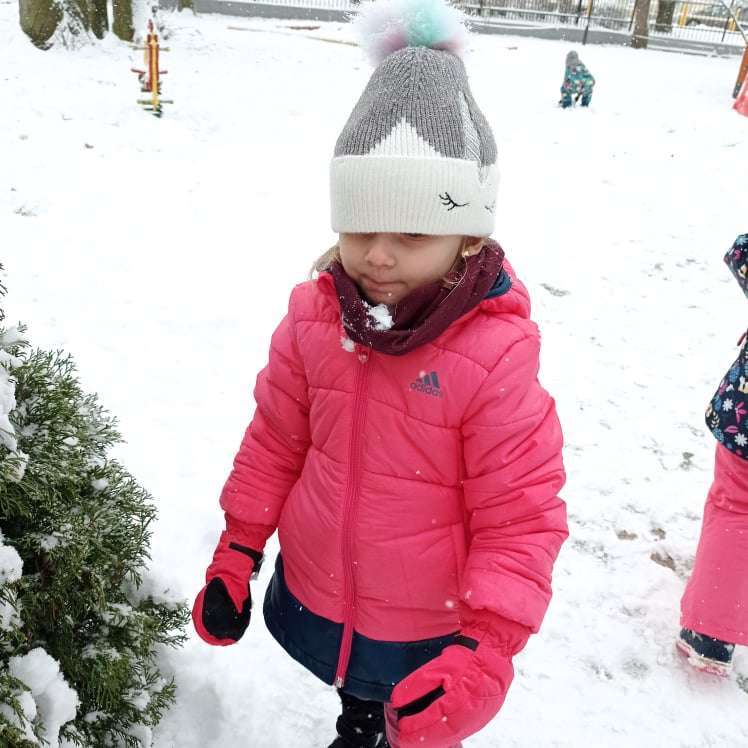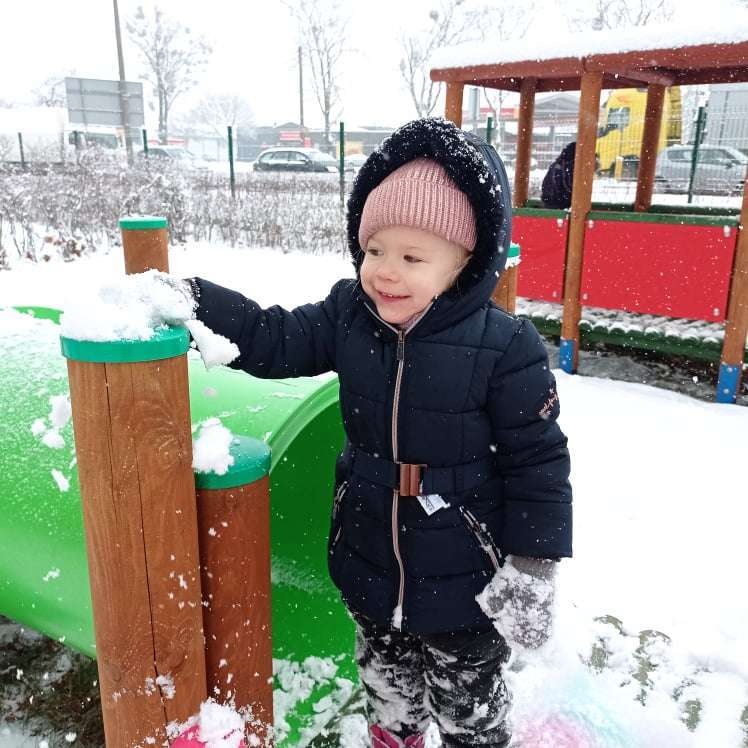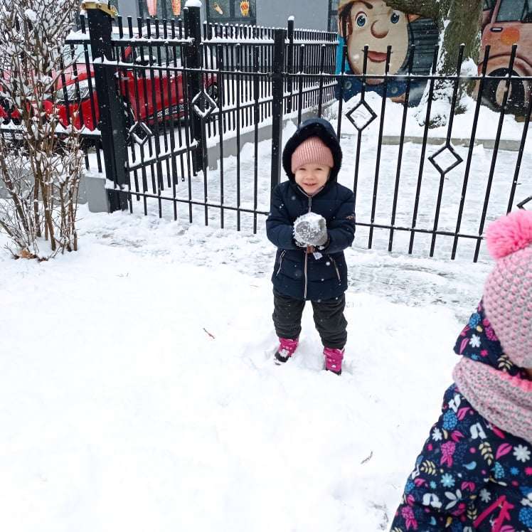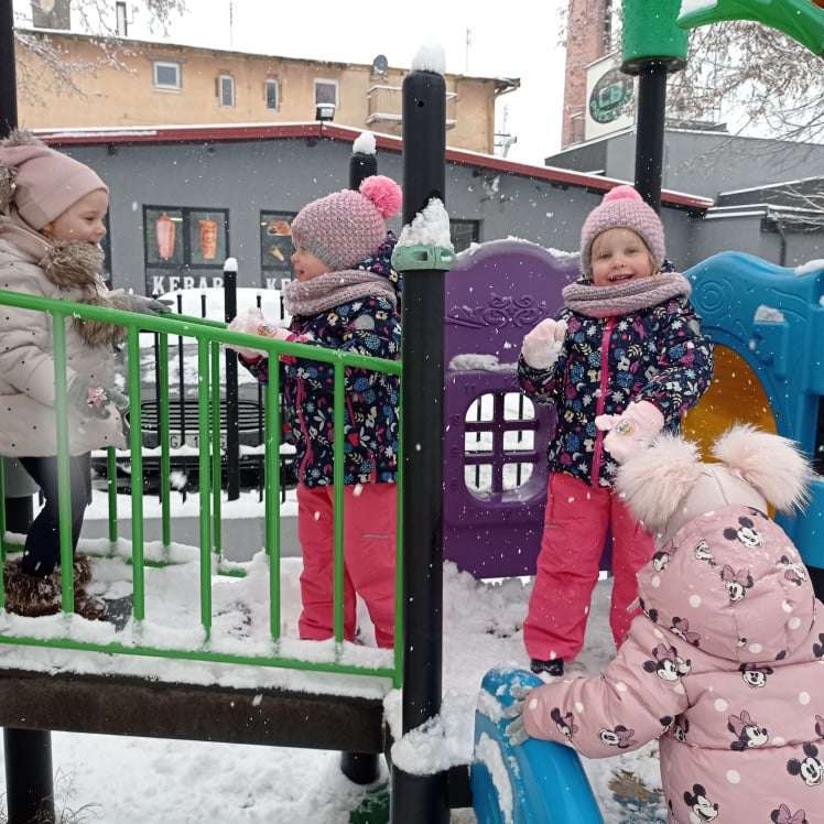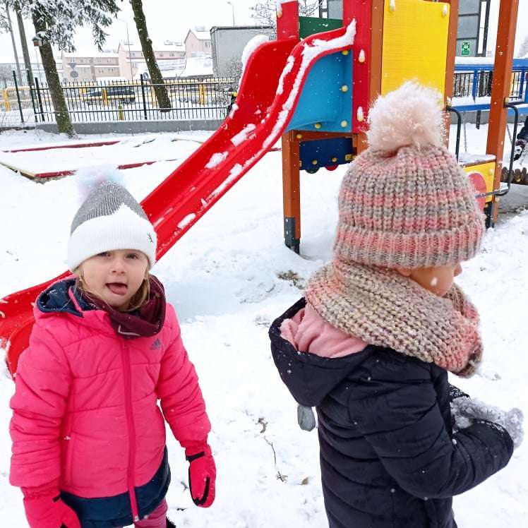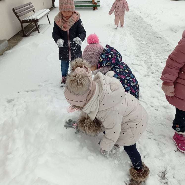 Pierwsze tej zimy opady śniegu sprawiły maluchom wiele radości. Grupa żabek doskonale bawiła się „białym puchem”. Dzieci nie mogły nacieszyć się śniegiem – biegały po ogrodzie przedszkolnym, rzucały śnieżkami, lepiły bałwana, chodziły „tropem”.