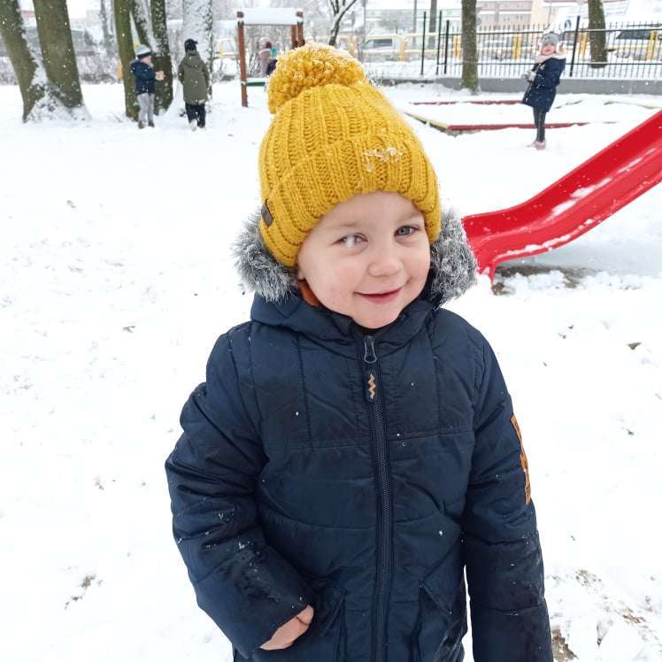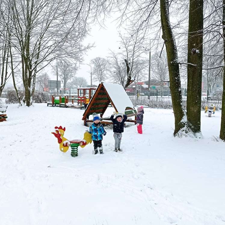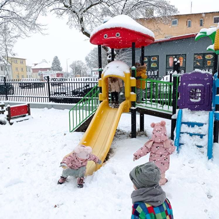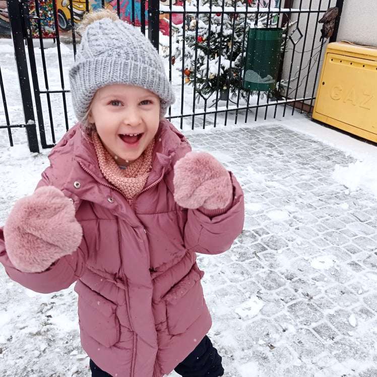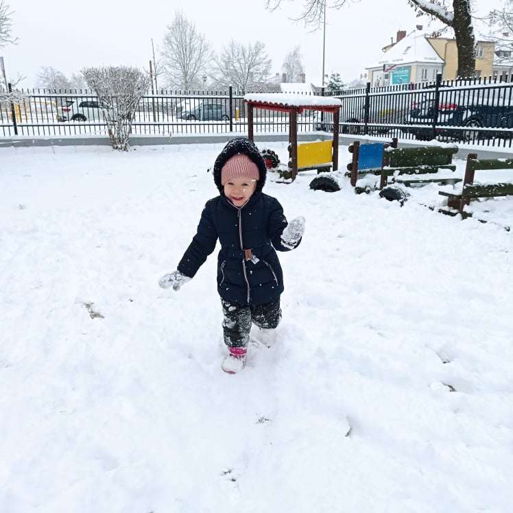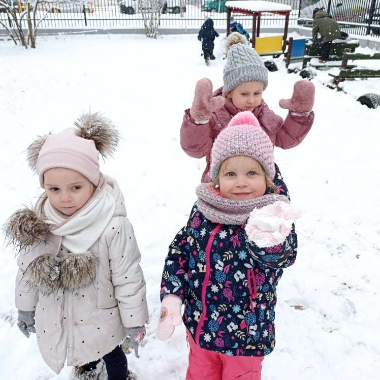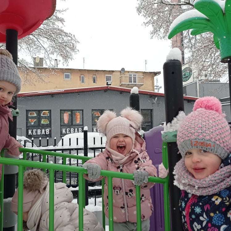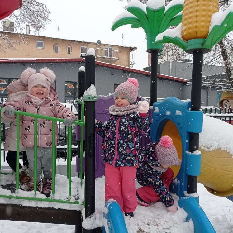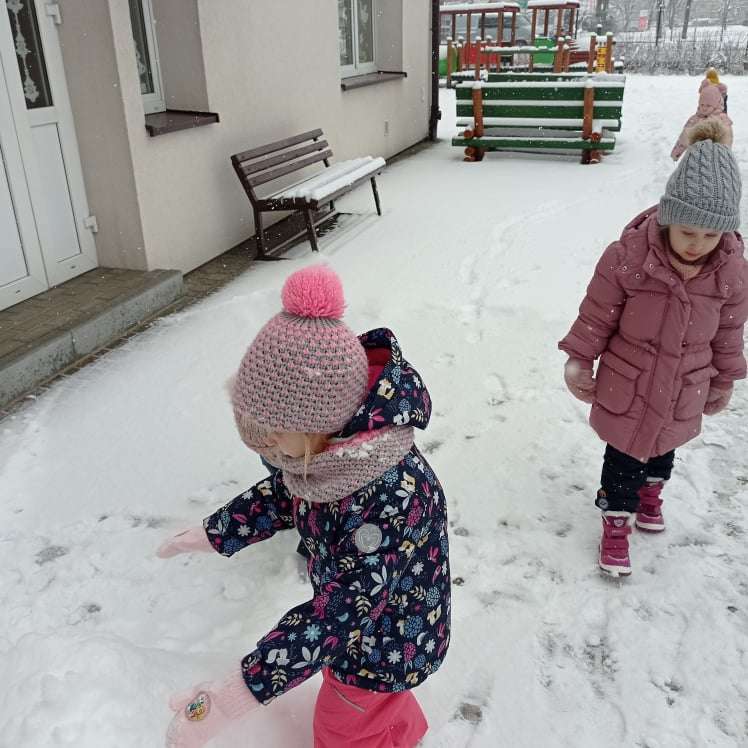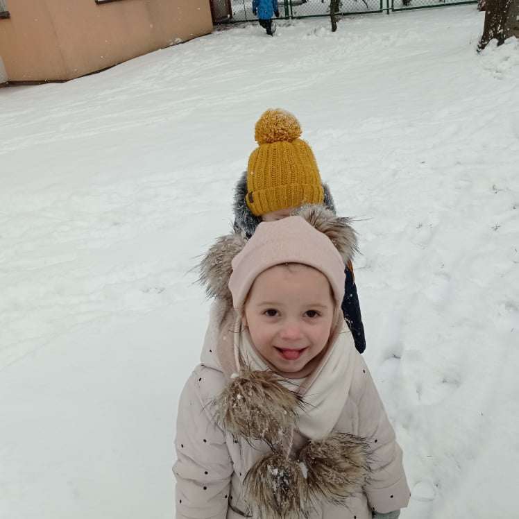 Pierwsze tej zimy opady śniegu sprawiły maluchom wiele radości. Grupa żabek doskonale bawiła się „białym puchem”. Dzieci nie mogły nacieszyć się śniegiem – biegały po ogrodzie przedszkolnym, rzucały śnieżkami, lepiły bałwana, chodziły „tropem”.
