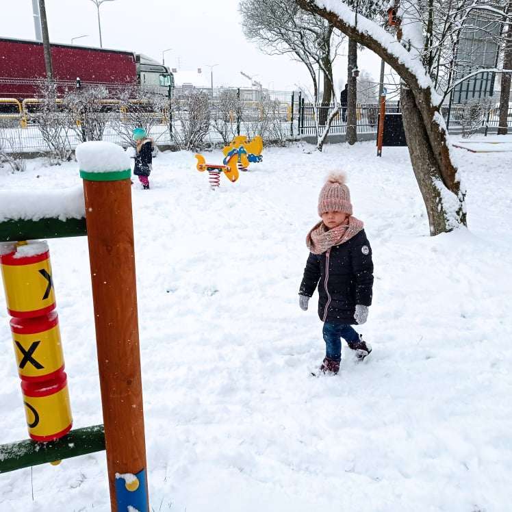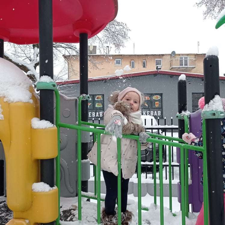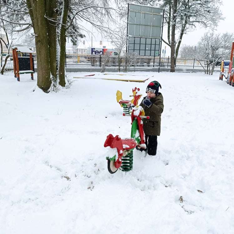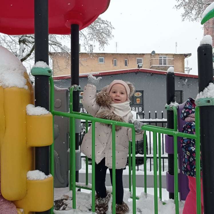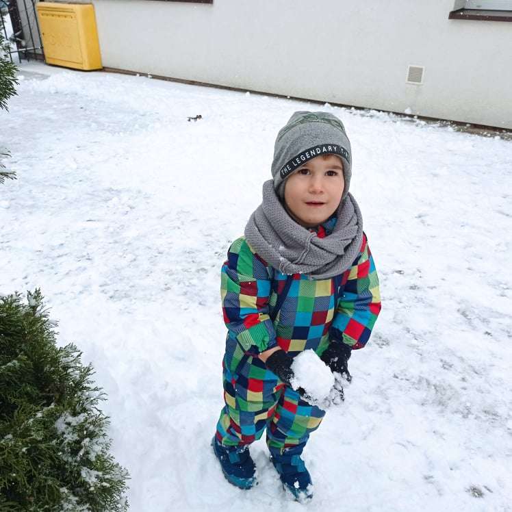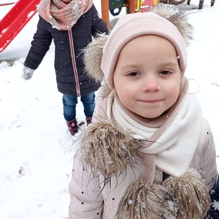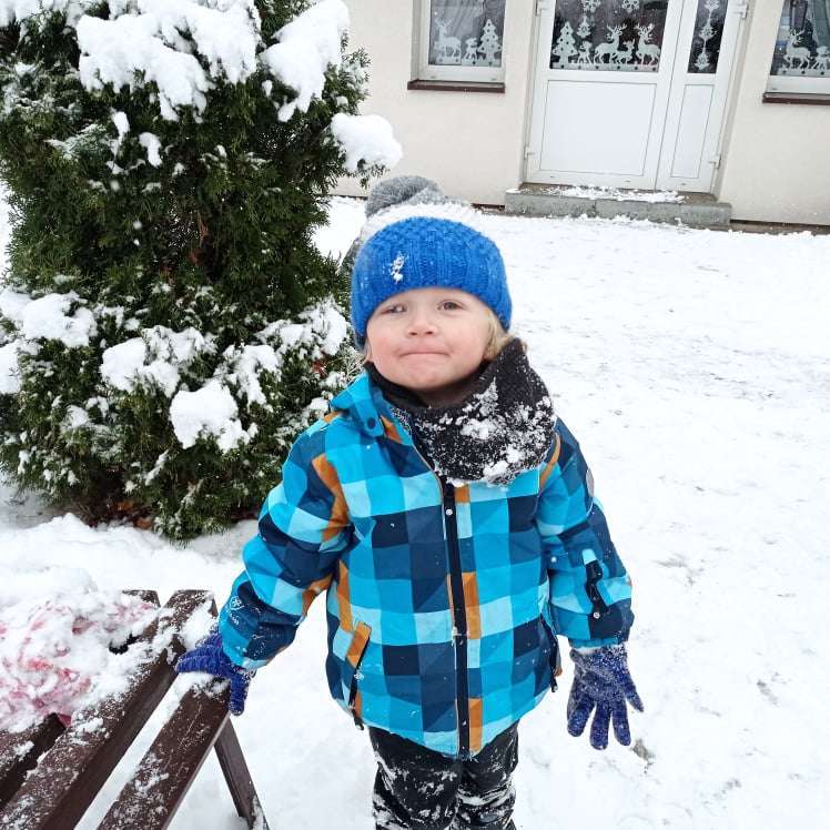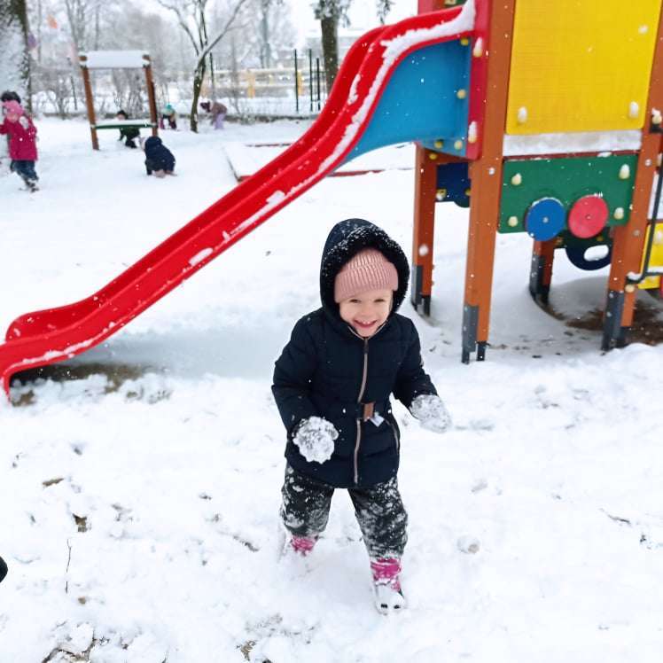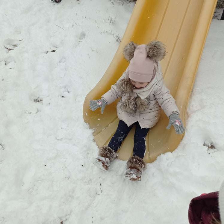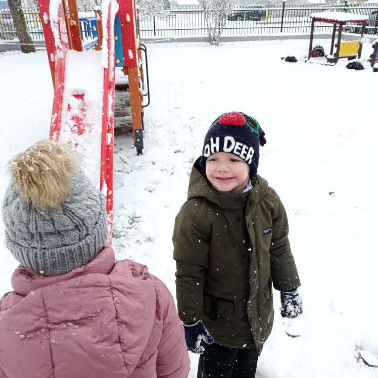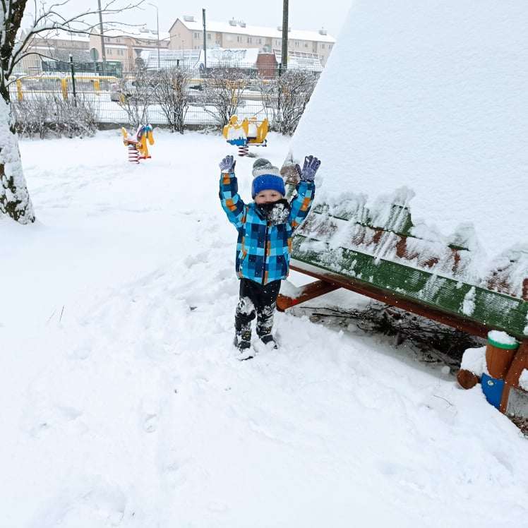 Pierwsze tej zimy opady śniegu sprawiły maluchom wiele radości. Grupa żabek doskonale bawiła się „białym puchem”. Dzieci nie mogły nacieszyć się śniegiem – biegały po ogrodzie przedszkolnym, rzucały śnieżkami, lepiły bałwana, chodziły „tropem”.