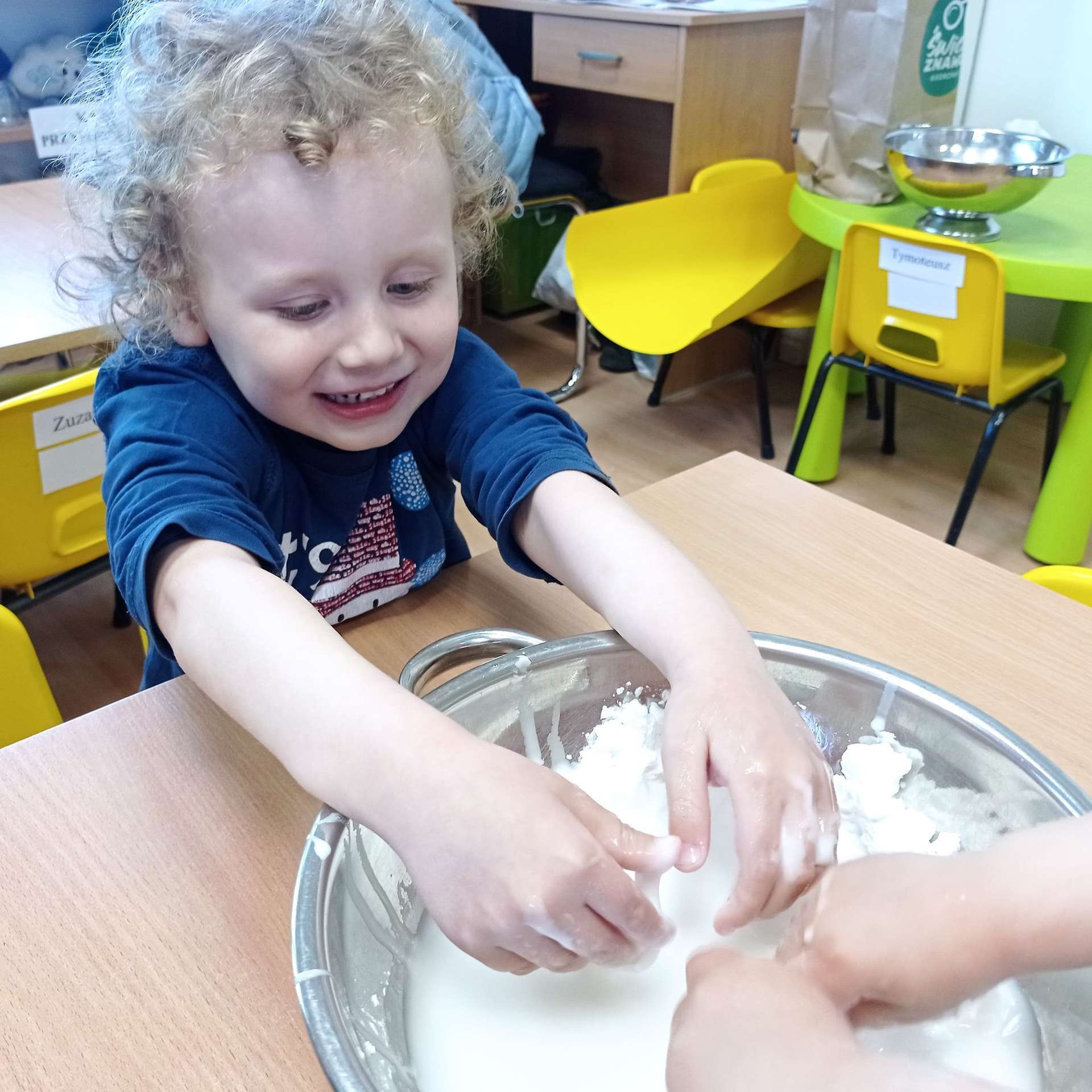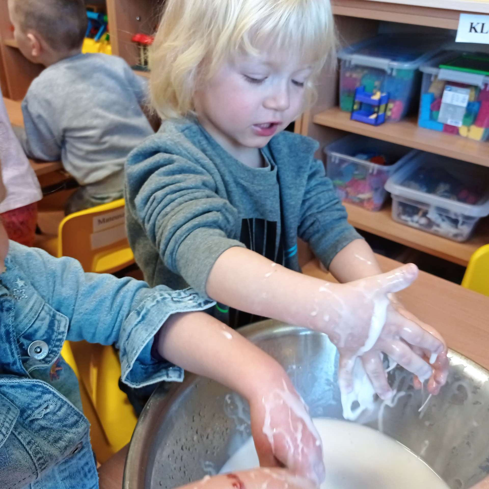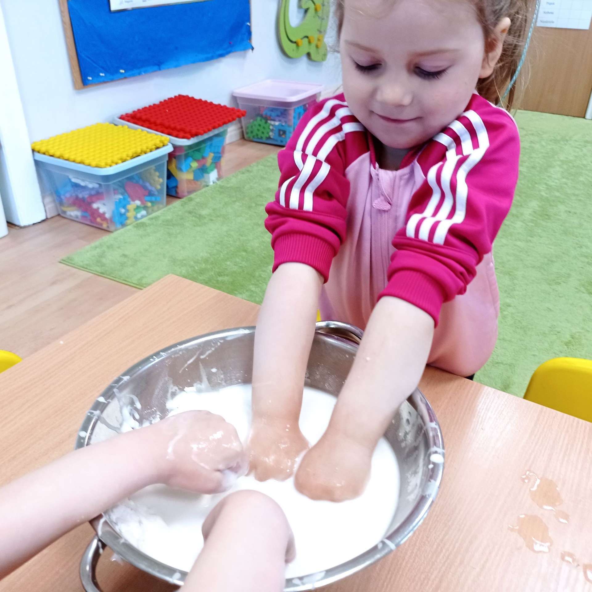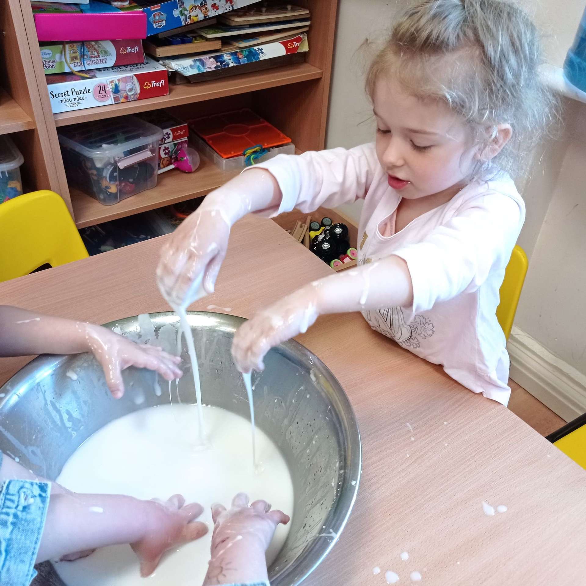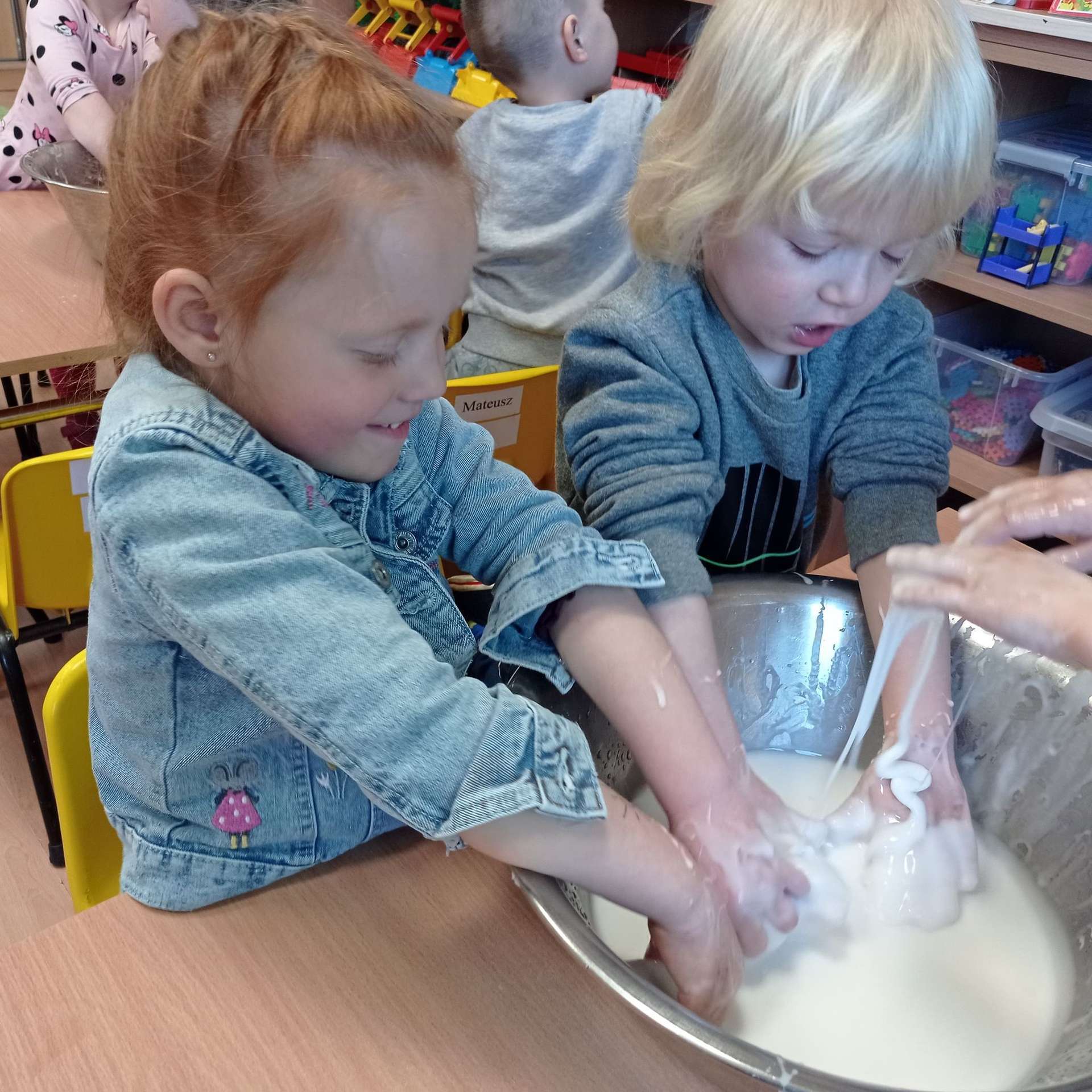 To już ostatnie zadanie z projektu "Gramy zmysłami". Tym razem dzieci poznały ciecz nienewtonowską oraz malowały palcami na folii spożywczej.