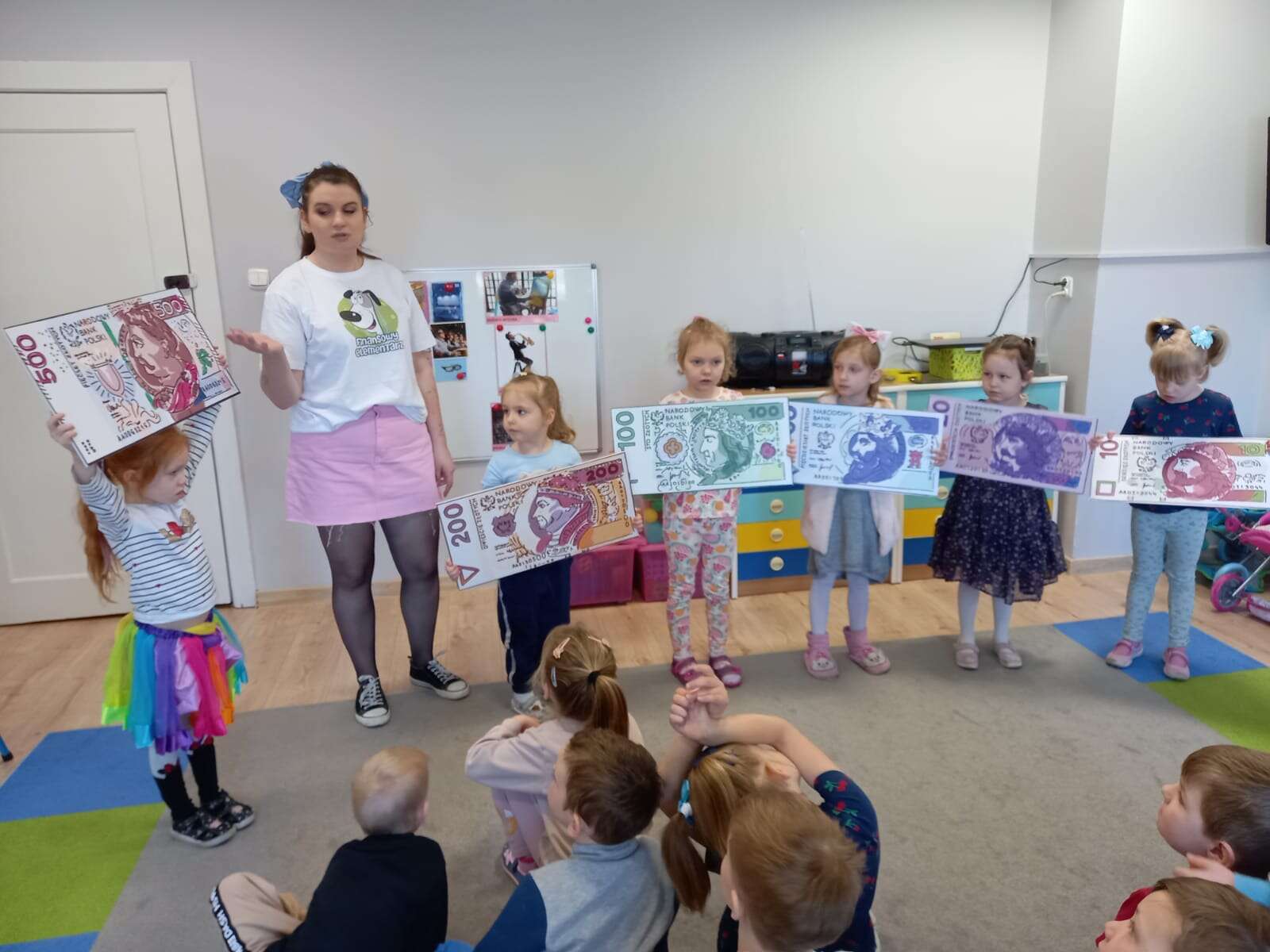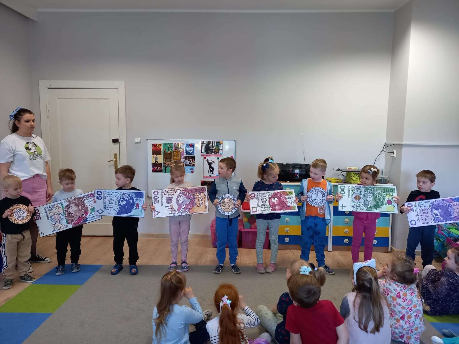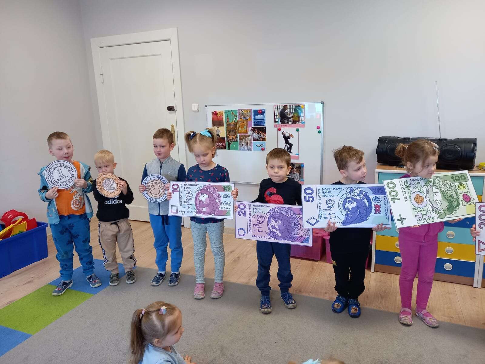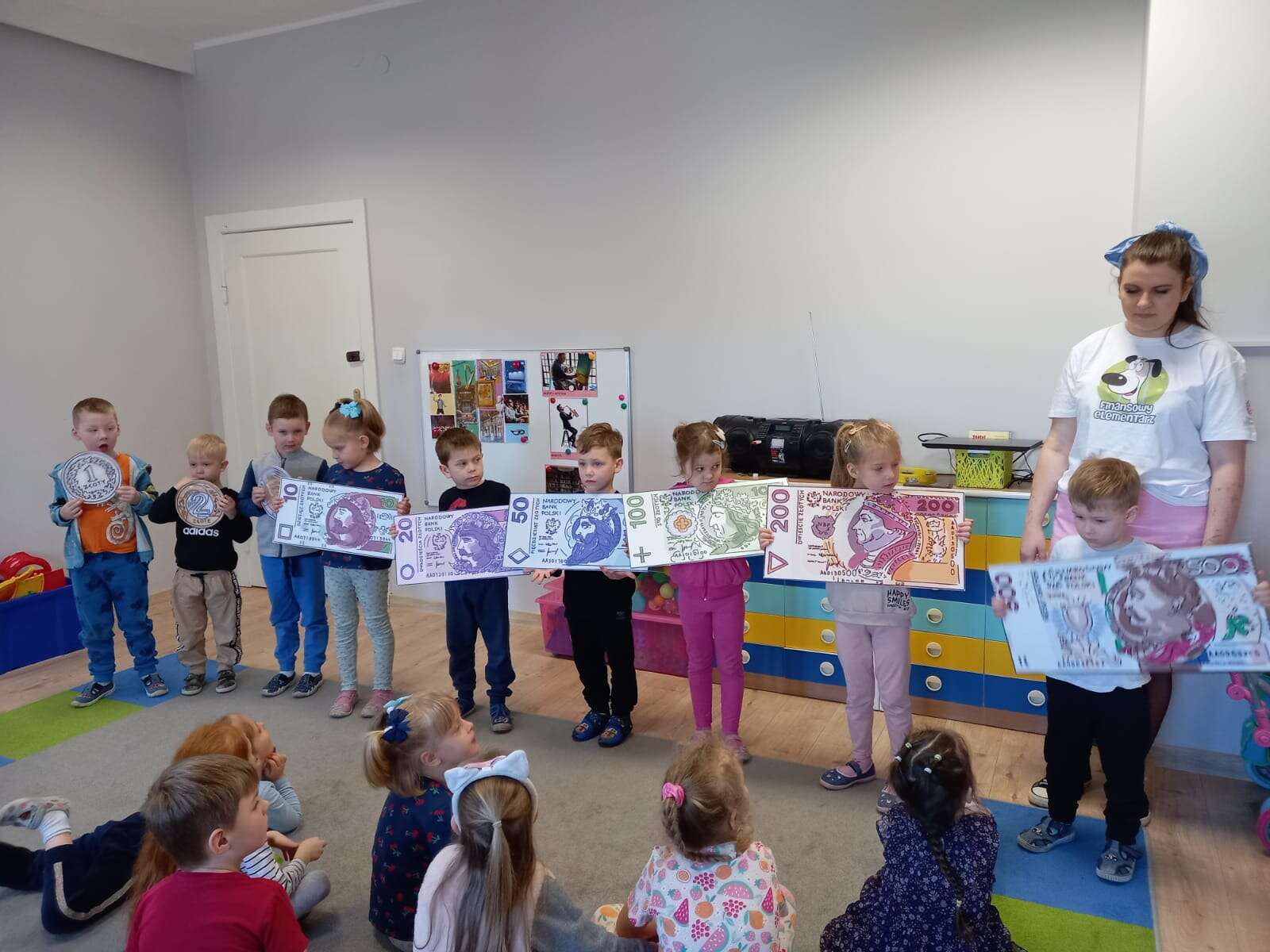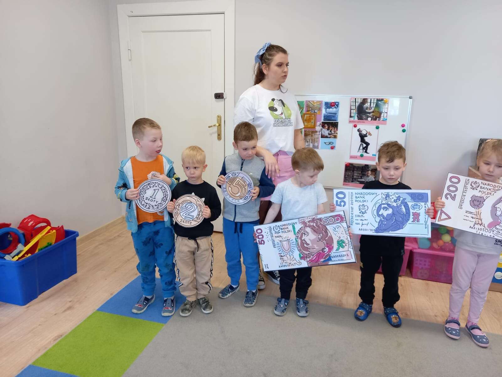 Dzieci z planszami banknotów i monet
