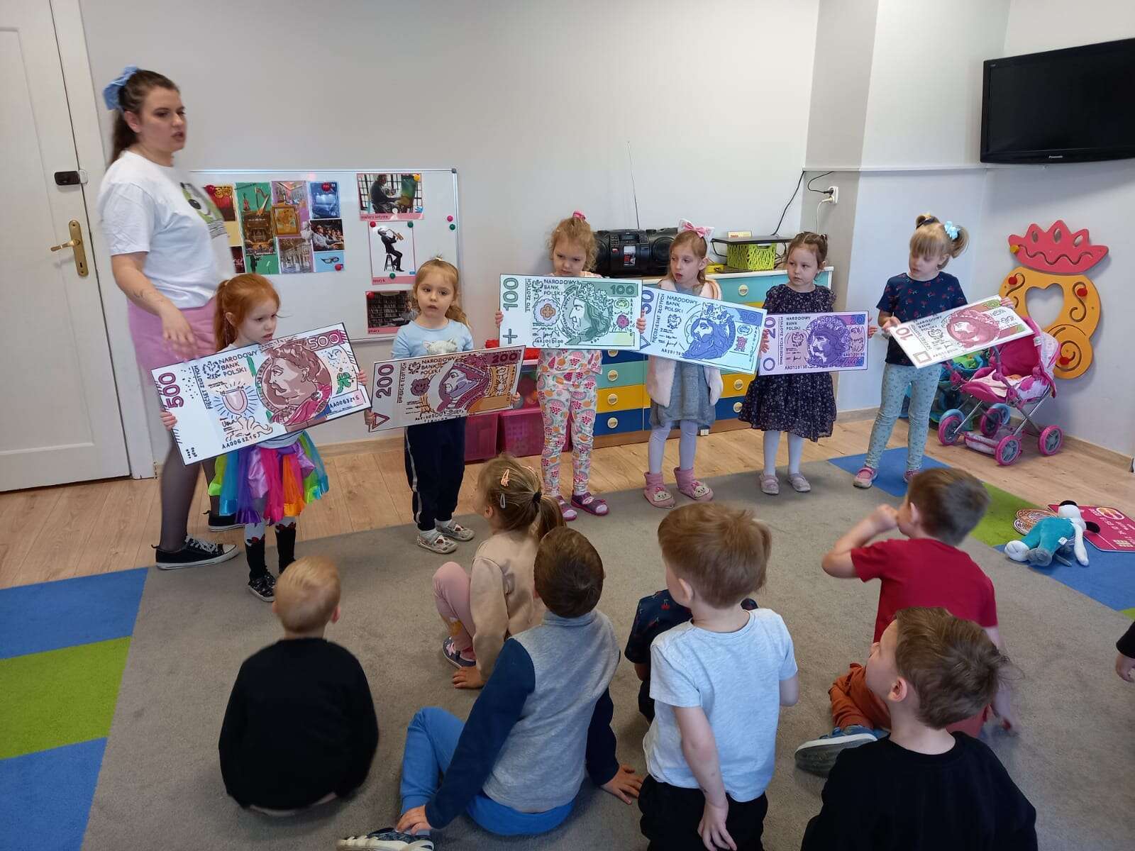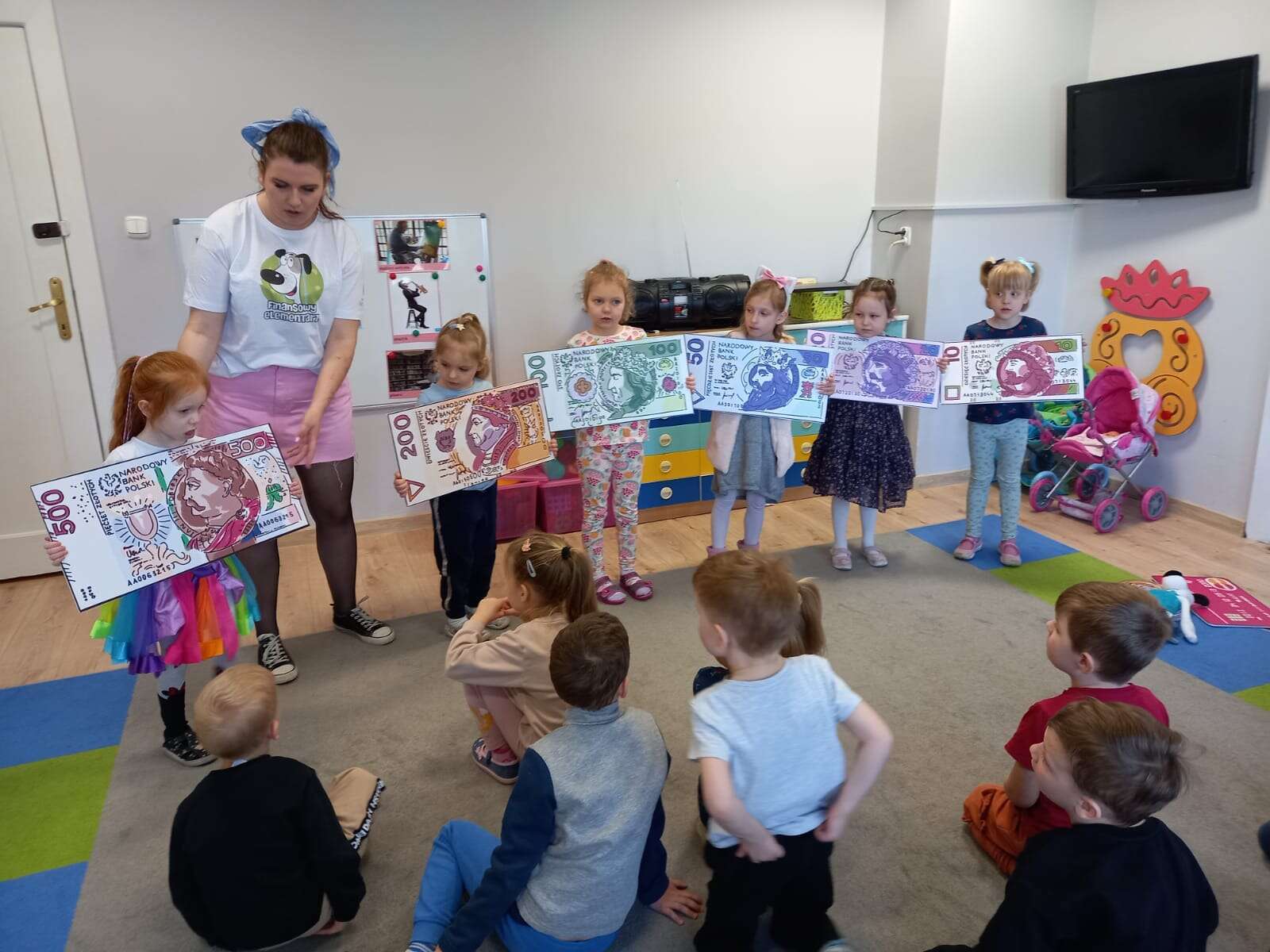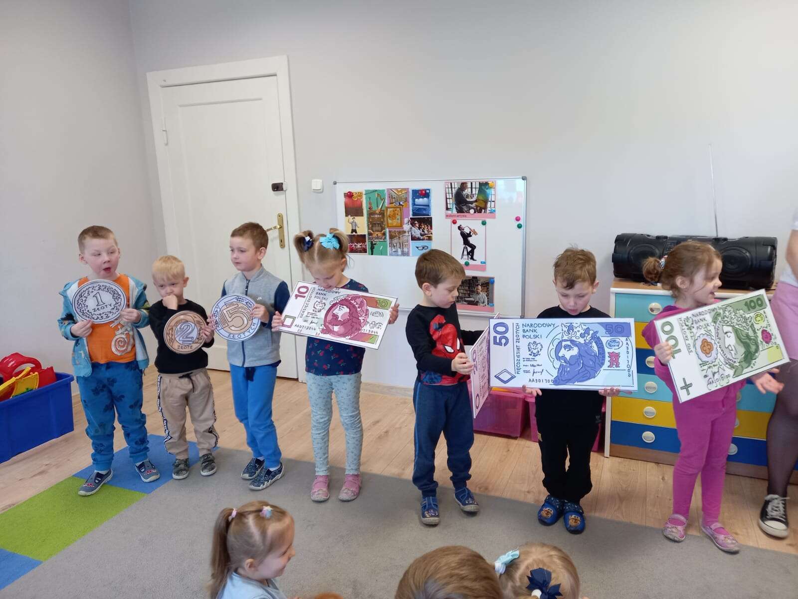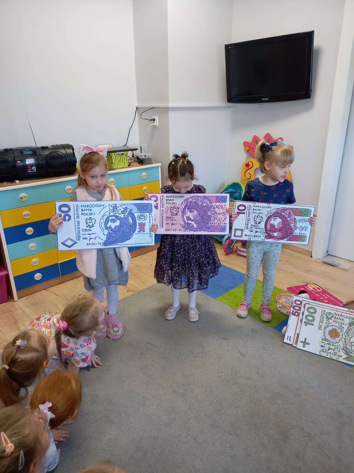 Dzieci z planszami banknotów i monet