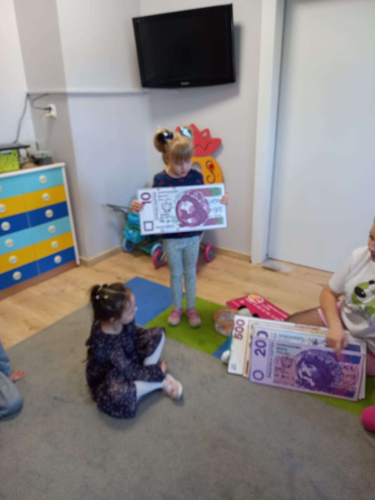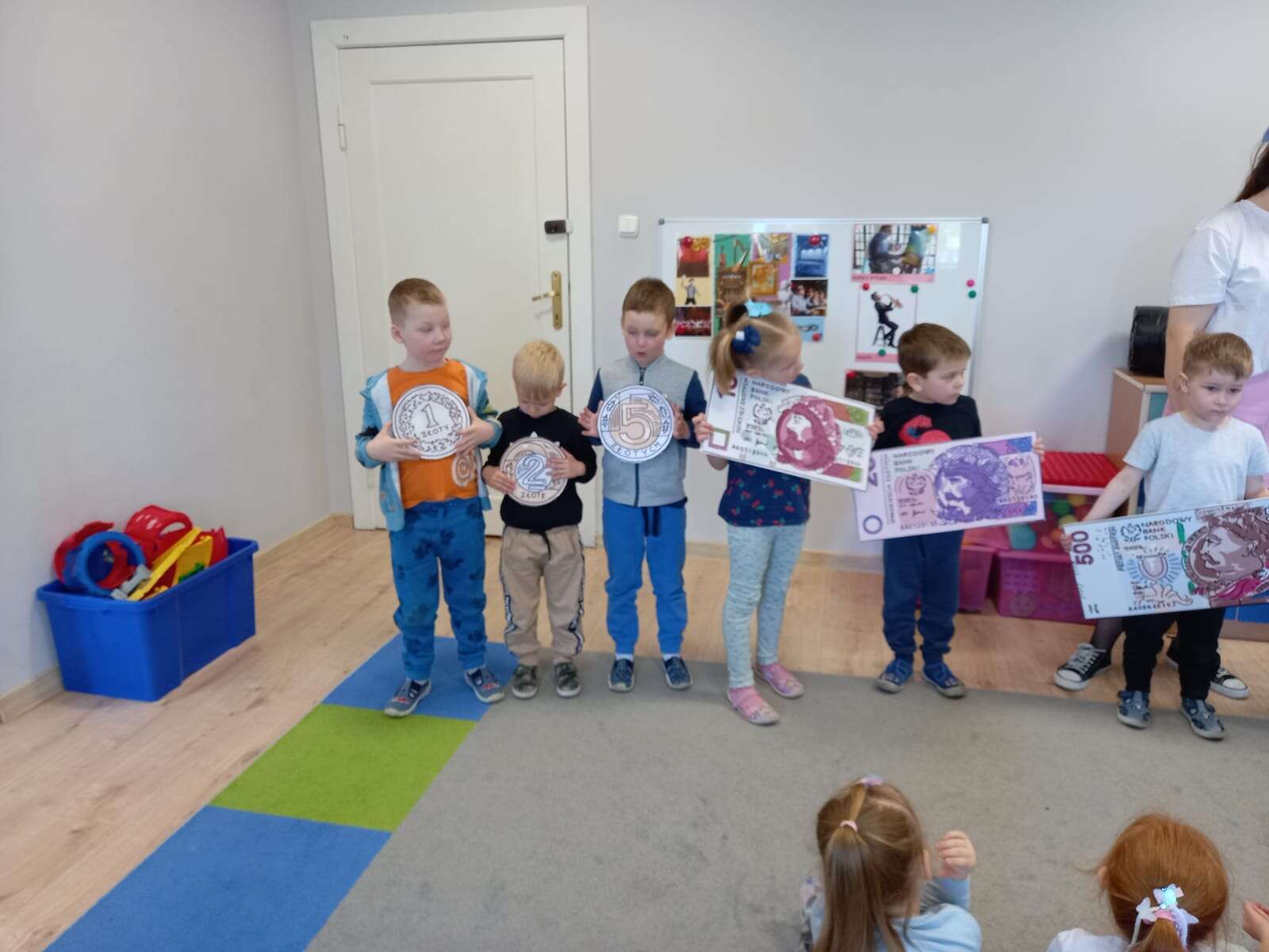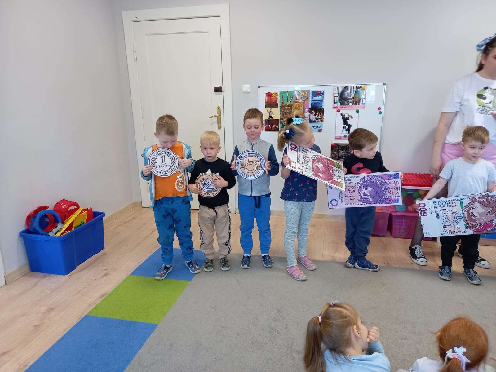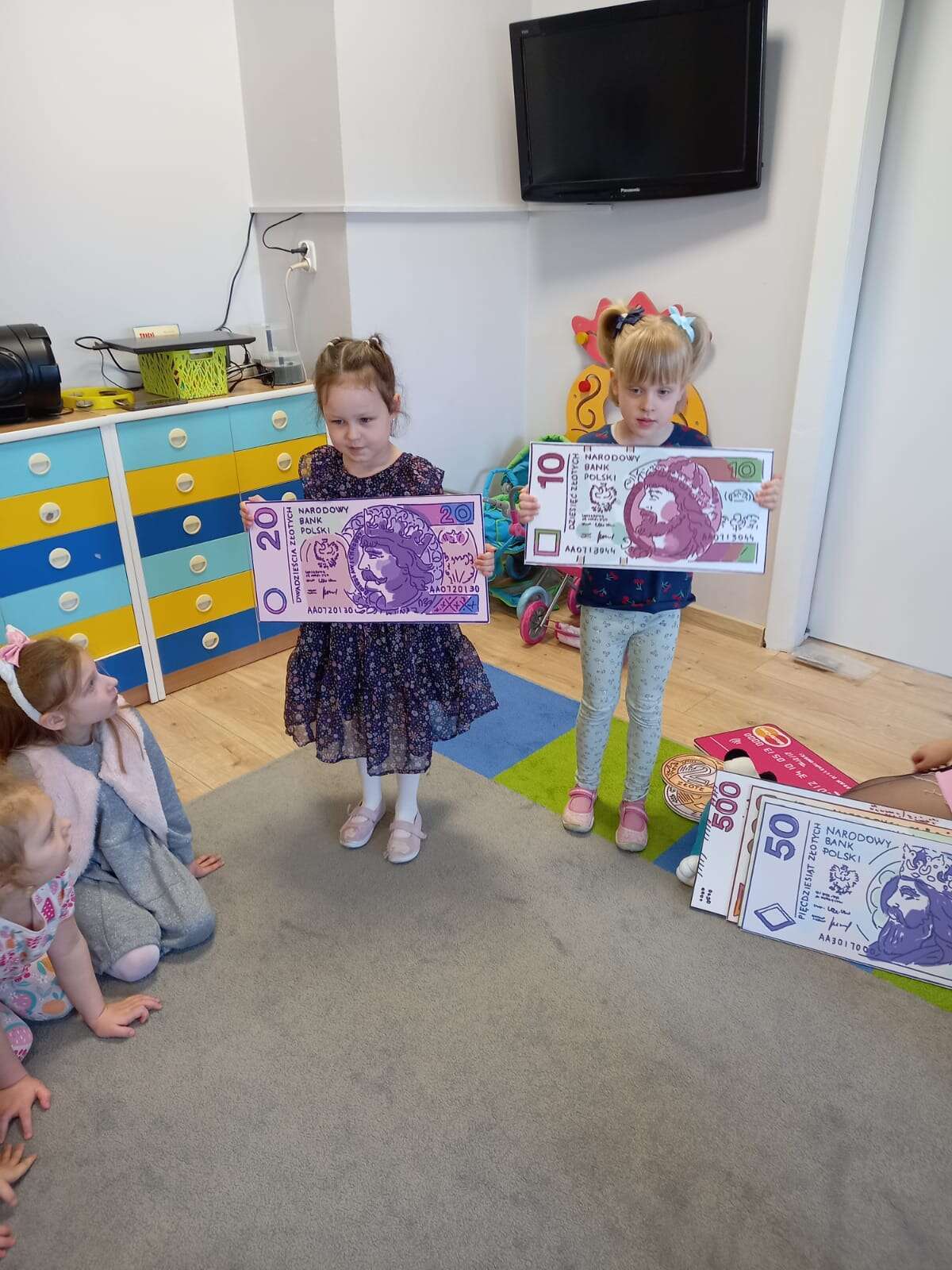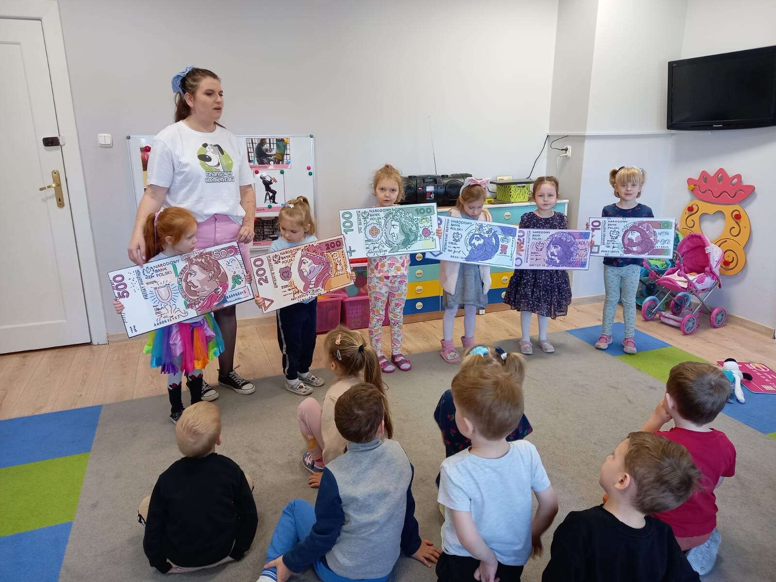 Dzieci z planszami banknotów i monet