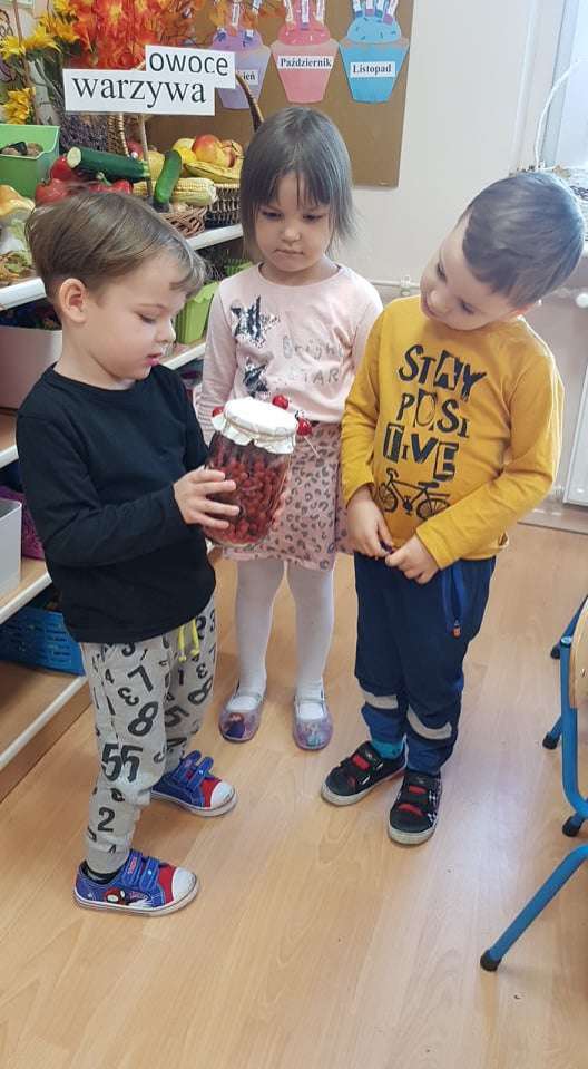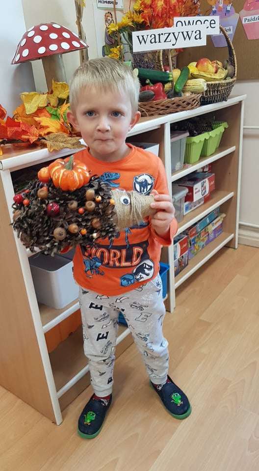 Dzieci z grupy II przyniosły "dary" jesieni zebrane podczas rodzinnych spacerów. W grupie znalazły się kasztany, żołędzie, jarzębina, różnokolorowe liście, orzechy, różnorodne kwiaty, wrzosy, owoce oraz warzywa. Dzieci swoje przyniesione „dary” pogrupowały wraz z „darami” od innych dzieci. Przedszkolaki udekorowały kącik przyrody, w którym zagościła jesień. Zajęcie to wpłynęło na większą integrację grupy. Wszystkim rodzicom bardzo serdeczne dziękujemy za przyniesienie „darów jesieni.