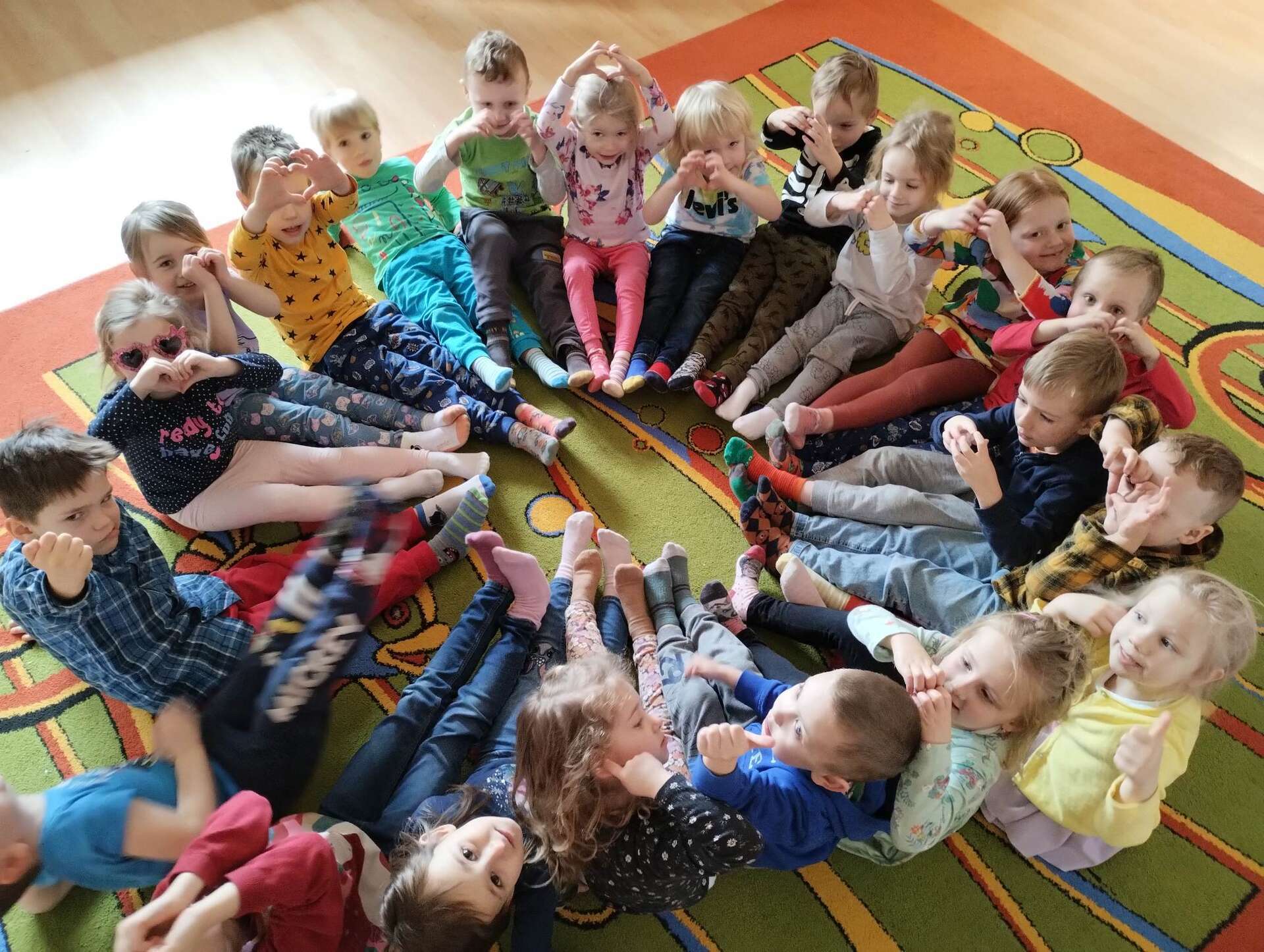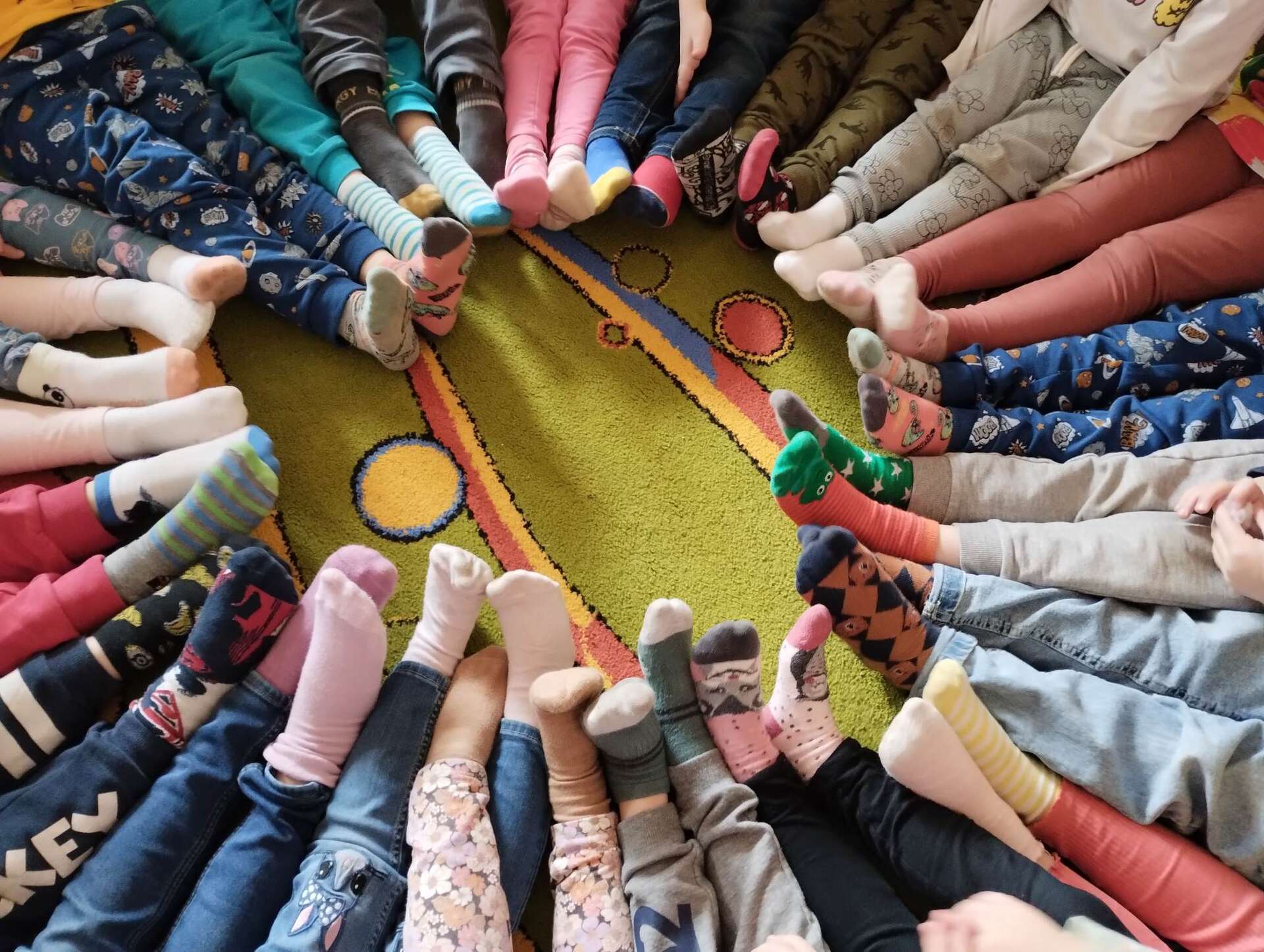 Dzieci siedzą na podłodze pokazując kolorowe skarpetki
