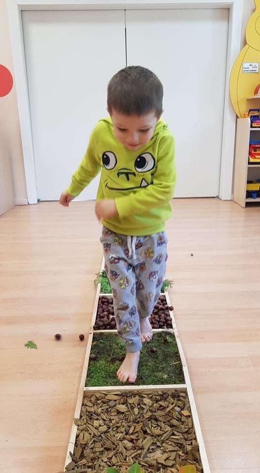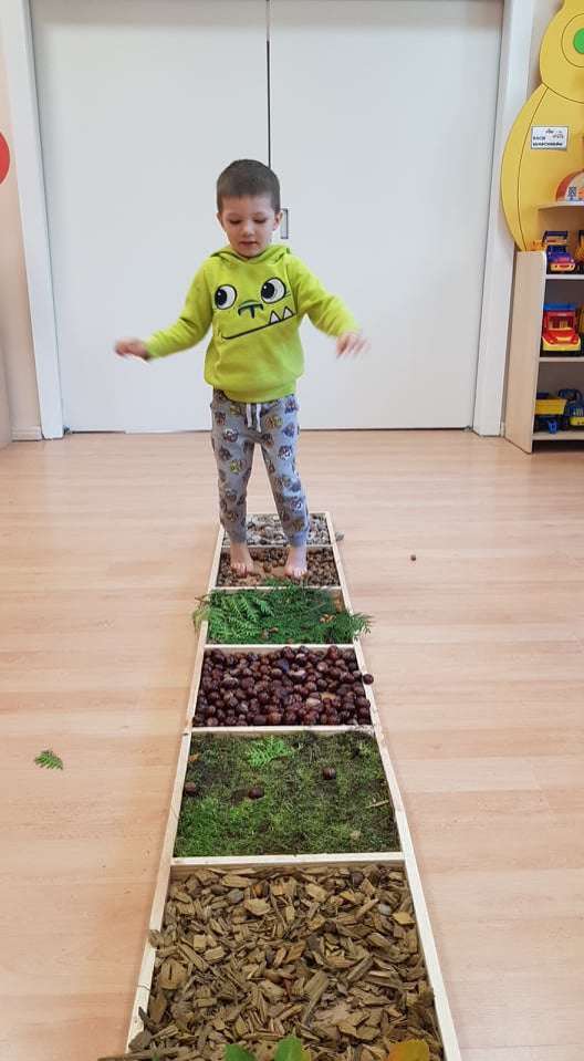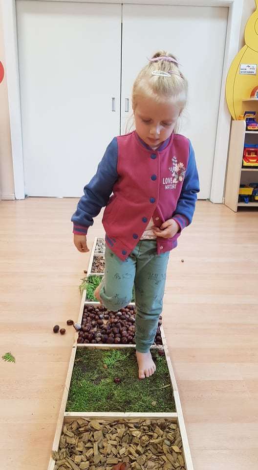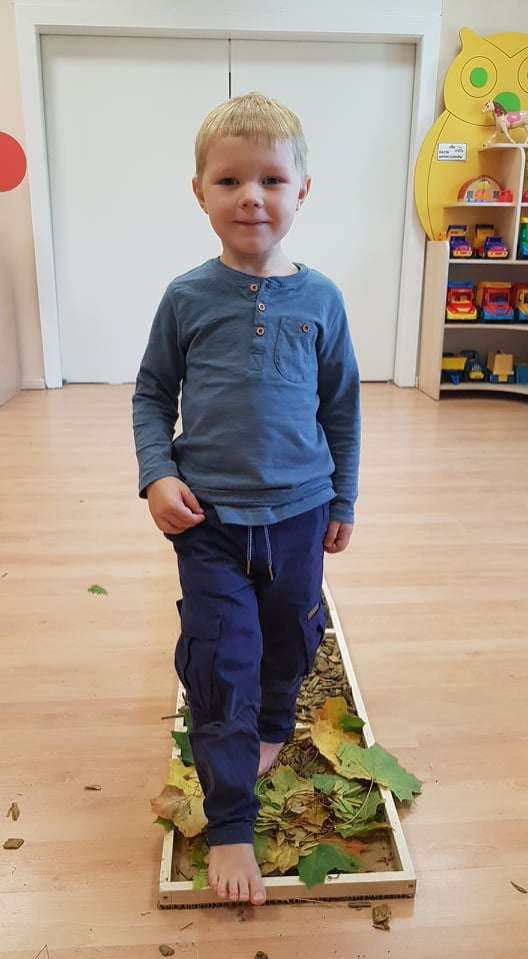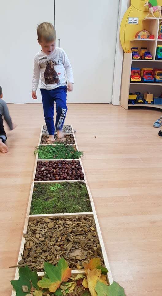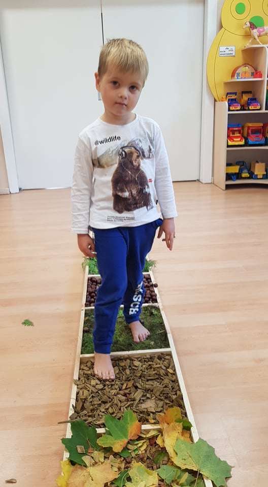 Ciekawym doświadczeniem było przechodzenie „na bosaka” po zgromadzonych jesiennych skarbach. Dzieci z przyjemnością stąpały po mięciutkim jak poduszka mchu, kamieniach, ale też po zimnych kasztanach, szorstkiej korze, kłujących szyszkach, twardych żołędziach i jesiennych liściach. W ten przyjemny sposób poprawialiśmy koncentrację i rozwijaliśmy naszą motorykę.