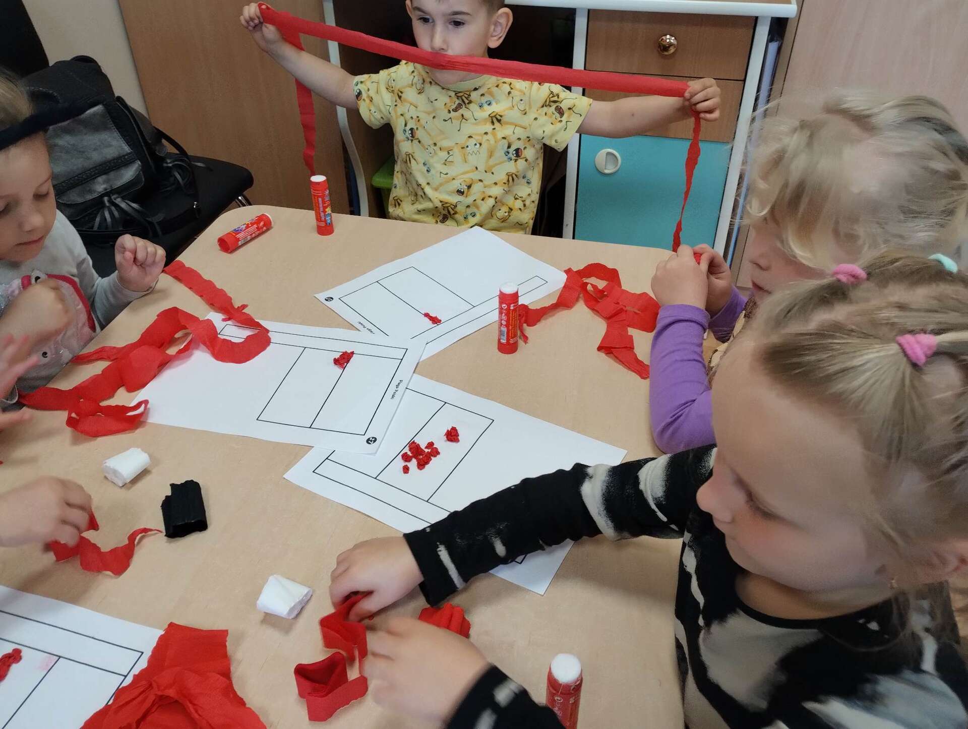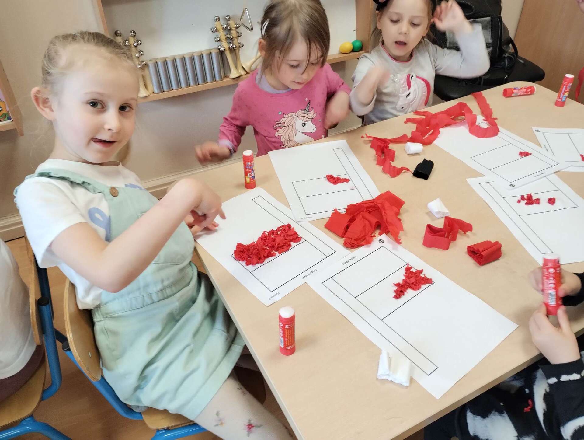 Dzieci wyklejają flagę kulkami z bibuły