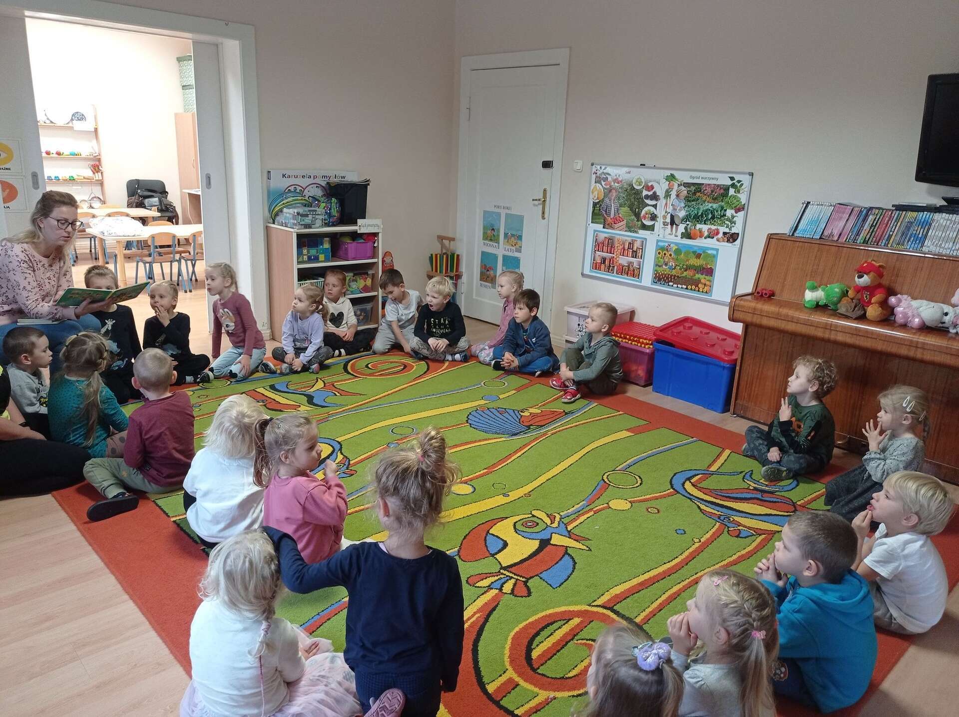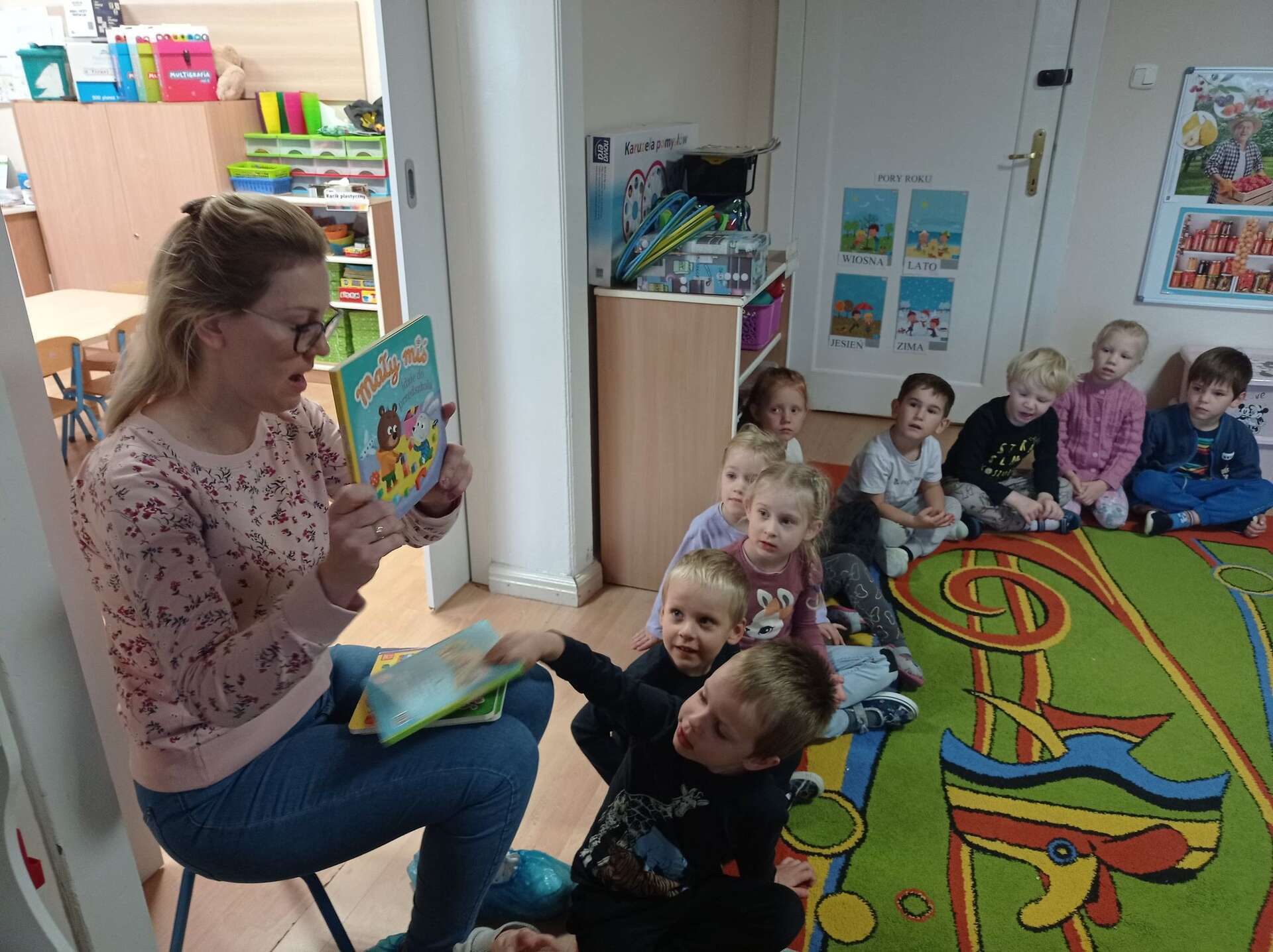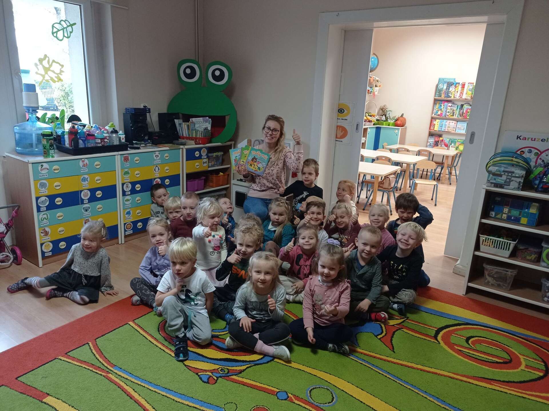 Dzisiaj gościliśmy w Przedszkolu Panią Karolinę, mamę Adasia i Karolka która przeczytała dzieciom bajki z cyklu "Mały Miś".
