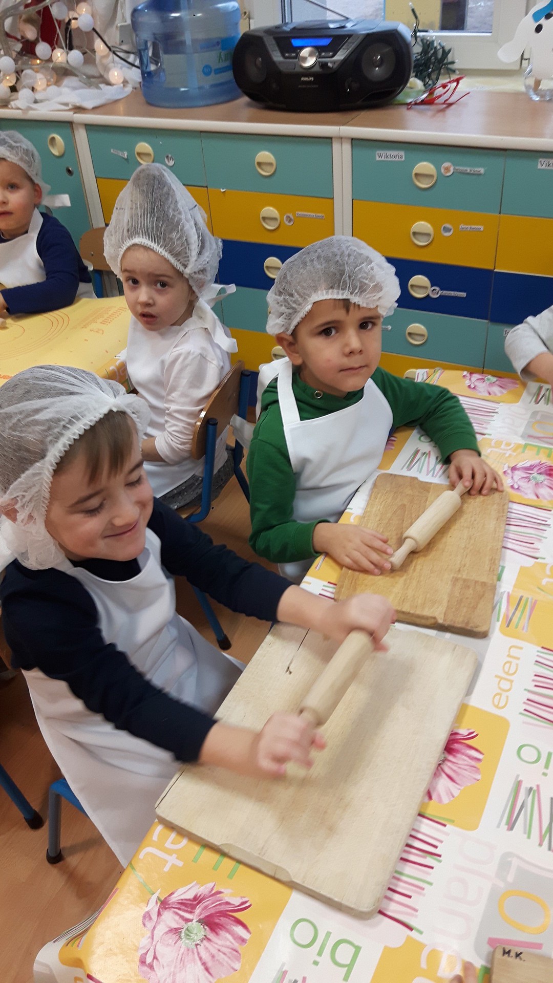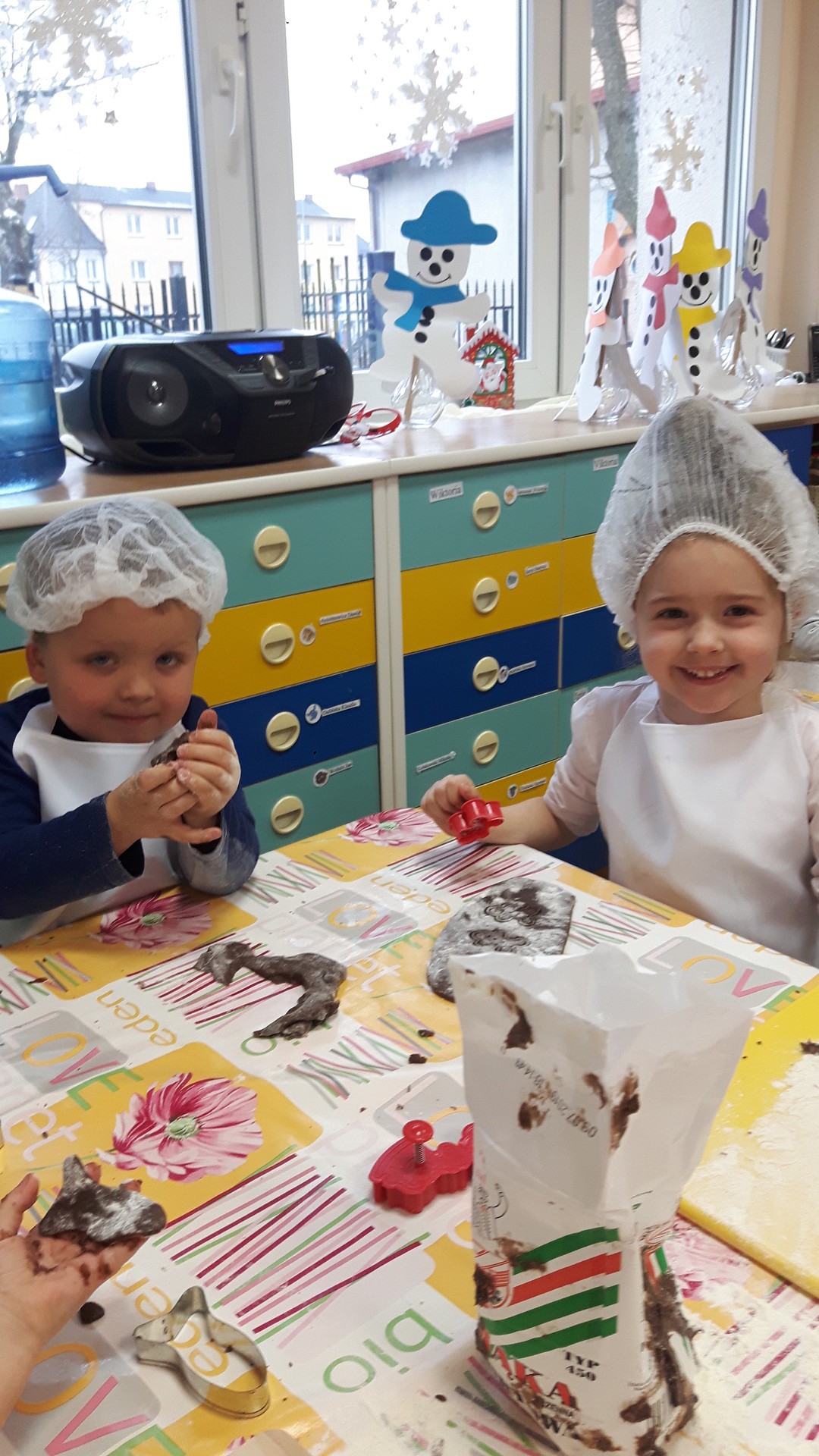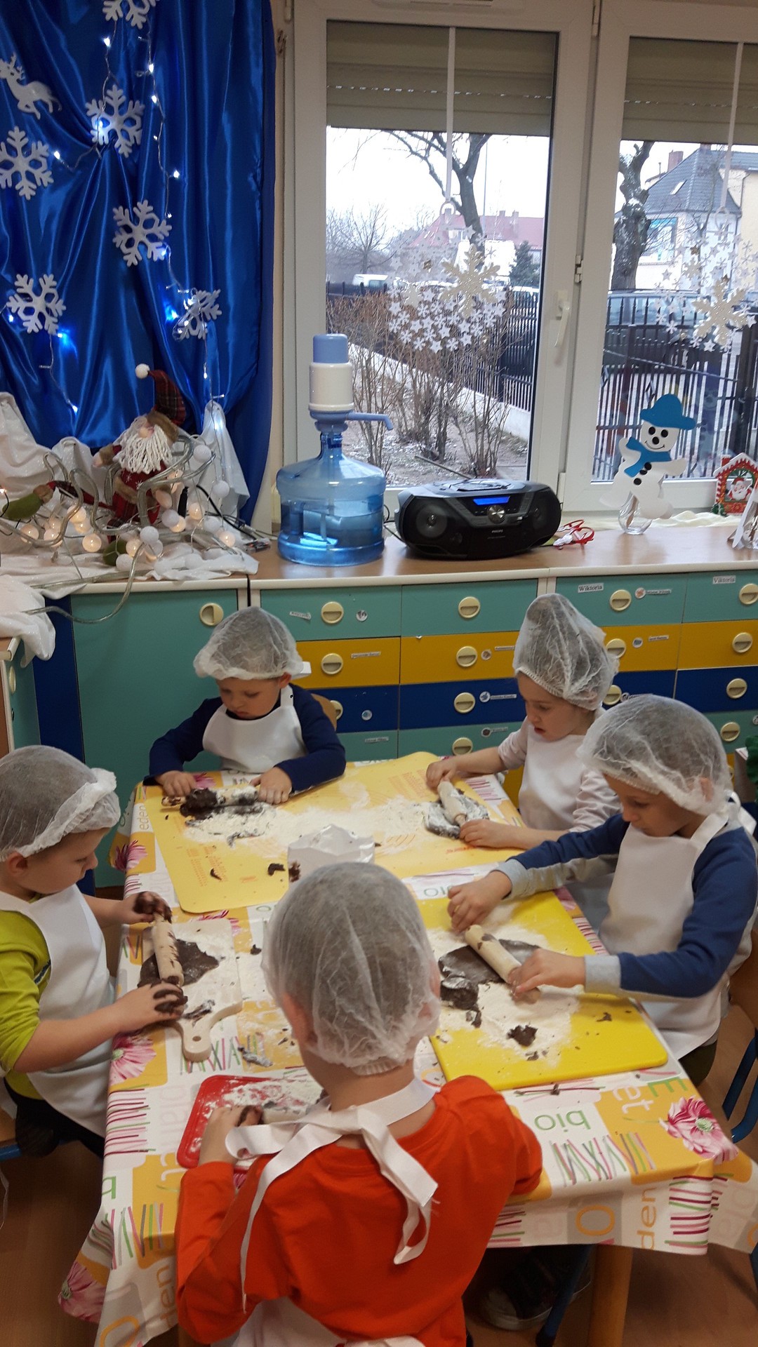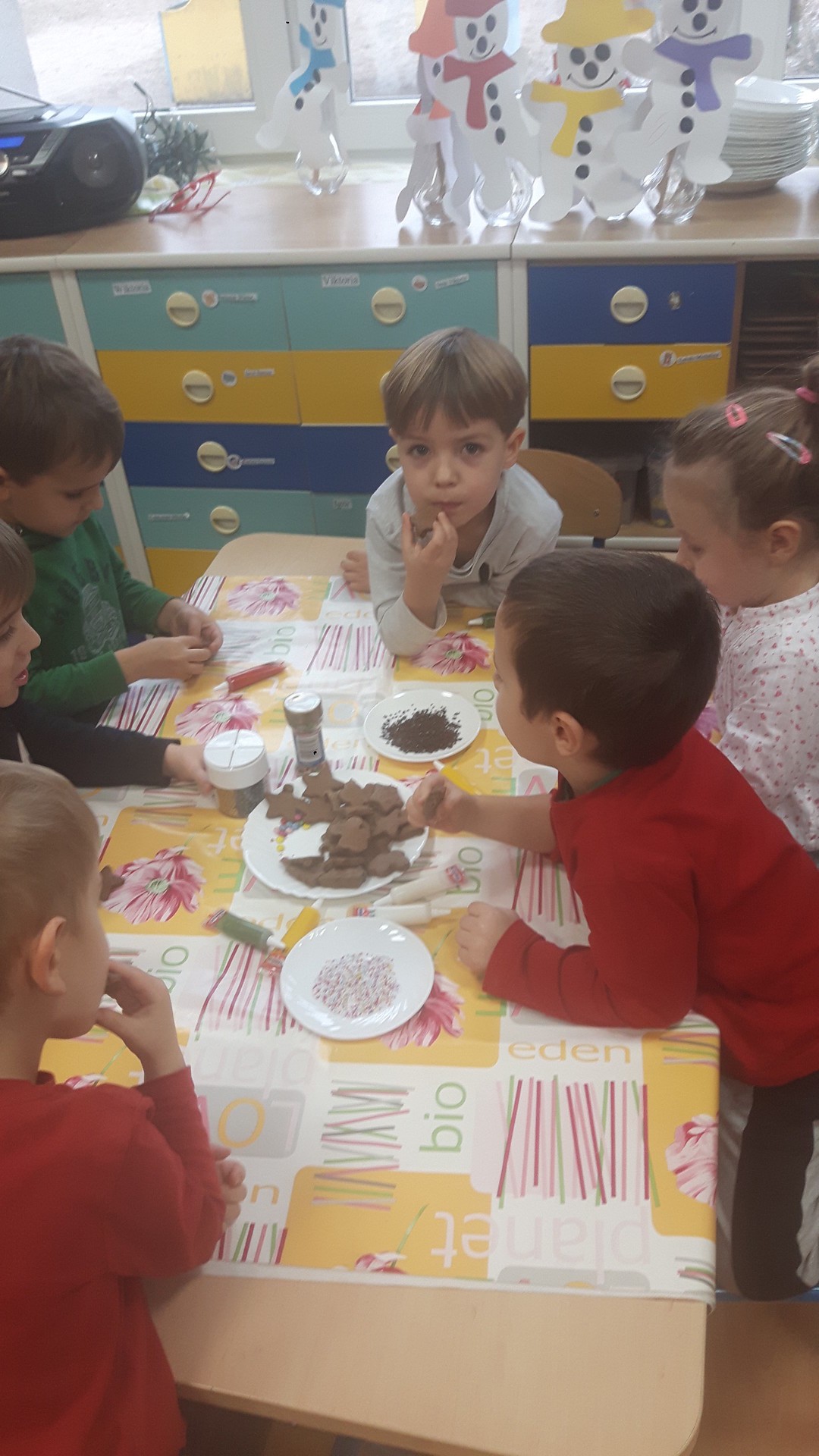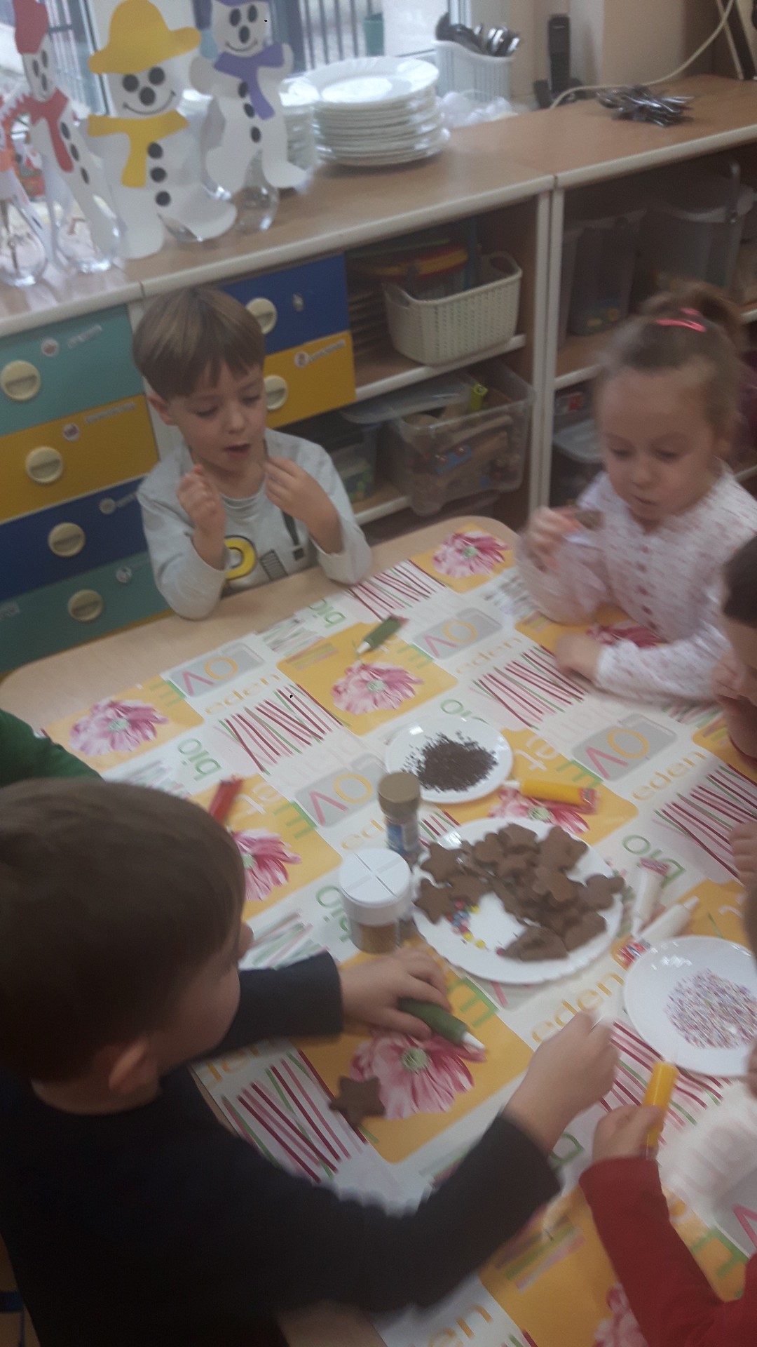 18 grudnia dla dzieci był bardzo pracowity dzień , bowiem tego dnia piekły one pierniczki. Najpierw odpowiednio się przygotowały dbając o czyste rączki oraz zakładając fartuszki. Poznały też składniki i sposób wykonania ciasta, potrzebne przybory kuchenne a także zasady bezpieczeństwa. Gdy wszystko było gotowe przedszkolaki z ogromnym zapałem i zaangażowaniem zabrały się do pracy – wałkowały ciasto, wykrawały ciasteczka. Efektem naszej pracy były pełne blaszki pierniczków, które zanieśliśmy do kuchni. Tu pod czujnym okiem naszych pań kuchareczek pierniki nabierały koloru piekąc się w piekarniku. Na koniec dzieci z wielką chęcią zdobiły pierniczki.