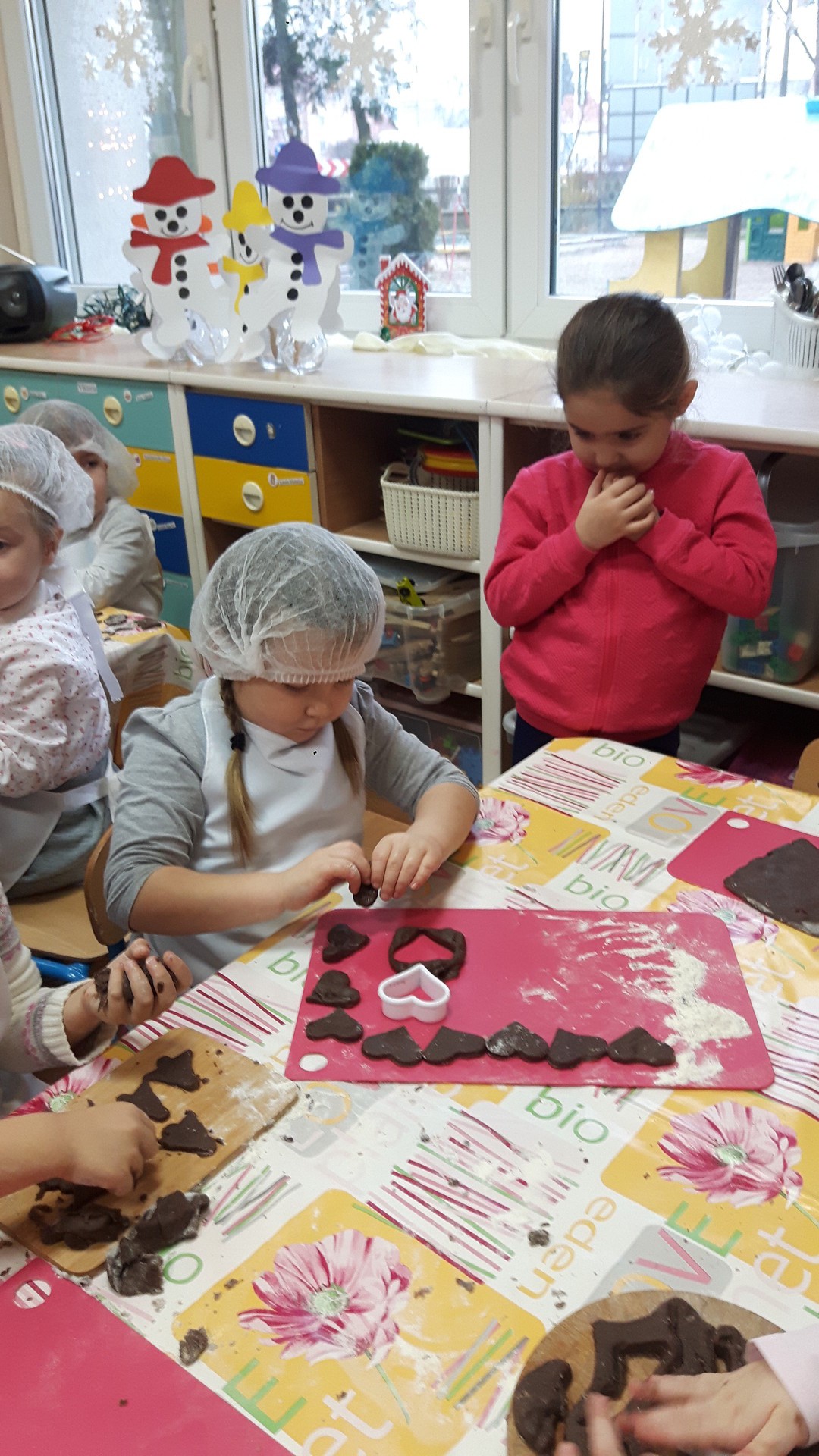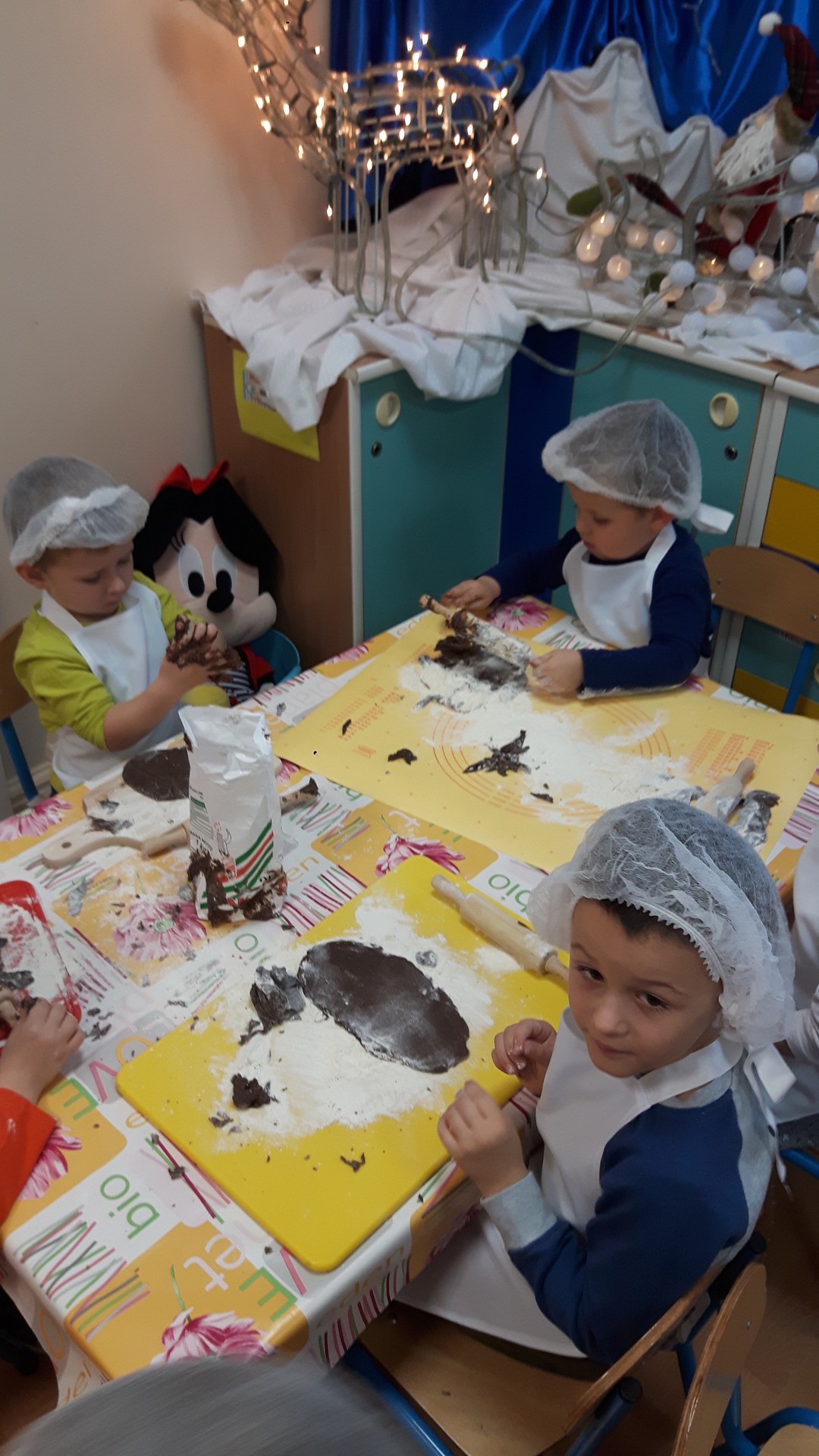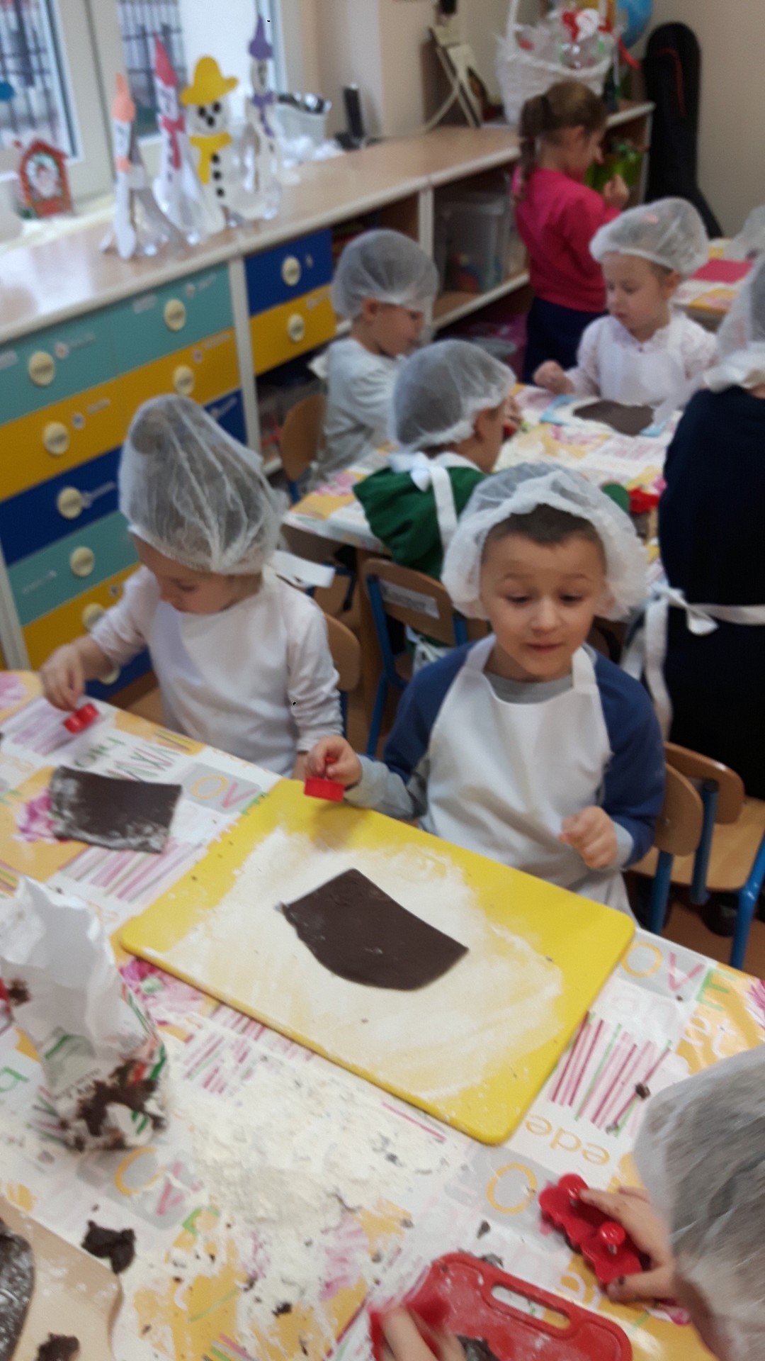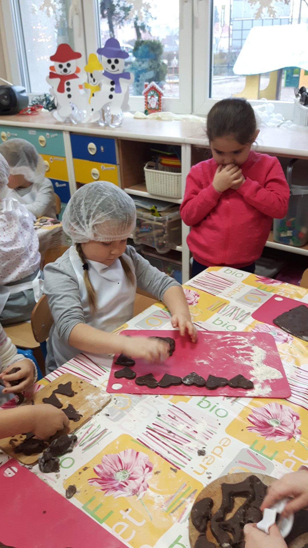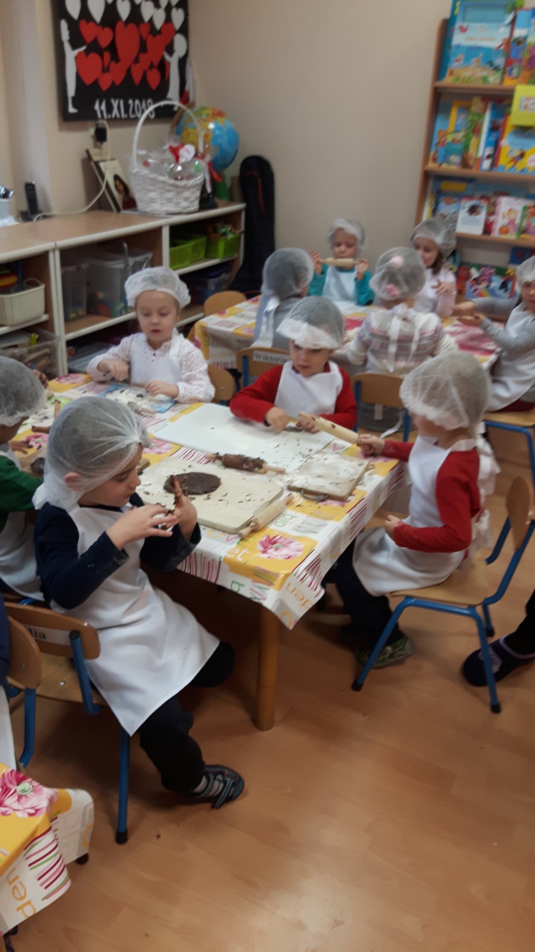 18 grudnia dla dzieci był bardzo pracowity dzień , bowiem tego dnia piekły one pierniczki. Najpierw odpowiednio się przygotowały dbając o czyste rączki oraz zakładając fartuszki. Poznały też składniki i sposób wykonania ciasta, potrzebne przybory kuchenne a także zasady bezpieczeństwa. Gdy wszystko było gotowe przedszkolaki z ogromnym zapałem i zaangażowaniem zabrały się do pracy – wałkowały ciasto, wykrawały ciasteczka. Efektem naszej pracy były pełne blaszki pierniczków, które zanieśliśmy do kuchni. Tu pod czujnym okiem naszych pań kuchareczek pierniki nabierały koloru piekąc się w piekarniku. Na koniec dzieci z wielką chęcią zdobiły pierniczki.