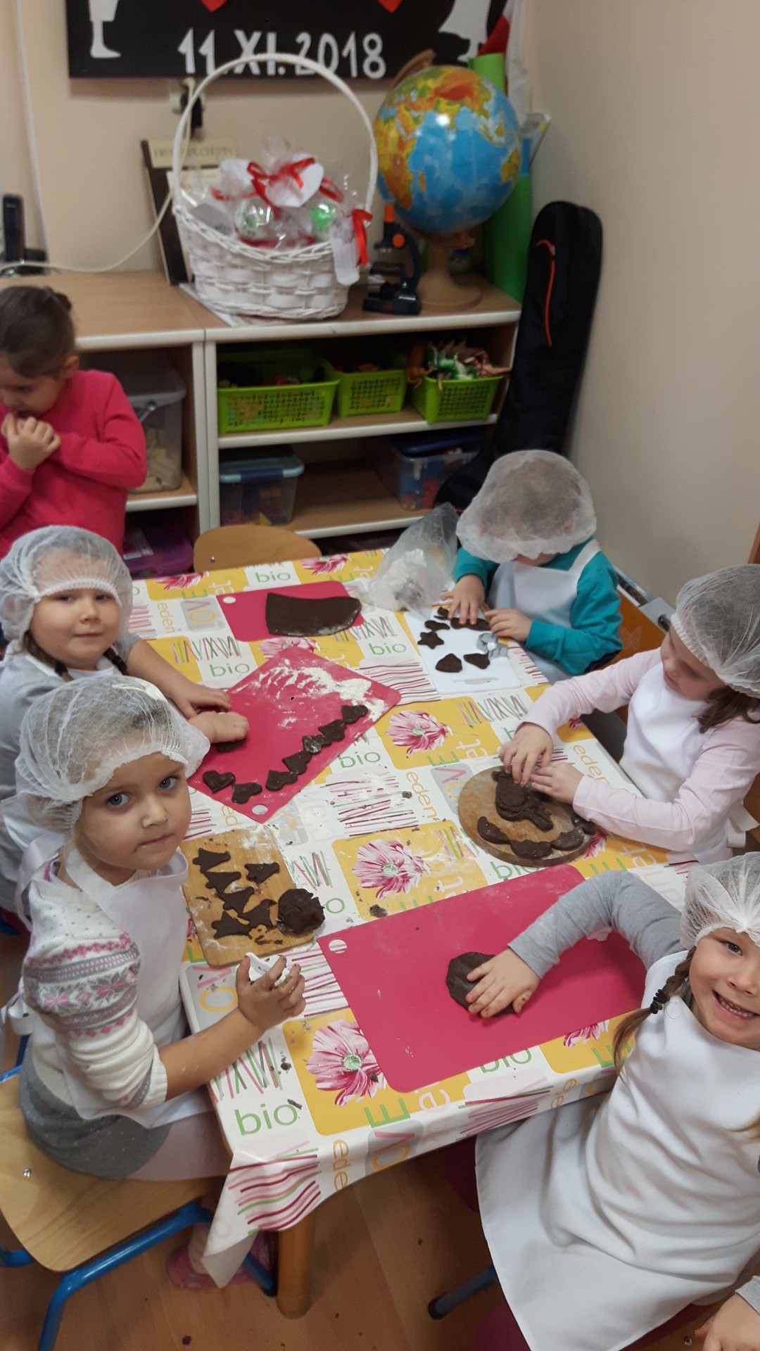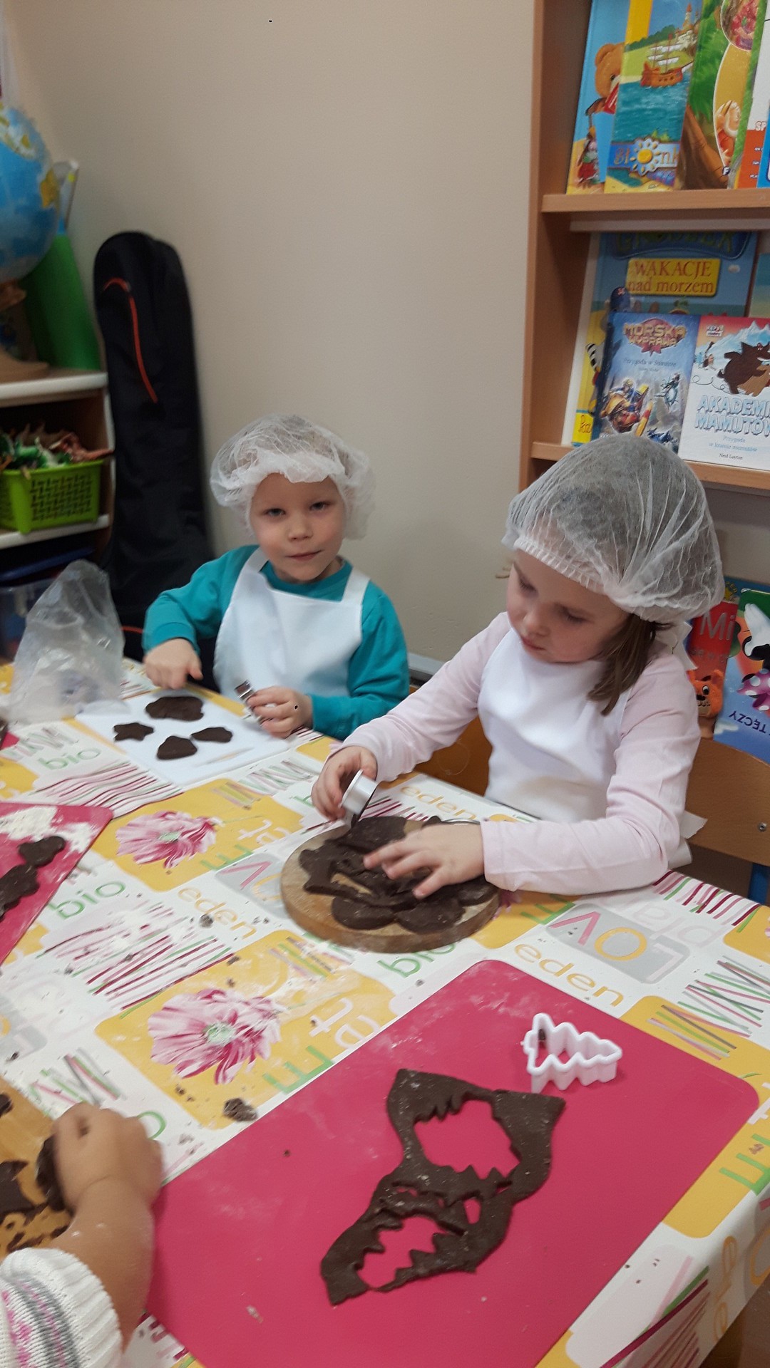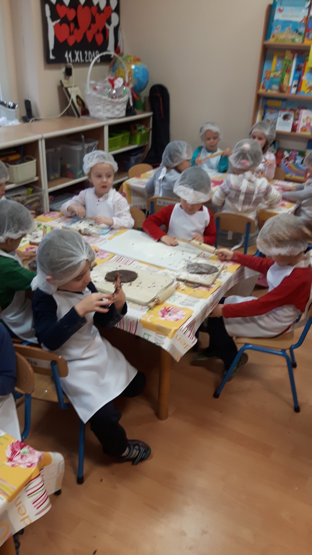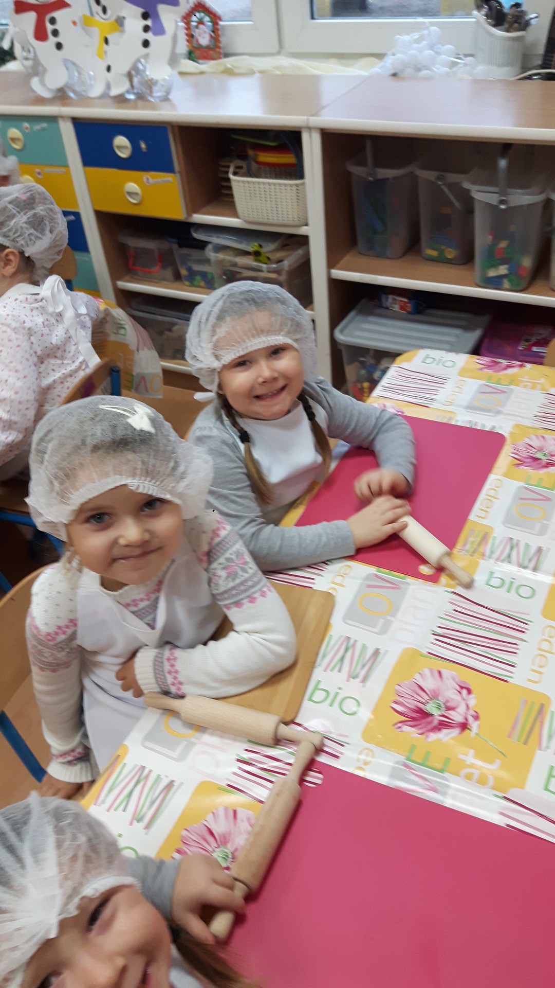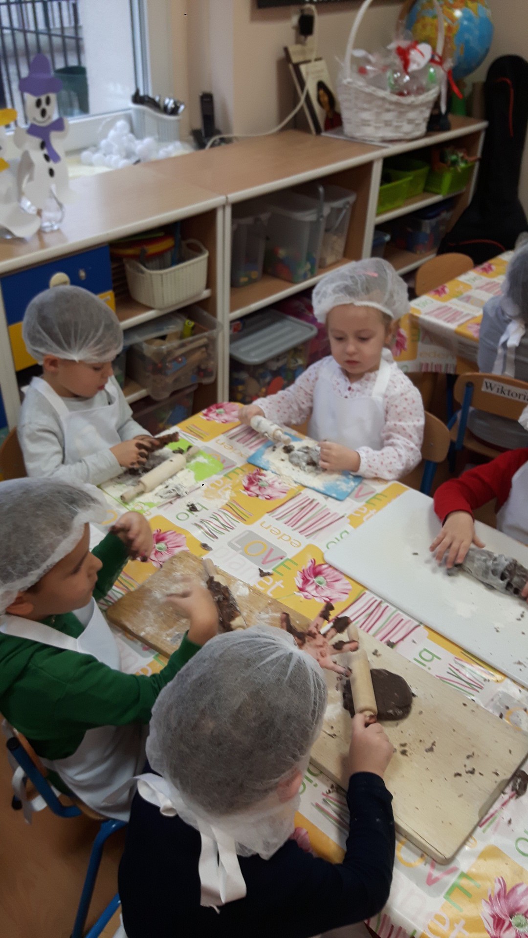 18 grudnia dla dzieci był bardzo pracowity dzień , bowiem tego dnia piekły one pierniczki. Najpierw odpowiednio się przygotowały dbając o czyste rączki oraz zakładając fartuszki. Poznały też składniki i sposób wykonania ciasta, potrzebne przybory kuchenne a także zasady bezpieczeństwa. Gdy wszystko było gotowe przedszkolaki z ogromnym zapałem i zaangażowaniem zabrały się do pracy – wałkowały ciasto, wykrawały ciasteczka. Efektem naszej pracy były pełne blaszki pierniczków, które zanieśliśmy do kuchni. Tu pod czujnym okiem naszych pań kuchareczek pierniki nabierały koloru piekąc się w piekarniku. Na koniec dzieci z wielką chęcią zdobiły pierniczki.