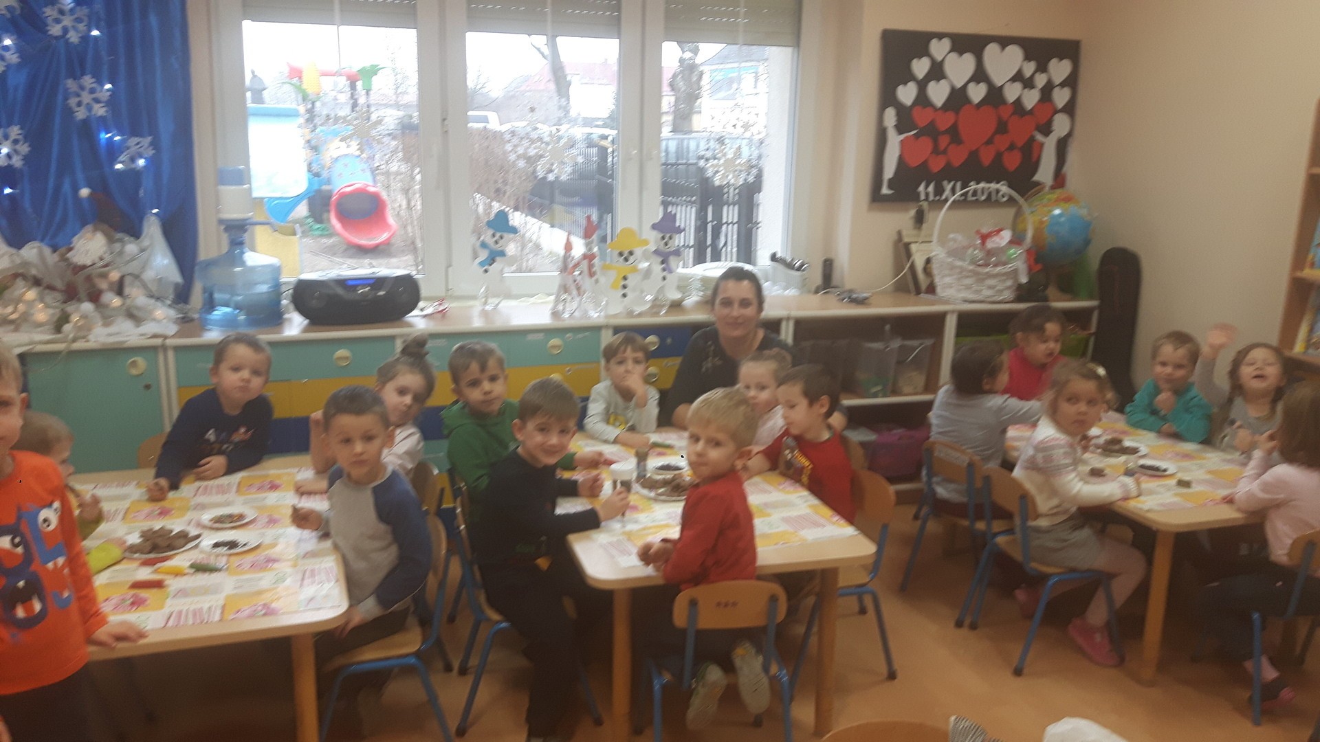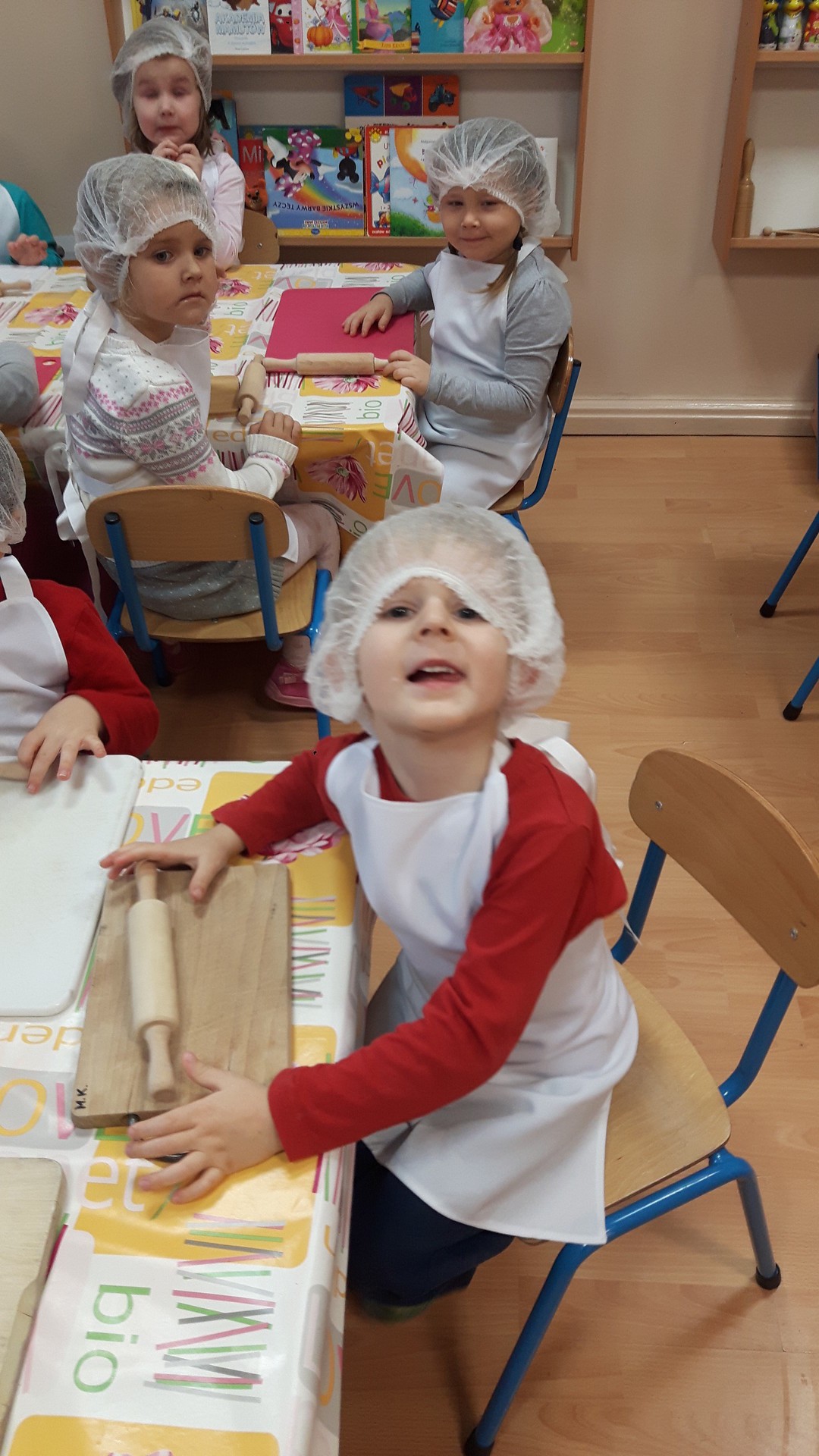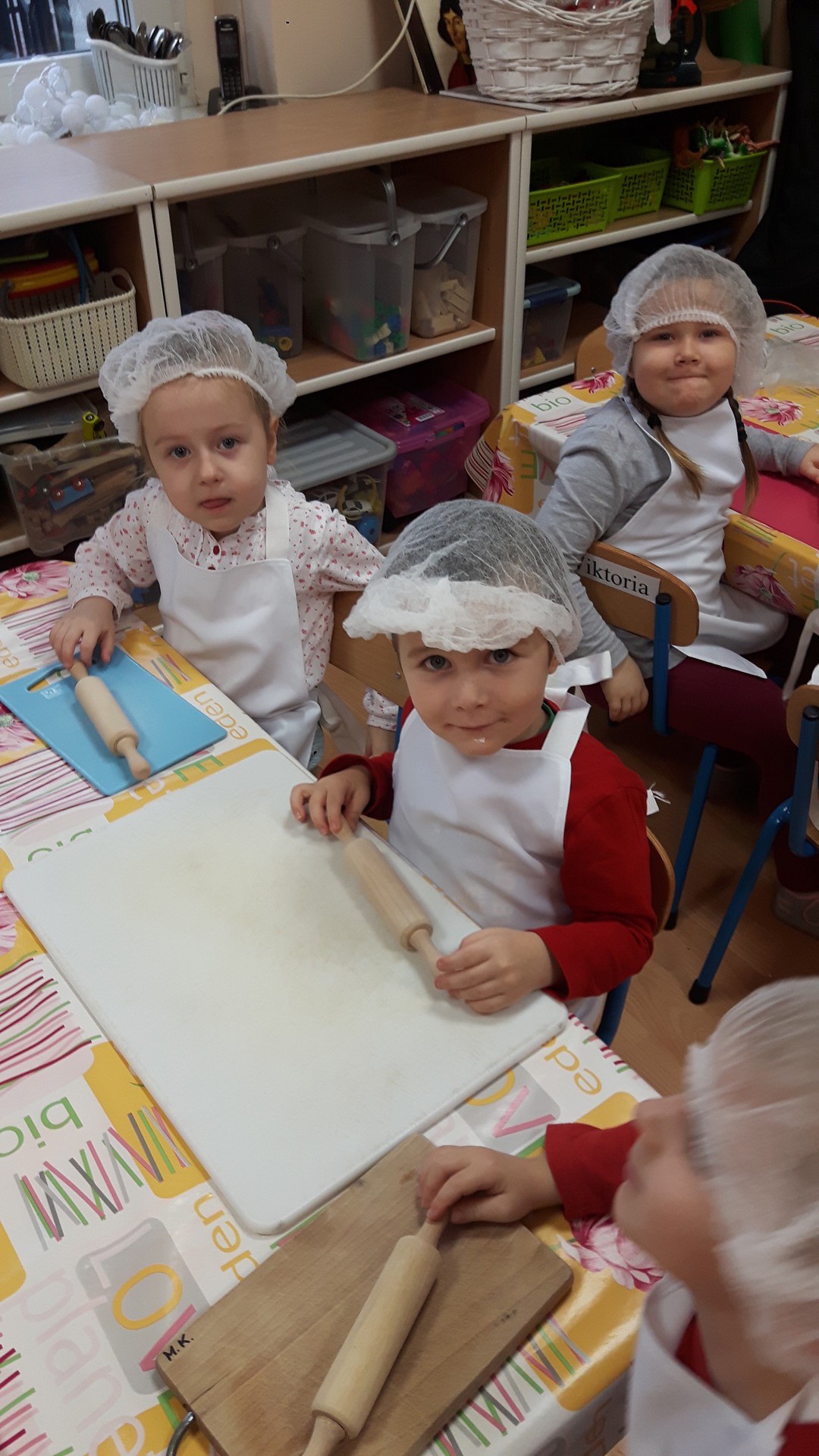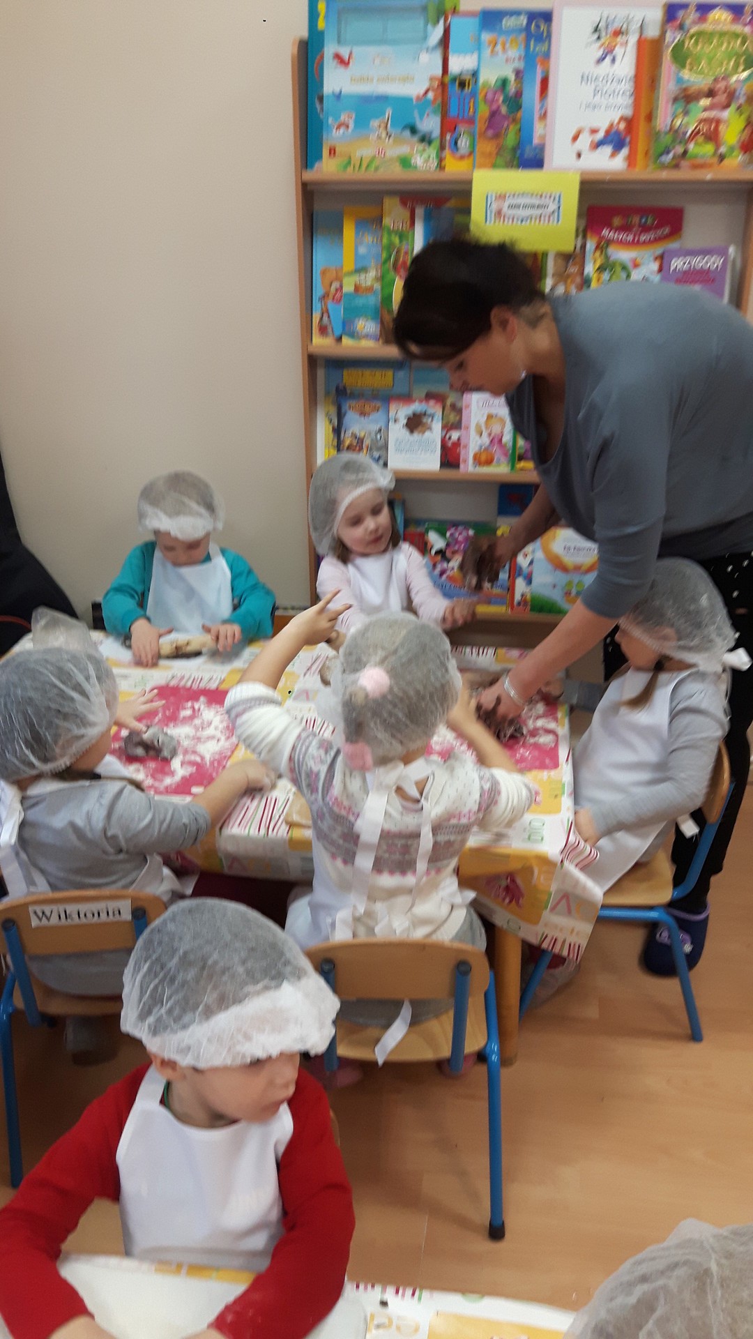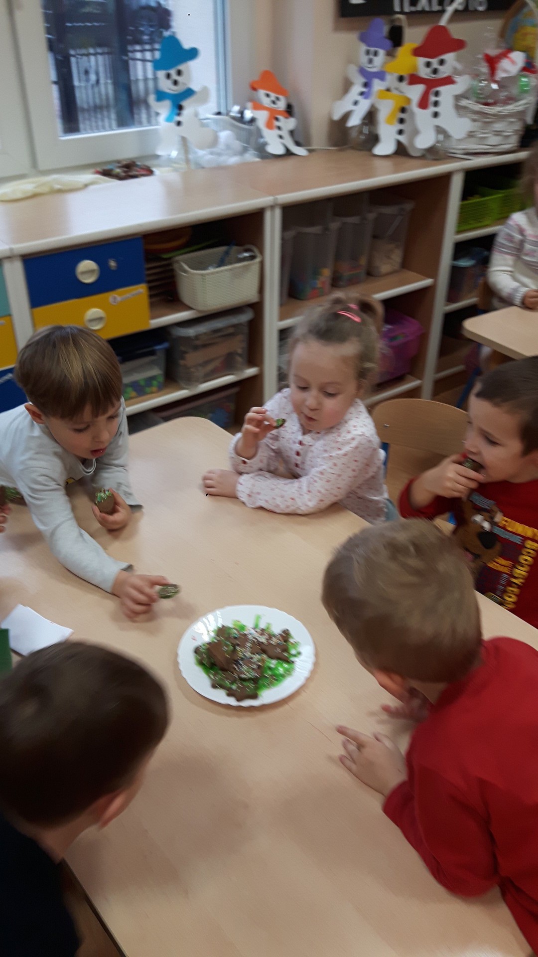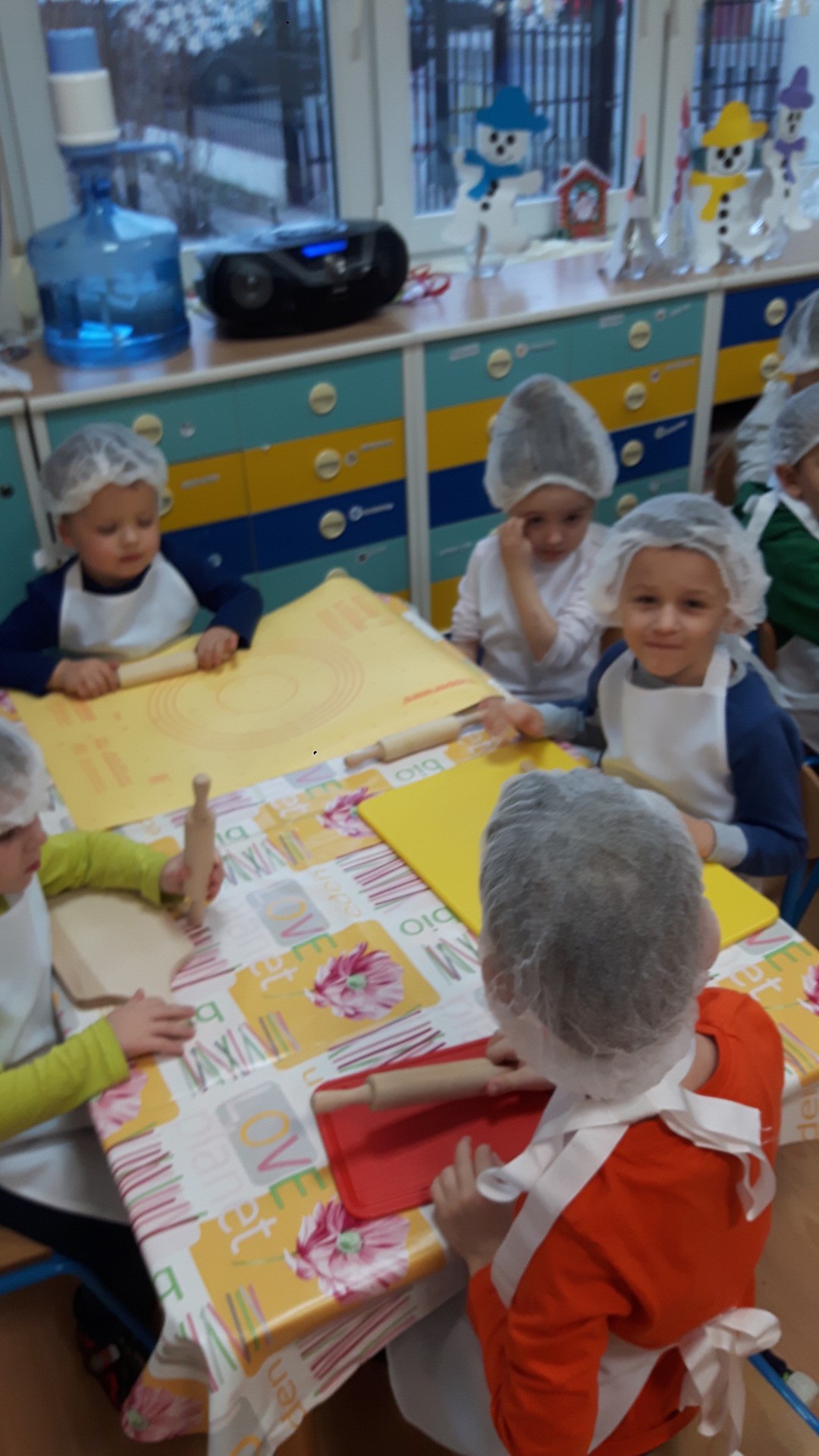 18 grudnia dla dzieci był bardzo pracowity dzień , bowiem tego dnia piekły one pierniczki. Najpierw odpowiednio się przygotowały dbając o czyste rączki oraz zakładając fartuszki. Poznały też składniki i sposób wykonania ciasta, potrzebne przybory kuchenne a także zasady bezpieczeństwa. Gdy wszystko było gotowe przedszkolaki z ogromnym zapałem i zaangażowaniem zabrały się do pracy – wałkowały ciasto, wykrawały ciasteczka. Efektem naszej pracy były pełne blaszki pierniczków, które zanieśliśmy do kuchni. Tu pod czujnym okiem naszych pań kuchareczek pierniki nabierały koloru piekąc się w piekarniku. Na koniec dzieci z wielką chęcią zdobiły pierniczki.