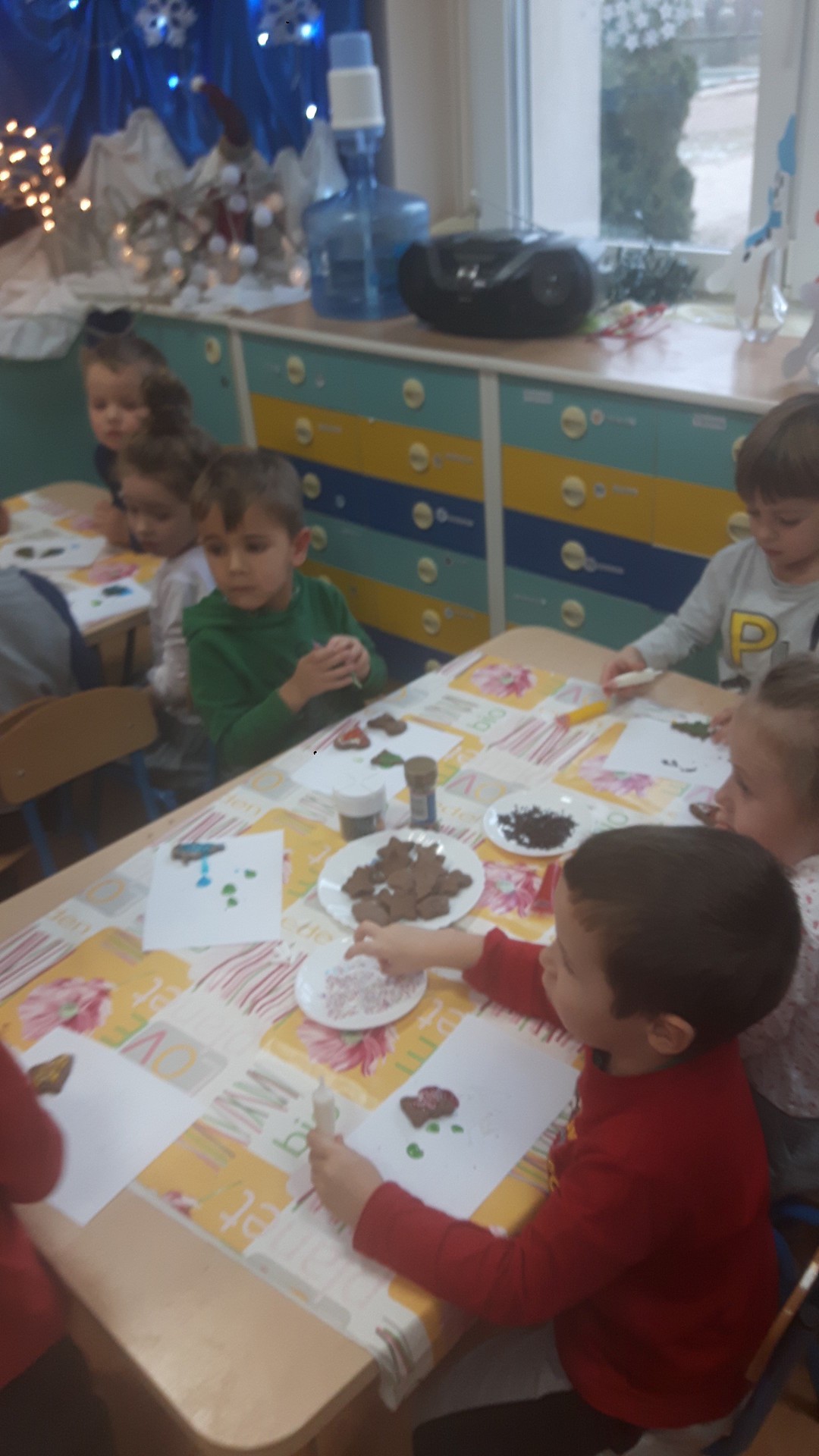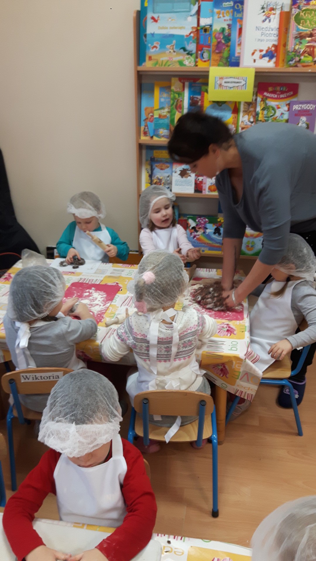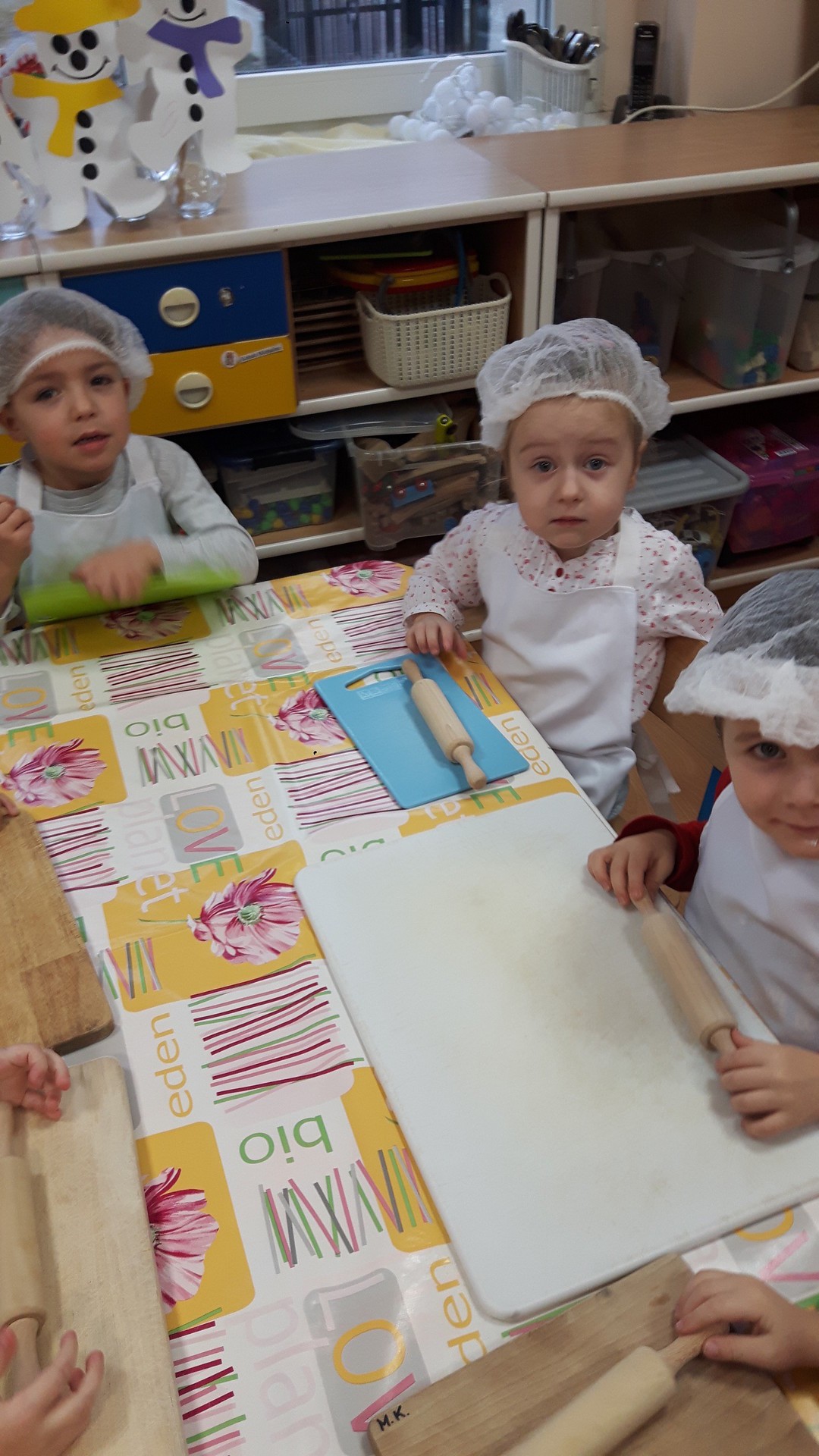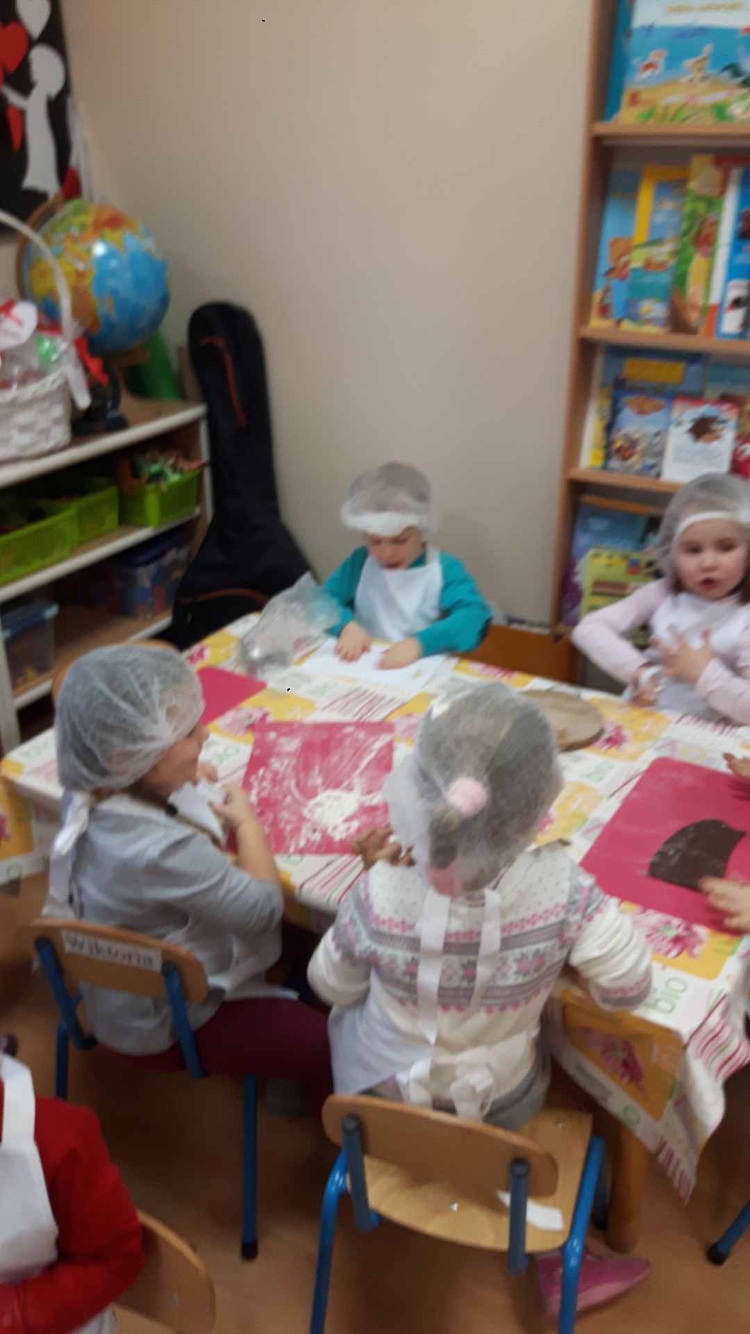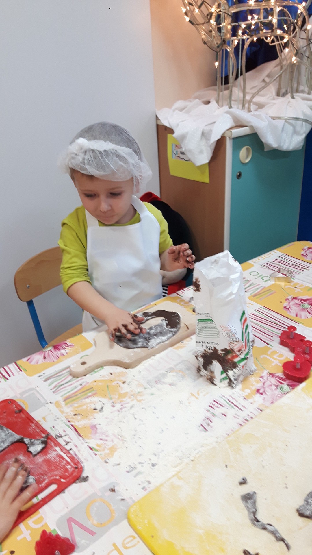 18 grudnia dla dzieci był bardzo pracowity dzień , bowiem tego dnia piekły one pierniczki. Najpierw odpowiednio się przygotowały dbając o czyste rączki oraz zakładając fartuszki. Poznały też składniki i sposób wykonania ciasta, potrzebne przybory kuchenne a także zasady bezpieczeństwa. Gdy wszystko było gotowe przedszkolaki z ogromnym zapałem i zaangażowaniem zabrały się do pracy – wałkowały ciasto, wykrawały ciasteczka. Efektem naszej pracy były pełne blaszki pierniczków, które zanieśliśmy do kuchni. Tu pod czujnym okiem naszych pań kuchareczek pierniki nabierały koloru piekąc się w piekarniku. Na koniec dzieci z wielką chęcią zdobiły pierniczki.
