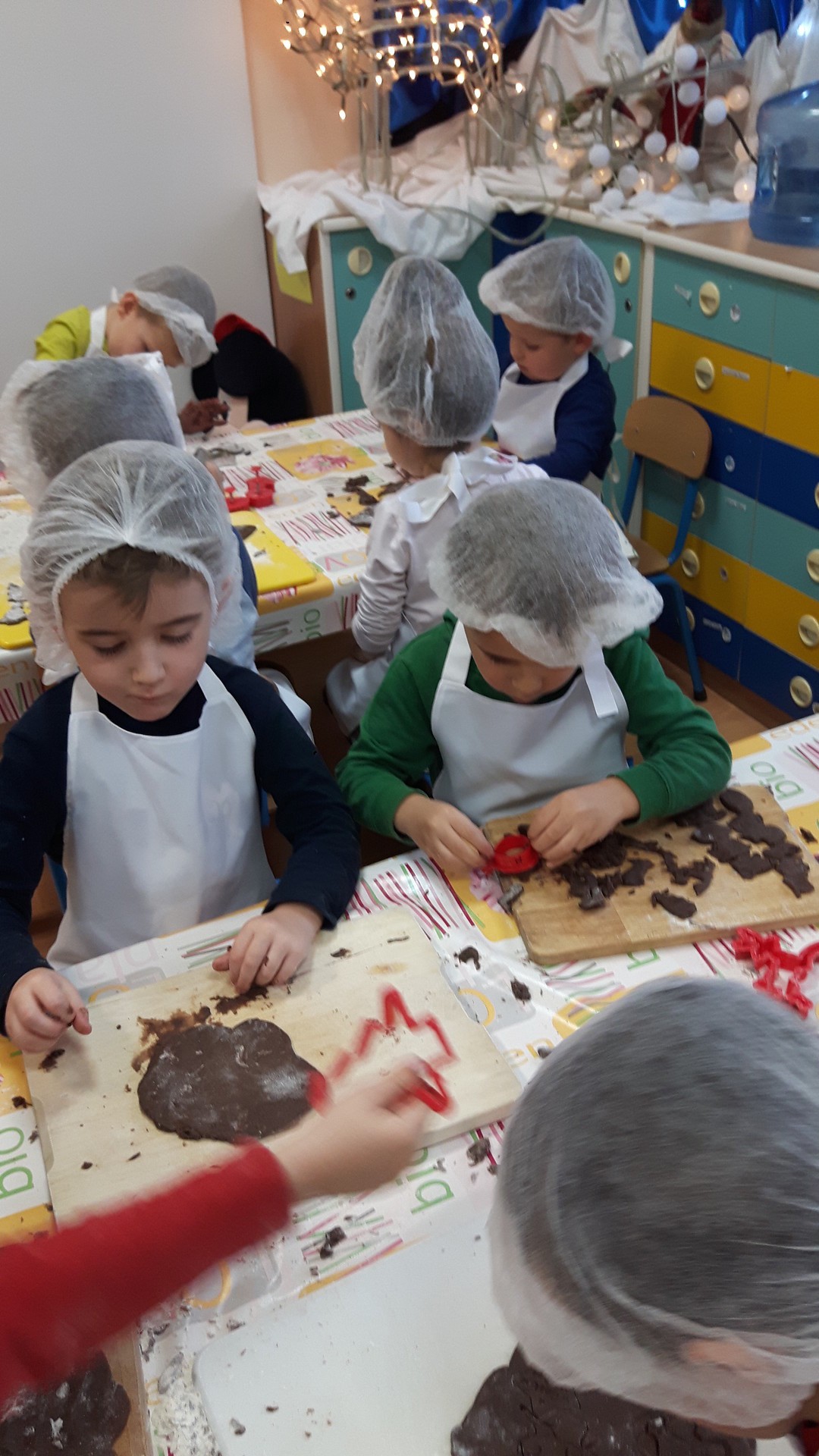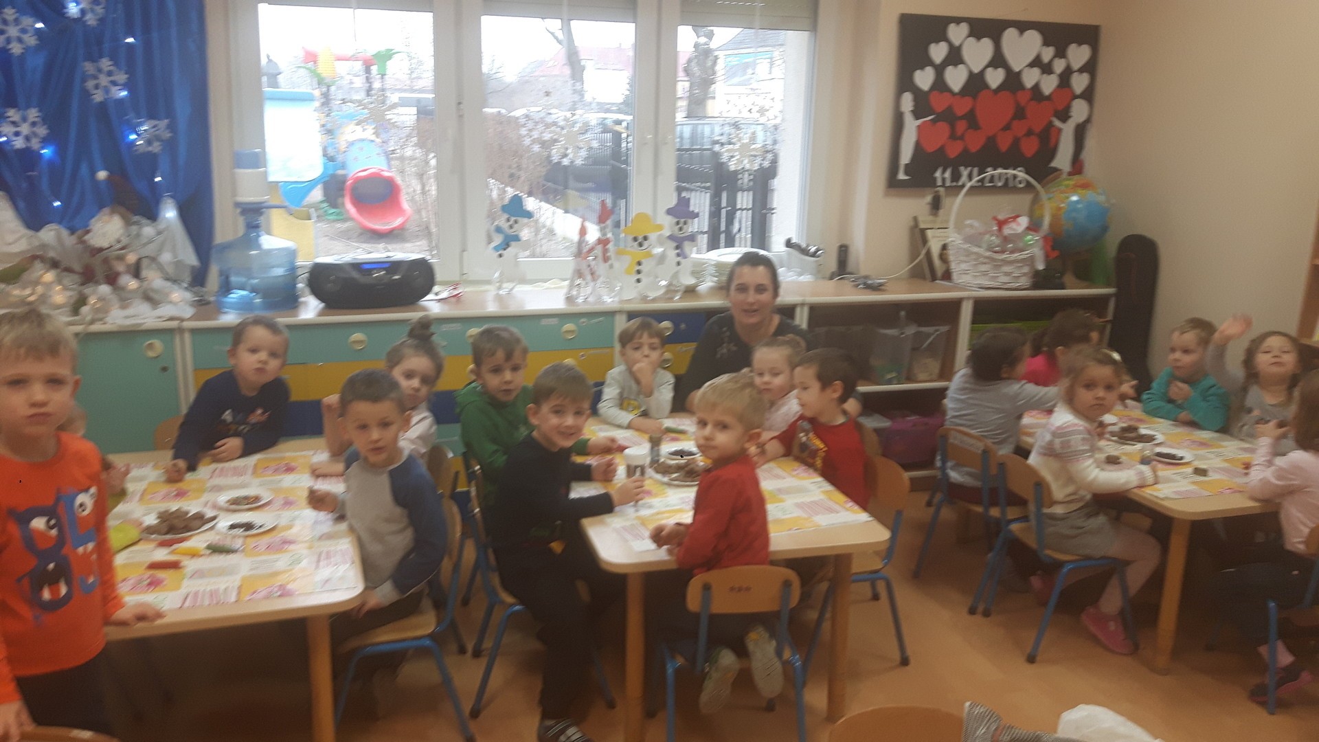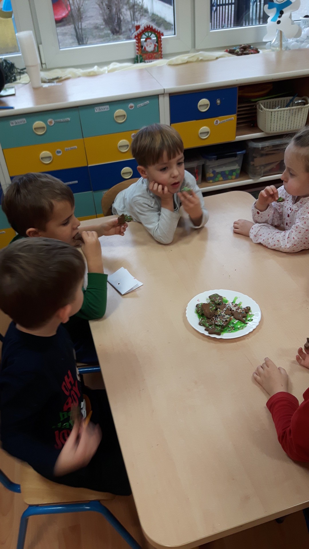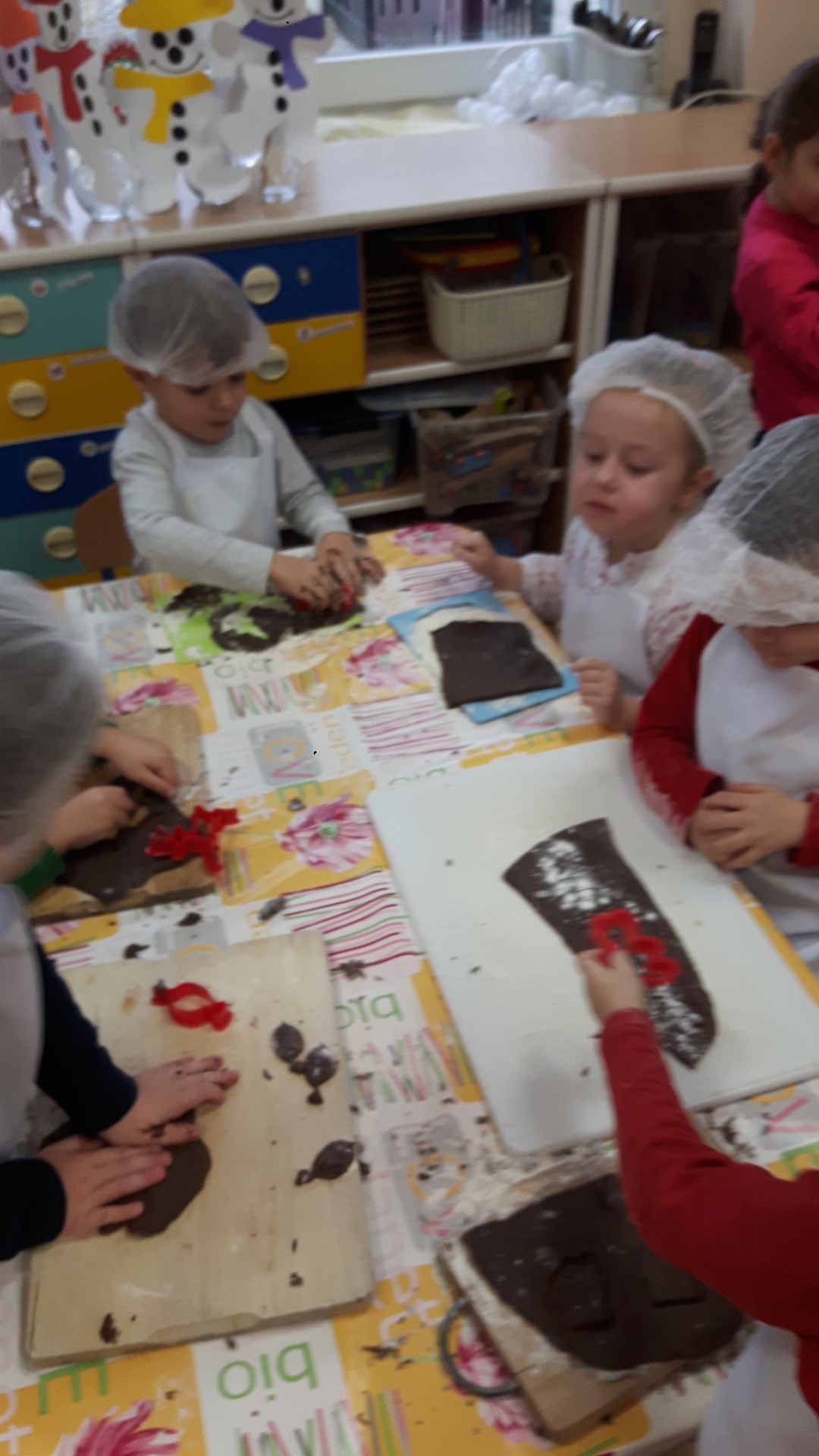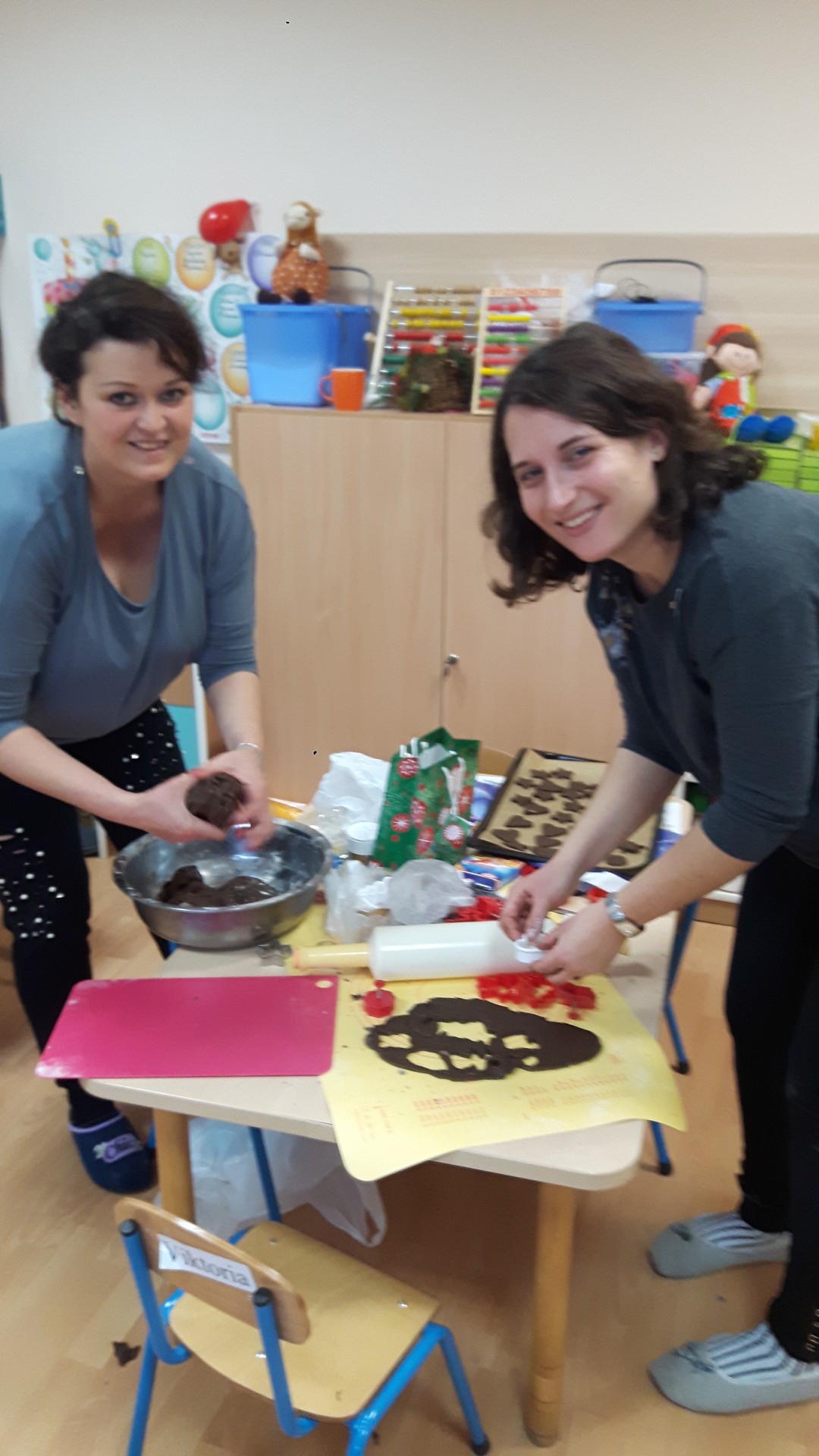 18 grudnia dla dzieci był bardzo pracowity dzień , bowiem tego dnia piekły one pierniczki. Najpierw odpowiednio się przygotowały dbając o czyste rączki oraz zakładając fartuszki. Poznały też składniki i sposób wykonania ciasta, potrzebne przybory kuchenne a także zasady bezpieczeństwa. Gdy wszystko było gotowe przedszkolaki z ogromnym zapałem i zaangażowaniem zabrały się do pracy – wałkowały ciasto, wykrawały ciasteczka. Efektem naszej pracy były pełne blaszki pierniczków, które zanieśliśmy do kuchni. Tu pod czujnym okiem naszych pań kuchareczek pierniki nabierały koloru piekąc się w piekarniku. Na koniec dzieci z wielką chęcią zdobiły pierniczki.