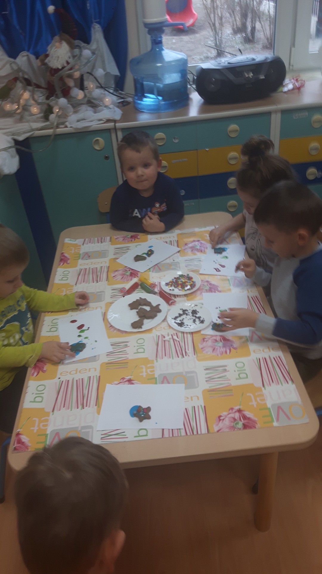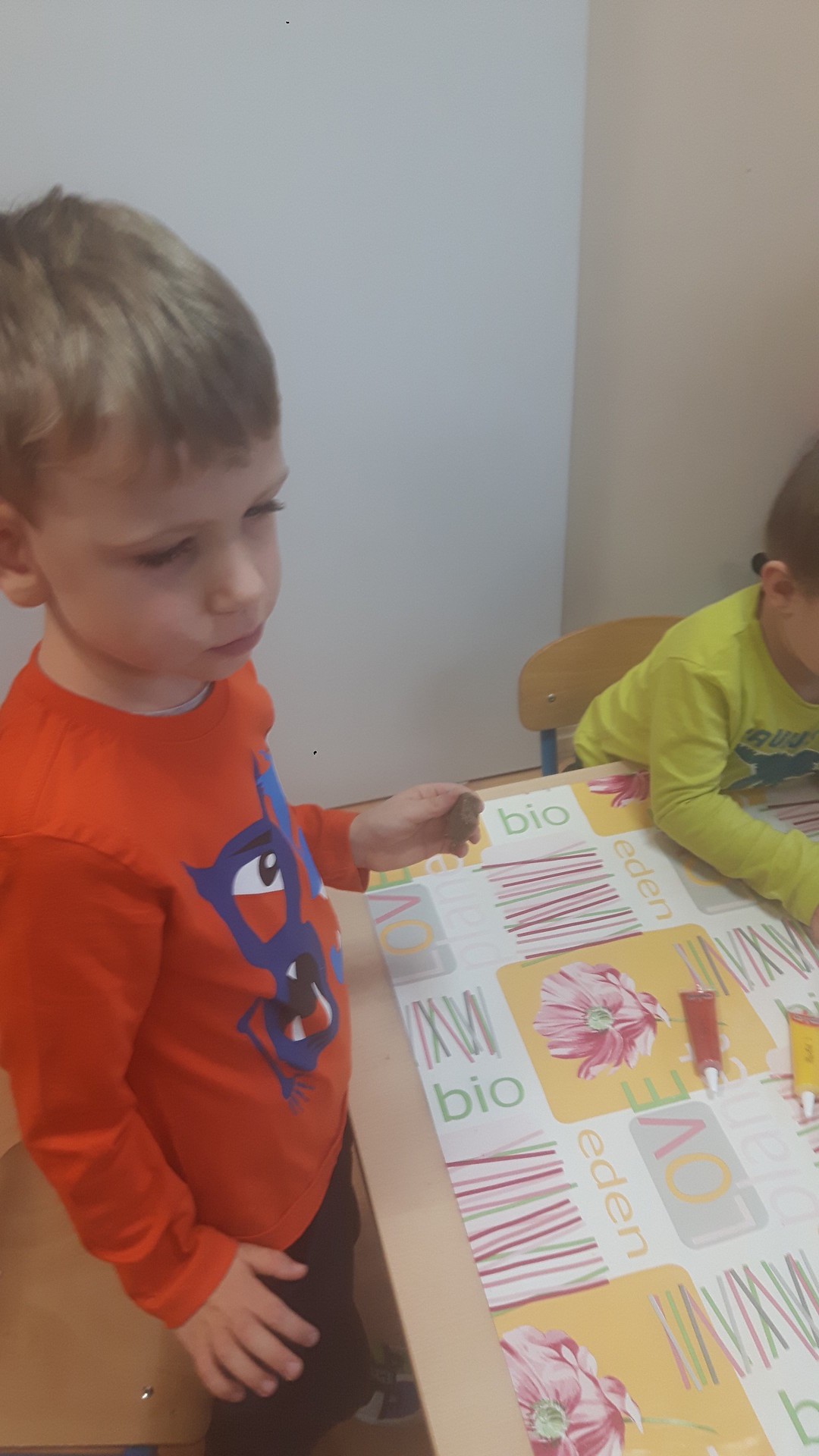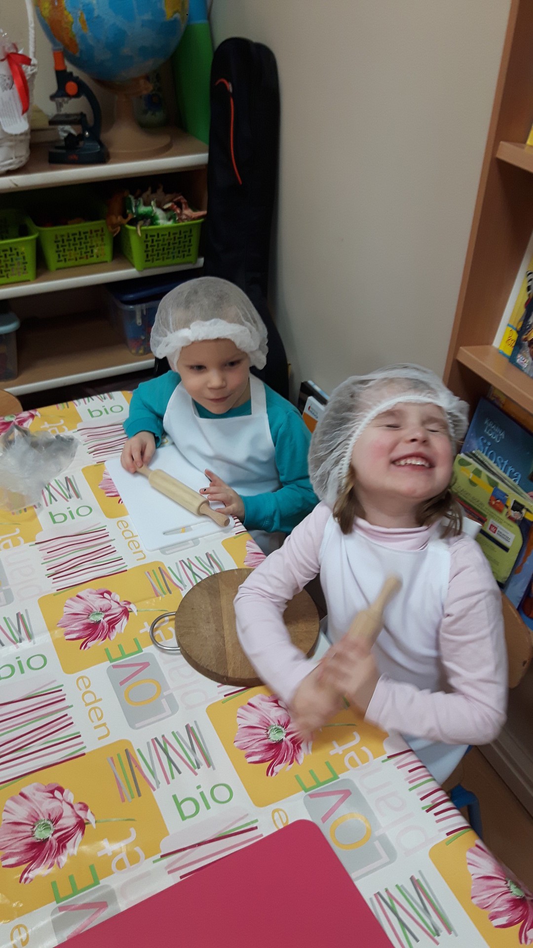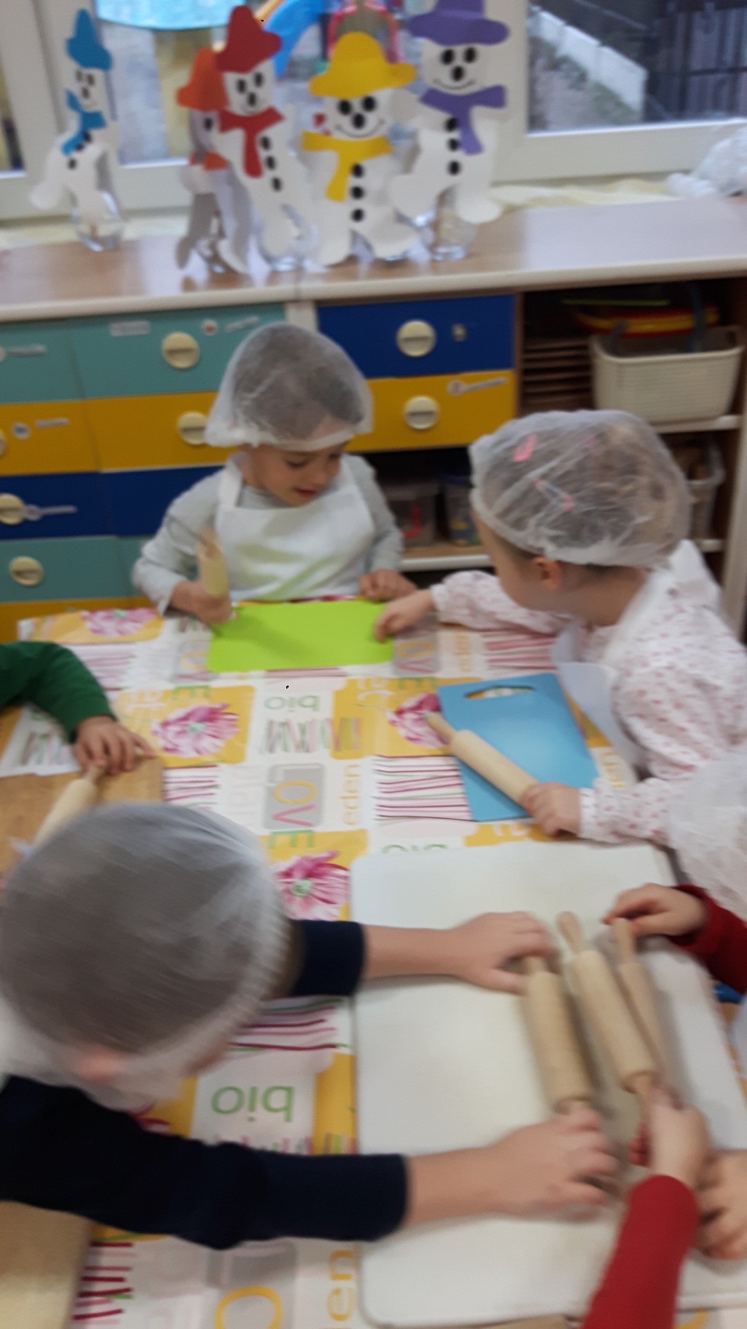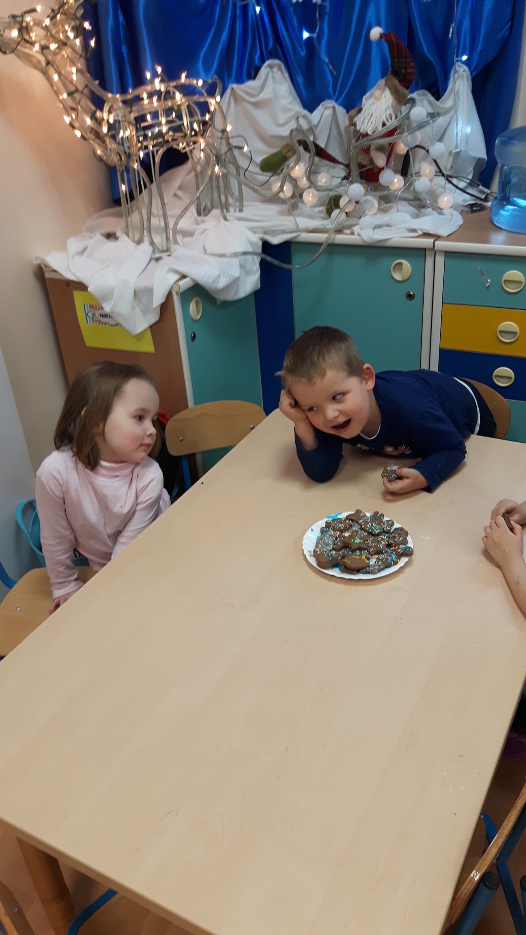 18 grudnia dla dzieci był bardzo pracowity dzień , bowiem tego dnia piekły one pierniczki. Najpierw odpowiednio się przygotowały dbając o czyste rączki oraz zakładając fartuszki. Poznały też składniki i sposób wykonania ciasta, potrzebne przybory kuchenne a także zasady bezpieczeństwa. Gdy wszystko było gotowe przedszkolaki z ogromnym zapałem i zaangażowaniem zabrały się do pracy – wałkowały ciasto, wykrawały ciasteczka. Efektem naszej pracy były pełne blaszki pierniczków, które zanieśliśmy do kuchni. Tu pod czujnym okiem naszych pań kuchareczek pierniki nabierały koloru piekąc się w piekarniku. Na koniec dzieci z wielką chęcią zdobiły pierniczki.
