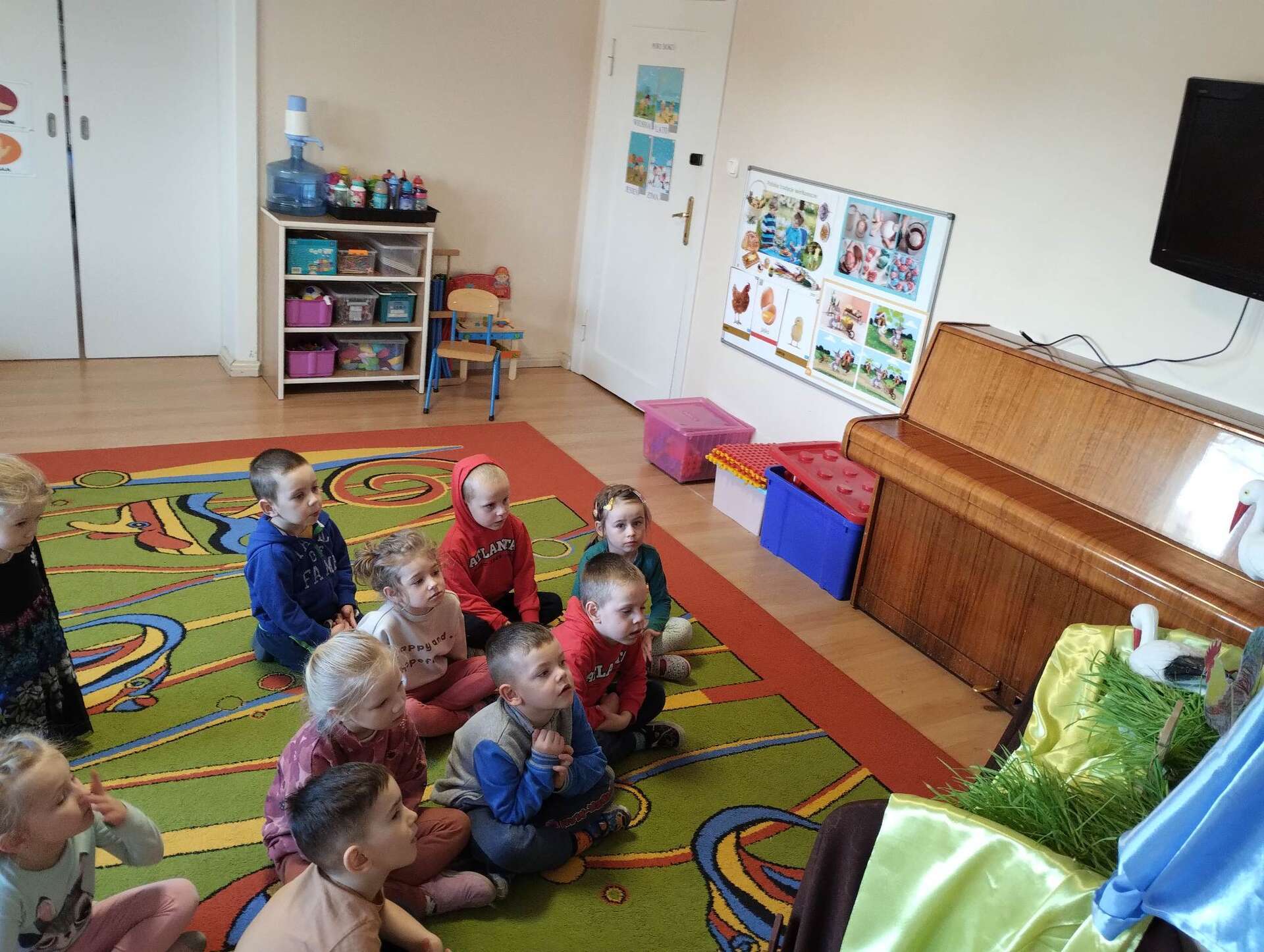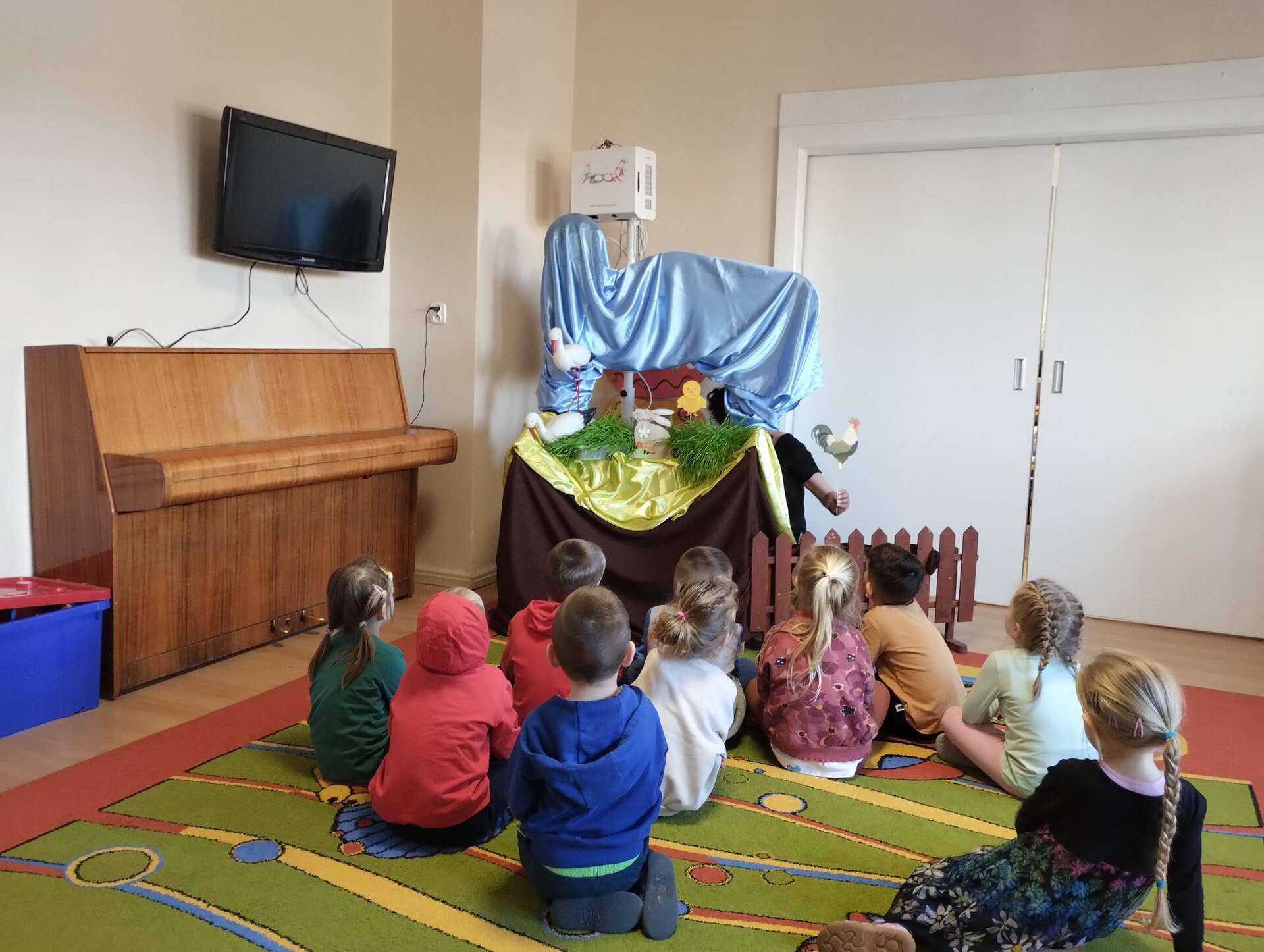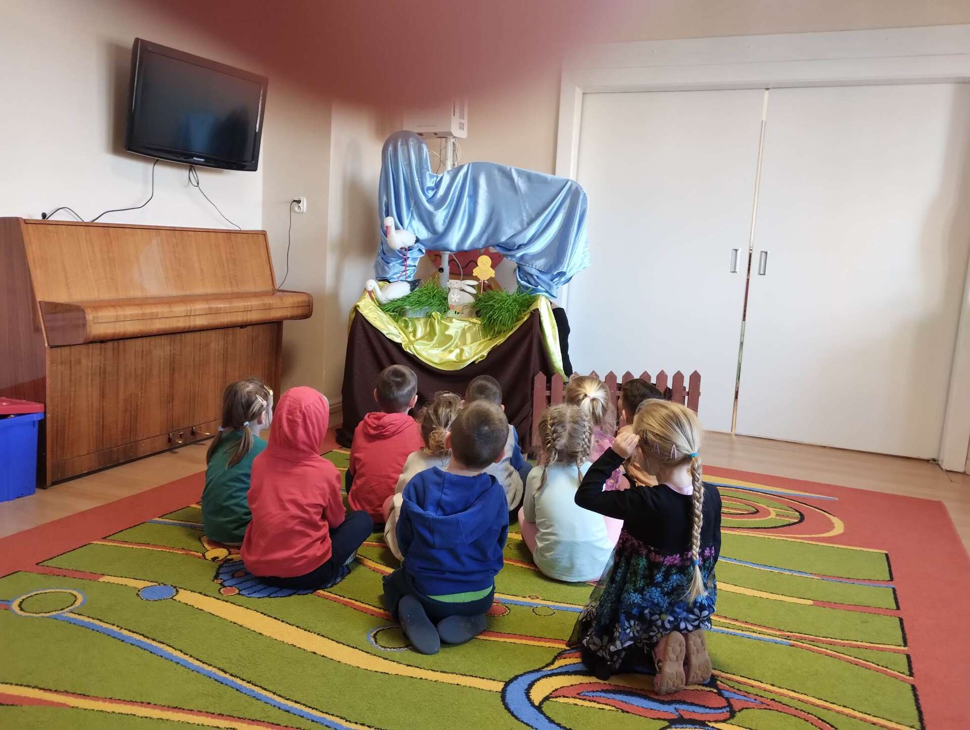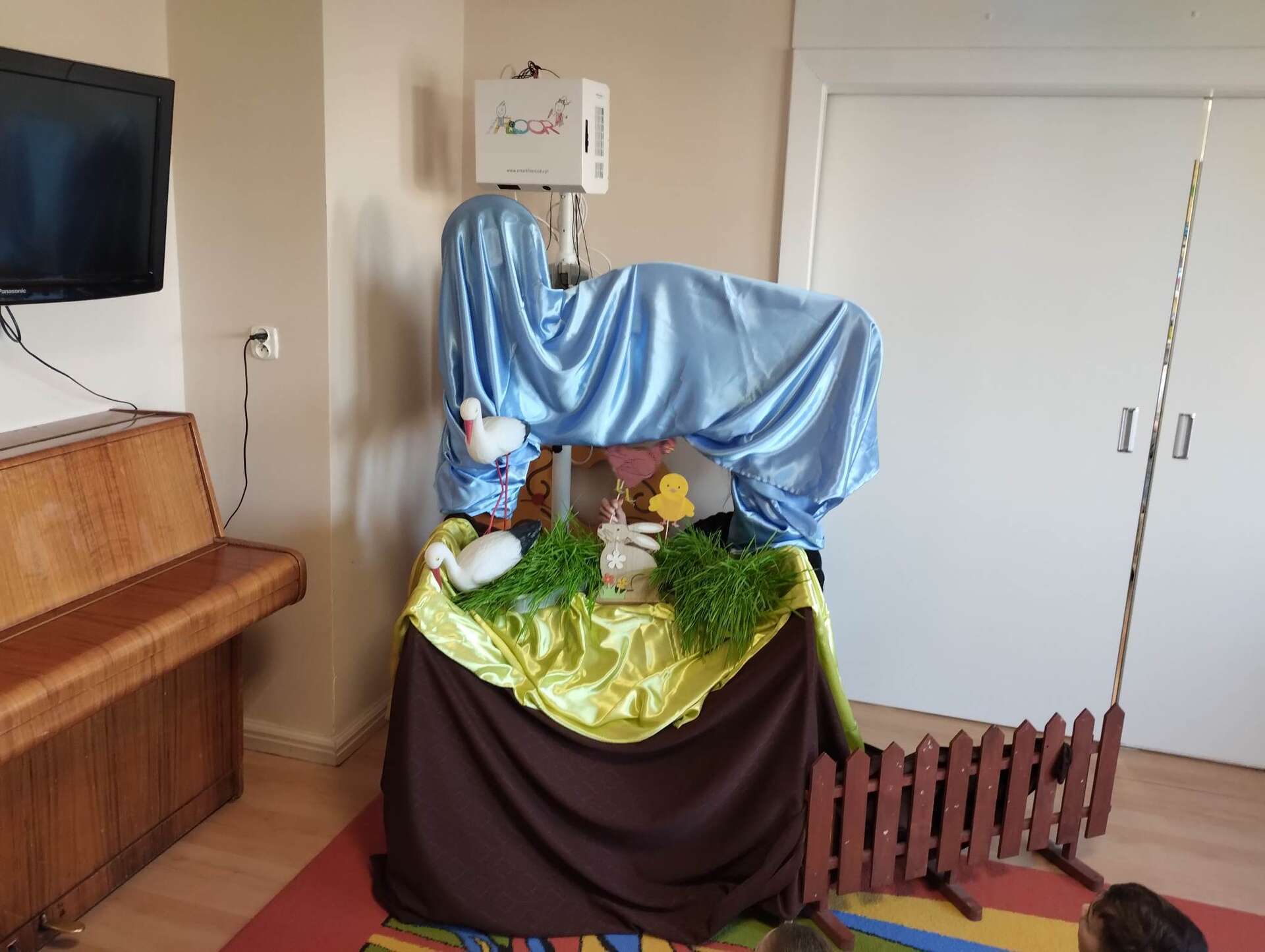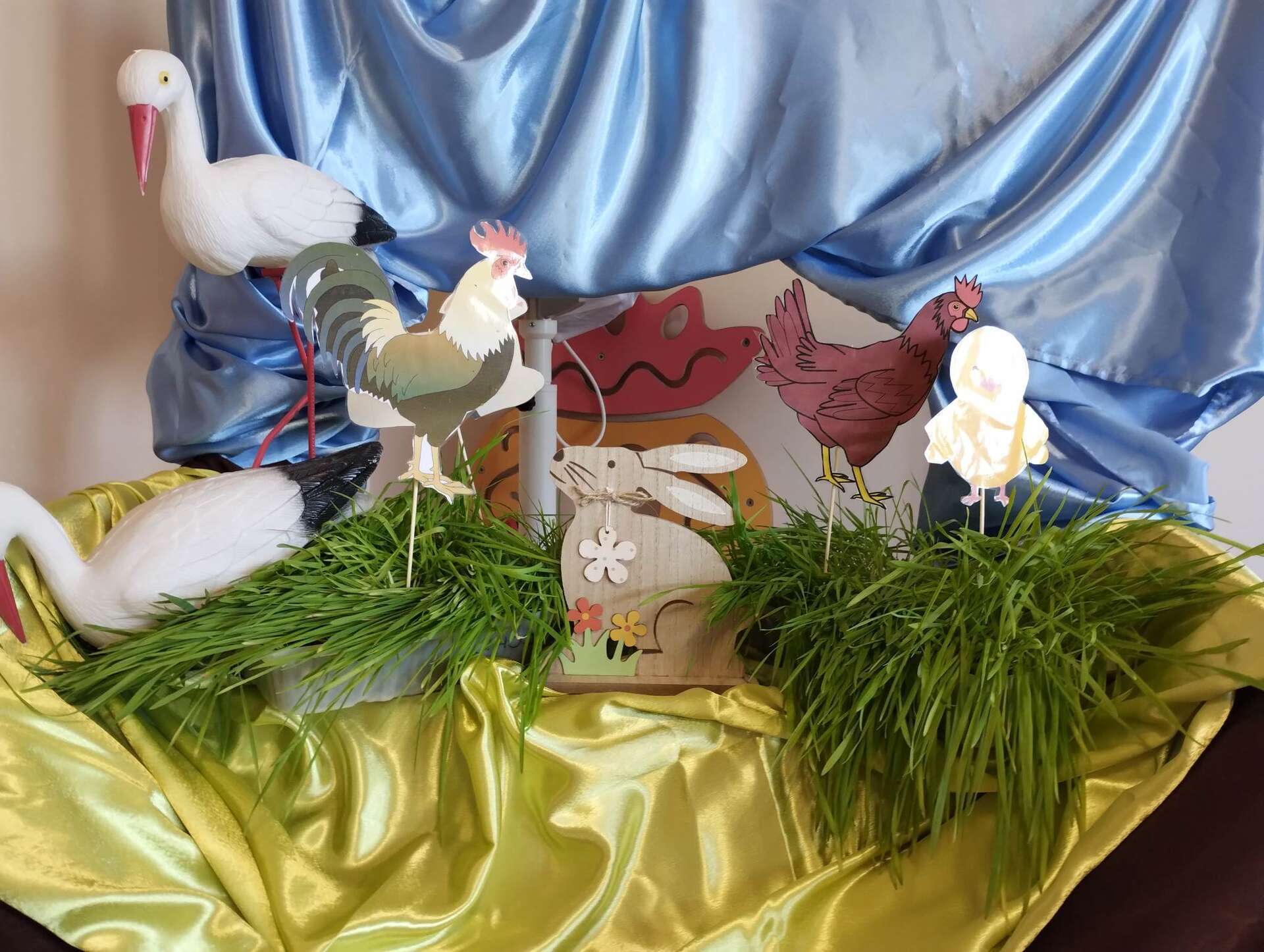 Teatrzyk - dekoracja. Pani siedzi za teatrzykiem.