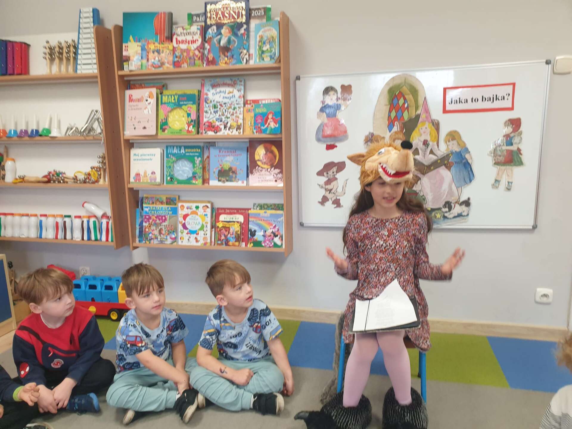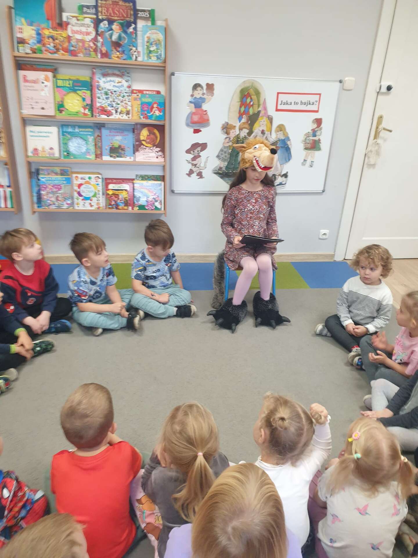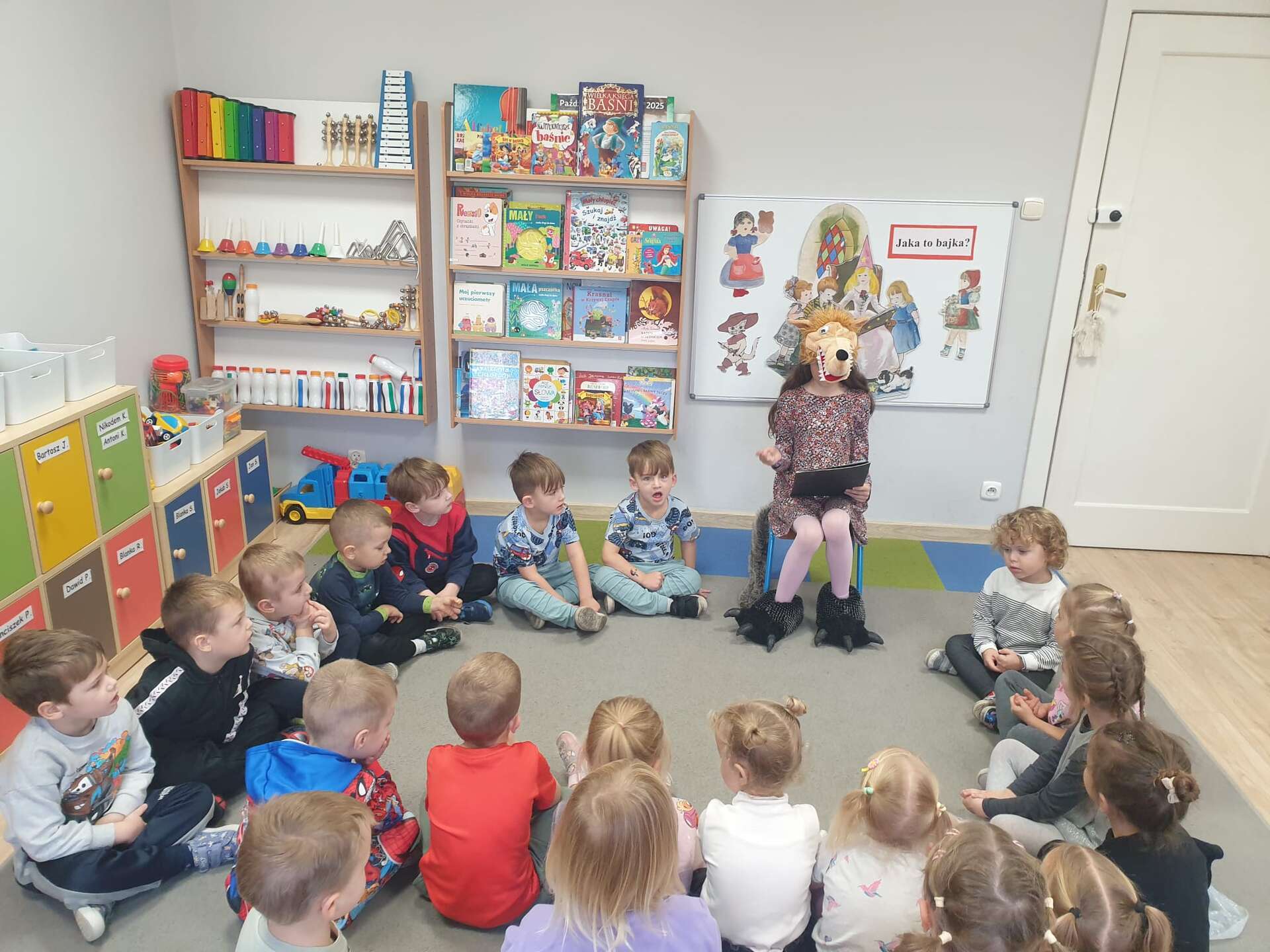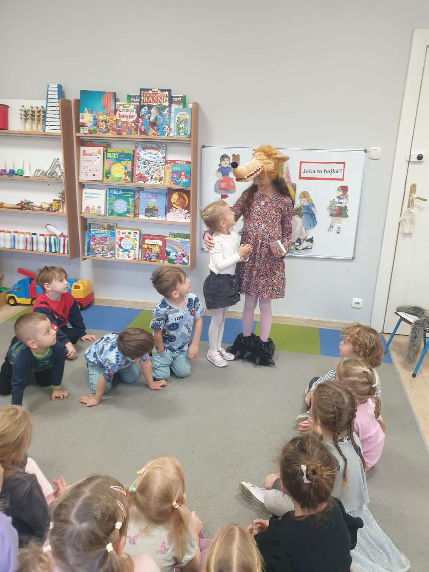 Dużym wydarzeniem tygodnia była wizyta w Miejskiej Bibliotece Publicznej, gdzie dzieci z wielkim zaciekawieniem wysłuchały bajki opowiedzianej przez panią bibliotekarkę. Każde dziecko otrzymało zakładkę do książki oraz kartę czytelniczą zachęcającą do pierwszych, samodzielnych wizyt w bibliotece z rodzicami. Nie zabrakło również wyjątkowego spotkania z absolwentką naszego przedszkola – Alą, która przeczytała dzieciom bajkę o wilku. Był to bardzo miły i wzruszający moment – dzieci słuchały z dużym skupieniem i zainteresowaniem. Tydzień zakończyły bajkowe zabawy zorganizowane przez wolontariuszki – pełne śmiechu, ruchu i kreatywnych aktywności, które pozwoliły dzieciom wcielić się w role bohaterów znanych baśni. Tydzień „W świecie bajek” dostarczył dzieciom wielu emocji, pobudził wyobraźnię, wzbogacił słownictwo i – co najważniejsze – rozbudził zainteresowanie książką i czytaniem. Był to czas pełen radości, wspólnej zabawy i nauki poprzez literaturę dziecięcą.