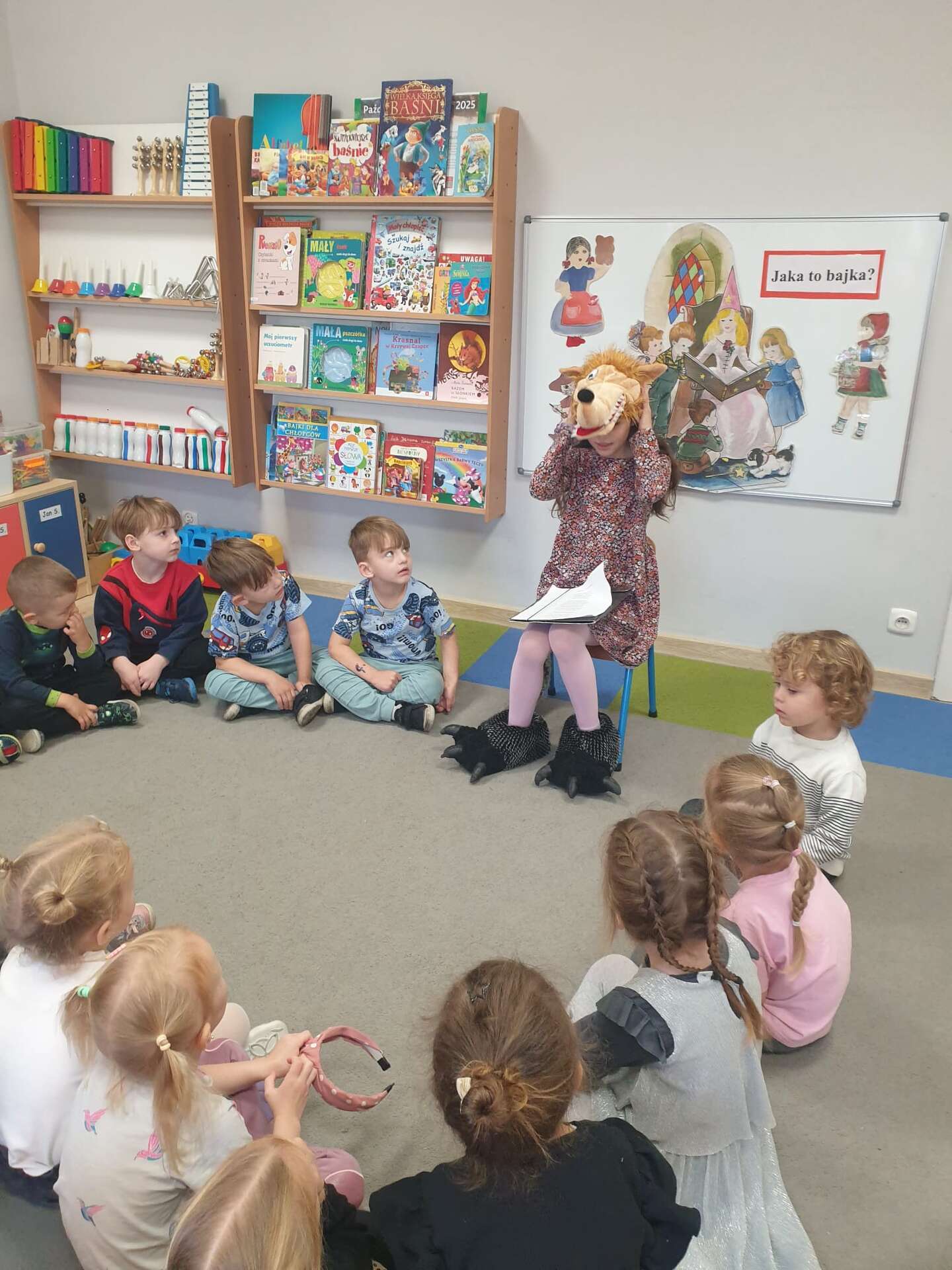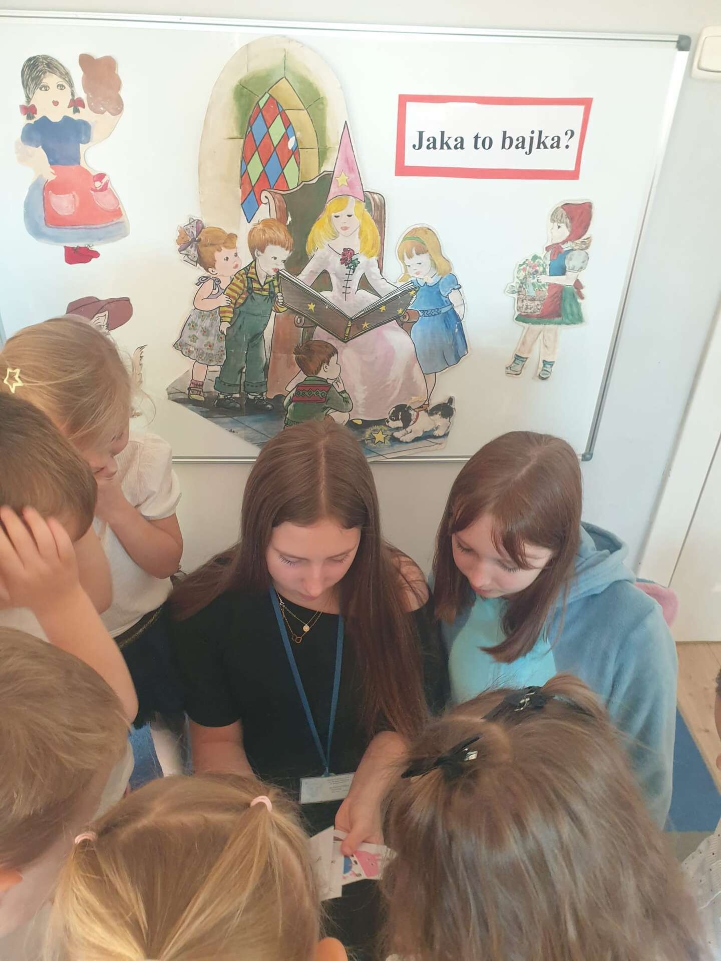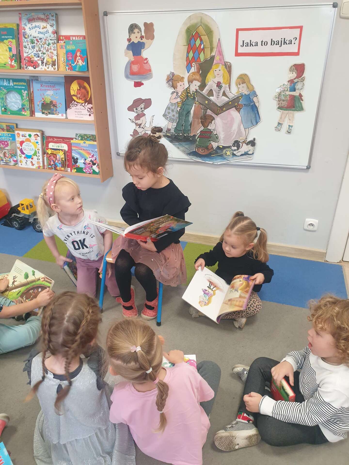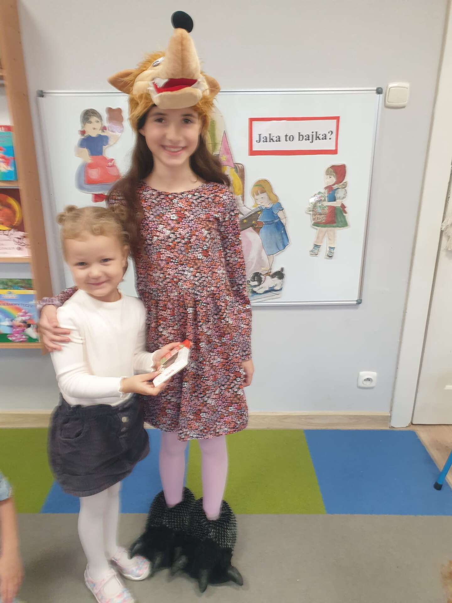 Dużym wydarzeniem tygodnia była wizyta w Miejskiej Bibliotece Publicznej, gdzie dzieci z wielkim zaciekawieniem wysłuchały bajki opowiedzianej przez panią bibliotekarkę. Każde dziecko otrzymało zakładkę do książki oraz kartę czytelniczą zachęcającą do pierwszych, samodzielnych wizyt w bibliotece z rodzicami. Nie zabrakło również wyjątkowego spotkania z absolwentką naszego przedszkola – Alą, która przeczytała dzieciom bajkę o wilku. Był to bardzo miły i wzruszający moment – dzieci słuchały z dużym skupieniem i zainteresowaniem. Tydzień zakończyły bajkowe zabawy zorganizowane przez wolontariuszki – pełne śmiechu, ruchu i kreatywnych aktywności, które pozwoliły dzieciom wcielić się w role bohaterów znanych baśni. Tydzień „W świecie bajek” dostarczył dzieciom wielu emocji, pobudził wyobraźnię, wzbogacił słownictwo i – co najważniejsze – rozbudził zainteresowanie książką i czytaniem. Był to czas pełen radości, wspólnej zabawy i nauki poprzez literaturę dziecięcą.