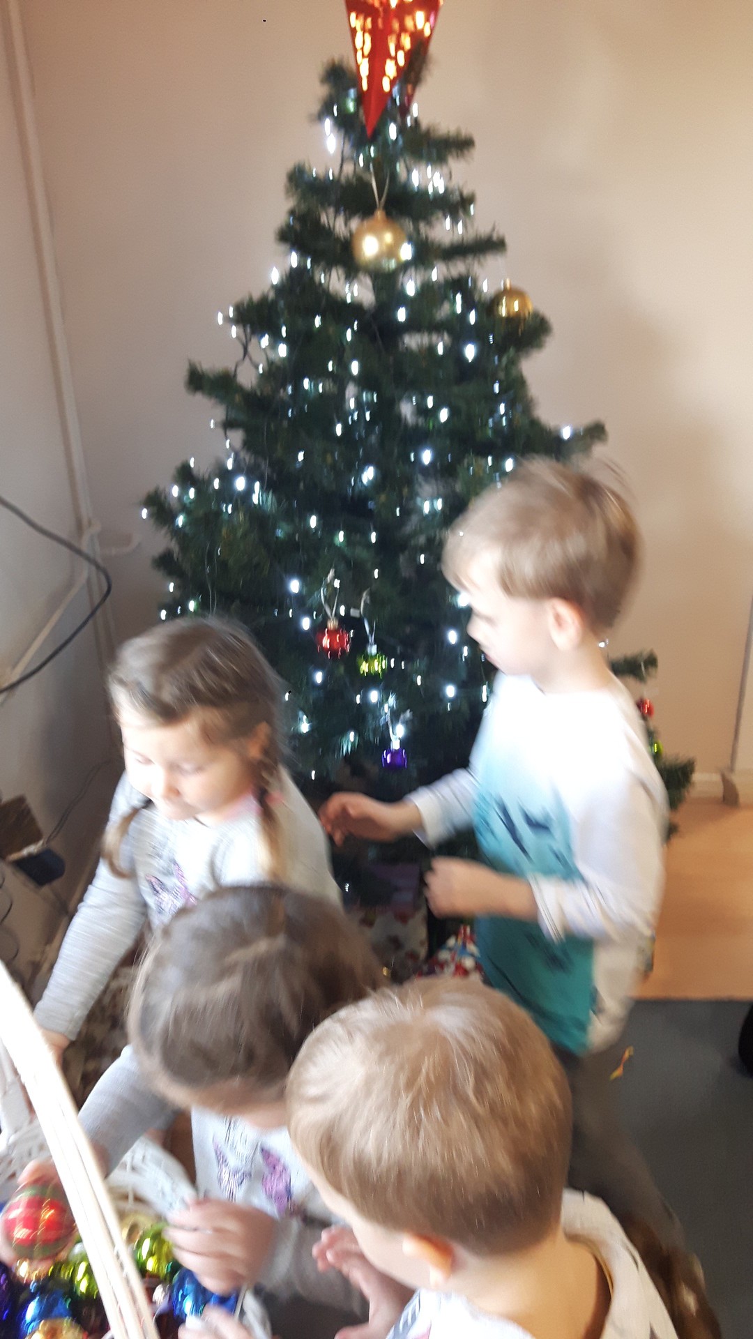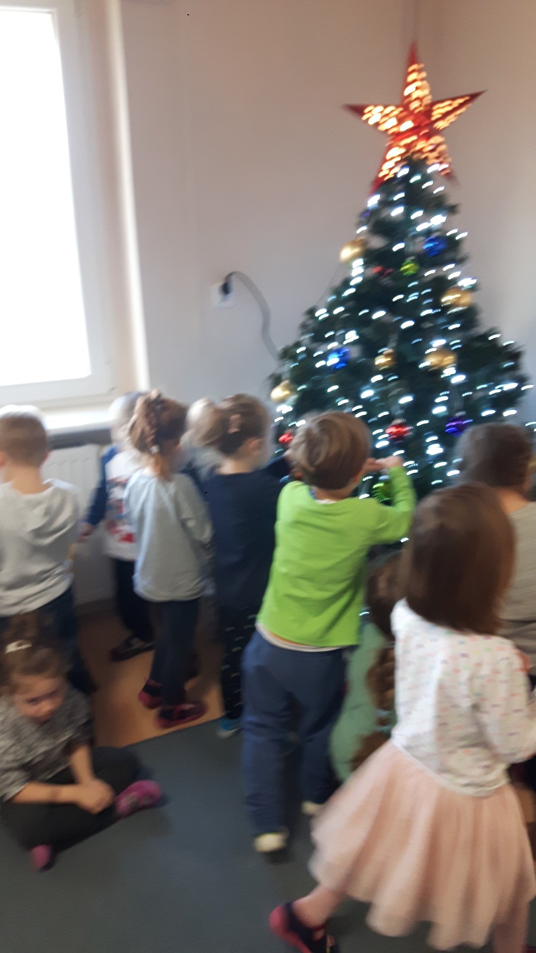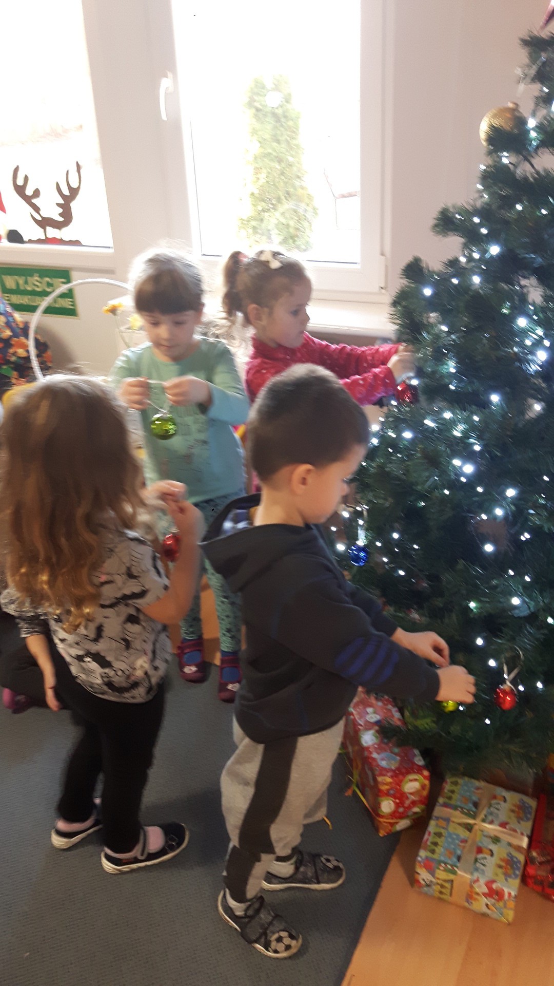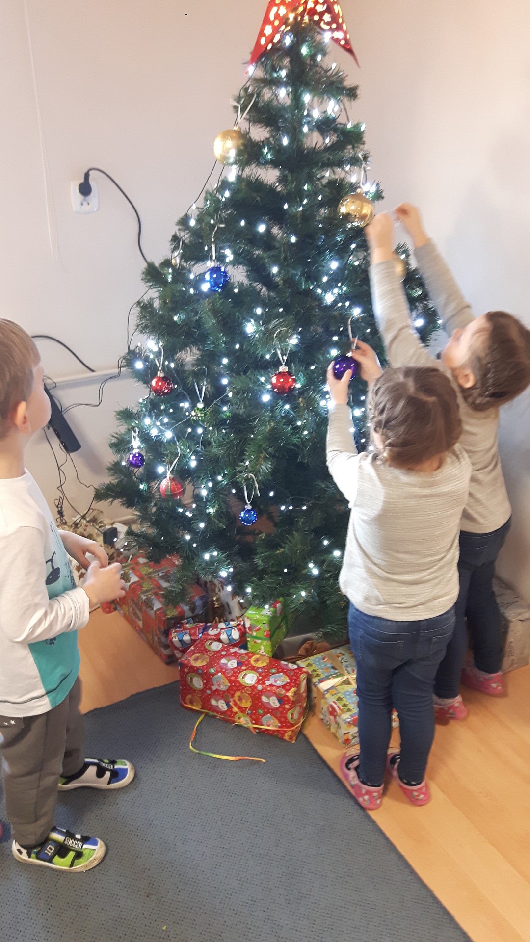 W naszym przedszkolu również nie mogło zabraknąć tego rytuału. Tuż przed Mikołajkami długo oczekiwanego dnia przedszkolaki z wielkim zapałem zabrały się do ubierania choinki. Zawieszały bombki, gwiazdki, łańcuchy kolorowe światełka. Choinka wyglądała prześlicznie.