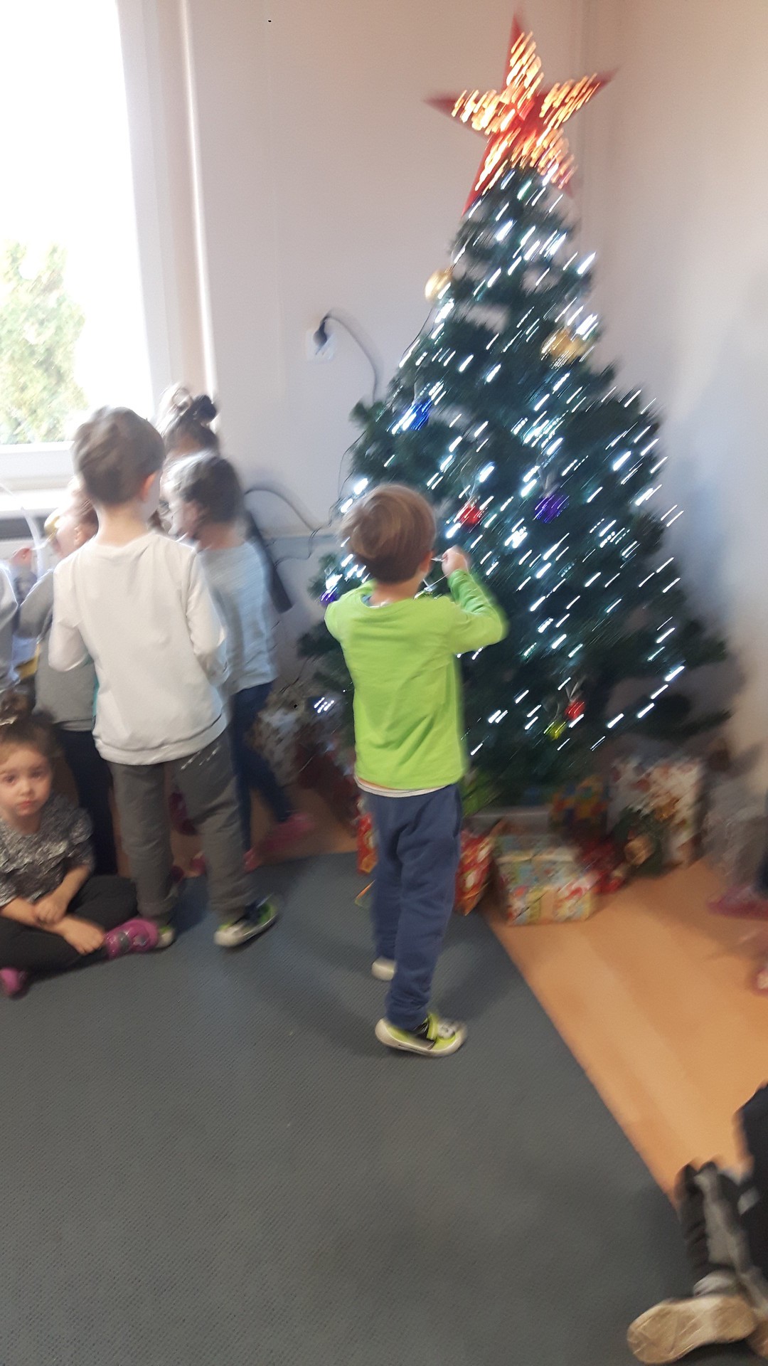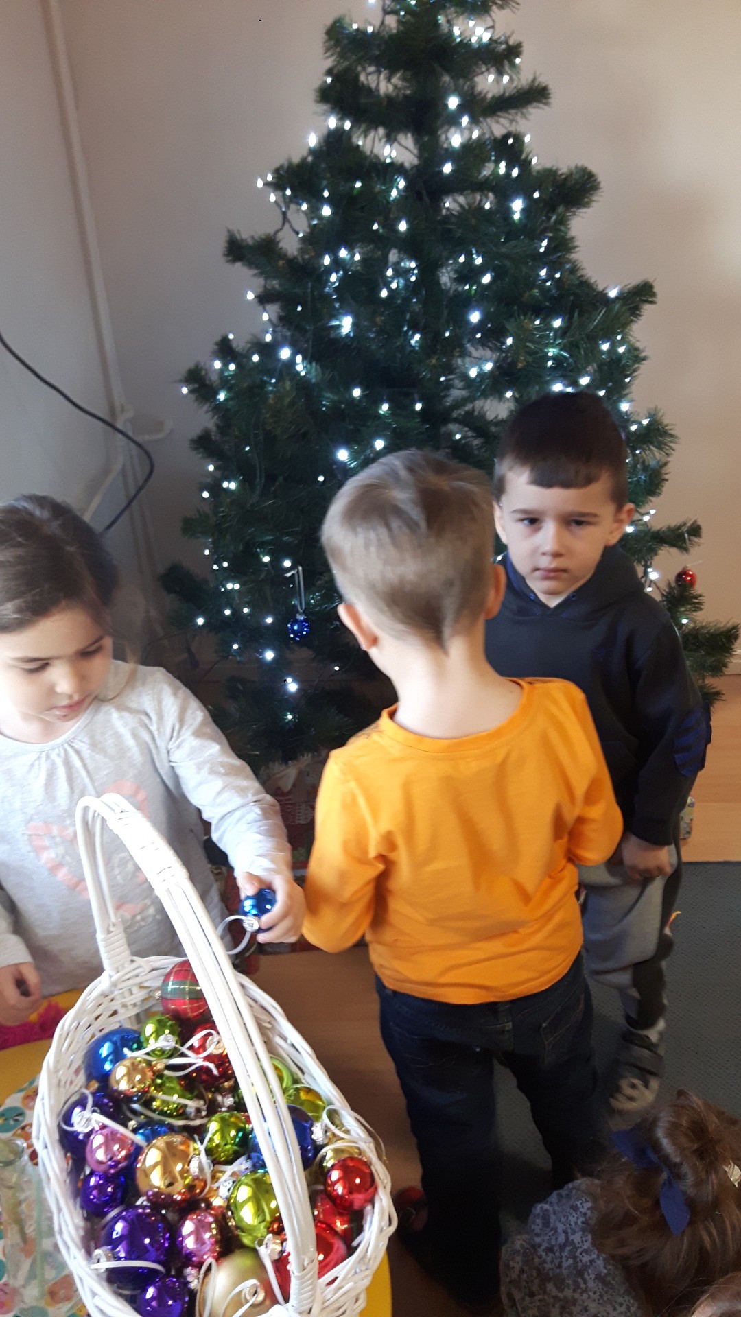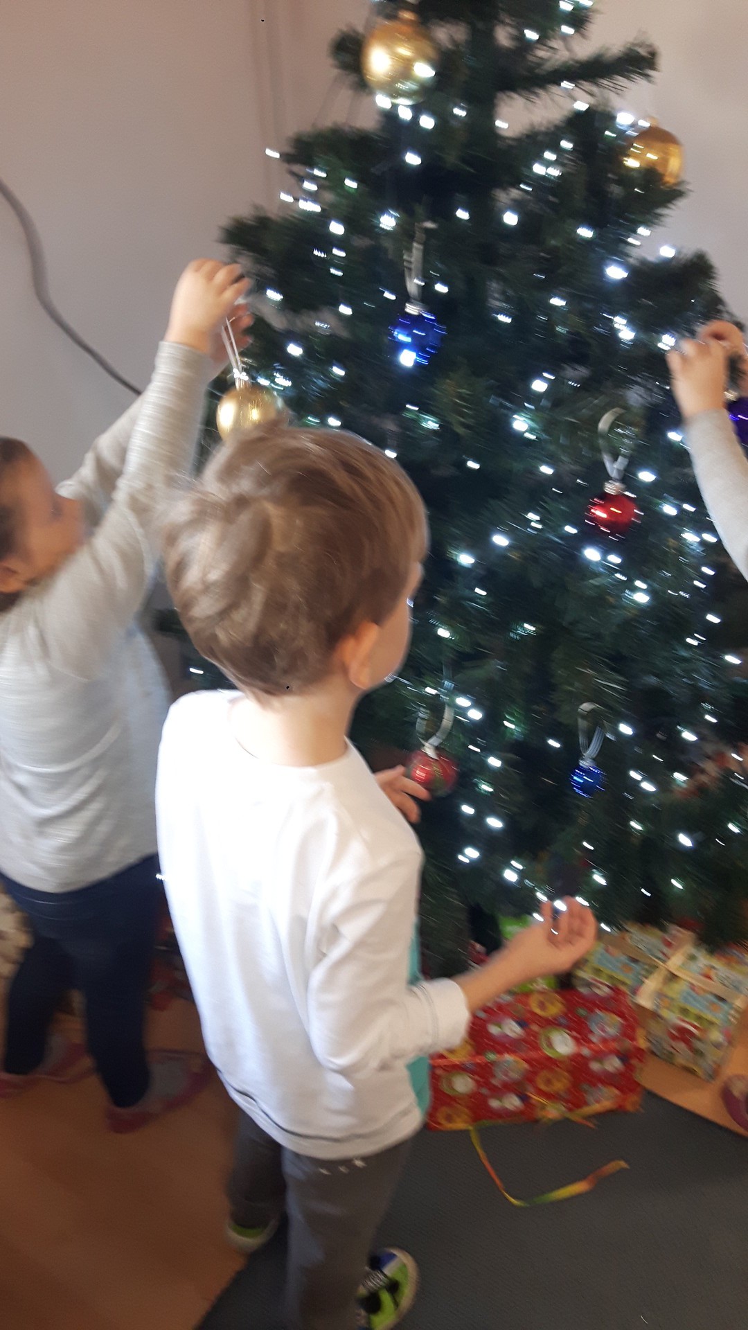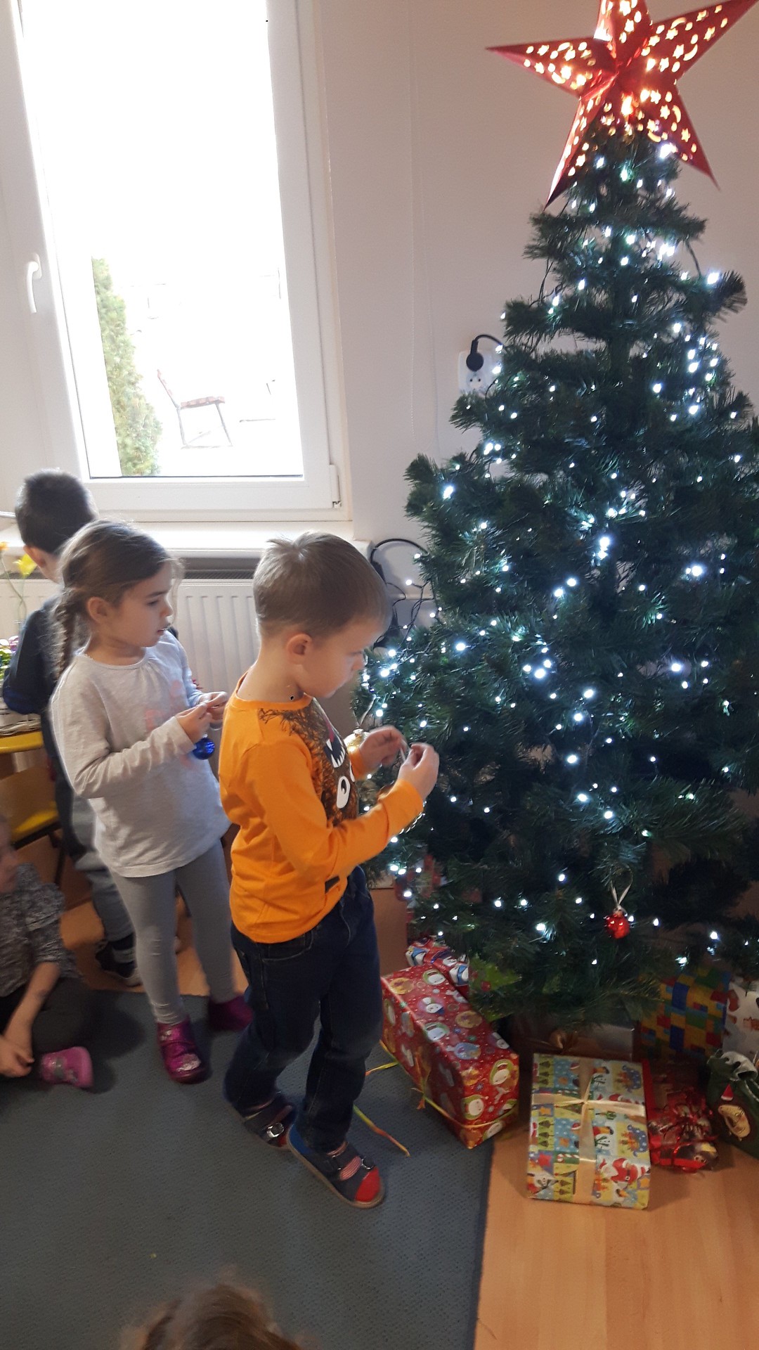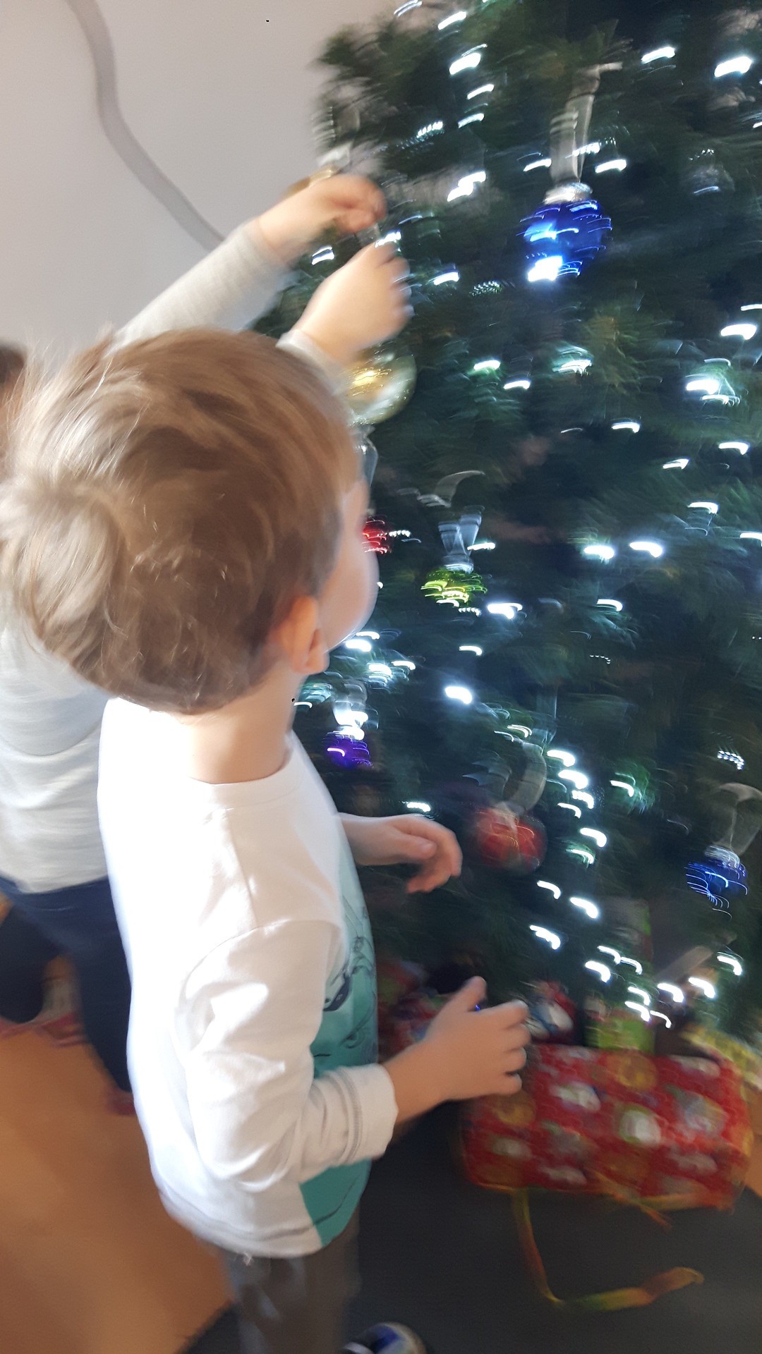 W naszym przedszkolu również nie mogło zabraknąć tego rytuału. Tuż przed Mikołajkami długo oczekiwanego dnia przedszkolaki z wielkim zapałem zabrały się do ubierania choinki. Zawieszały bombki, gwiazdki, łańcuchy kolorowe światełka. Choinka wyglądała prześlicznie.