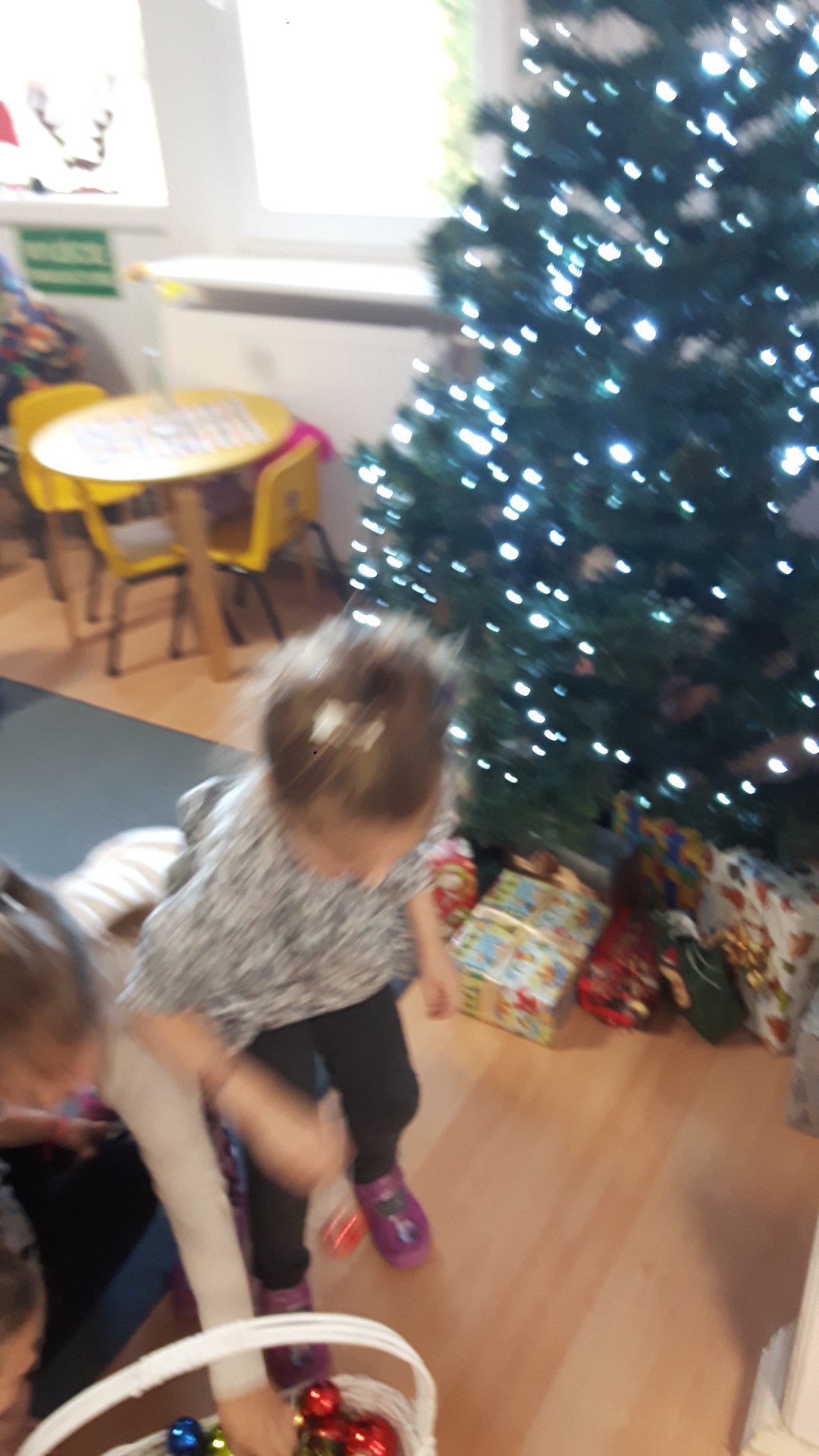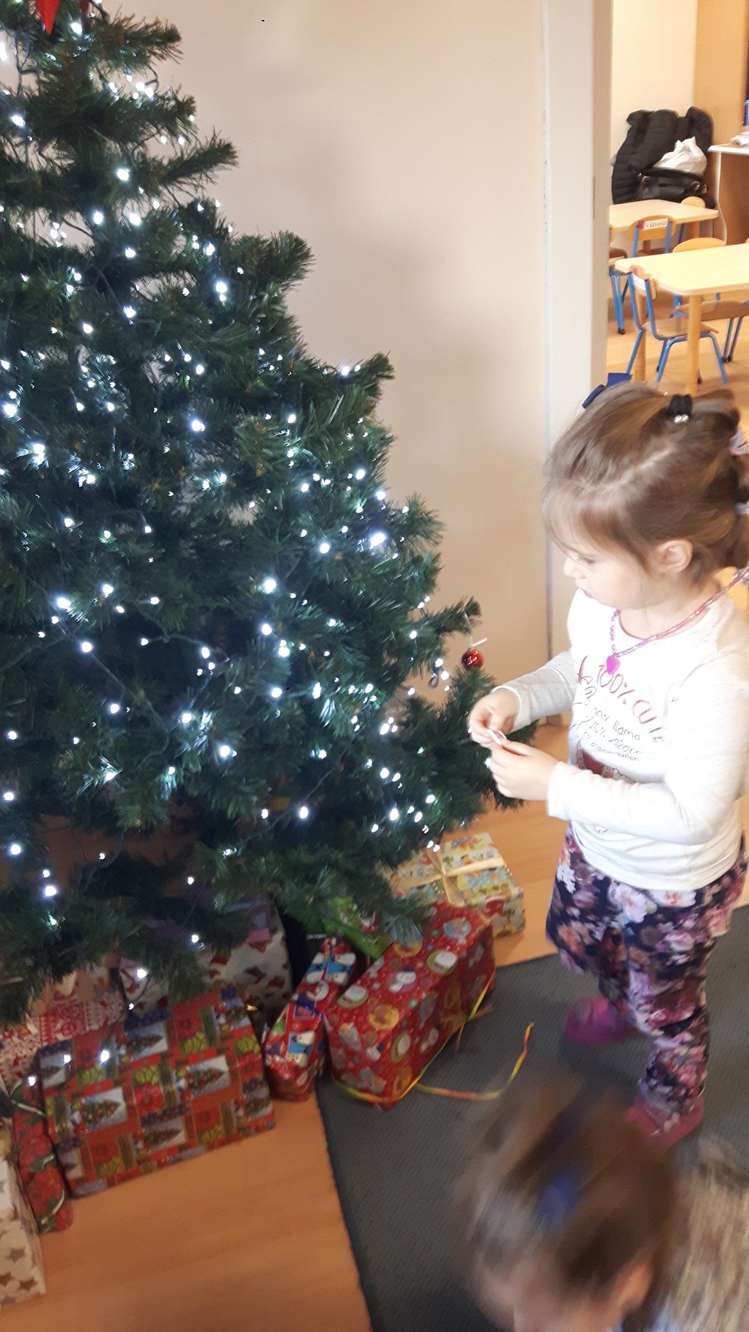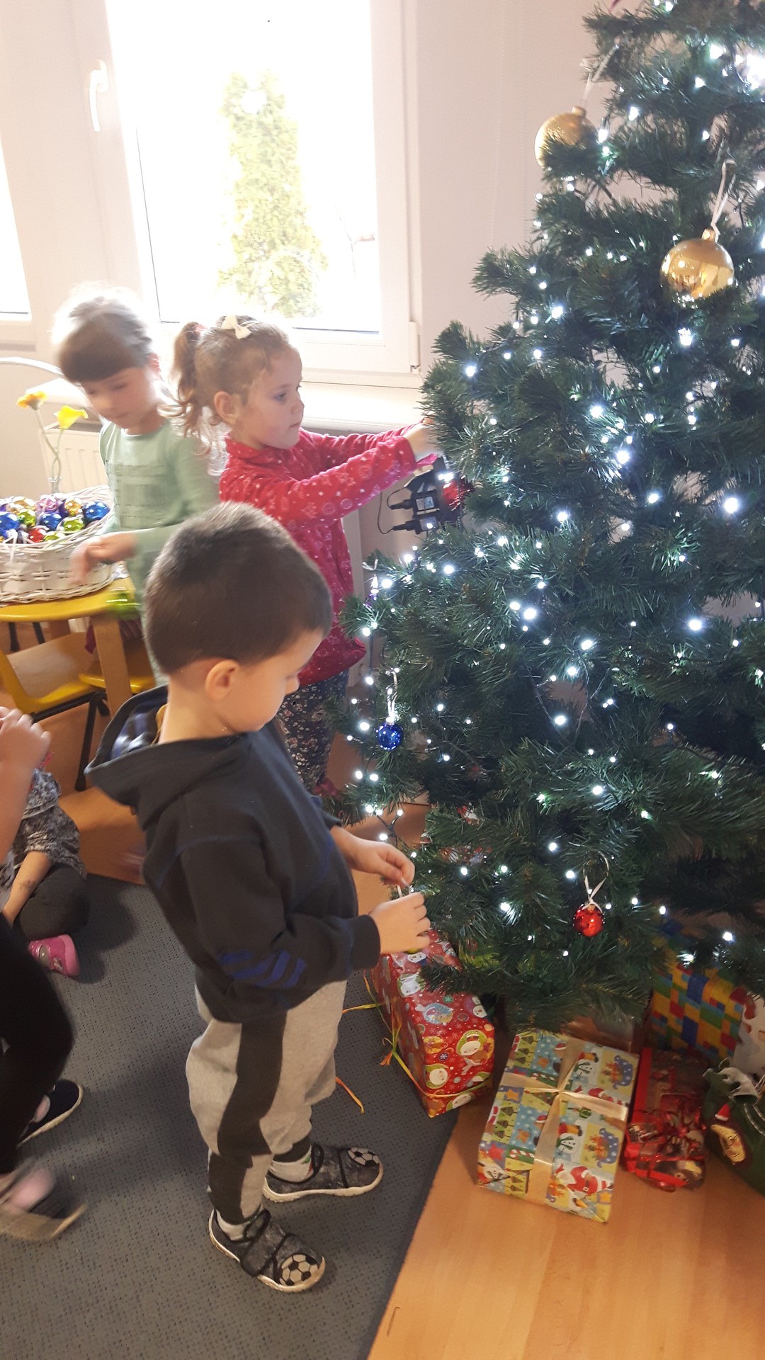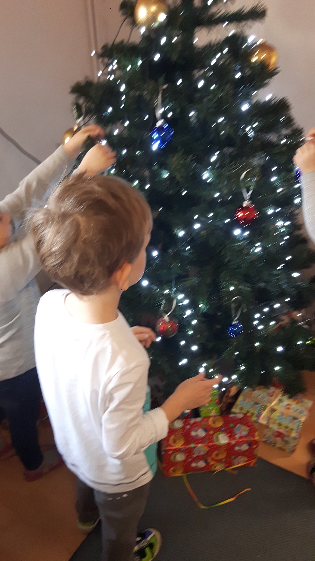 W naszym przedszkolu również nie mogło zabraknąć tego rytuału. Tuż przed Mikołajkami długo oczekiwanego dnia przedszkolaki z wielkim zapałem zabrały się do ubierania choinki. Zawieszały bombki, gwiazdki, łańcuchy kolorowe światełka. Choinka wyglądała prześlicznie.