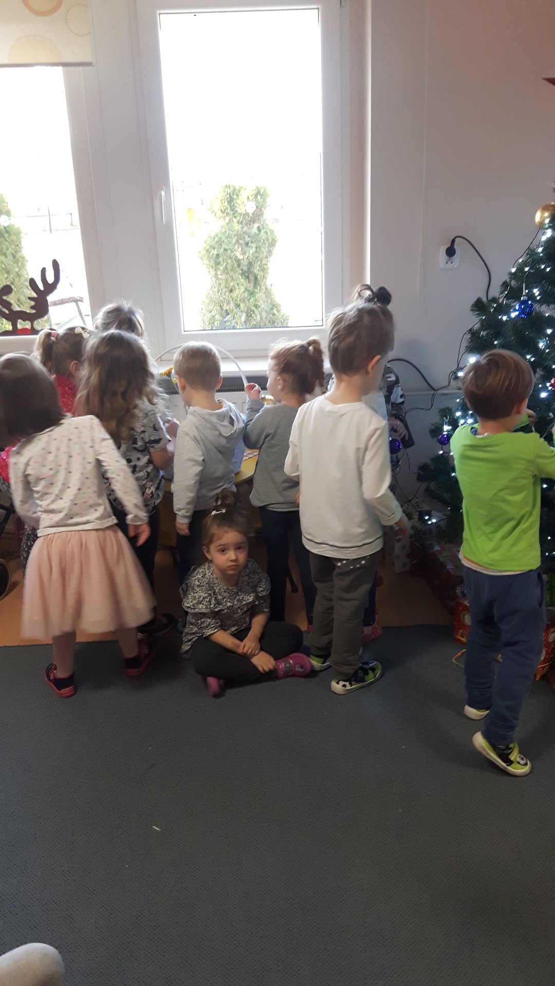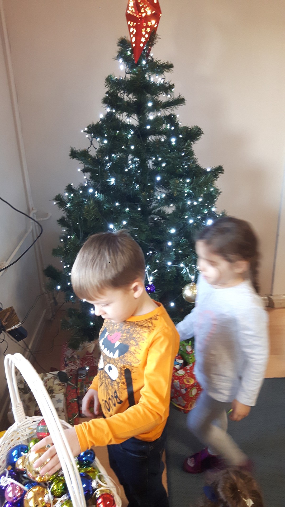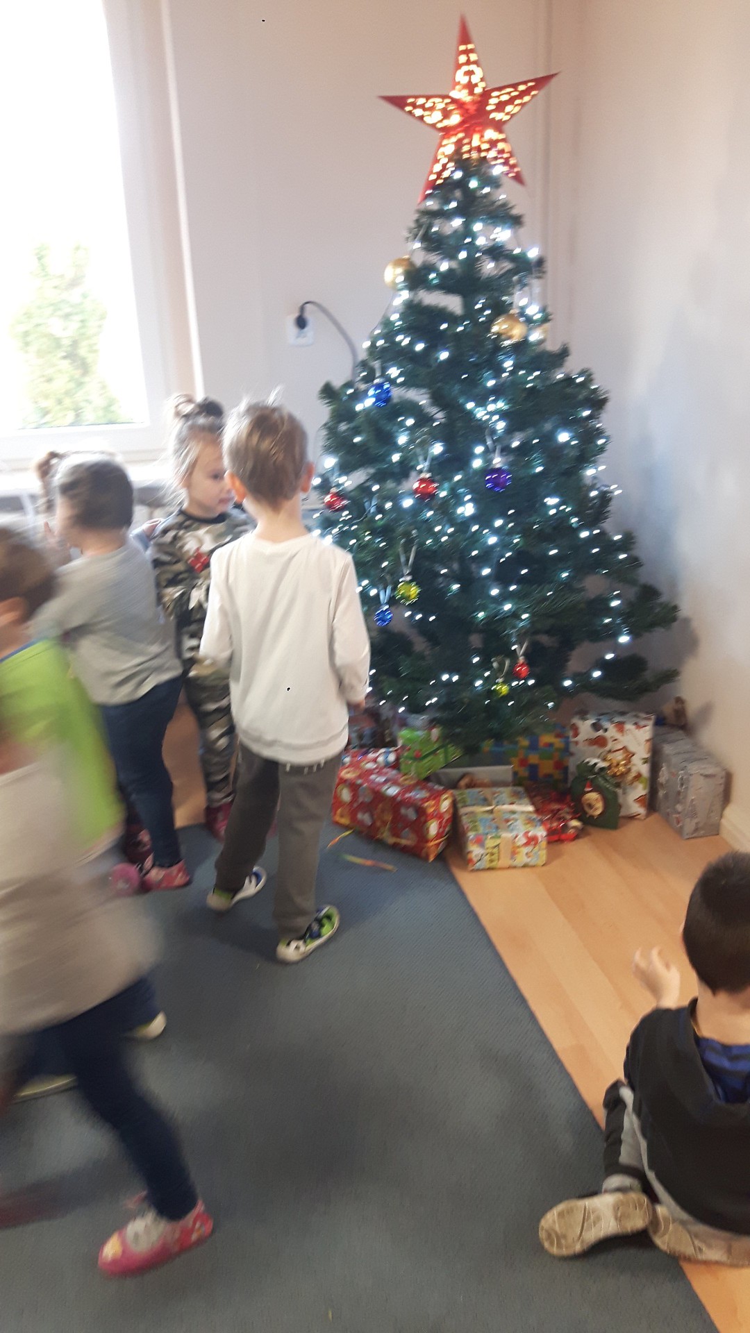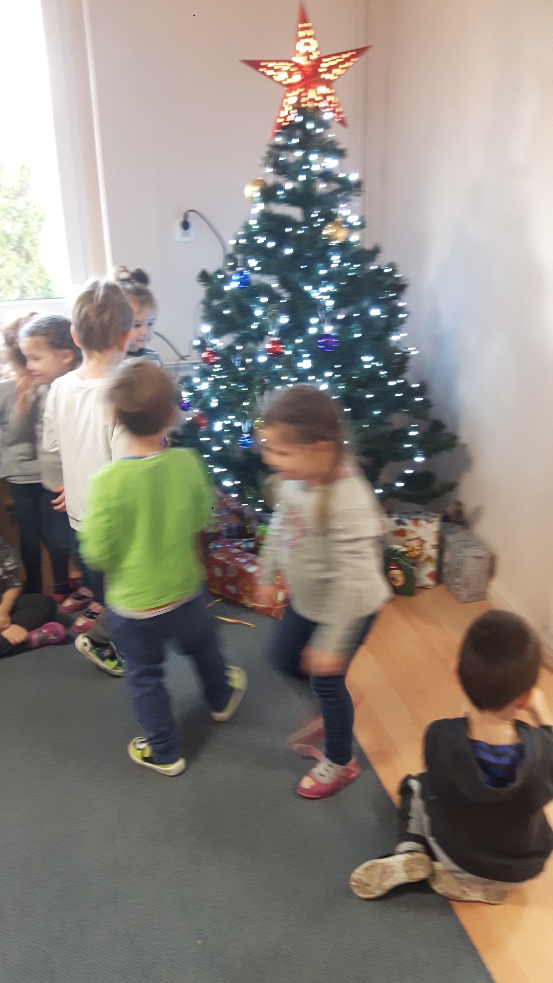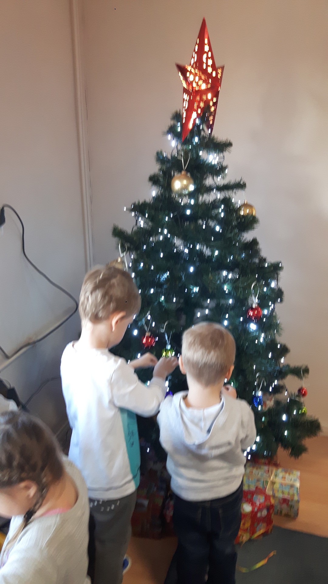 W naszym przedszkolu również nie mogło zabraknąć tego rytuału. Tuż przed Mikołajkami długo oczekiwanego dnia przedszkolaki z wielkim zapałem zabrały się do ubierania choinki. Zawieszały bombki, gwiazdki, łańcuchy kolorowe światełka. Choinka wyglądała prześlicznie.