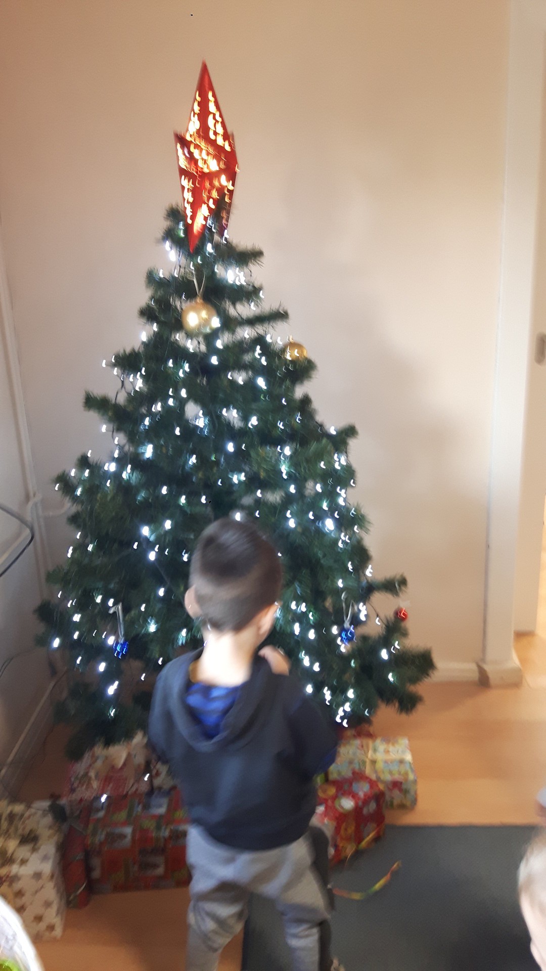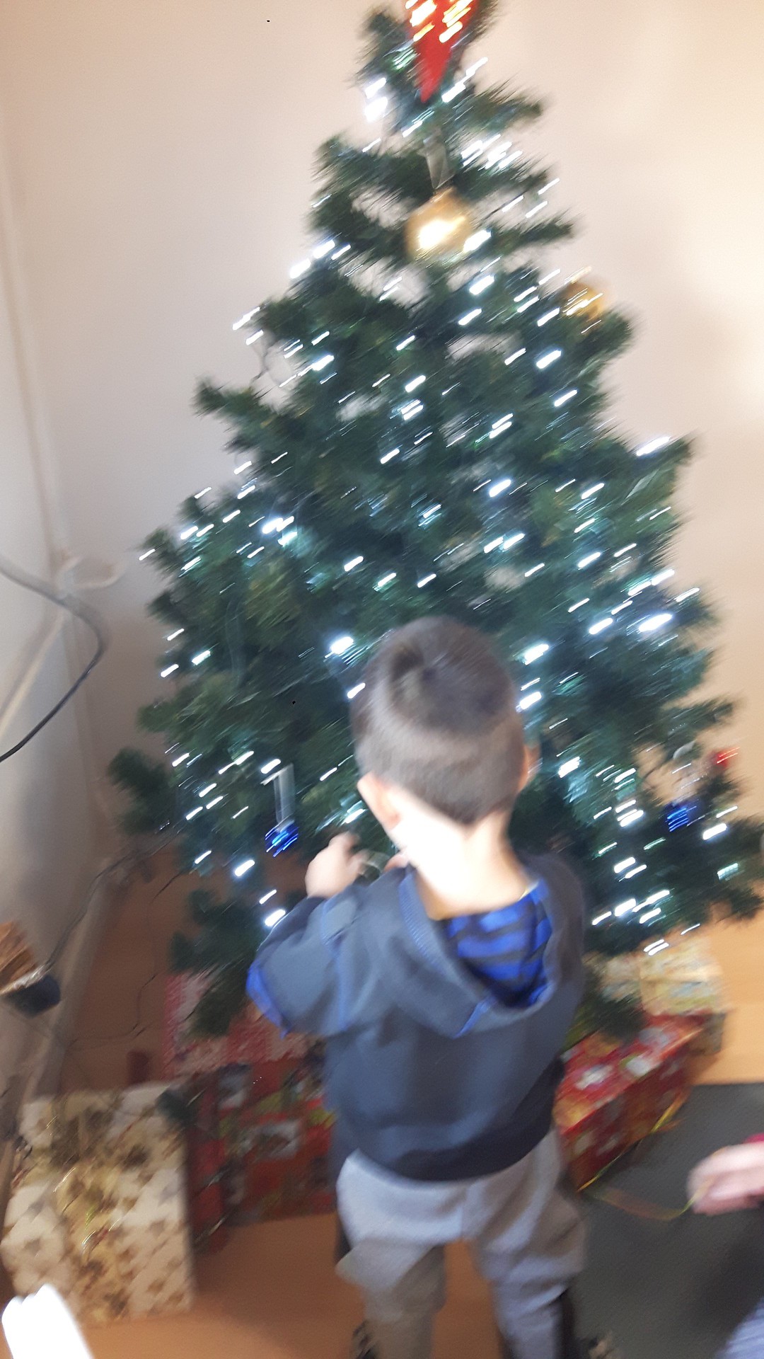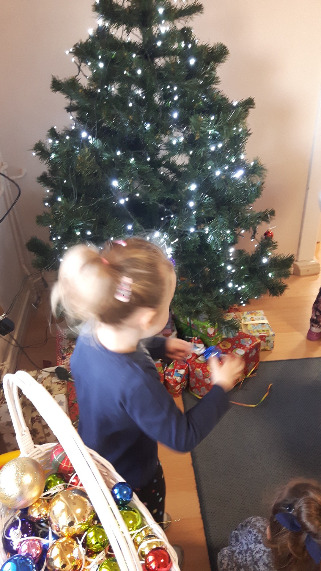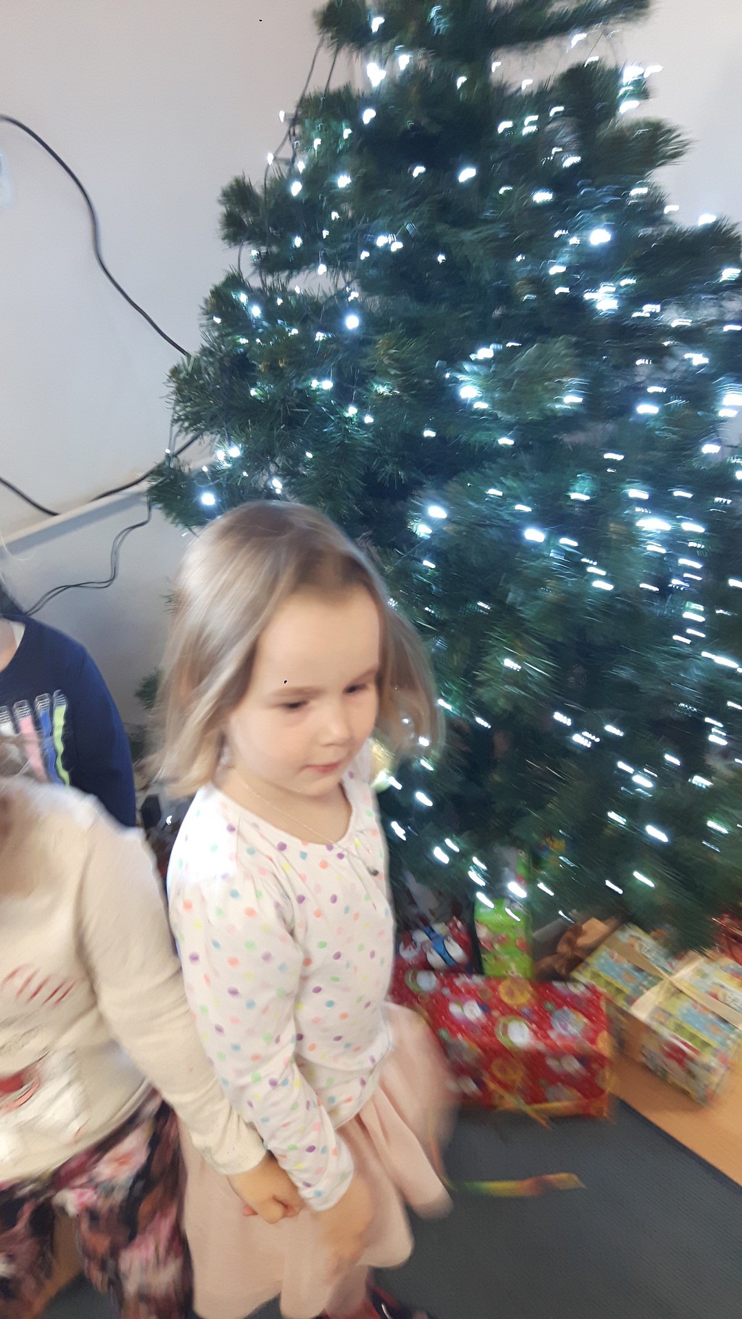 W naszym przedszkolu również nie mogło zabraknąć tego rytuału. Tuż przed Mikołajkami długo oczekiwanego dnia przedszkolaki z wielkim zapałem zabrały się do ubierania choinki. Zawieszały bombki, gwiazdki, łańcuchy kolorowe światełka. Choinka wyglądała prześlicznie.