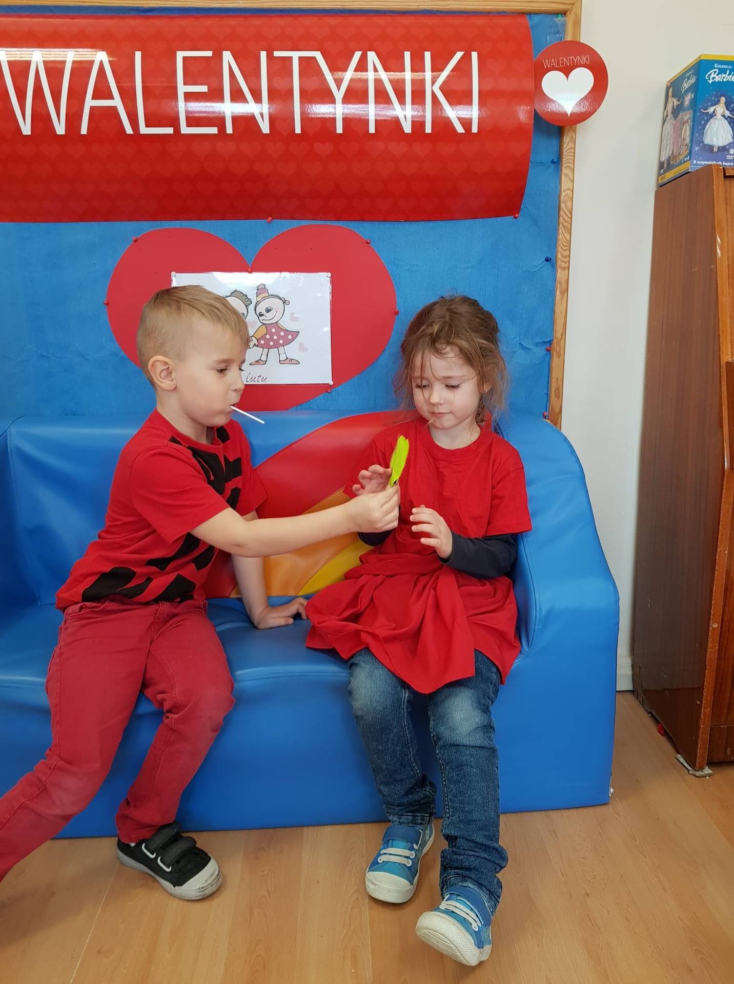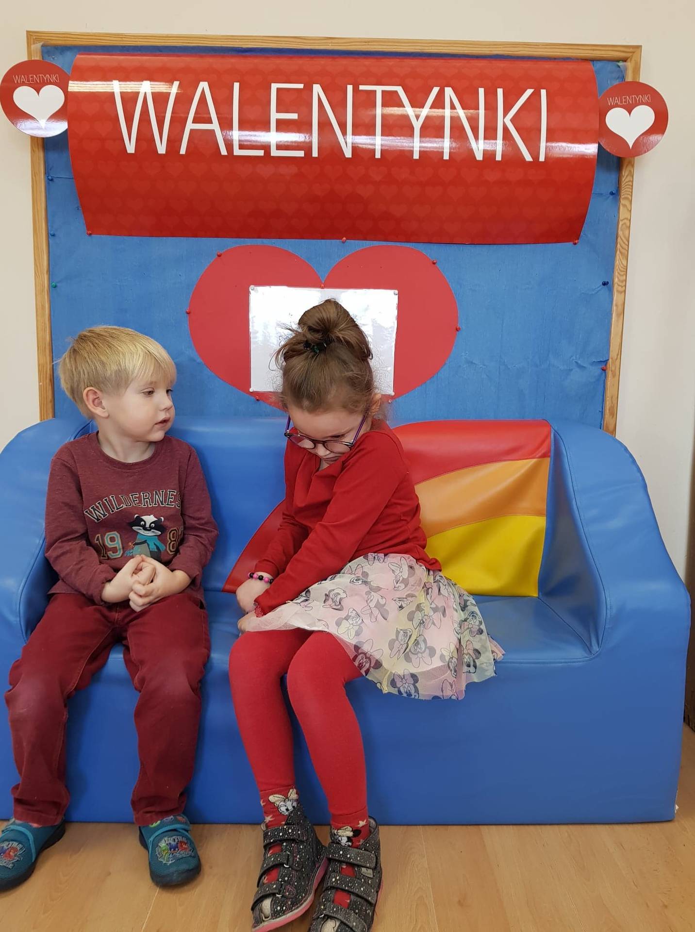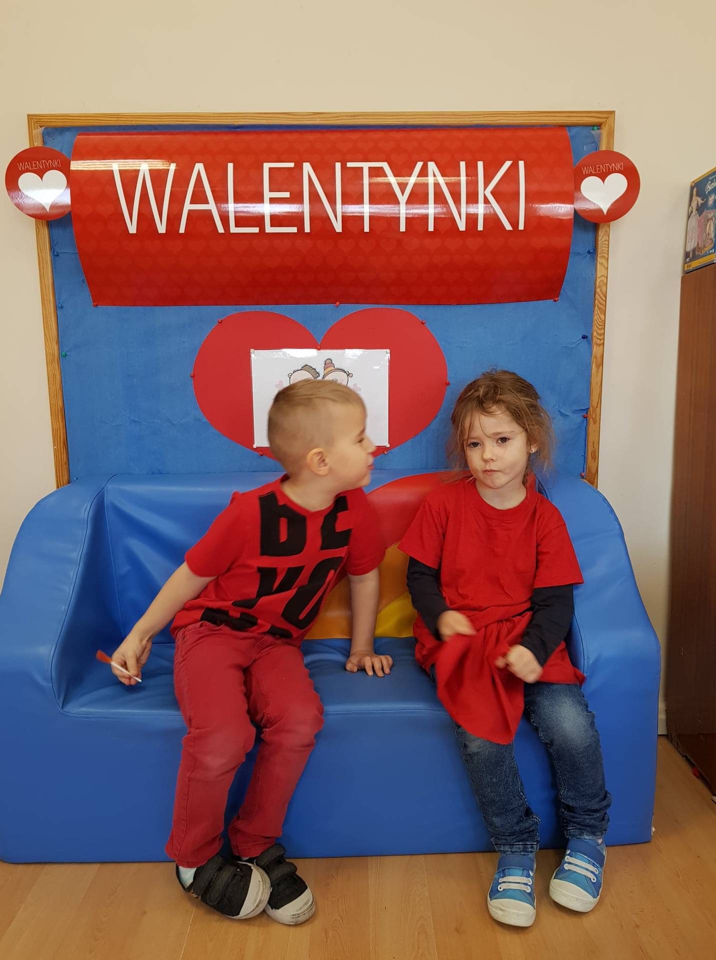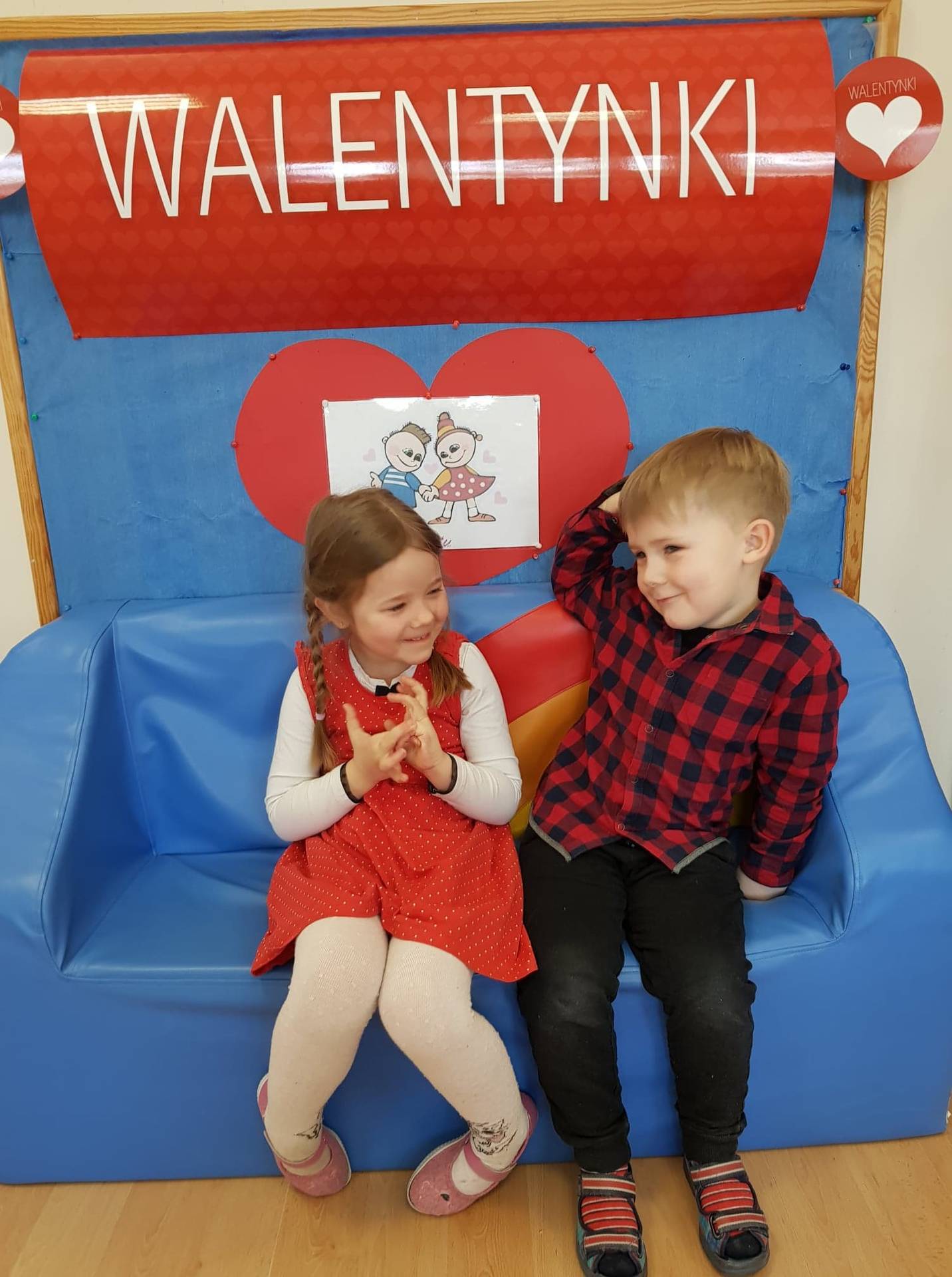 Zadaniem dzieci było samodzielnie dobrać się w pary i na "ławeczce zakochanych" powiedzieć drugiej osobie coś miłego. Stąd na niektórych twarzach zawstydzenie.......