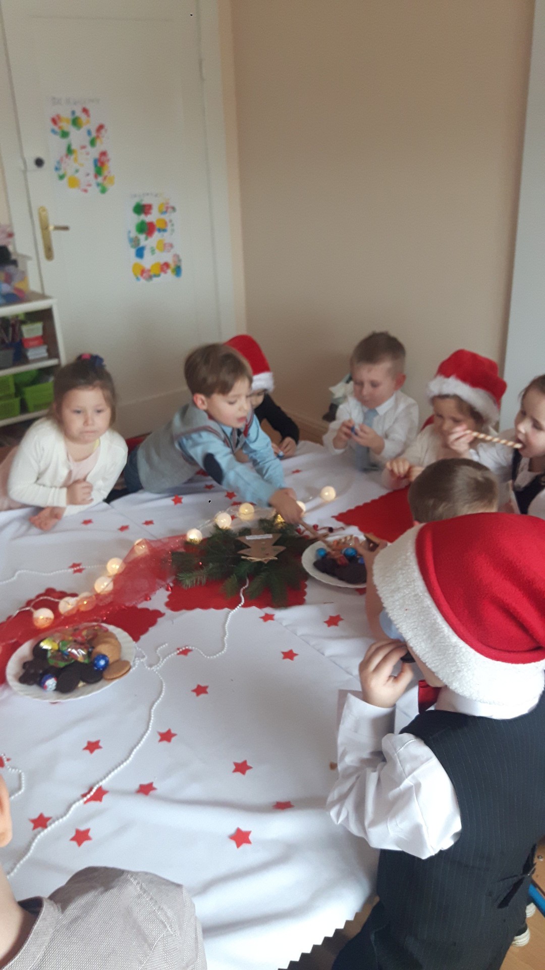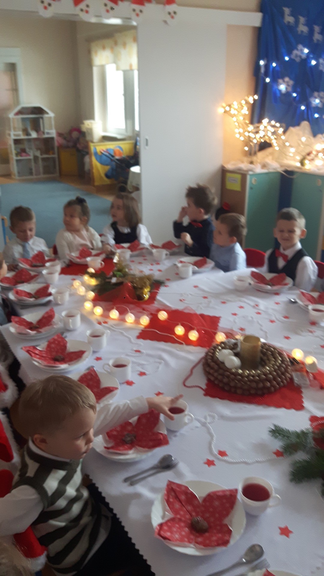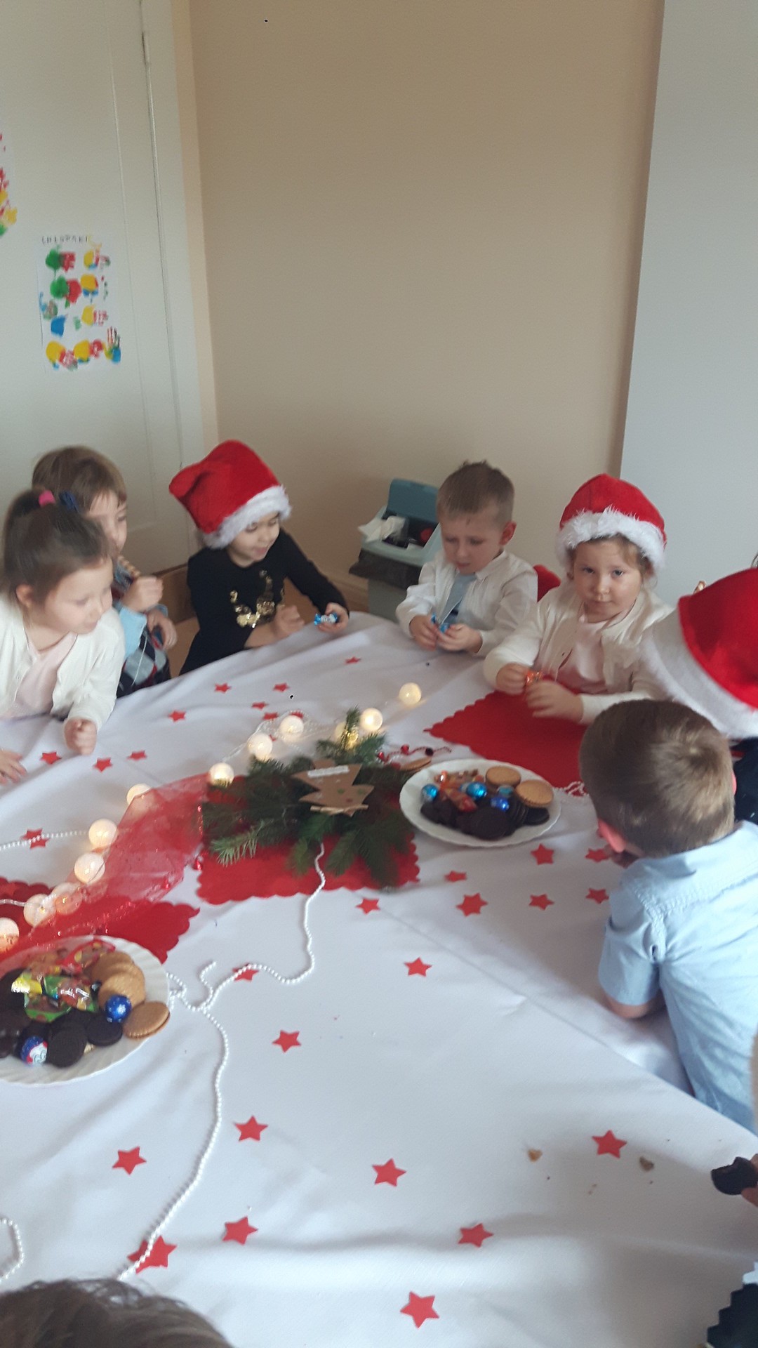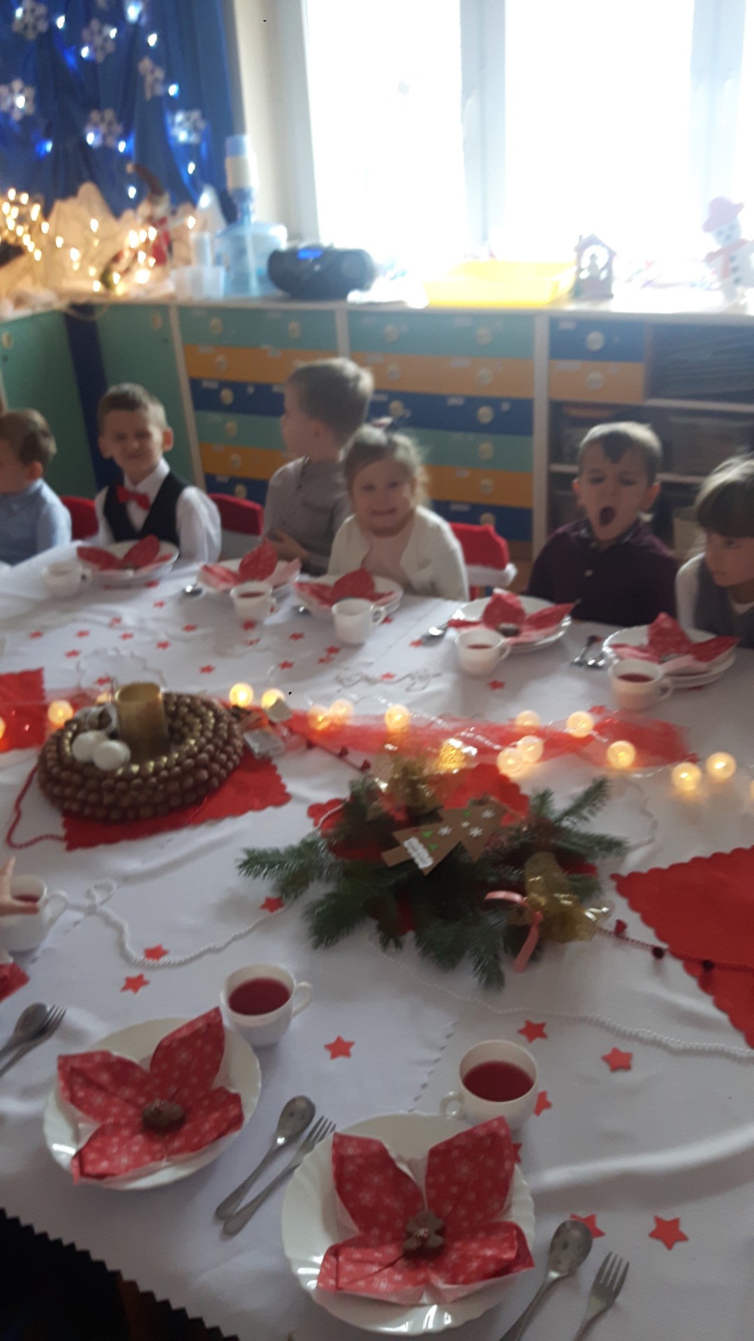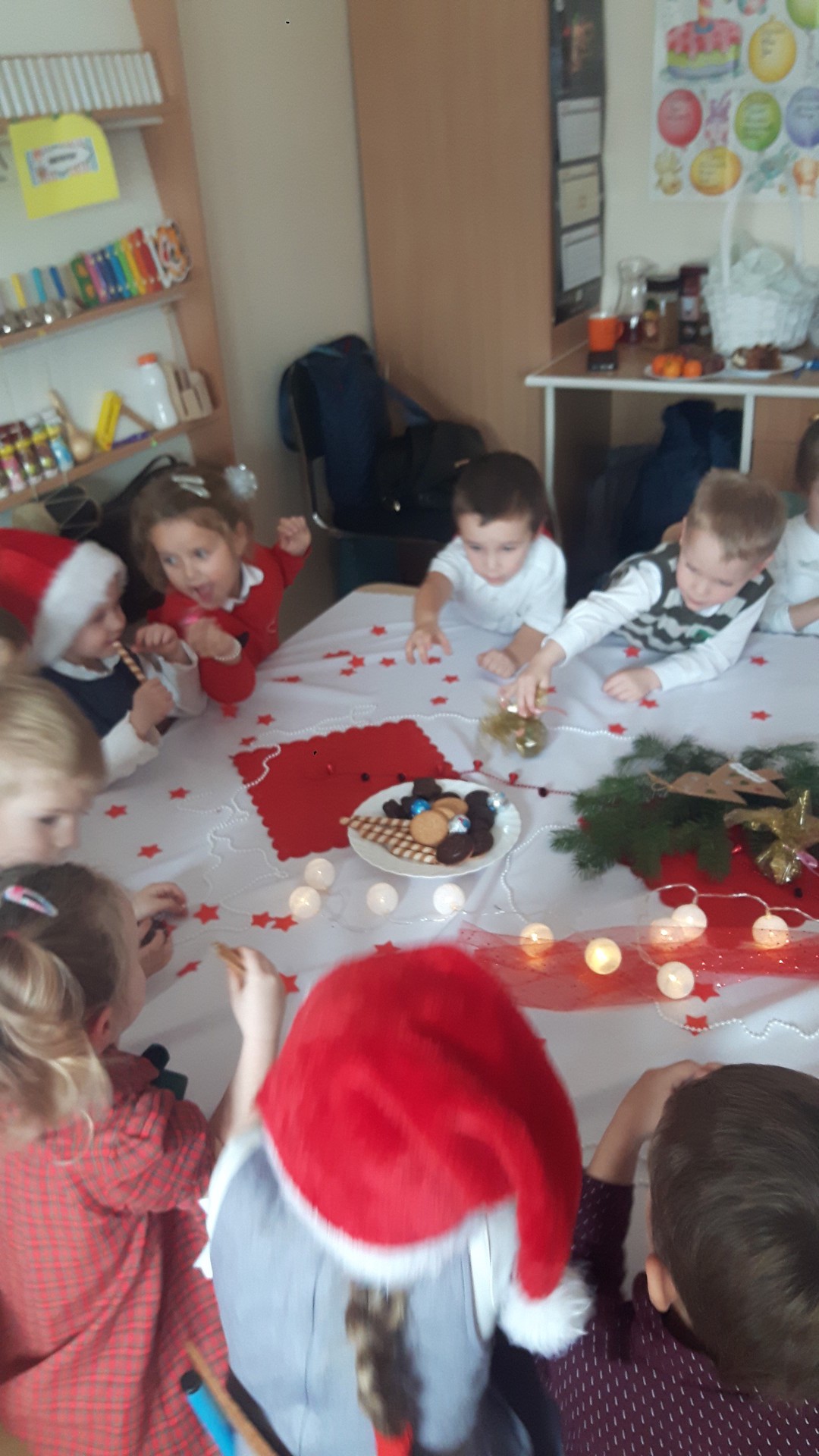 Wigilia Bożego Narodzenia to jeden z najpiękniejszych dni w roku, dlatego w naszej przedszkolnej rodzinie przeżywamy go bardzo uroczyście. Nasza przedszkolna wigilia odbyła się w piątek. Na początku dzieci zjadły wspólny posiłek. W dalszej części uroczystości dzieci odwiedził Mikołaj wraz z Elfem.Dzieliliśmy się również opłatkiem życząc sobie nawzajem wszelkiej pomyślności i Wesołych Świąt. Nasze spotkanie zakończyło się wspólnym kolędowaniem przy wigilijnym stole.