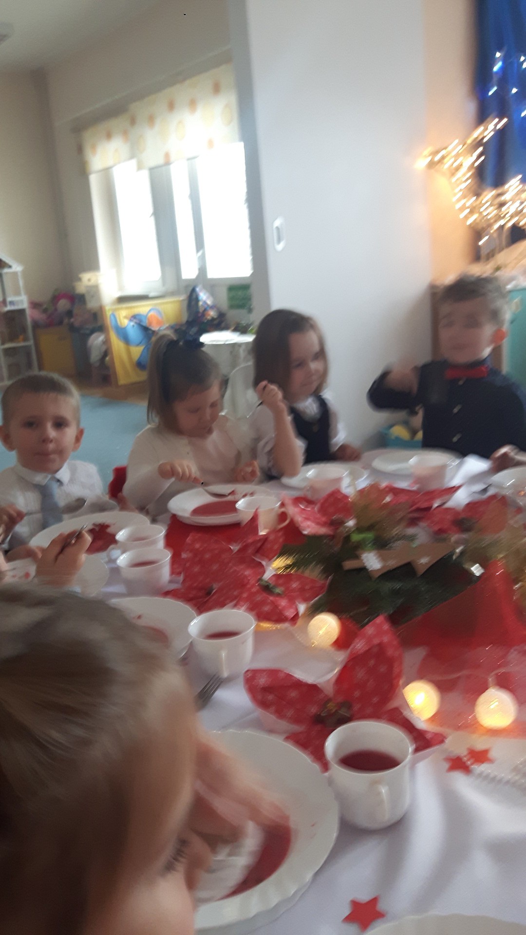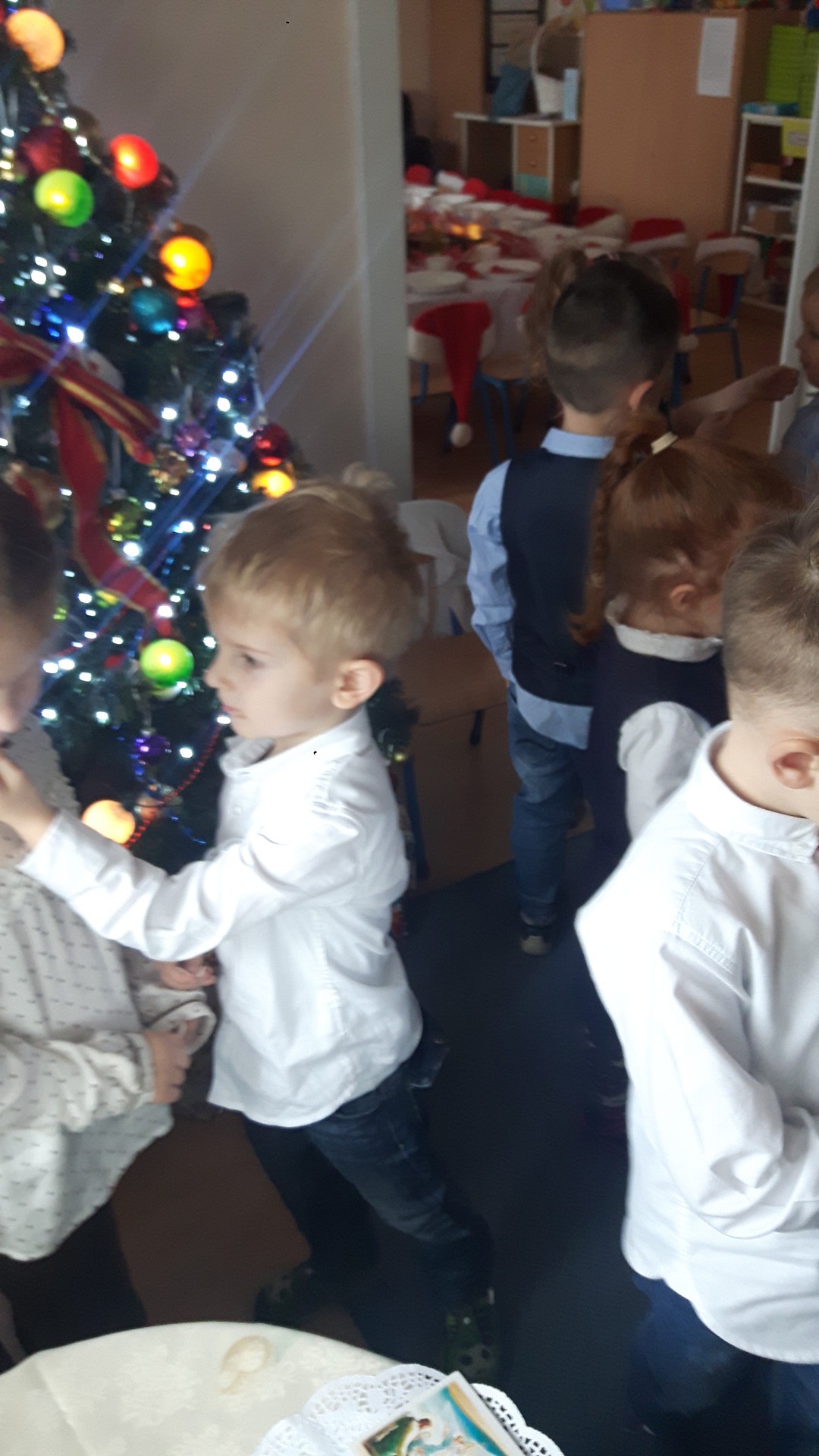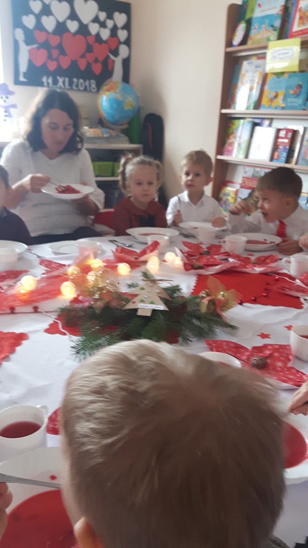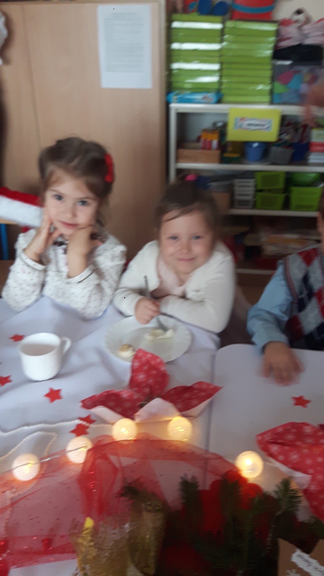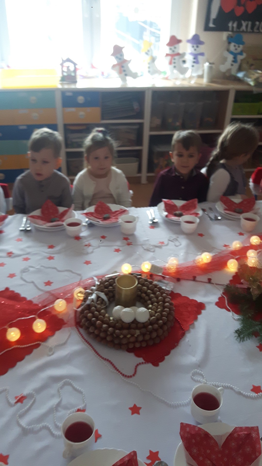Wigilia Bożego Narodzenia to jeden z najpiękniejszych dni w roku, dlatego w naszej przedszkolnej rodzinie przeżywamy go bardzo uroczyście. Nasza przedszkolna wigilia odbyła się w piątek. Na początku dzieci zjadły wspólny posiłek. W dalszej części uroczystości dzieci odwiedził Mikołaj wraz z Elfem.Dzieliliśmy się również opłatkiem życząc sobie nawzajem wszelkiej pomyślności i Wesołych Świąt. Nasze spotkanie zakończyło się wspólnym kolędowaniem przy wigilijnym stole.