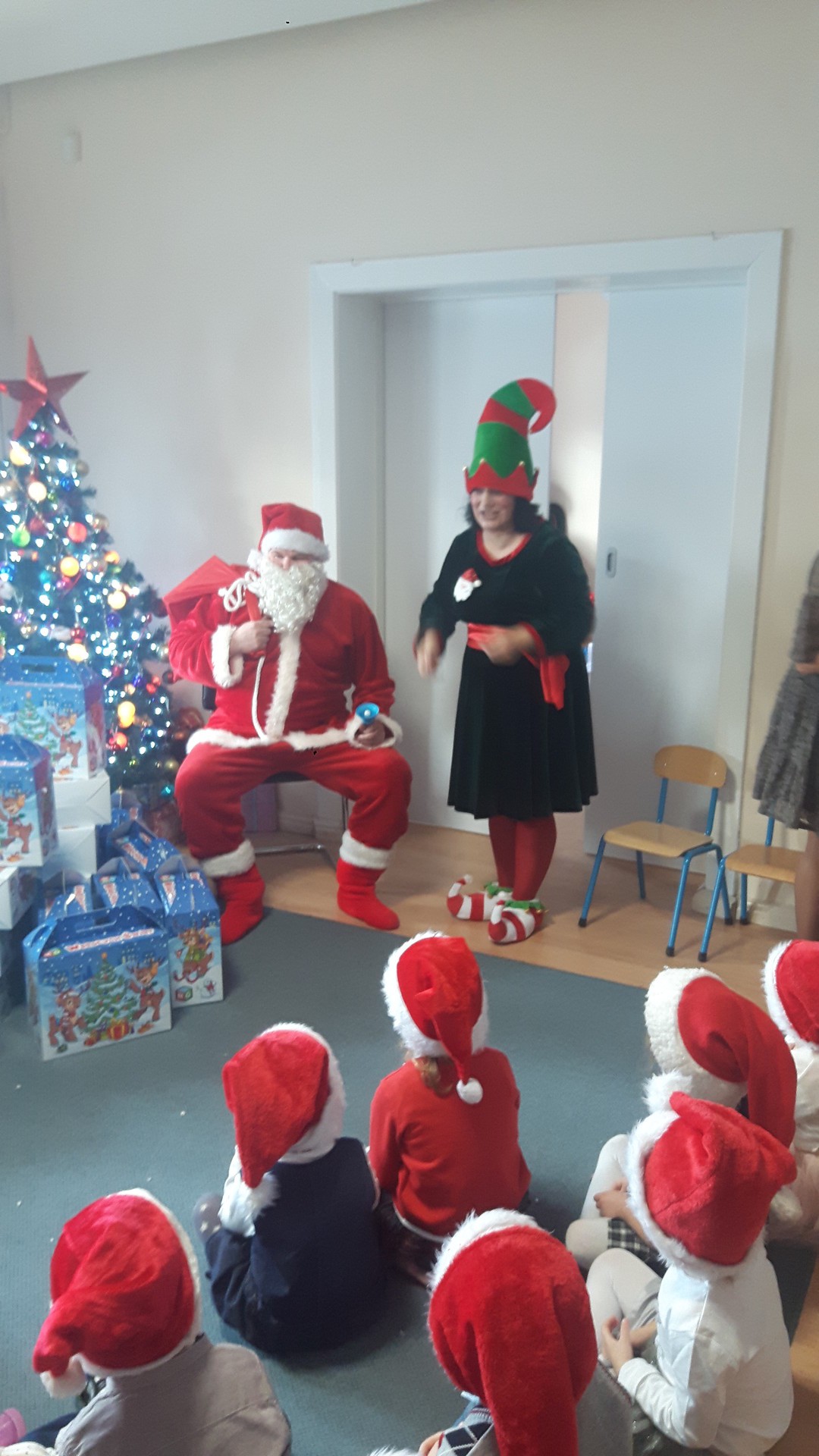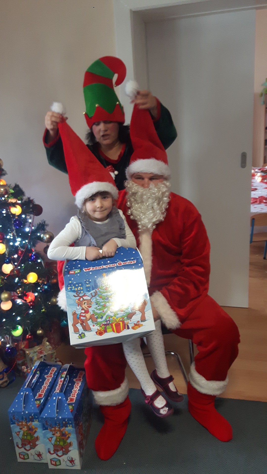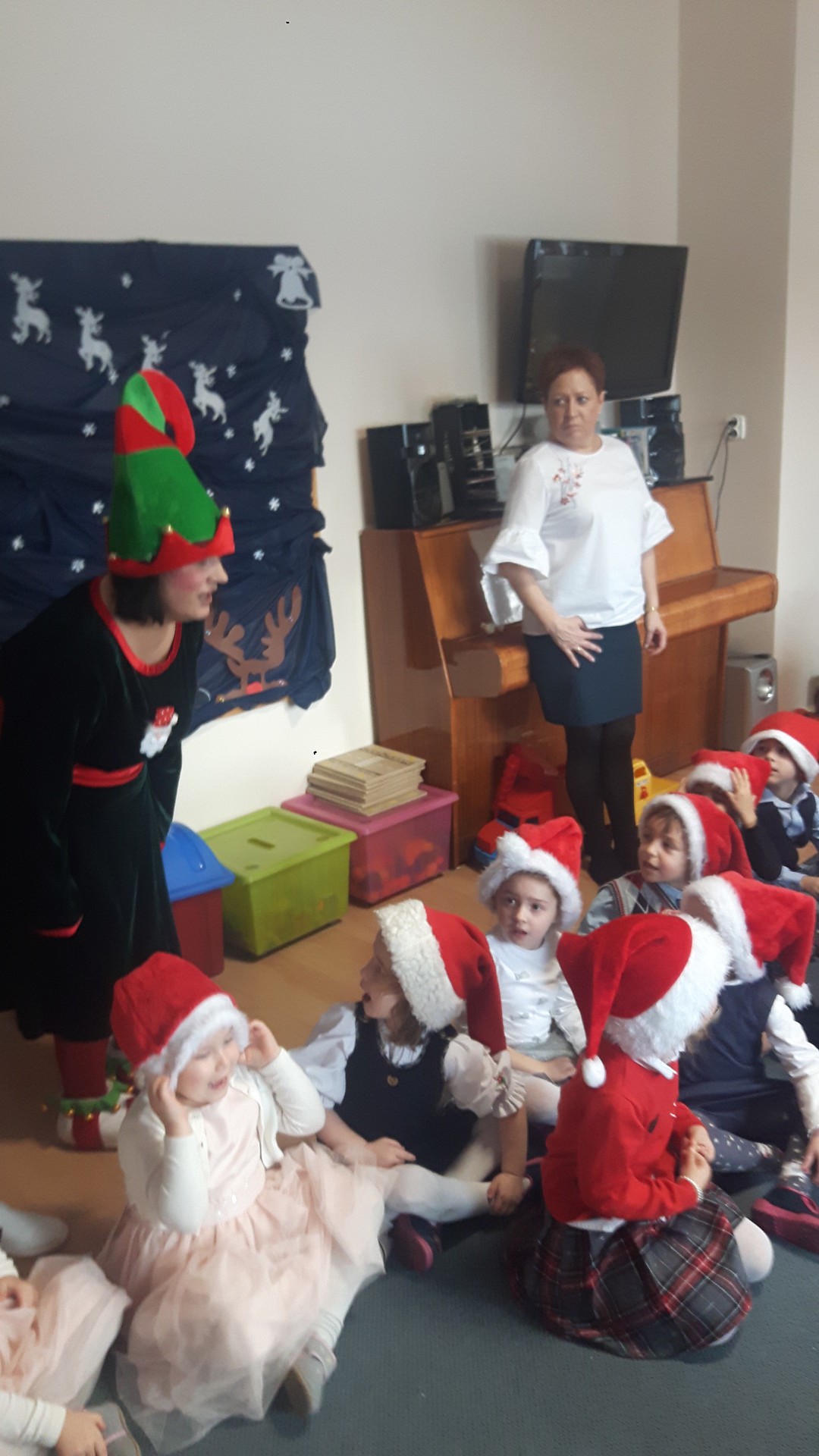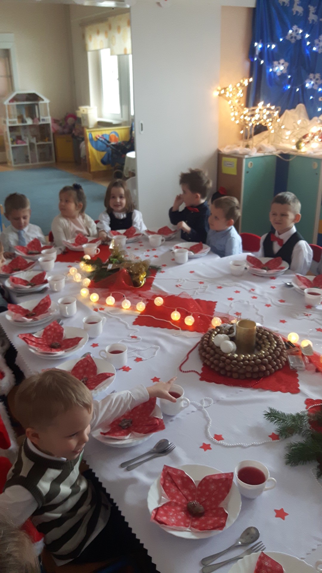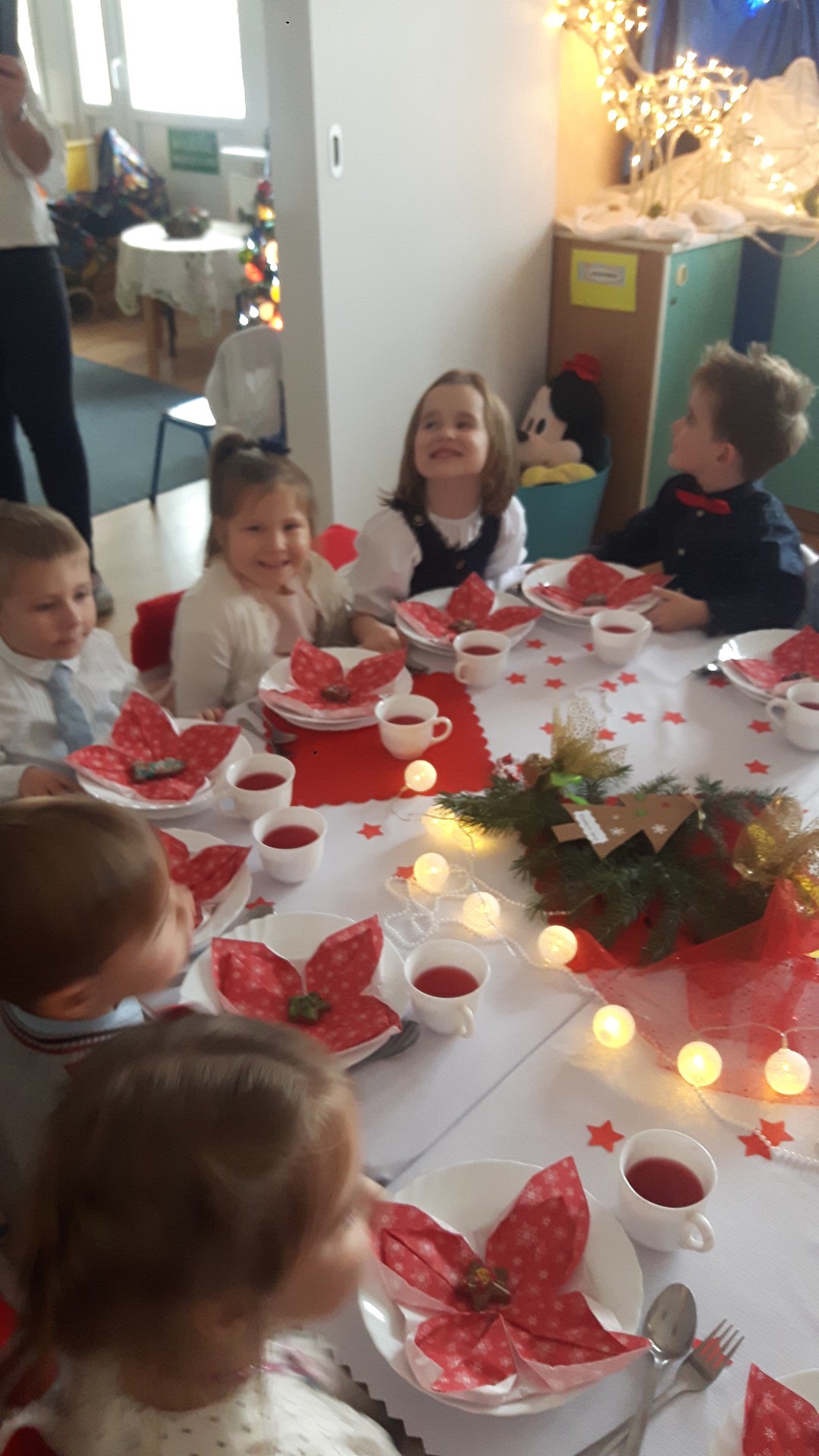 Wigilia Bożego Narodzenia to jeden z najpiękniejszych dni w roku, dlatego w naszej przedszkolnej rodzinie przeżywamy go bardzo uroczyście. Nasza przedszkolna wigilia odbyła się w piątek. Na początku dzieci zjadły wspólny posiłek. W dalszej części uroczystości dzieci odwiedził Mikołaj wraz z Elfem.Dzieliliśmy się również opłatkiem życząc sobie nawzajem wszelkiej pomyślności i Wesołych Świąt. Nasze spotkanie zakończyło się wspólnym kolędowaniem przy wigilijnym stole.
