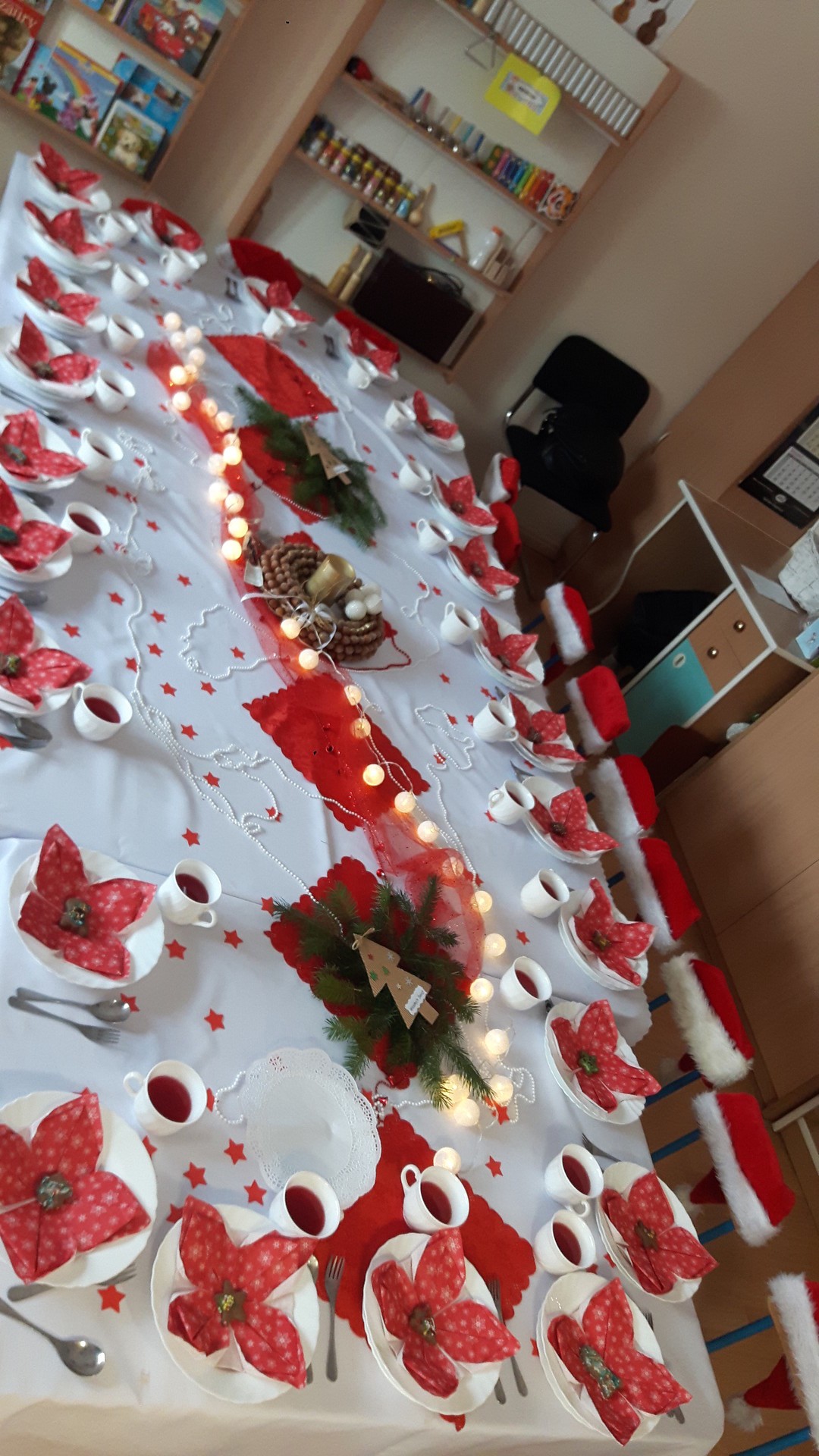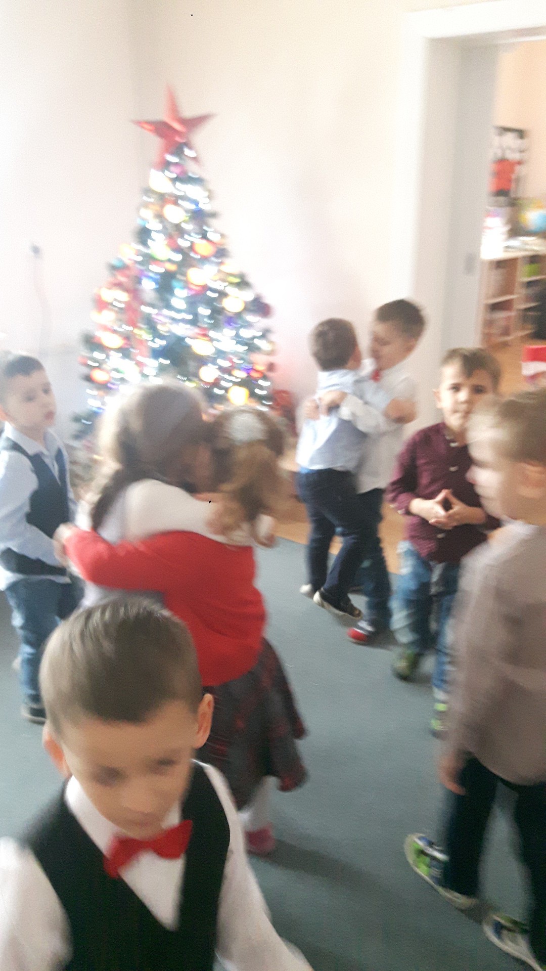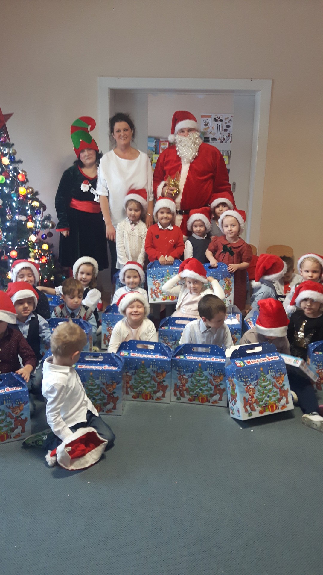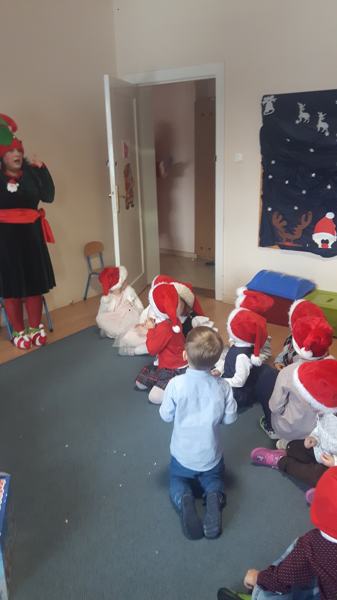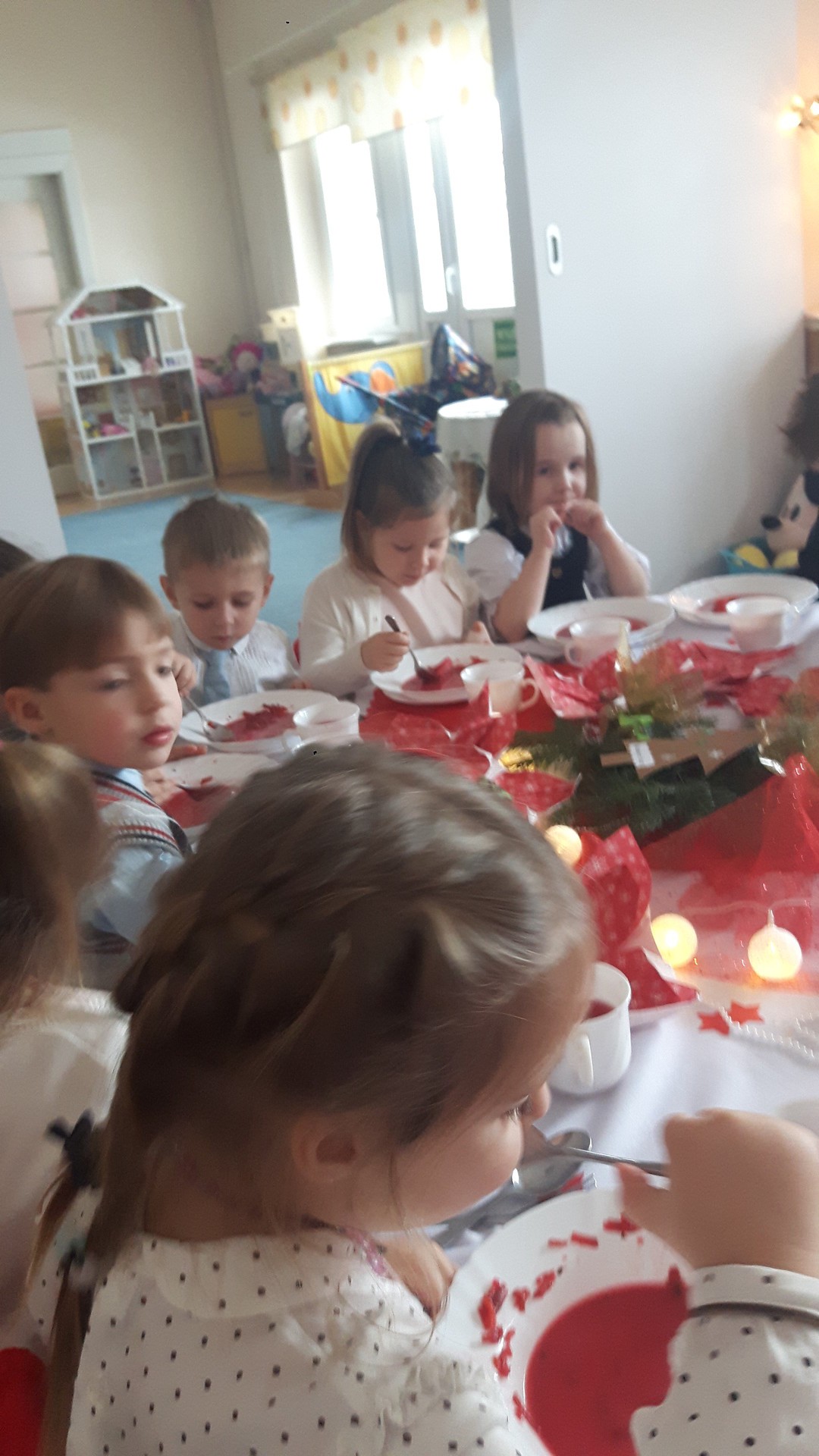 Wigilia Bożego Narodzenia to jeden z najpiękniejszych dni w roku, dlatego w naszej przedszkolnej rodzinie przeżywamy go bardzo uroczyście. Nasza przedszkolna wigilia odbyła się w piątek. Na początku dzieci zjadły wspólny posiłek. W dalszej części uroczystości dzieci odwiedził Mikołaj wraz z Elfem.Dzieliliśmy się również opłatkiem życząc sobie nawzajem wszelkiej pomyślności i Wesołych Świąt. Nasze spotkanie zakończyło się wspólnym kolędowaniem przy wigilijnym stole.