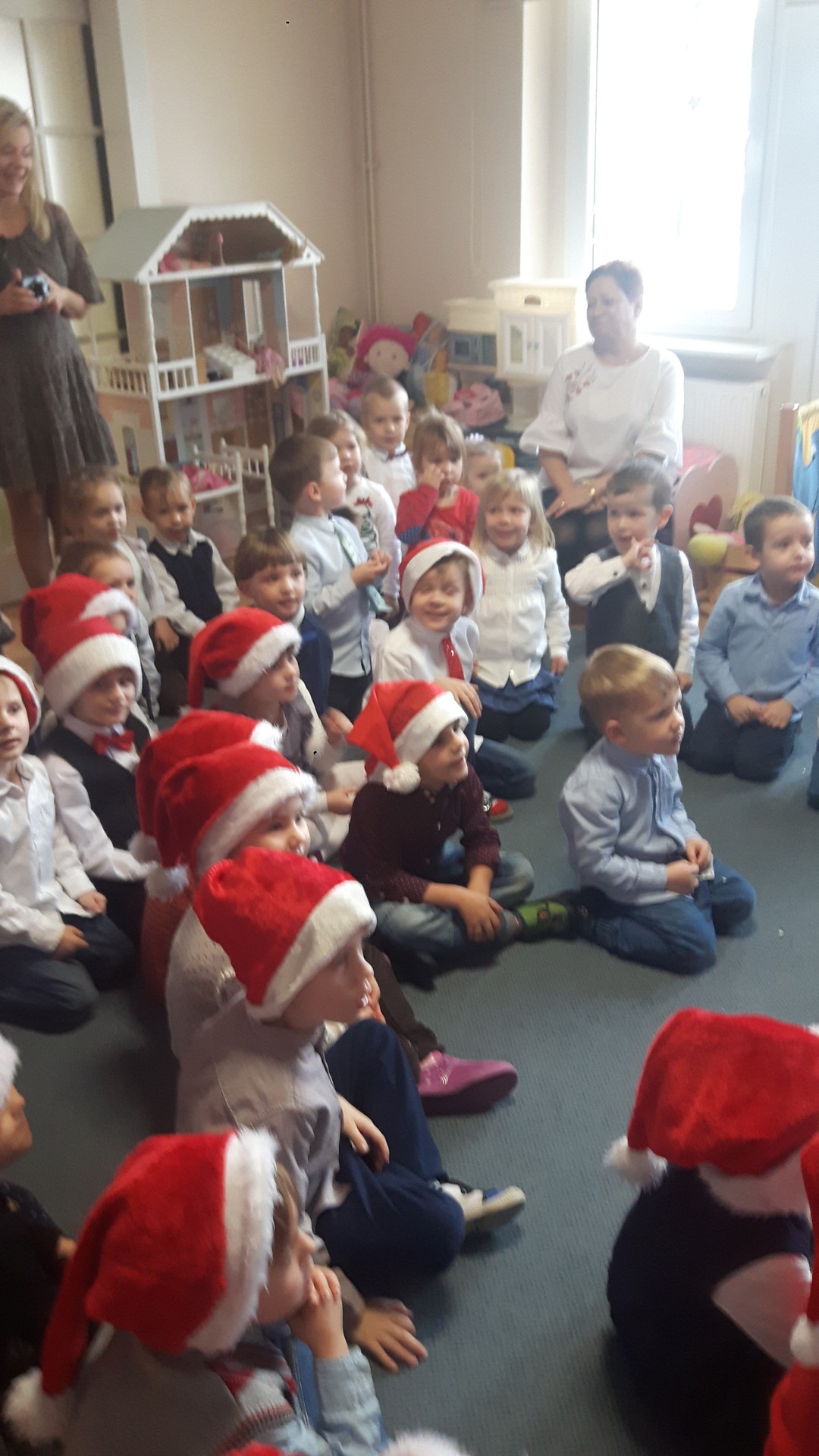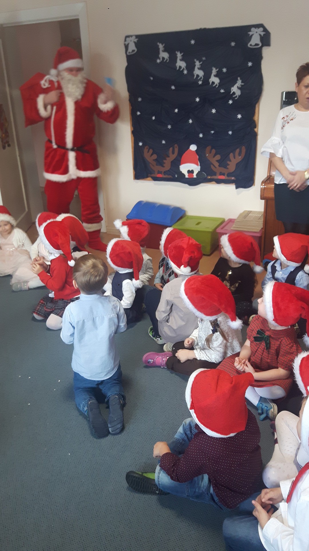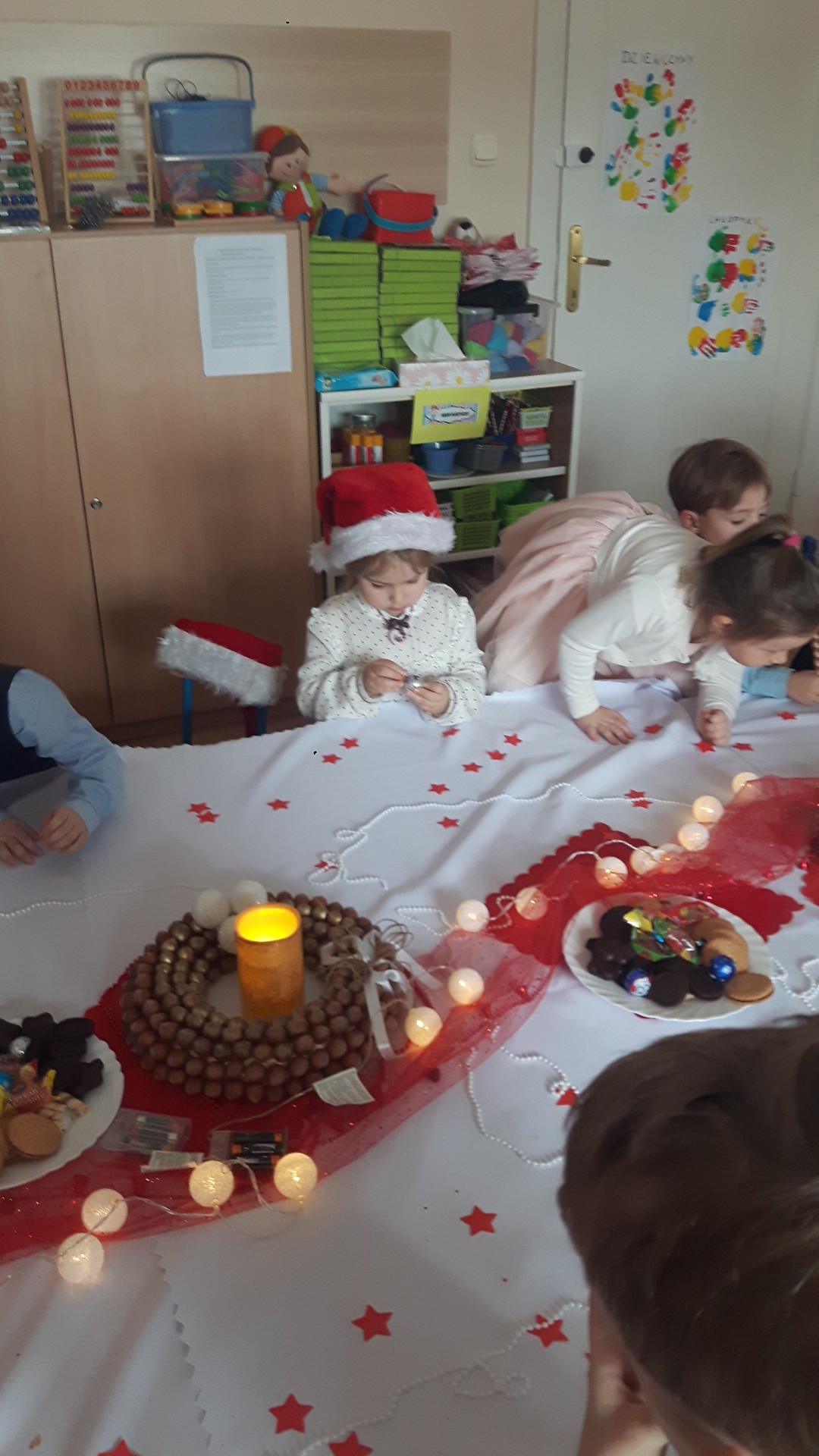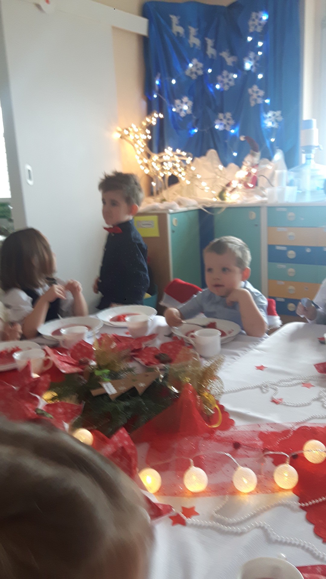 Wigilia Bożego Narodzenia to jeden z najpiękniejszych dni w roku, dlatego w naszej przedszkolnej rodzinie przeżywamy go bardzo uroczyście. Nasza przedszkolna wigilia odbyła się w piątek. Na początku dzieci zjadły wspólny posiłek. W dalszej części uroczystości dzieci odwiedził Mikołaj wraz z Elfem.Dzieliliśmy się również opłatkiem życząc sobie nawzajem wszelkiej pomyślności i Wesołych Świąt. Nasze spotkanie zakończyło się wspólnym kolędowaniem przy wigilijnym stole.
