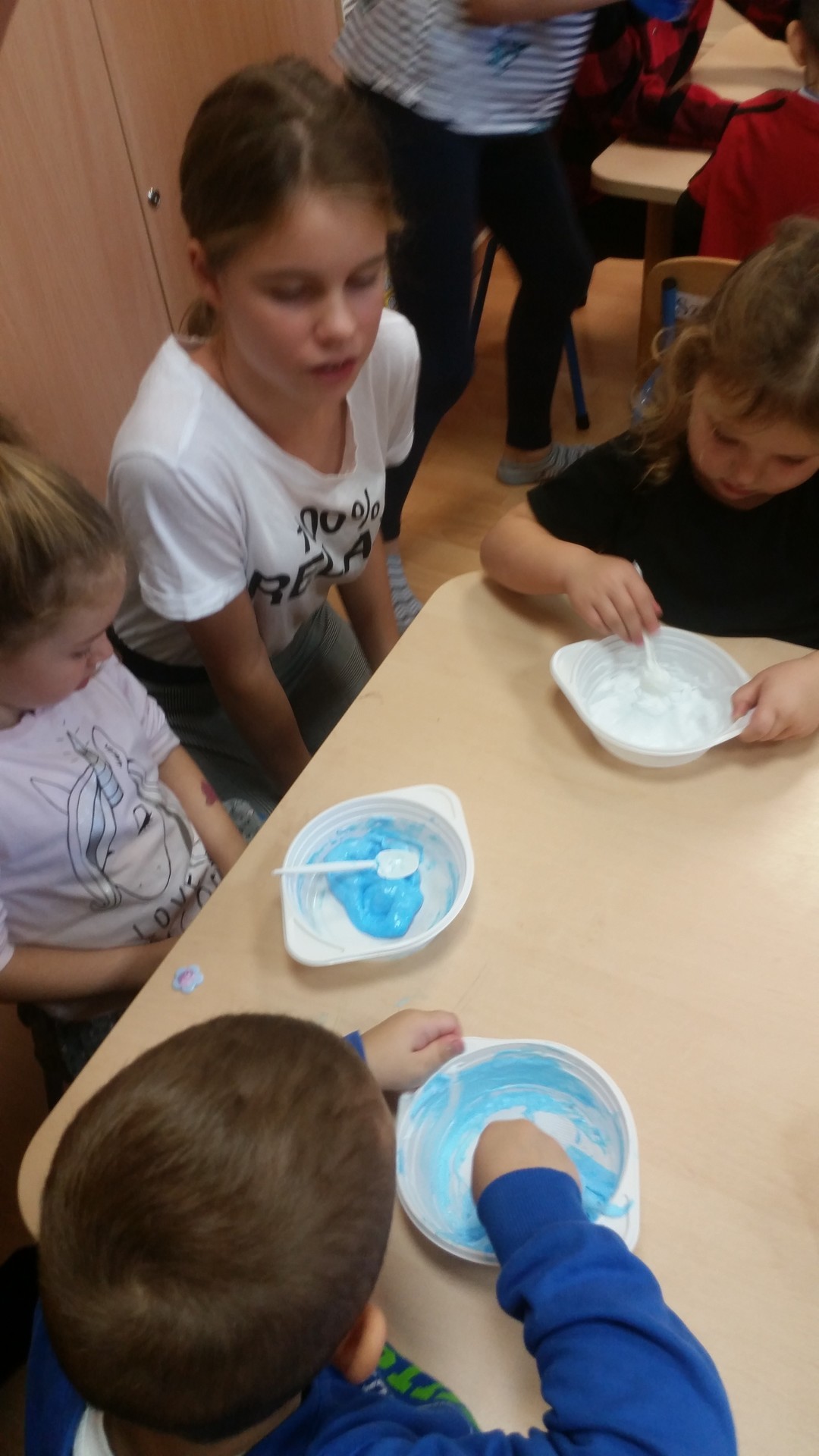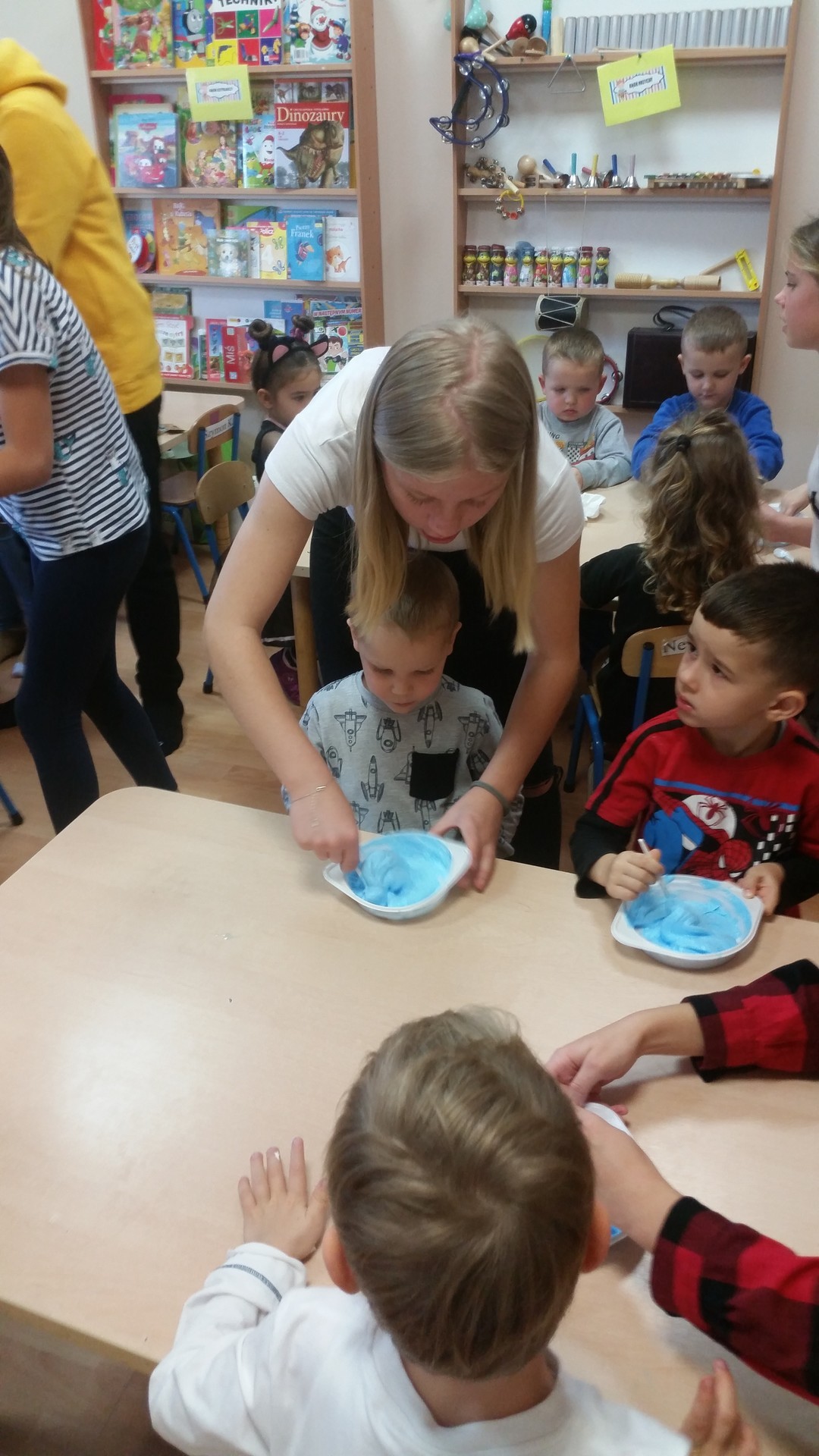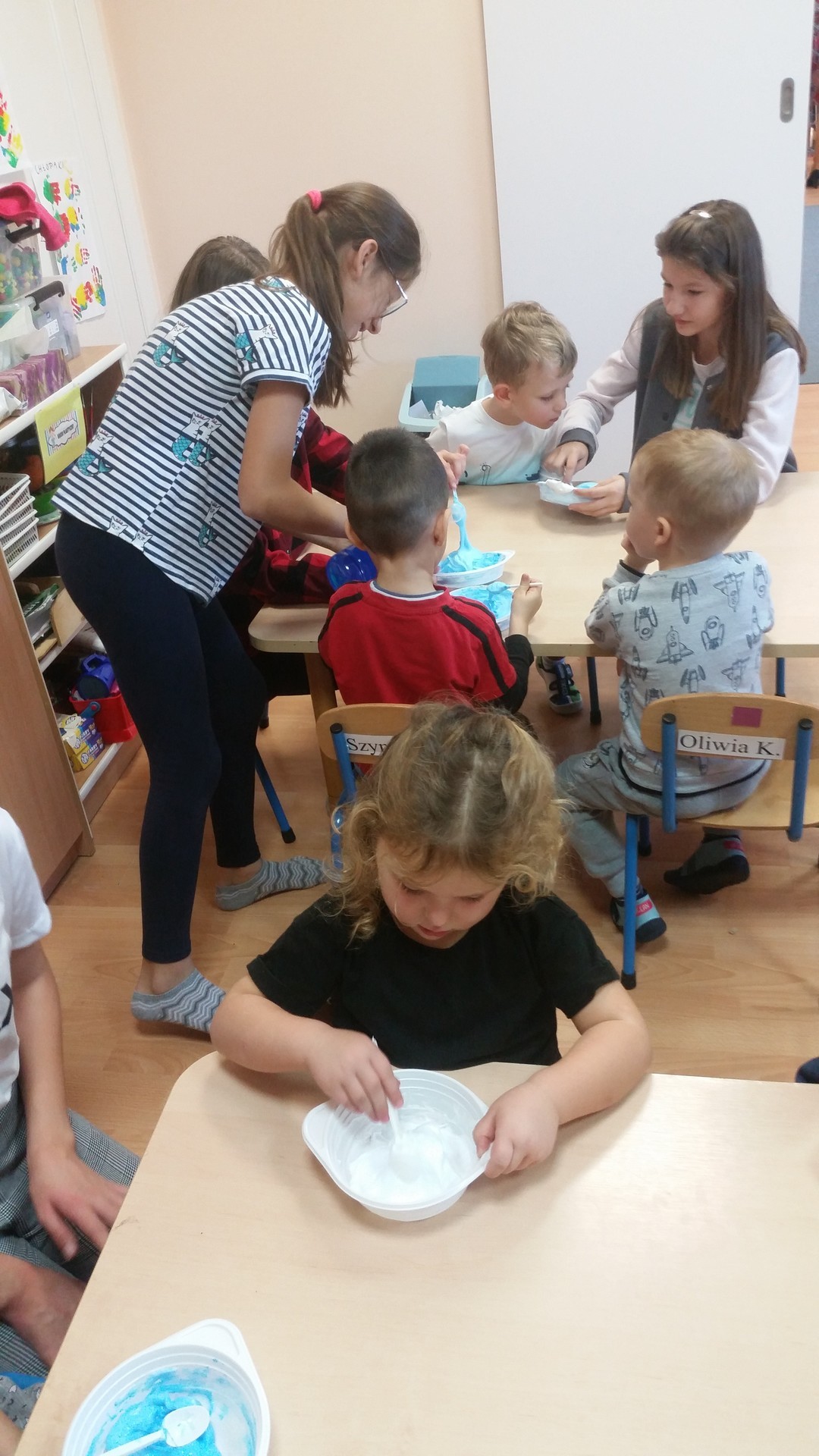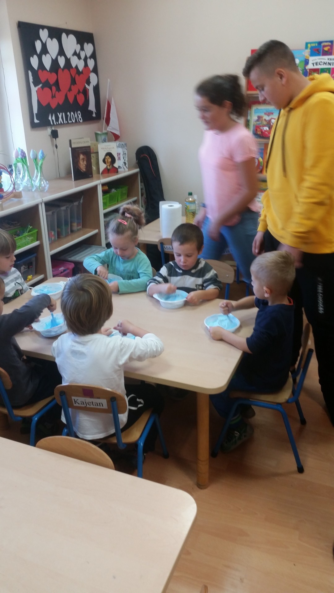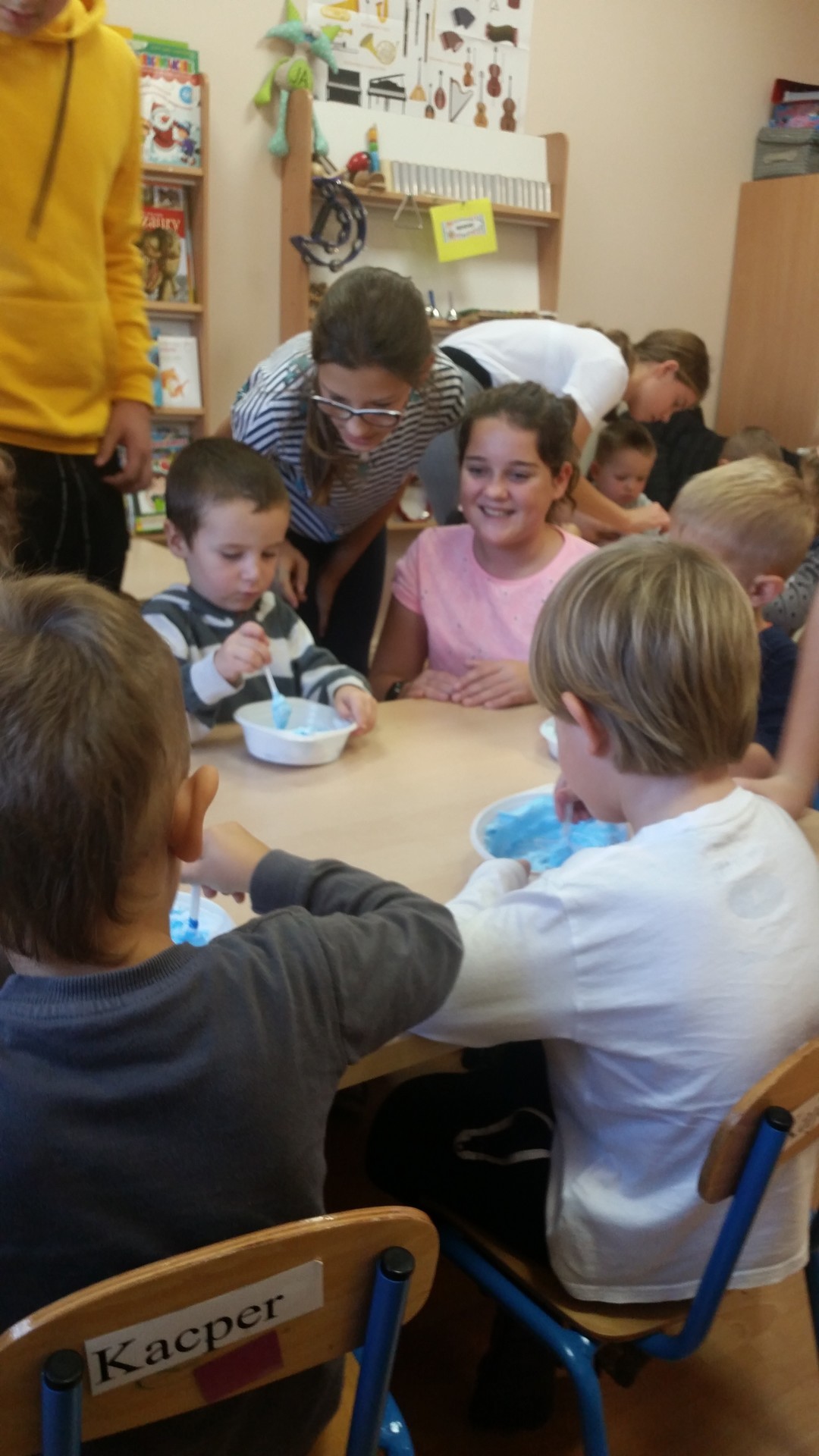 W ramach projektu "Uwolnić wiedzę" dzieci ze Szkoły Podstawowej w Wicku odwiedziły naszych przedszkolaków. Pomysłów i zapału uczniom nie brakowało. Dzieci oprócz świetnej zabawy miały możliwość przeprowadzenia kilku ciekawych eksperymentów między innymi slim'a, którego to mogły zabrać do domu.