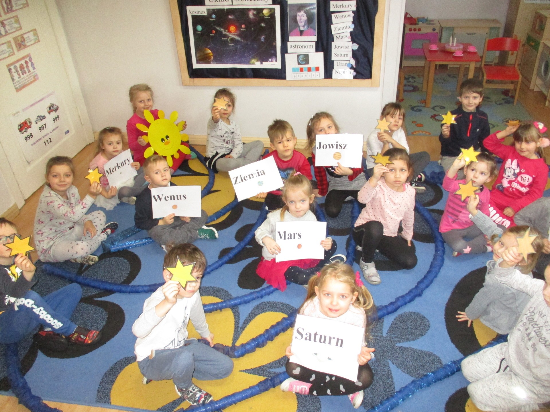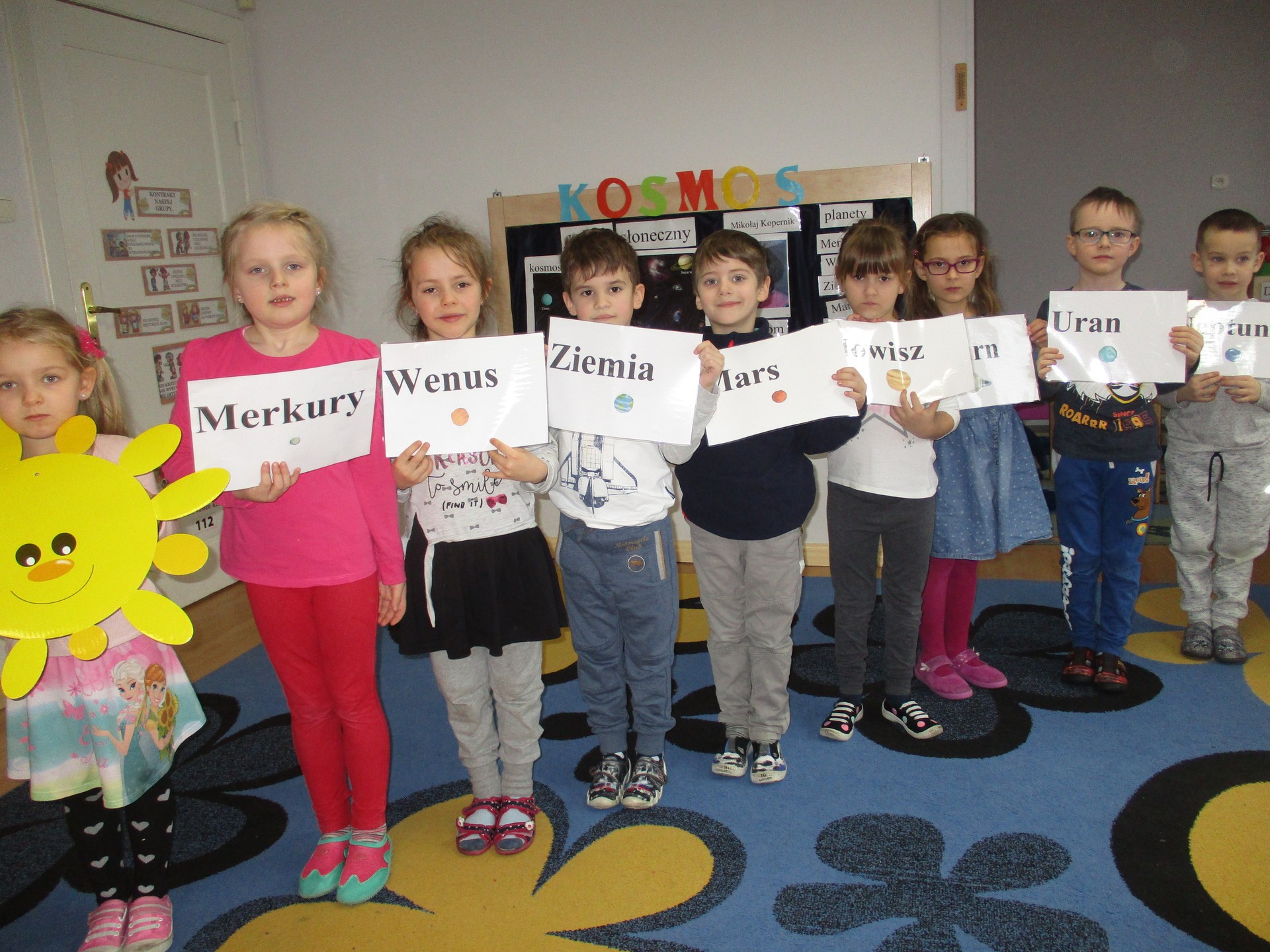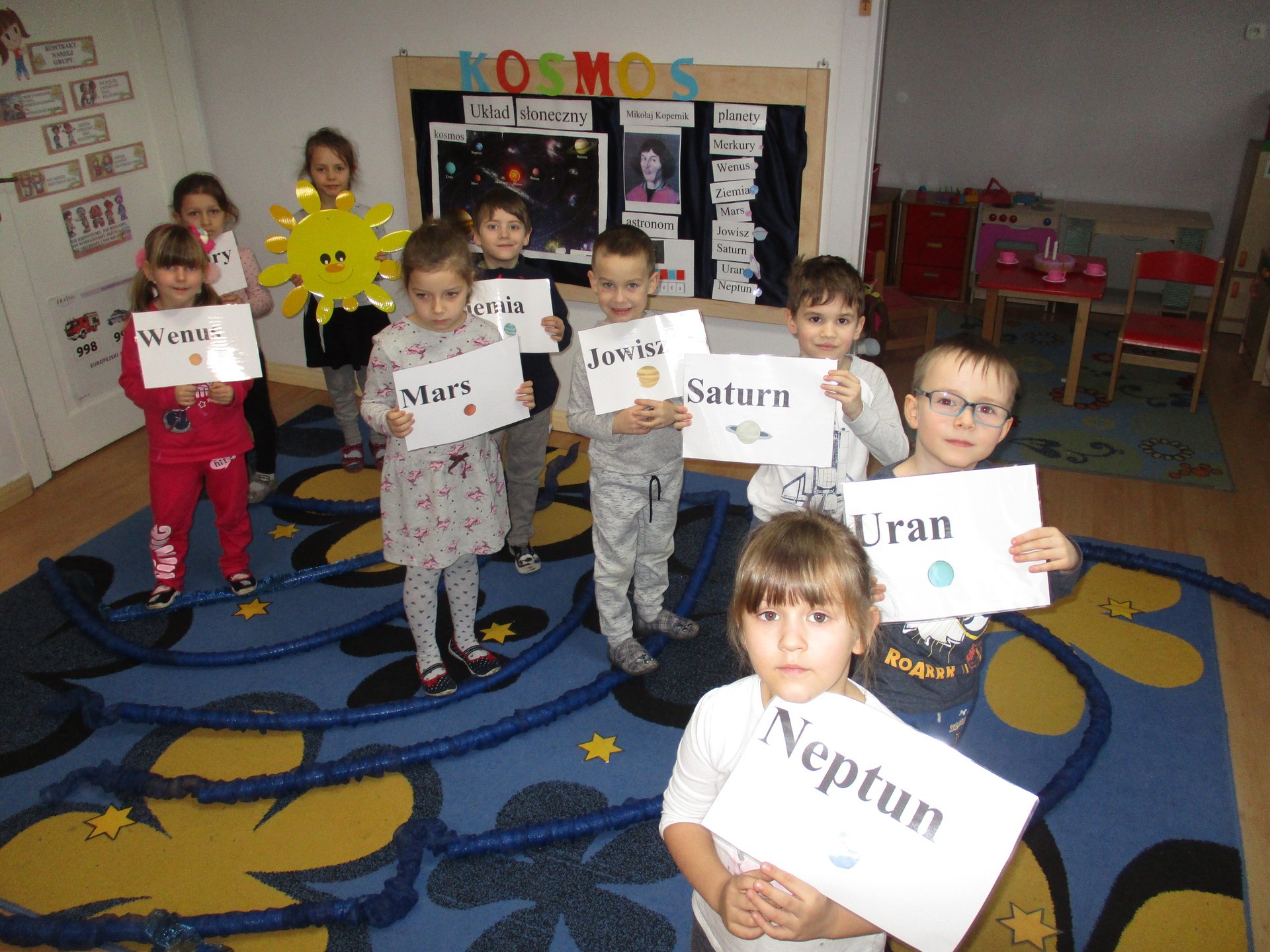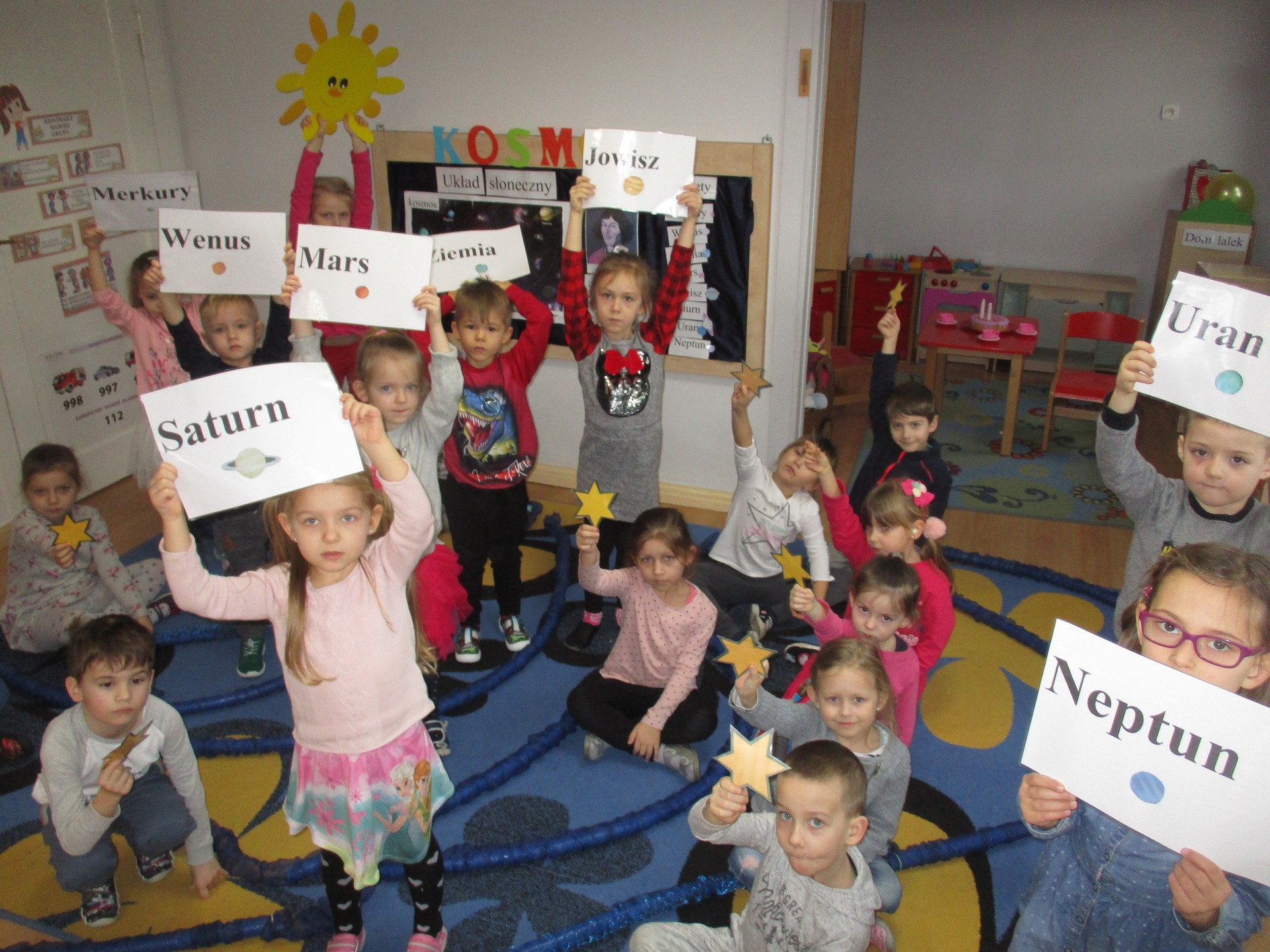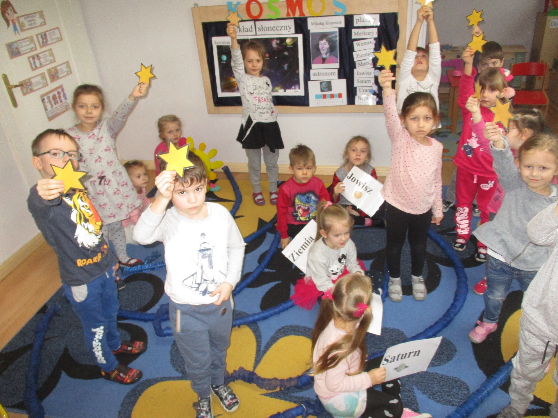 Czym jest kosmos? Jak wygląda? Gdzie on jest? Na te i inne pytania nasze przedszkolaki znają już odpowiedź ;) Przedszkolaki poznały planety Układu Słonecznego, dowiedziały się kim jest astronom, a kim astronauta. Dzieci uczestniczyły w licznych zabawach ruchowych m.in. chodziły po nieznanej planecie pokrytej kraterami. Przedszkolaki oglądały fotografie w encyklopediach i poszukiwały informacji o pojazdach kosmicznych. Pojawiły się również nowe prace plastyczne przedszkolaków, związane z tematyką kosmosu, czyli kolorowe planety i rakiety. Podczas zajęć dzieci wzbogaciły swoją wiedzę i słownictwo o wyrazy związane tematem kosmosu i wszechświata. Nauka przez zabawę - to najlepsza nauka na świecie :)