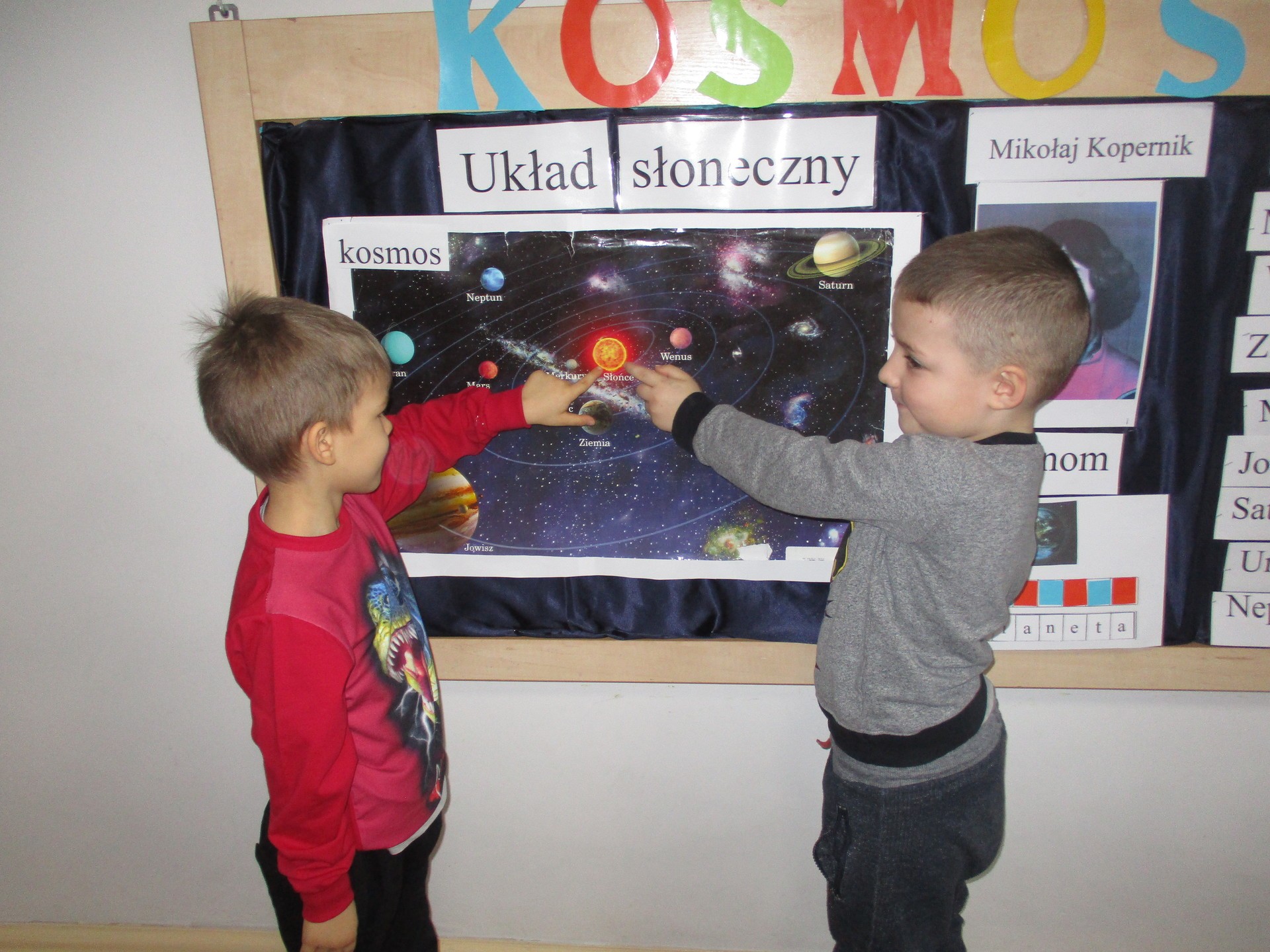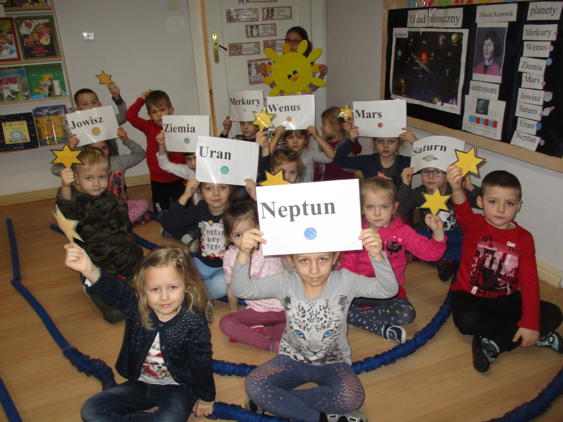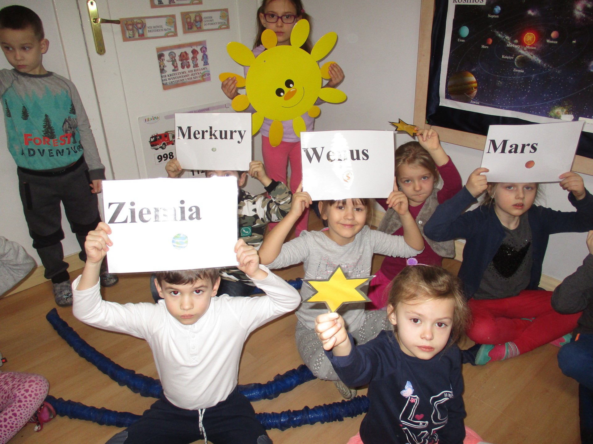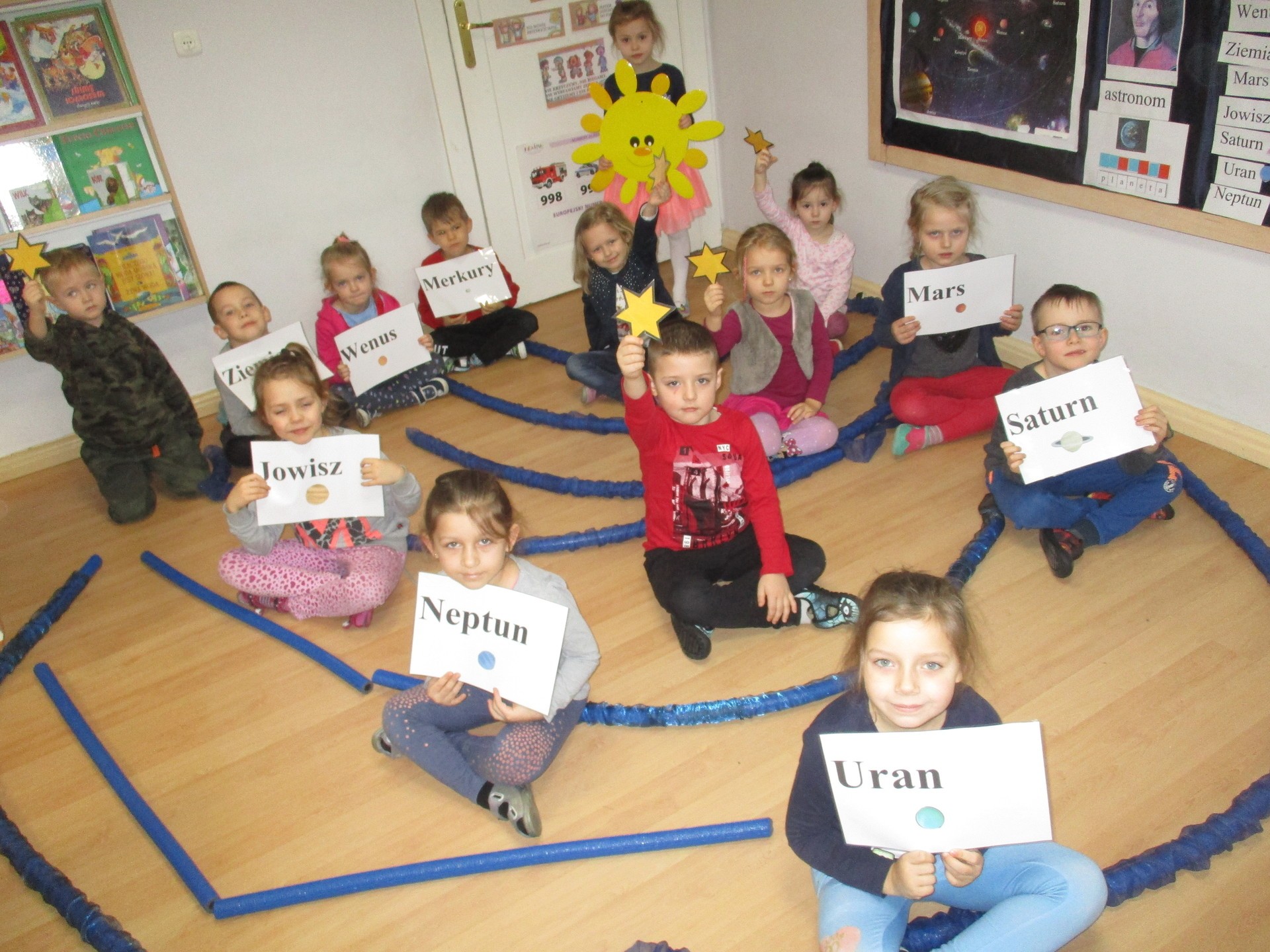 Czym jest kosmos? Jak wygląda? Gdzie on jest? Na te i inne pytania nasze przedszkolaki znają już odpowiedź ;) Przedszkolaki poznały planety Układu Słonecznego, dowiedziały się kim jest astronom, a kim astronauta. Dzieci uczestniczyły w licznych zabawach ruchowych m.in. chodziły po nieznanej planecie pokrytej kraterami. Przedszkolaki oglądały fotografie w encyklopediach i poszukiwały informacji o pojazdach kosmicznych. Pojawiły się również nowe prace plastyczne przedszkolaków, związane z tematyką kosmosu, czyli kolorowe planety i rakiety. Podczas zajęć dzieci wzbogaciły swoją wiedzę i słownictwo o wyrazy związane tematem kosmosu i wszechświata. Nauka przez zabawę - to najlepsza nauka na świecie :)