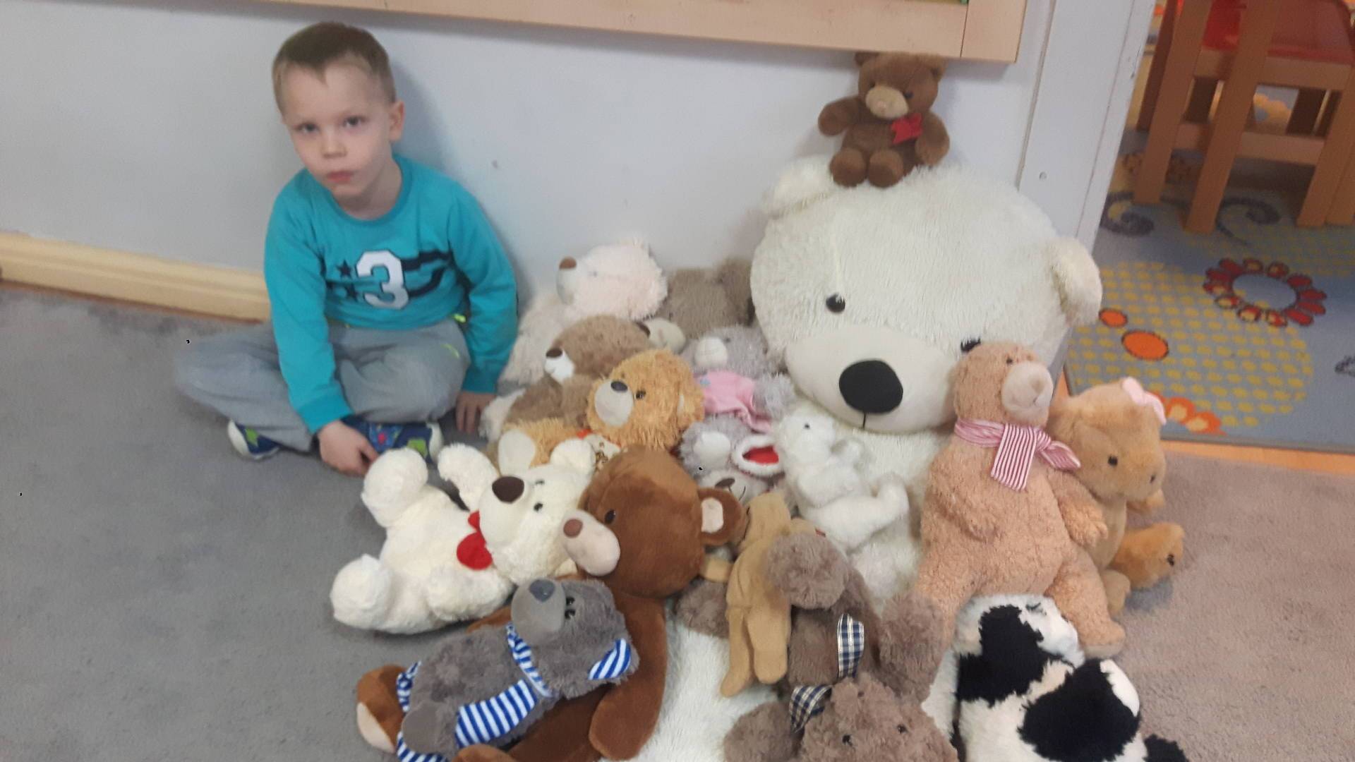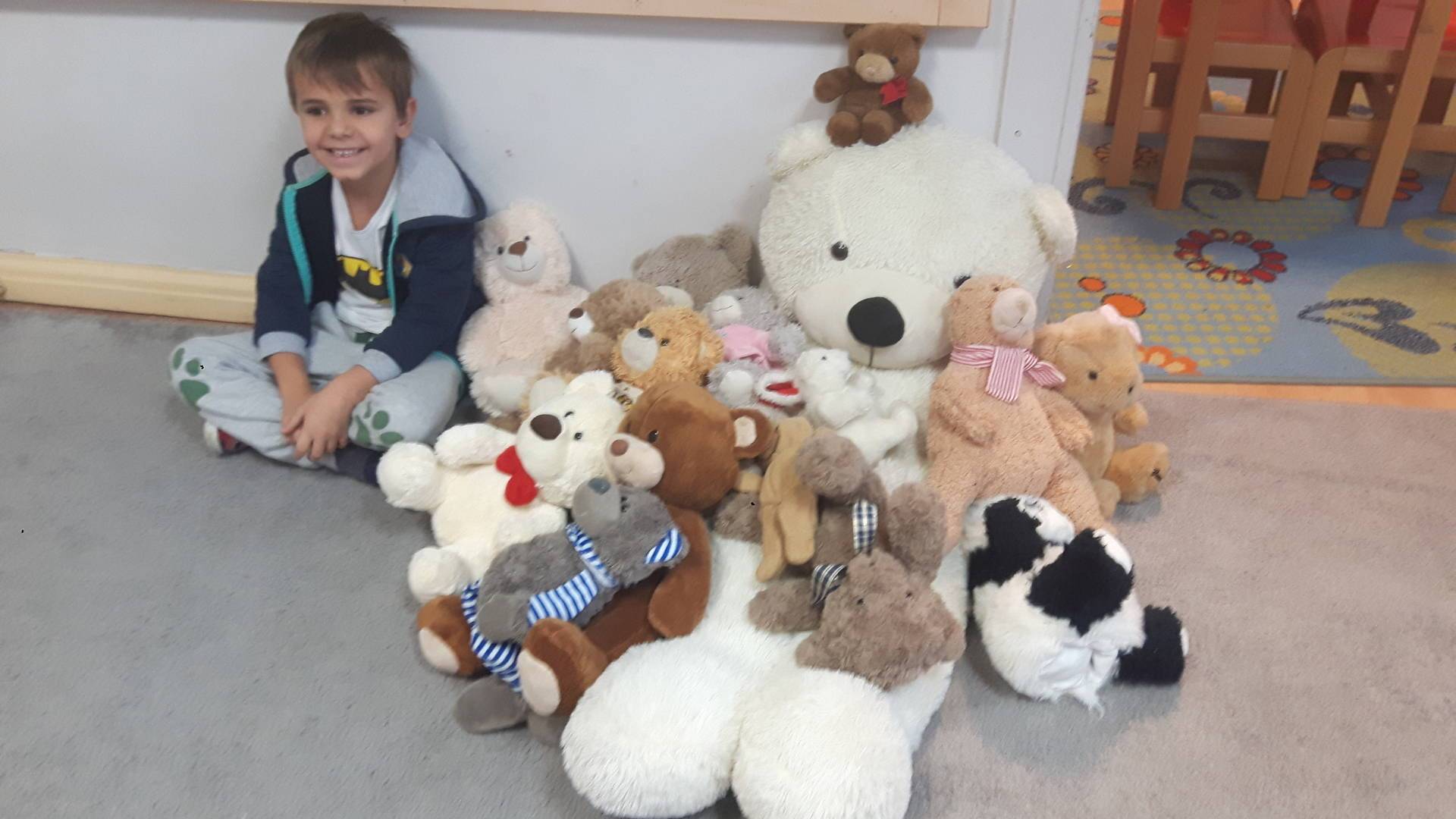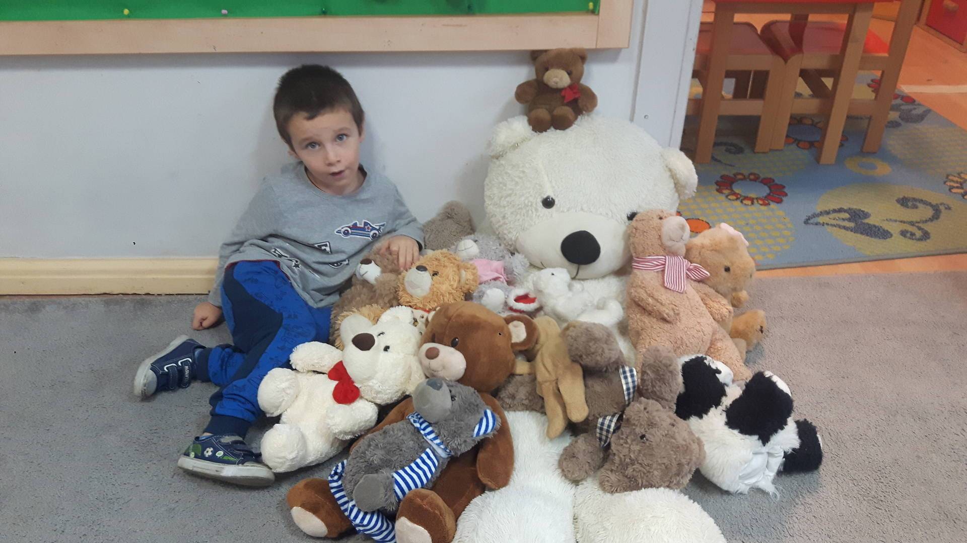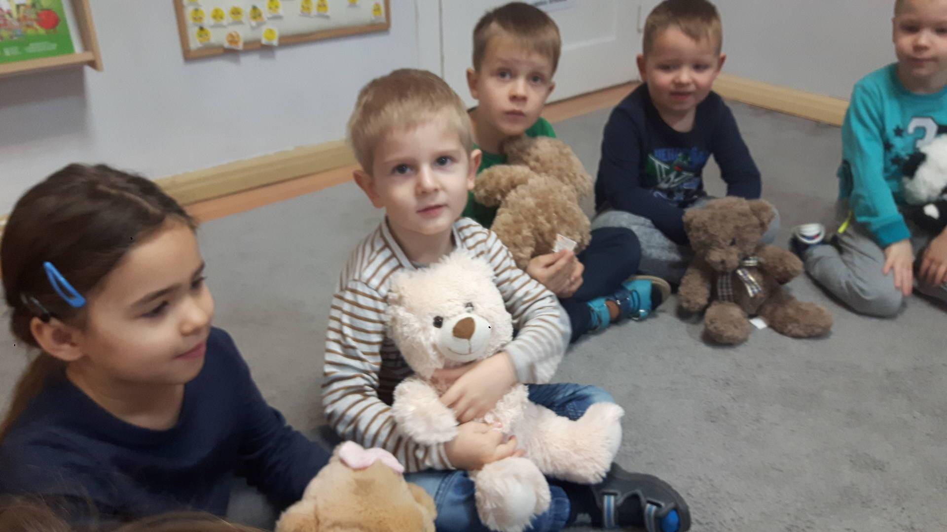 Nasze przedszkolaki w tym dniu przybyły do przedszkola ze swoimi ulubionymi pluszowymi przytulankami. Misie tego dnia opanowały nasze Przedszkole, misie były po prostu wszędzie na krzesełkach, stolikach, parapetach, półeczkach. Przybyły misie małe, średnie i bardzo duże, białe, brązowe itd.