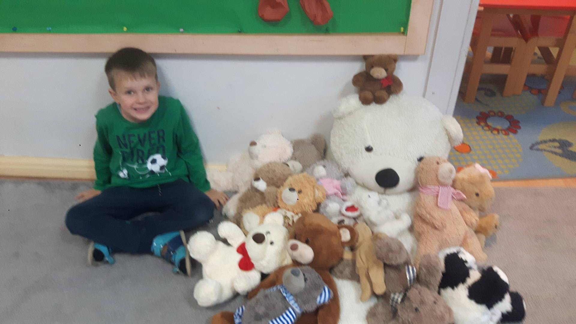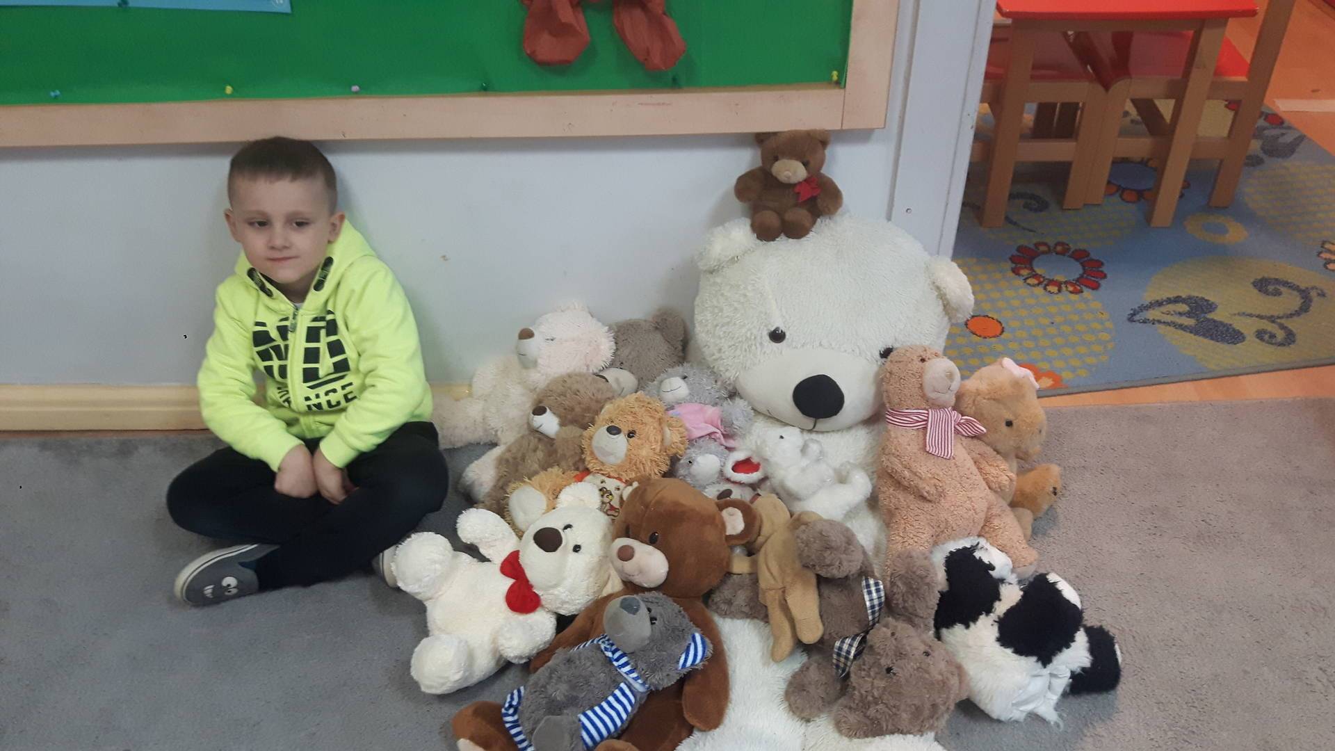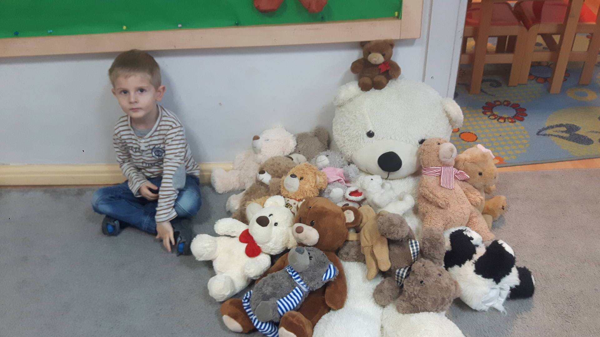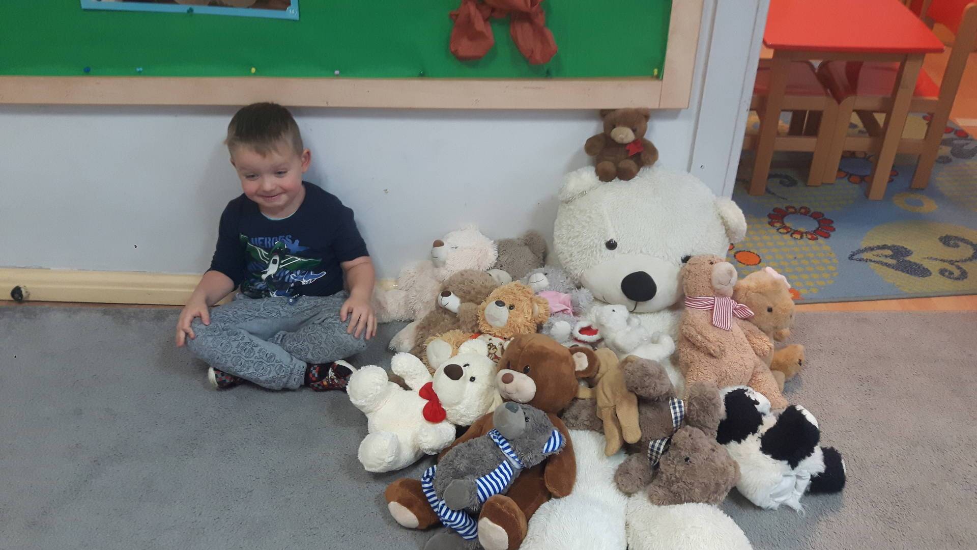 Nasze przedszkolaki w tym dniu przybyły do przedszkola ze swoimi ulubionymi pluszowymi przytulankami. Misie tego dnia opanowały nasze Przedszkole, misie były po prostu wszędzie na krzesełkach, stolikach, parapetach, półeczkach. Przybyły misie małe, średnie i bardzo duże, białe, brązowe itd.