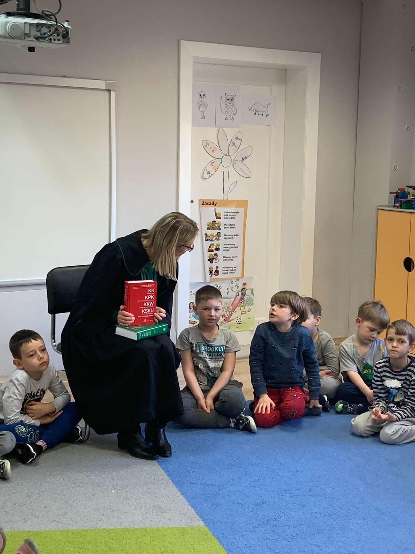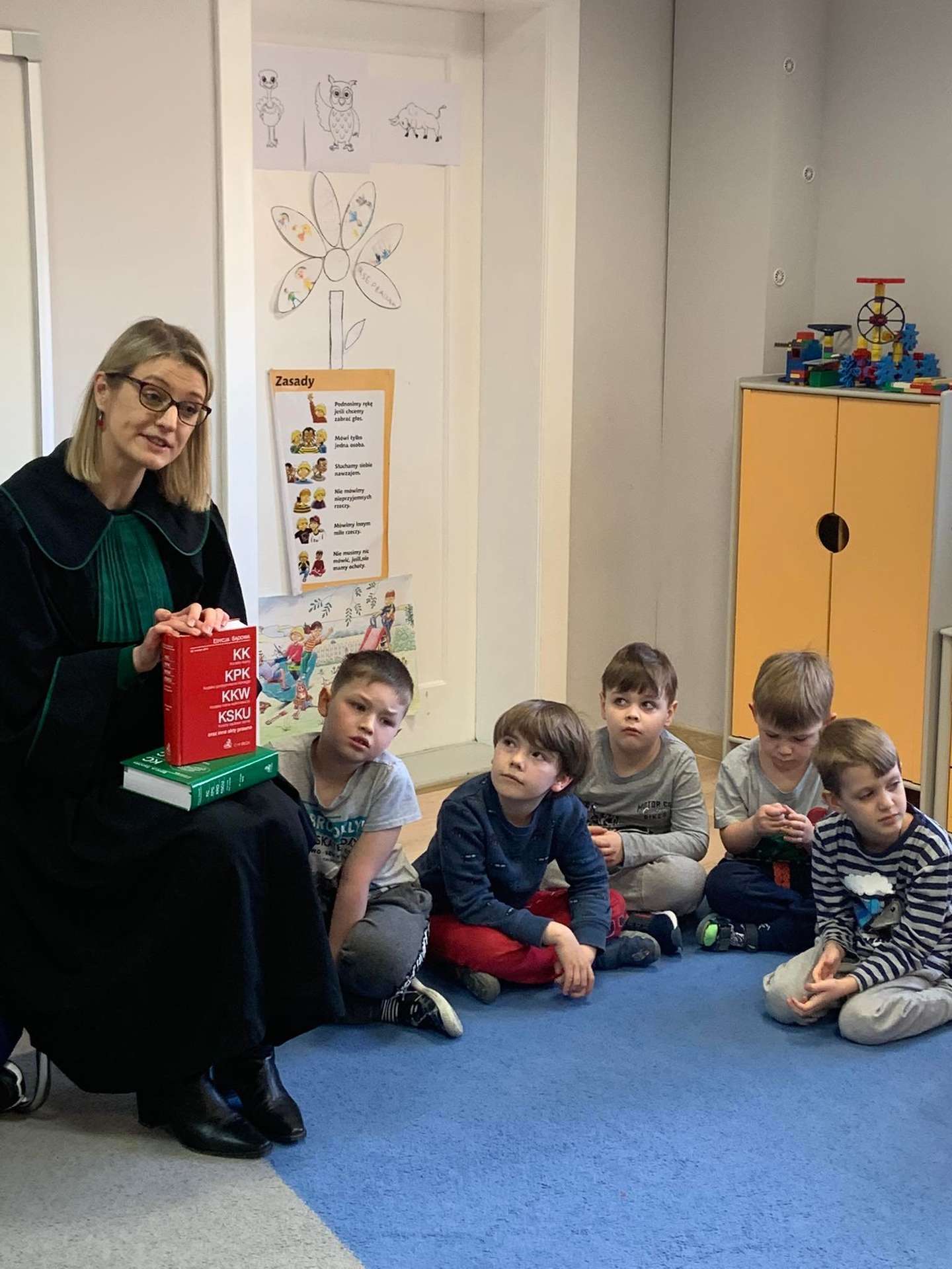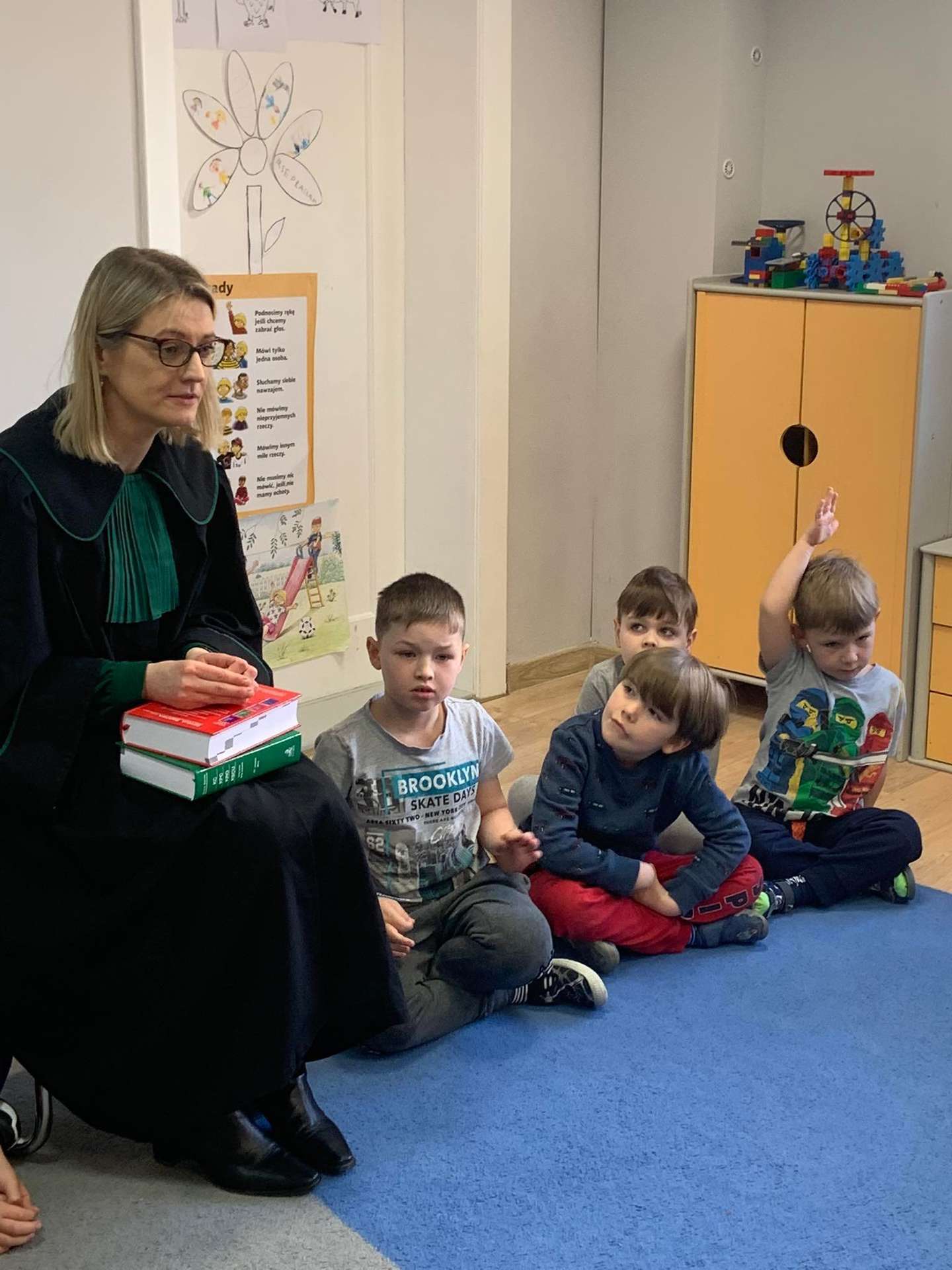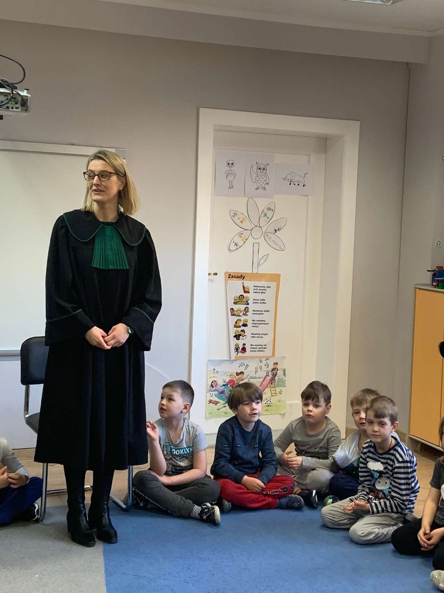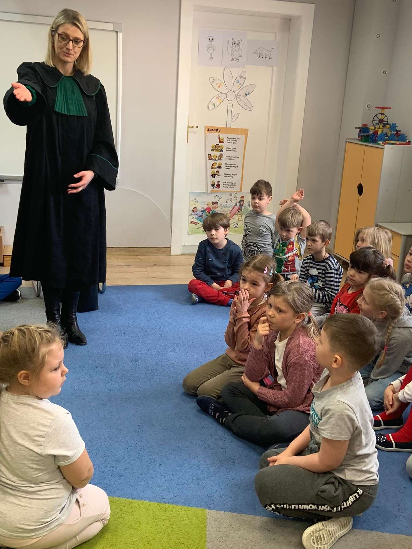 Dzisiaj gościliśmy w naszym przedszkolu p. adwokat Kamillę Kasprzak. To było bardzo ciekawe spotkanie. Dzieci dowiedziały się, jak długo trzeba się uczyć żeby zostać adwokatem i na czym polega praca adwokata. Poznały szereg pojęć związanych z w/w zawodem. Dużą atrakcją była zabawa w sąd, którą przeprowadziła p. adwokat. Dzieci przekonały się, jak trudno jest się bronić, oskarżać i orzekać o winie. Na zakończenie zajęć przedszkolaki otrzymały od gościa upominki w postaci kolorowanek.