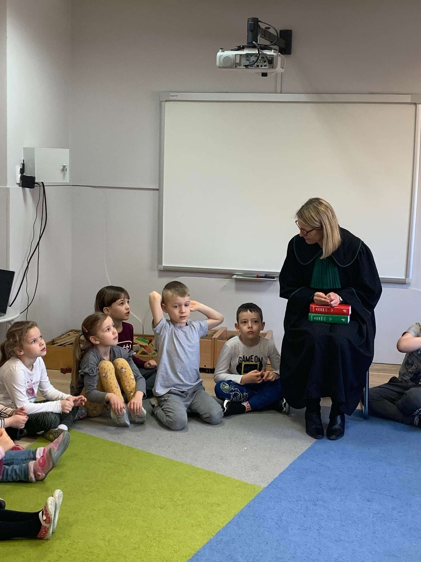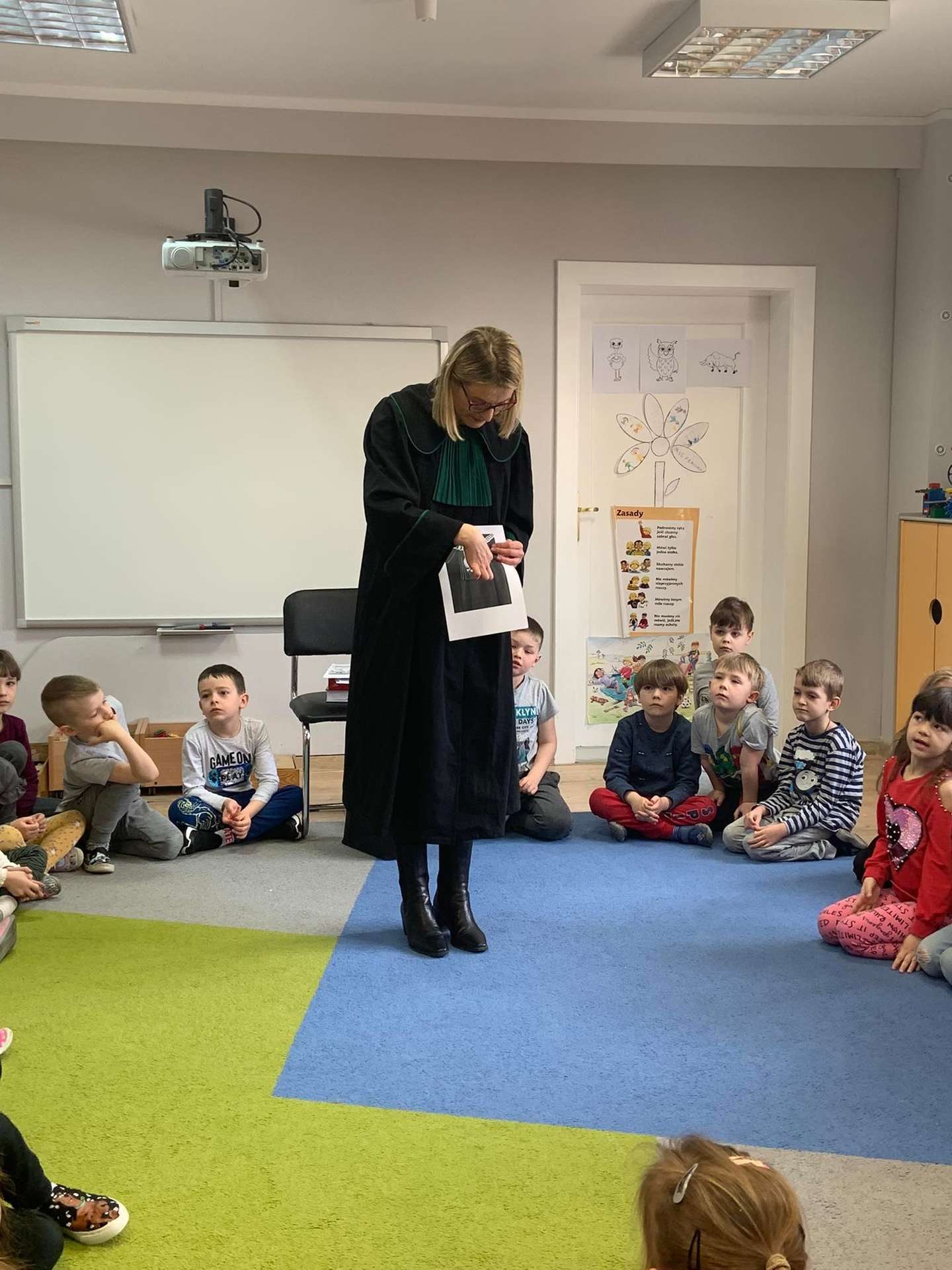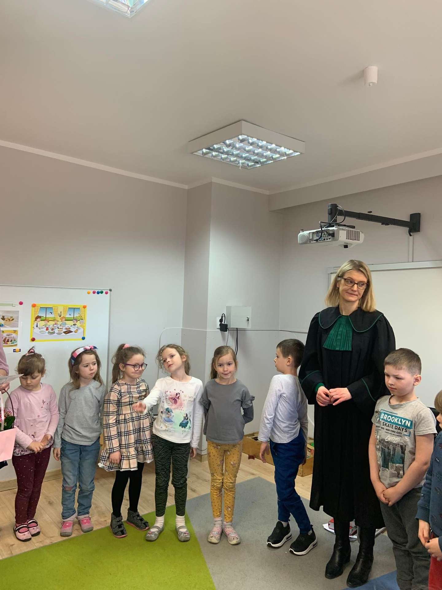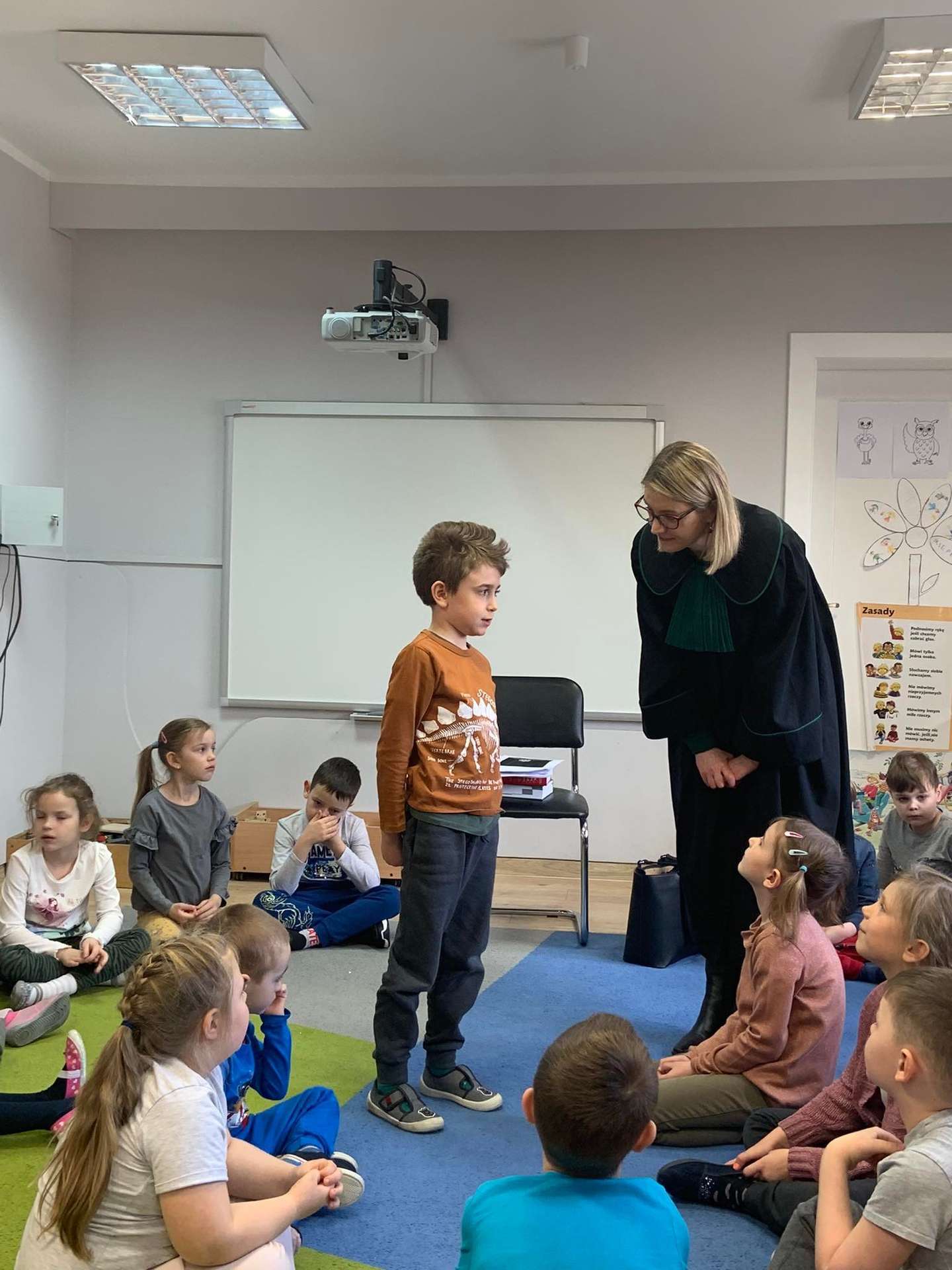 Dzisiaj gościliśmy w naszym przedszkolu p. adwokat Kamillę Kasprzak. To było bardzo ciekawe spotkanie. Dzieci dowiedziały się, jak długo trzeba się uczyć żeby zostać adwokatem i na czym polega praca adwokata. Poznały szereg pojęć związanych z w/w zawodem. Dużą atrakcją była zabawa w sąd, którą przeprowadziła p. adwokat. Dzieci przekonały się, jak trudno jest się bronić, oskarżać i orzekać o winie. Na zakończenie zajęć przedszkolaki otrzymały od gościa upominki w postaci kolorowanek.